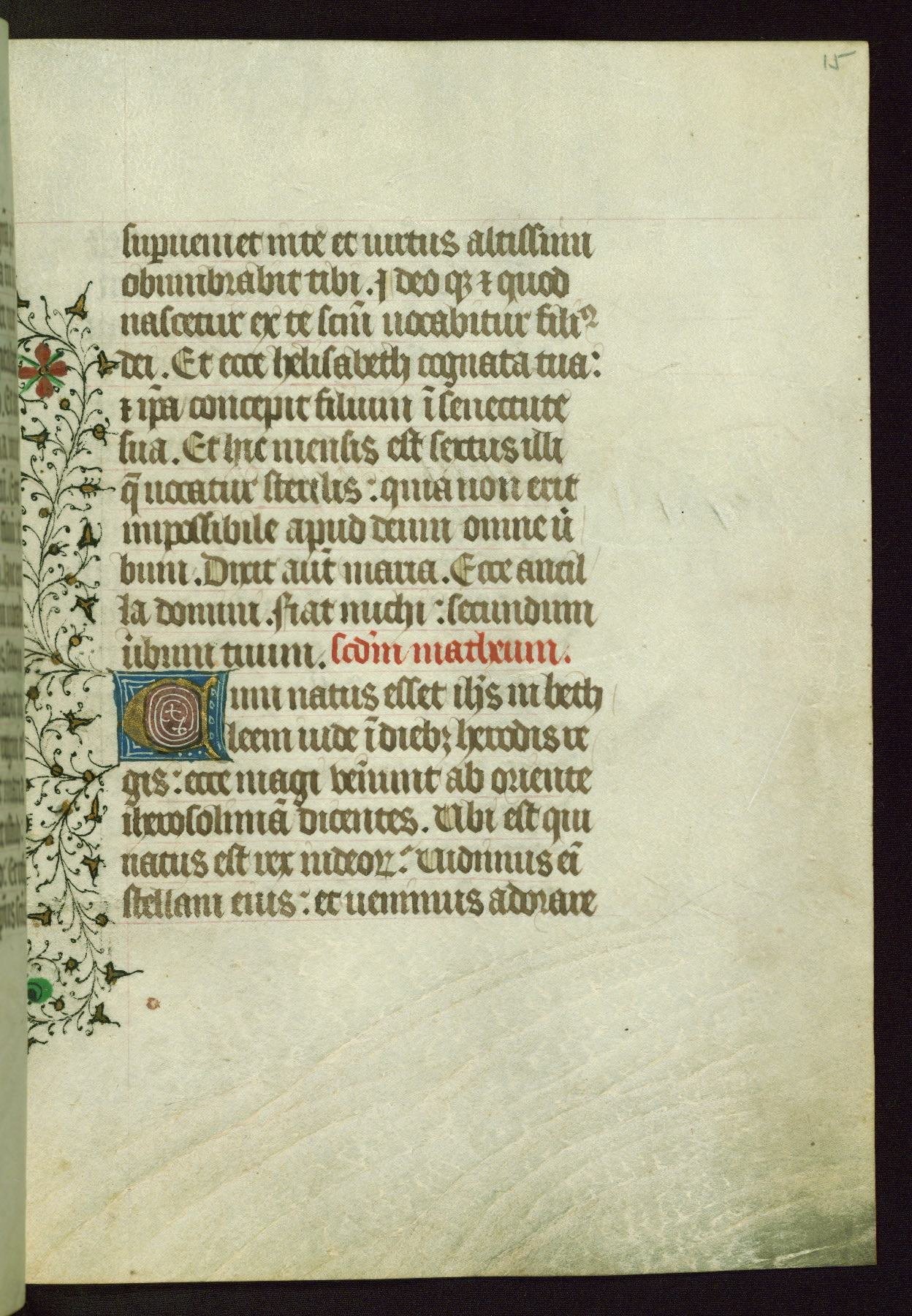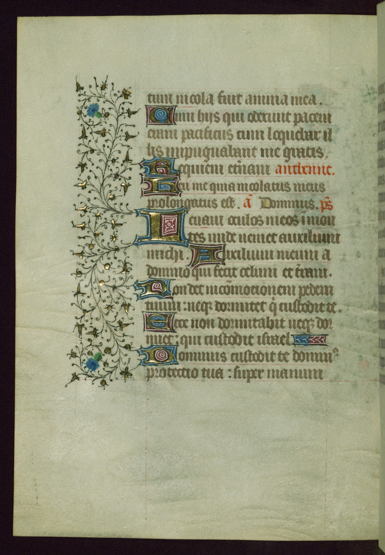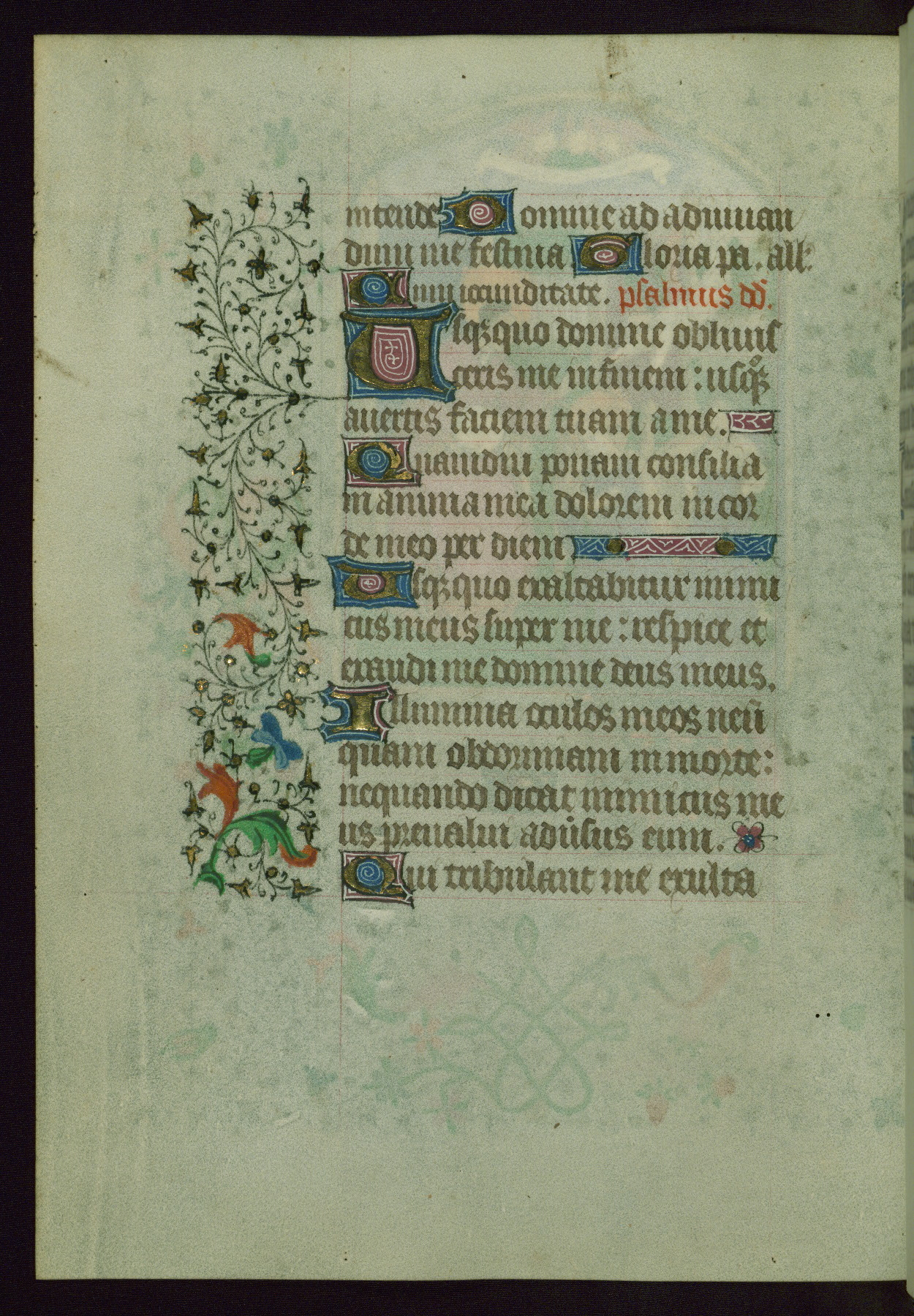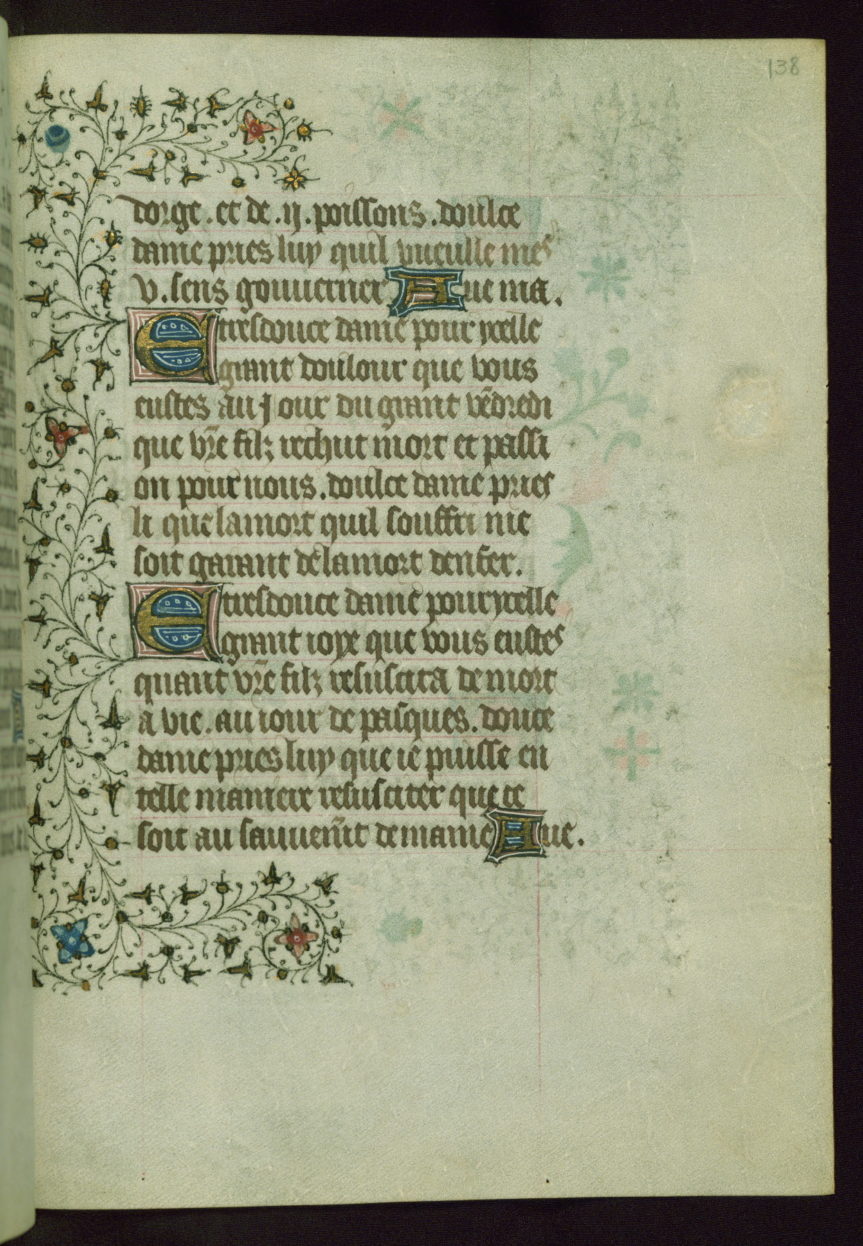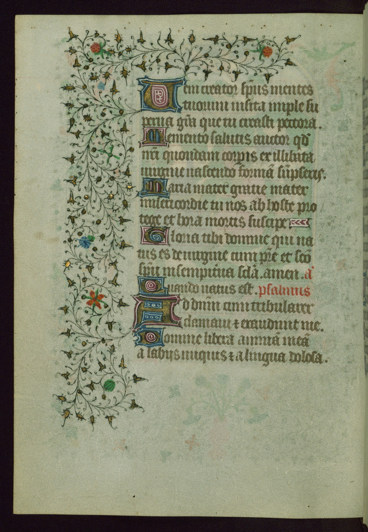 This Book of Hours was created ca. 1435-1440 in Amiens by artists from the circle of the Master of W.281 (Randall, cat. 112) for a female patron depicted on fol. 135r. The manuscript contains fourteen miniatures and is localized to Amiens by the contents of the calendar and litany, which include many saints particular to that region. Quire 12 (fols. 82-89) is misbound with quire 13 (fols. 90-97), with Suffrages and the Seven Verses of St. Bernard (fols. 82-89) intended to be after the Office of the Dead (fols. 90-128), as evinced by the location of the rubric for the Office of the Dead on fol. 81v.