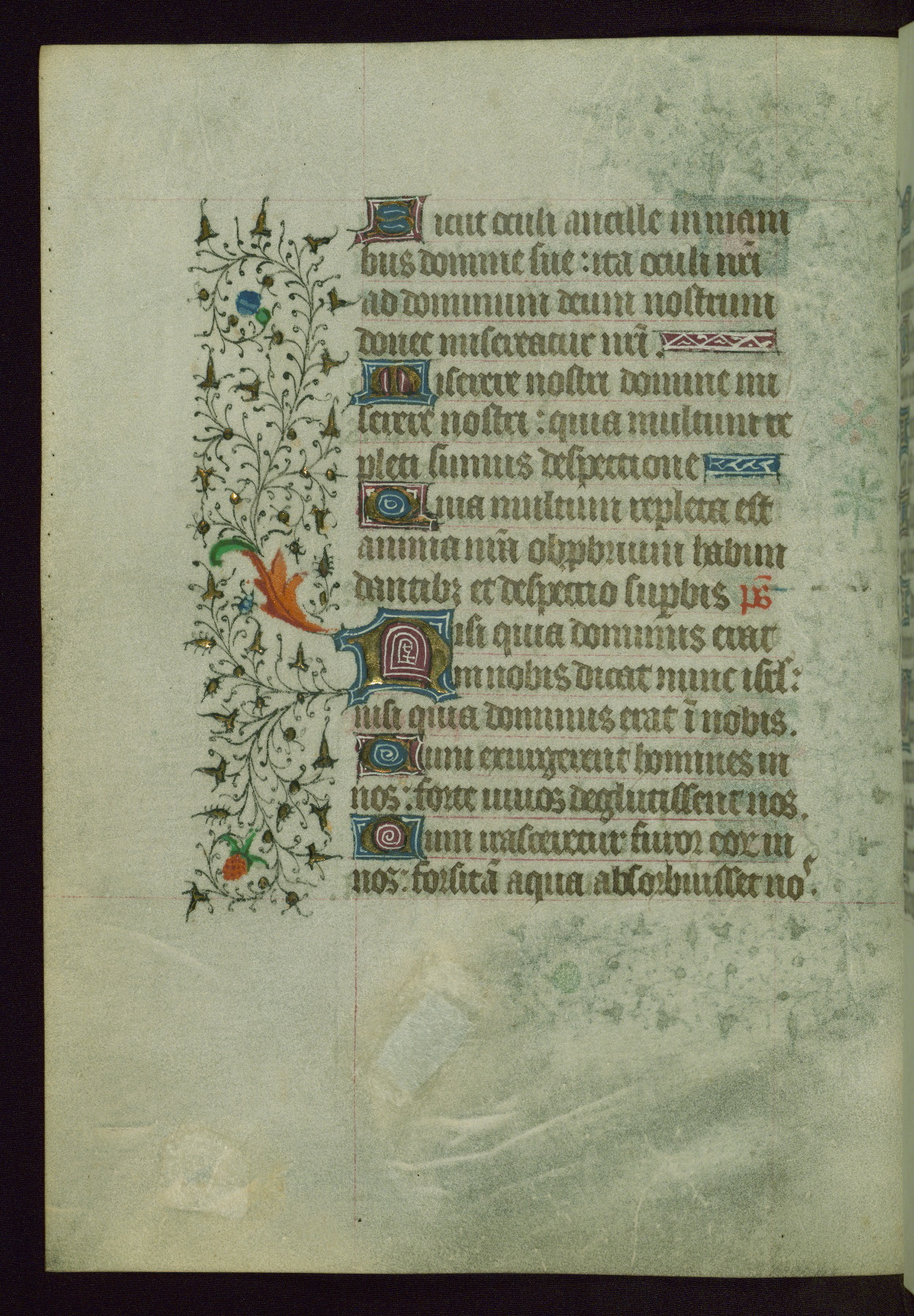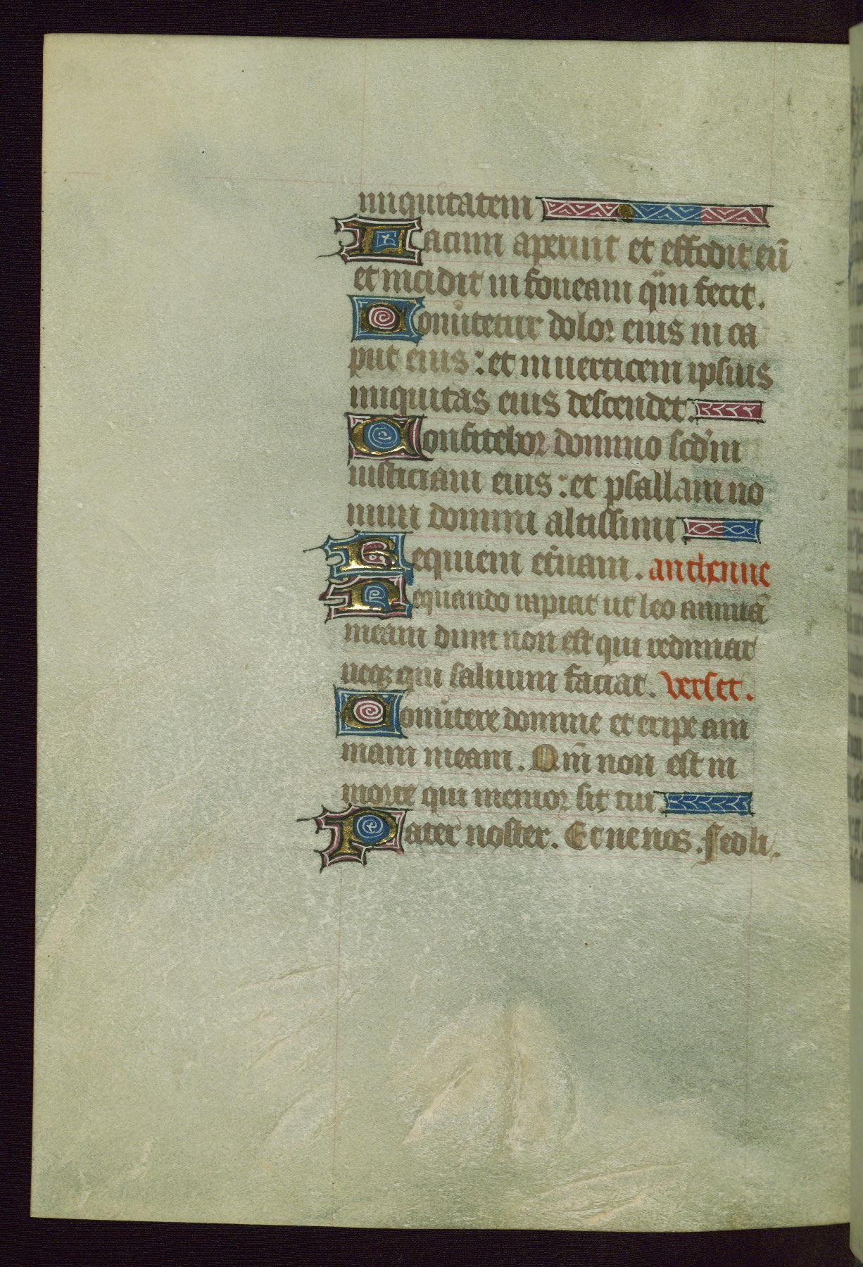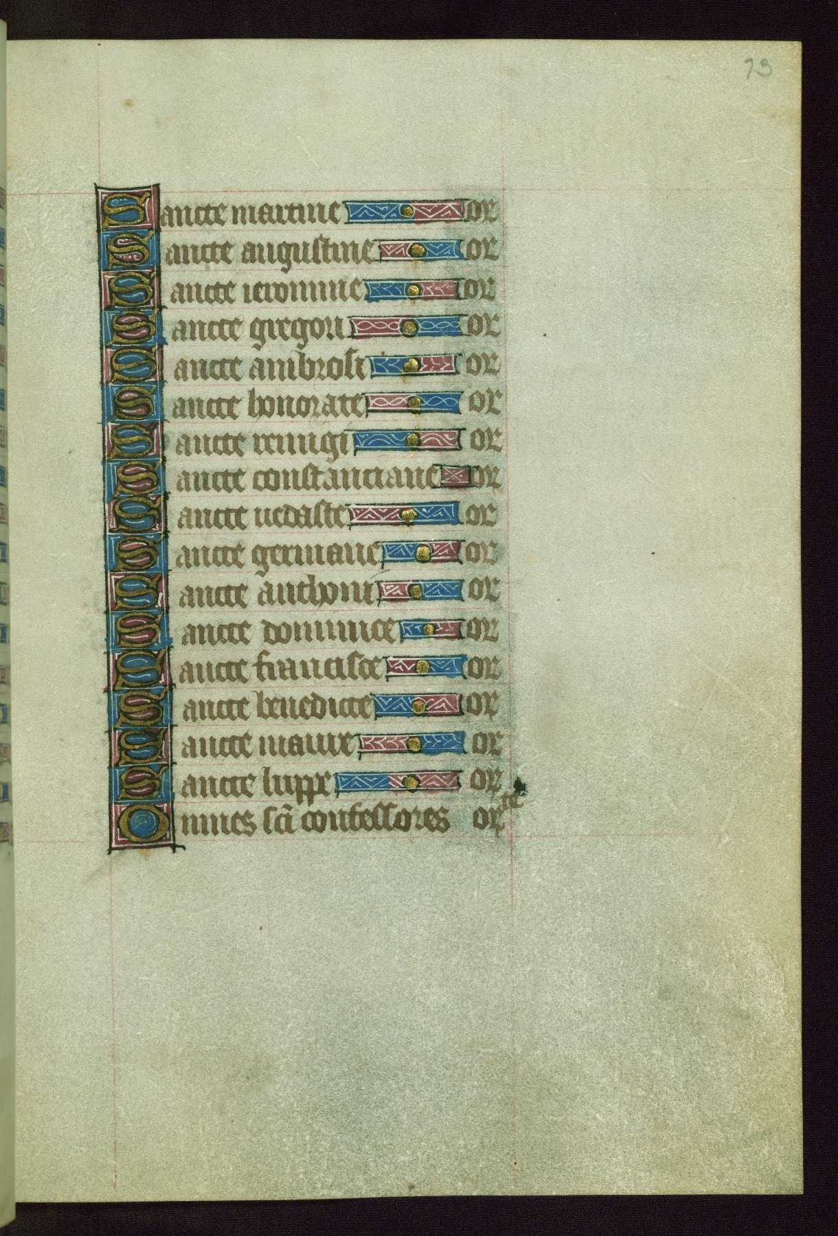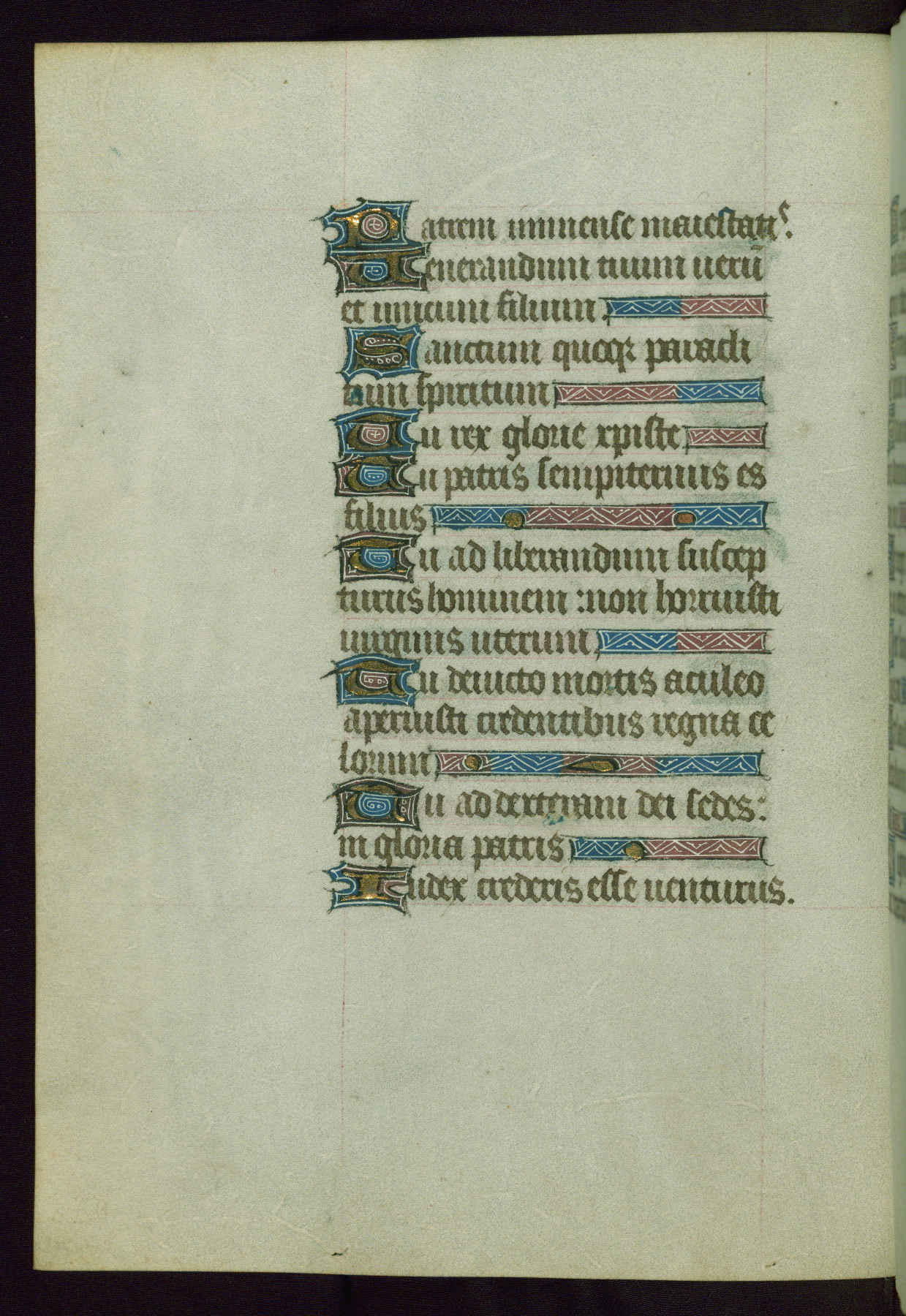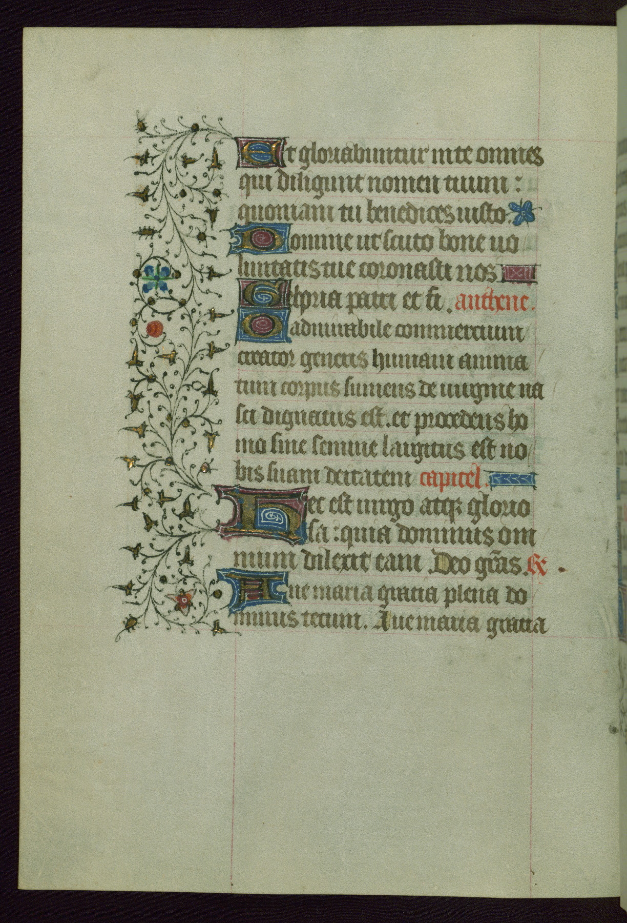 This Book of Hours was created ca. 1435-1440 in Amiens by artists from the circle of the Master of W.281 (Randall, cat. 112) for a female patron depicted on fol. 135r. The manuscript contains fourteen miniatures and is localized to Amiens by the contents of the calendar and litany, which include many saints particular to that region. Quire 12 (fols. 82-89) is misbound with quire 13 (fols. 90-97), with Suffrages and the Seven Verses of St. Bernard (fols. 82-89) intended to be after the Office of the Dead (fols. 90-128), as evinced by the location of the rubric for the Office of the Dead on fol. 81v.