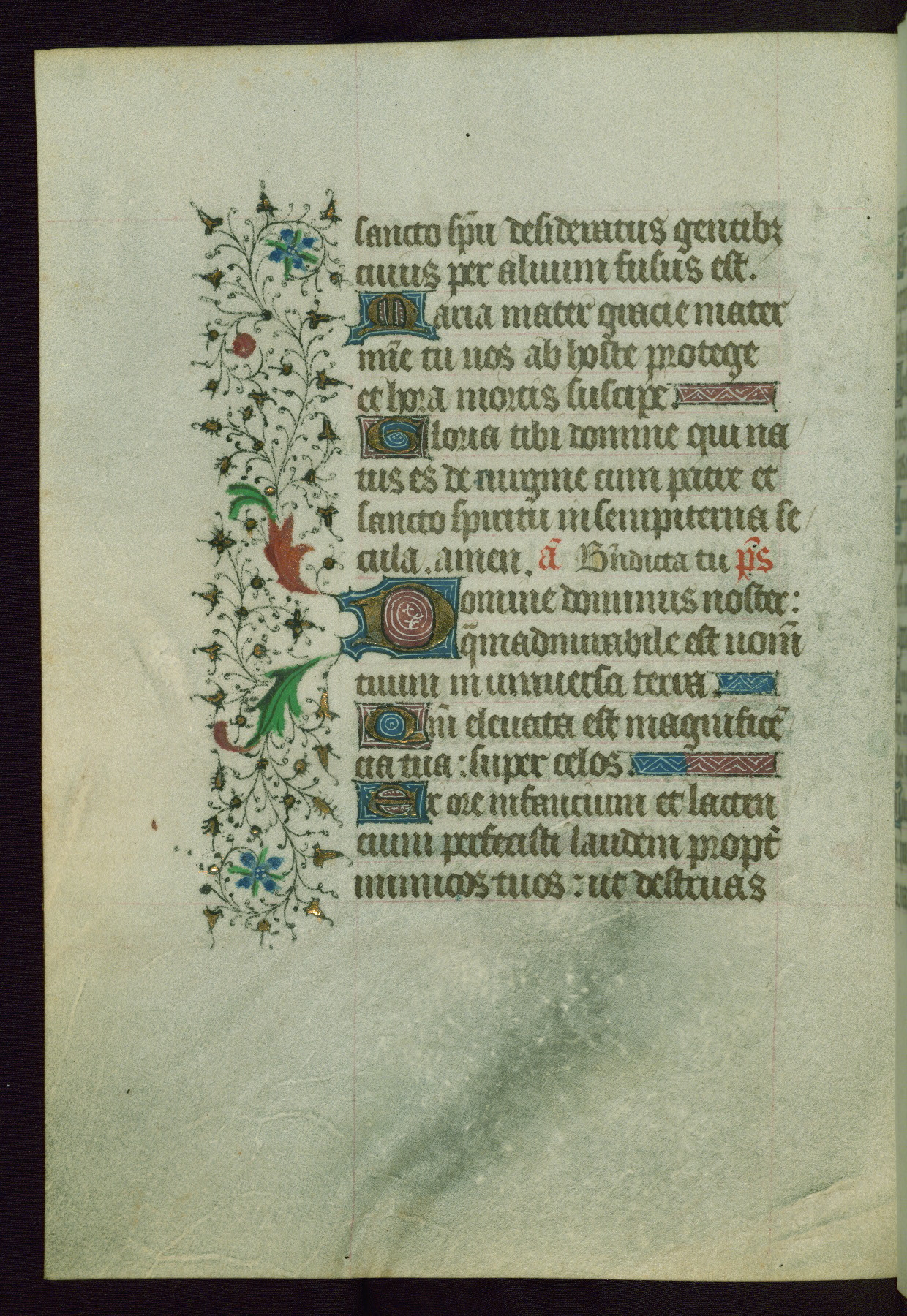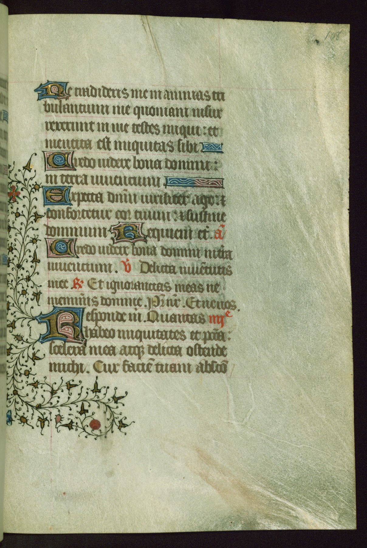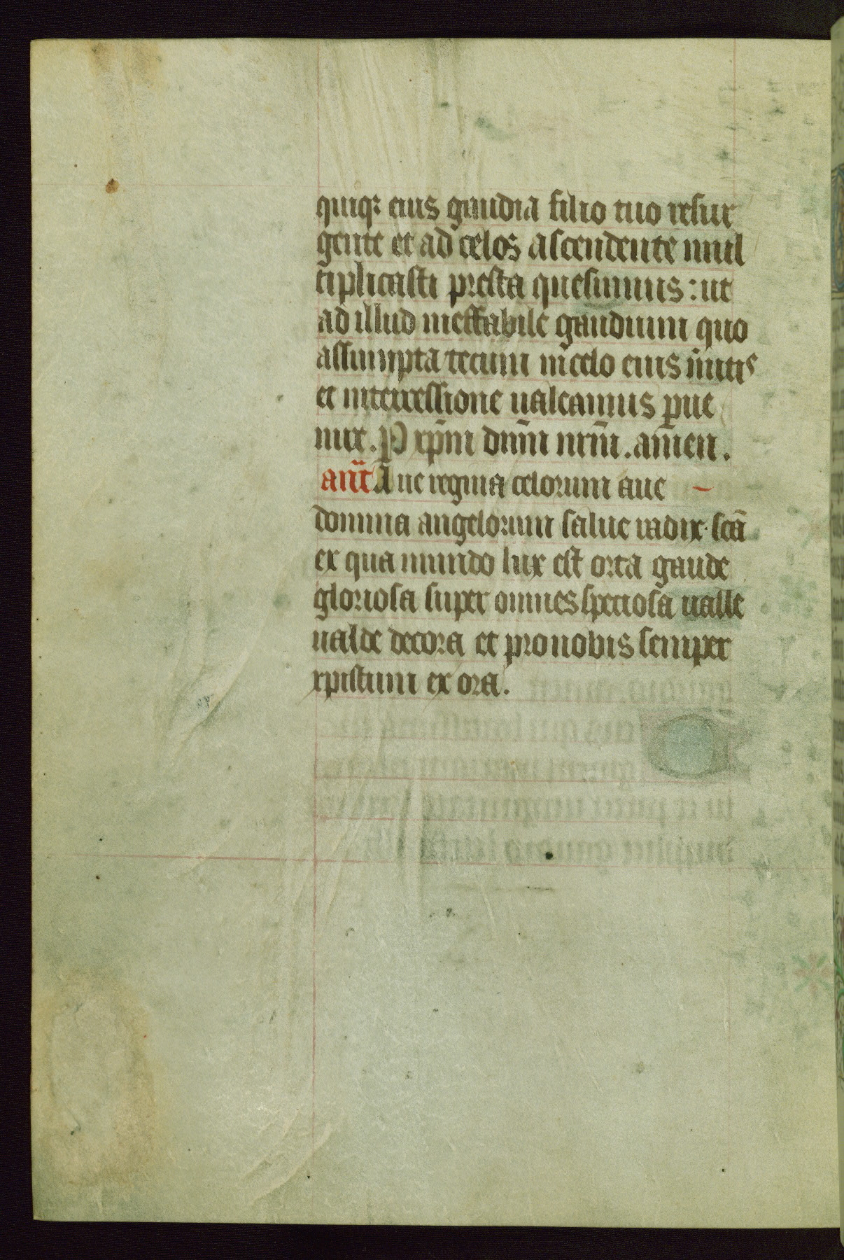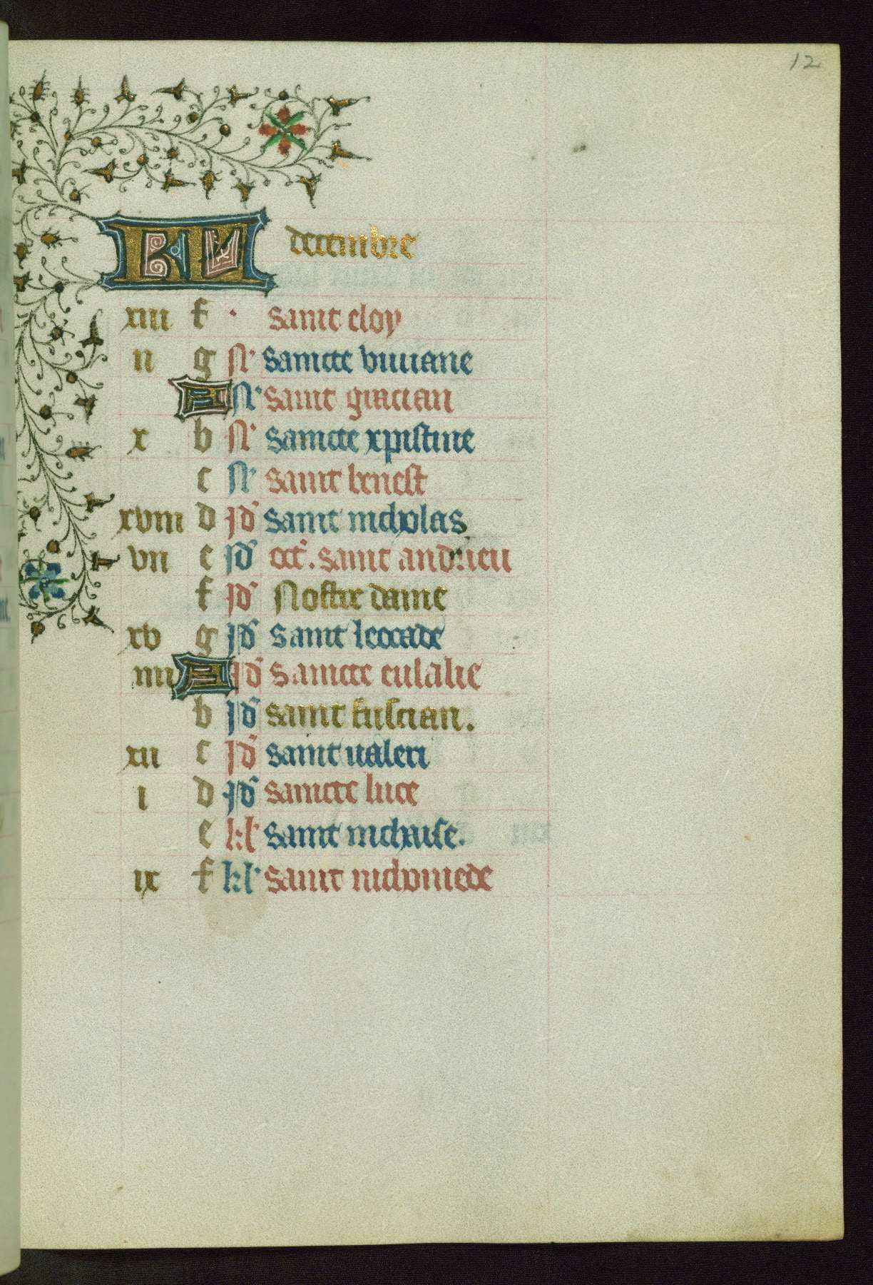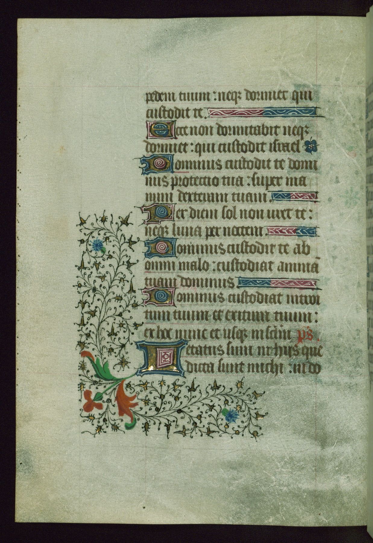 This Book of Hours was created ca. 1435-1440 in Amiens by artists from the circle of the Master of W.281 (Randall, cat. 112) for a female patron depicted on fol. 135r. The manuscript contains fourteen miniatures and is localized to Amiens by the contents of the calendar and litany, which include many saints particular to that region. Quire 12 (fols. 82-89) is misbound with quire 13 (fols. 90-97), with Suffrages and the Seven Verses of St. Bernard (fols. 82-89) intended to be after the Office of the Dead (fols. 90-128), as evinced by the location of the rubric for the Office of the Dead on fol. 81v.
