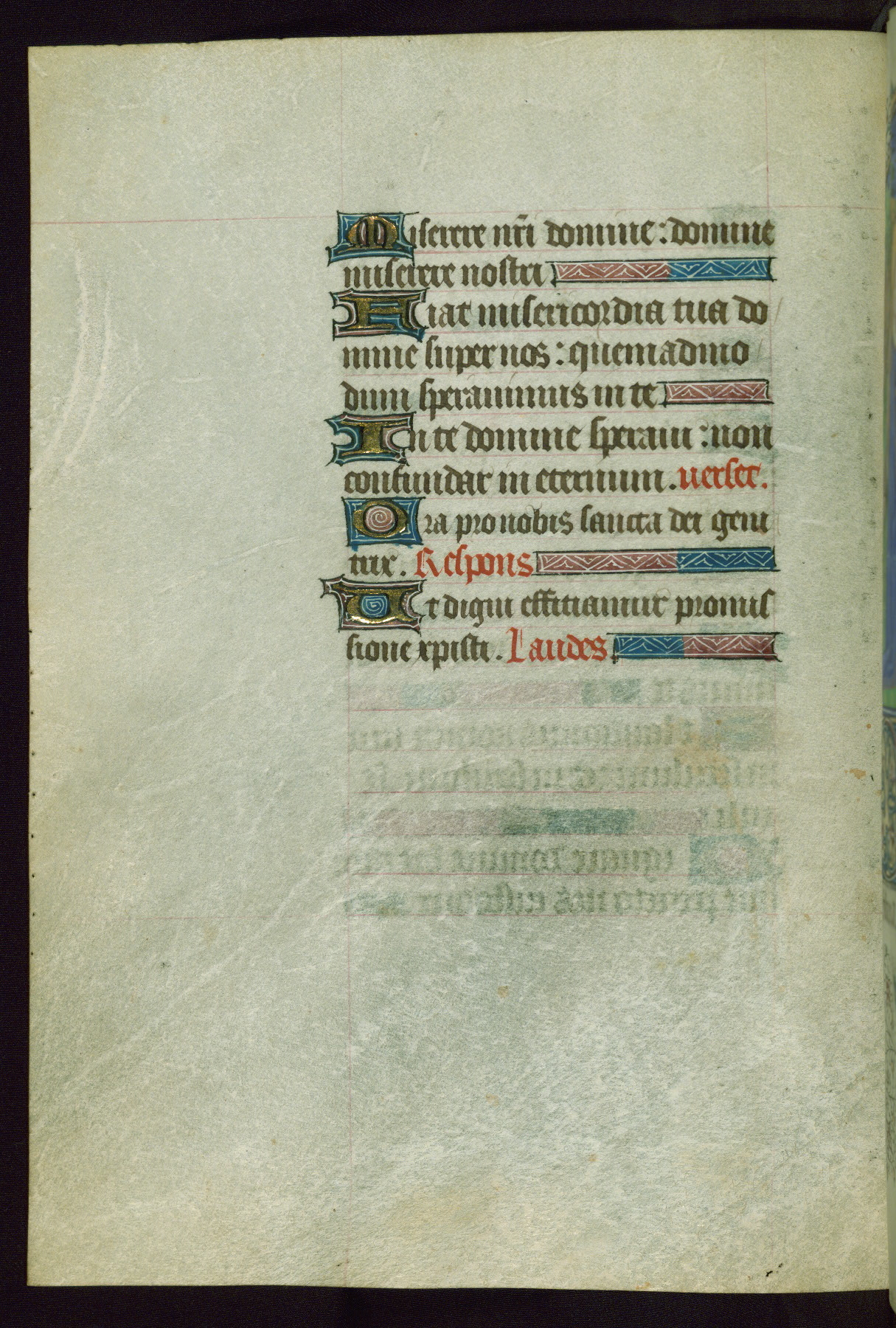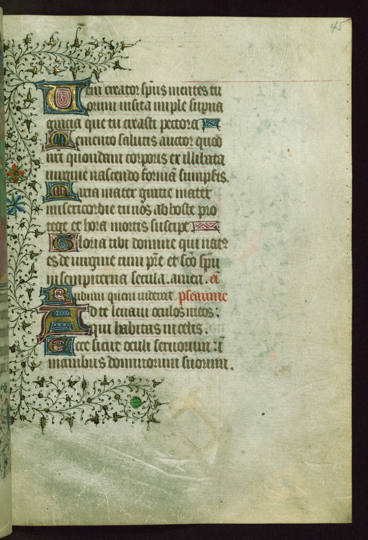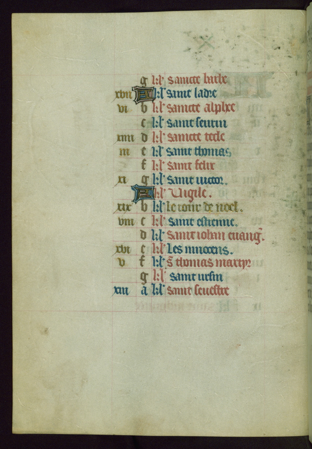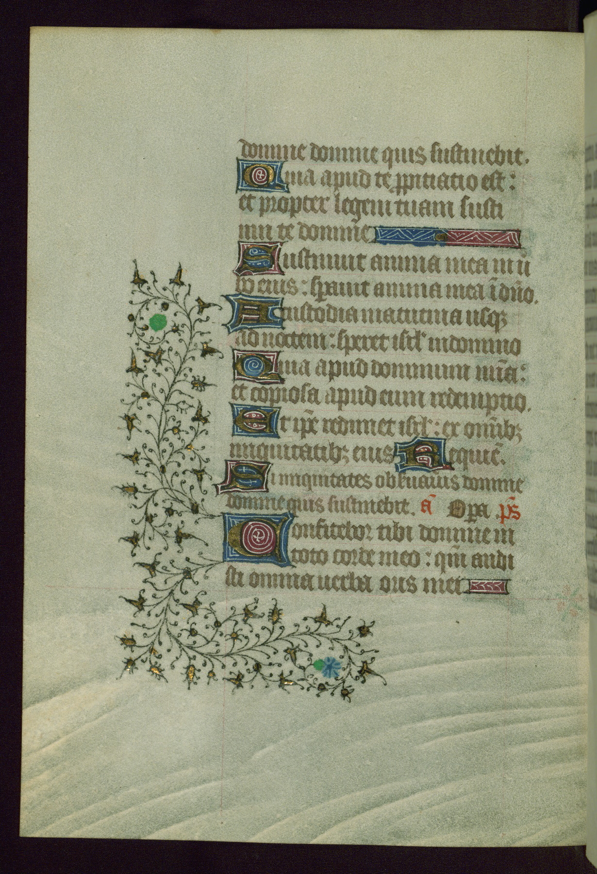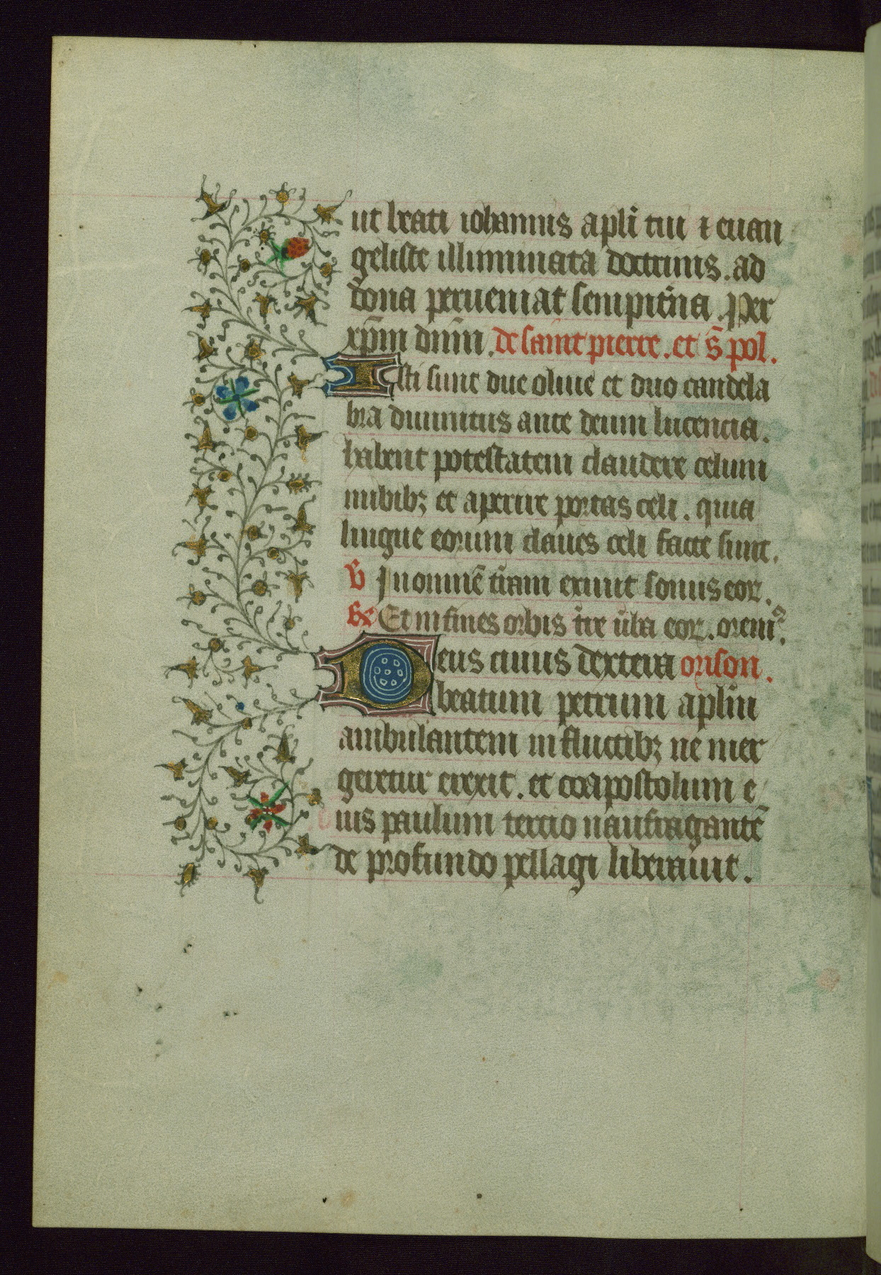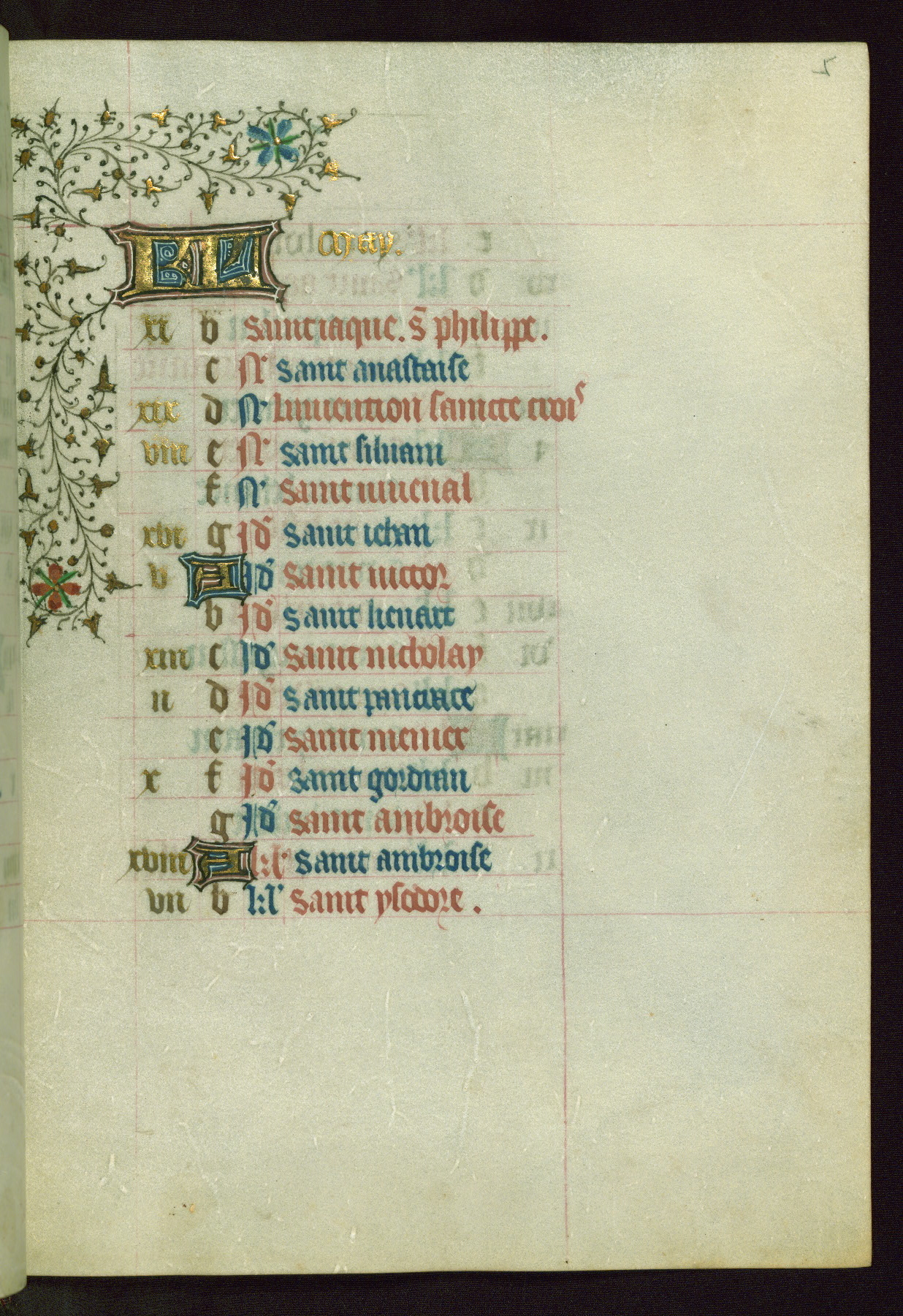 This Book of Hours was created ca. 1435-1440 in Amiens by artists from the circle of the Master of W.281 (Randall, cat. 112) for a female patron depicted on fol. 135r. The manuscript contains fourteen miniatures and is localized to Amiens by the contents of the calendar and litany, which include many saints particular to that region. Quire 12 (fols. 82-89) is misbound with quire 13 (fols. 90-97), with Suffrages and the Seven Verses of St. Bernard (fols. 82-89) intended to be after the Office of the Dead (fols. 90-128), as evinced by the location of the rubric for the Office of the Dead on fol. 81v.
