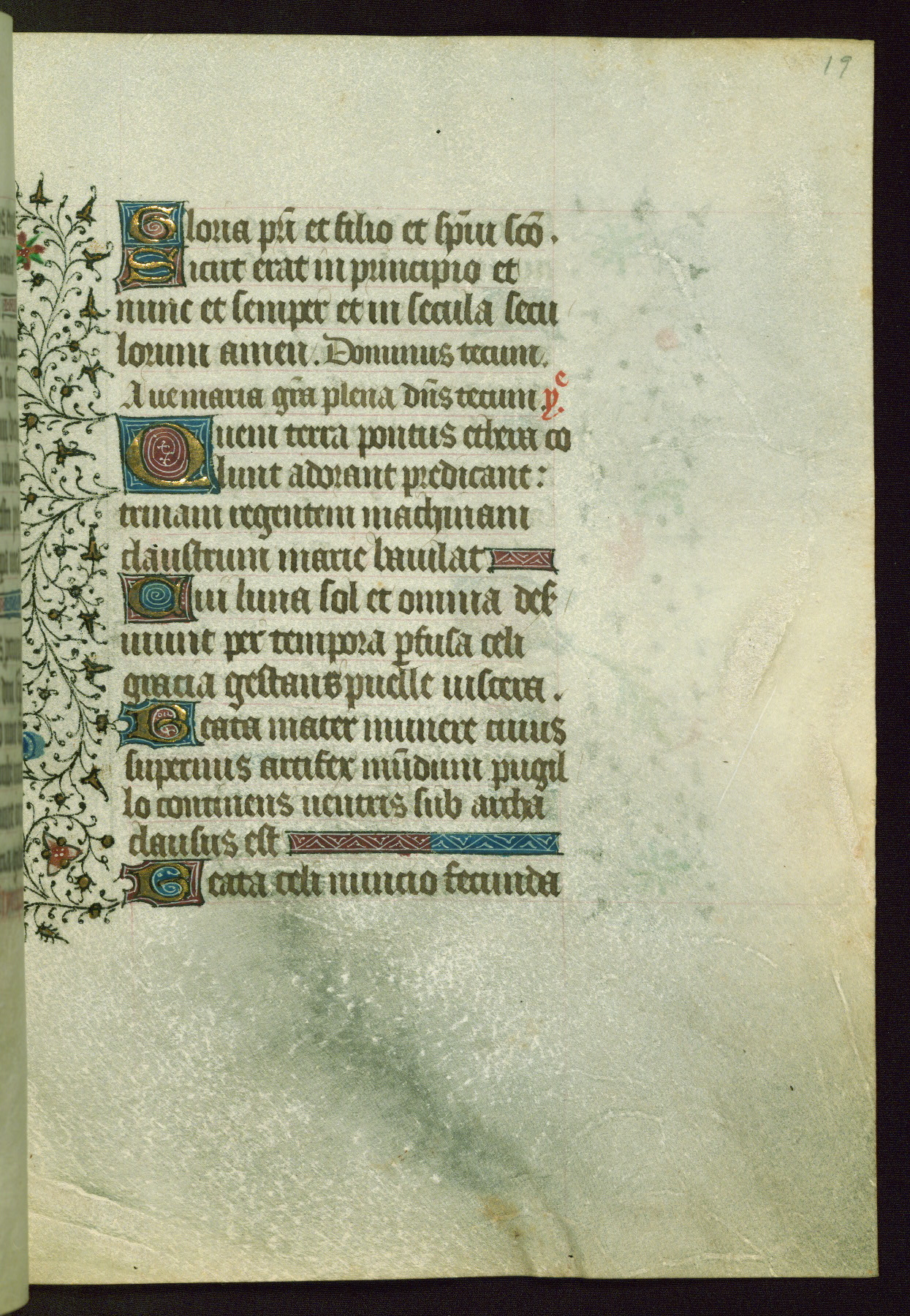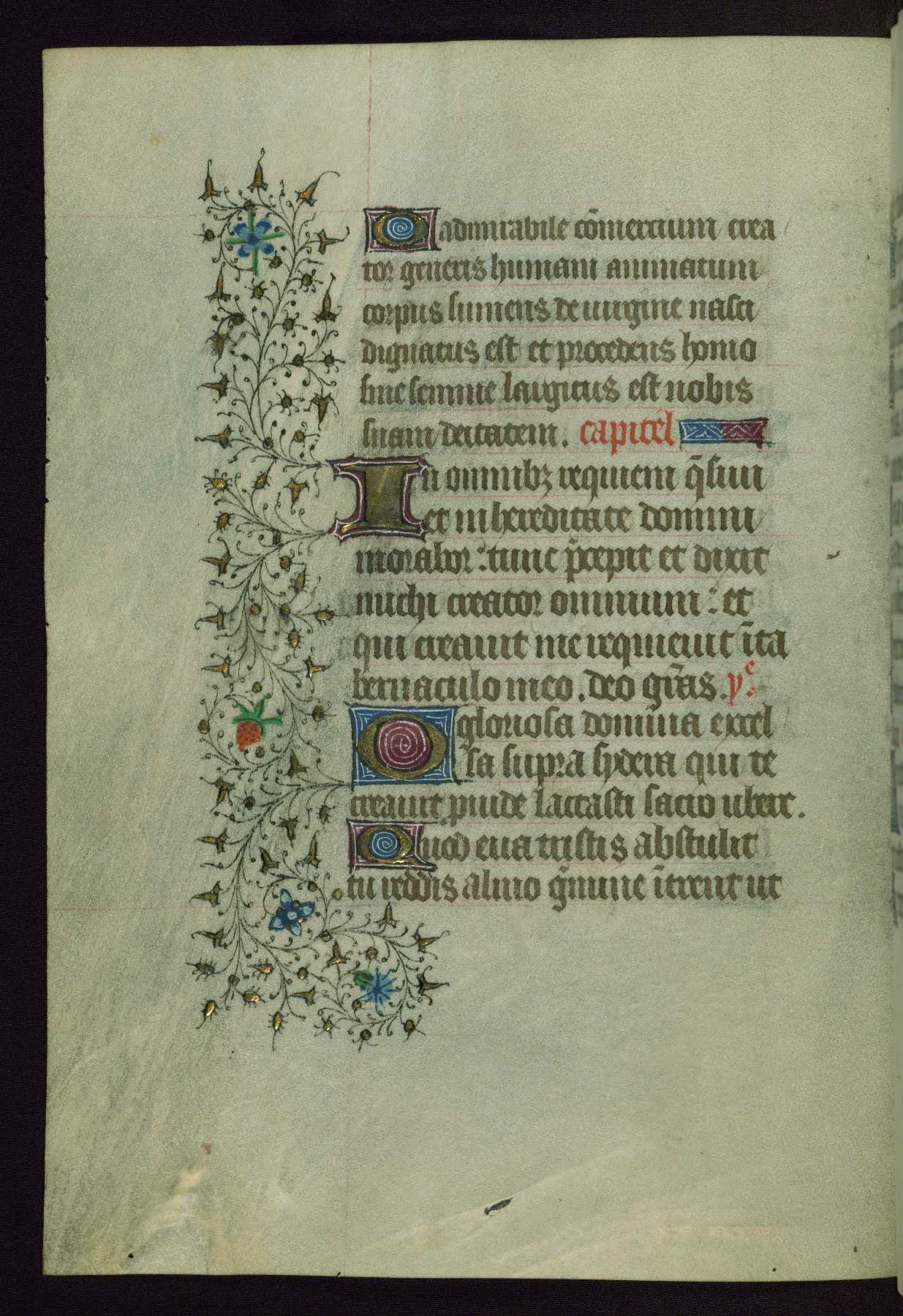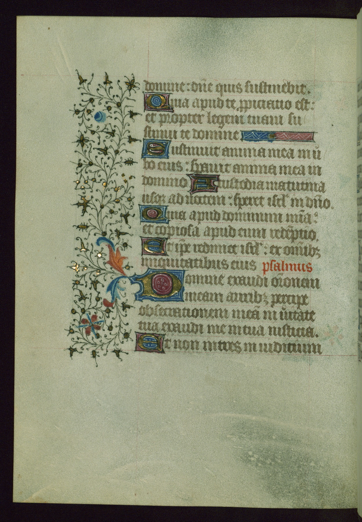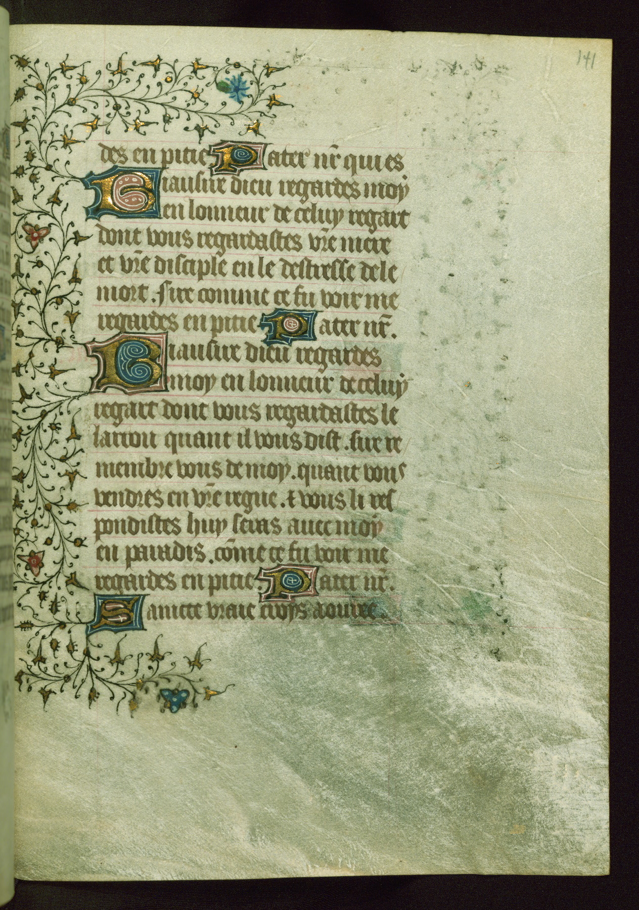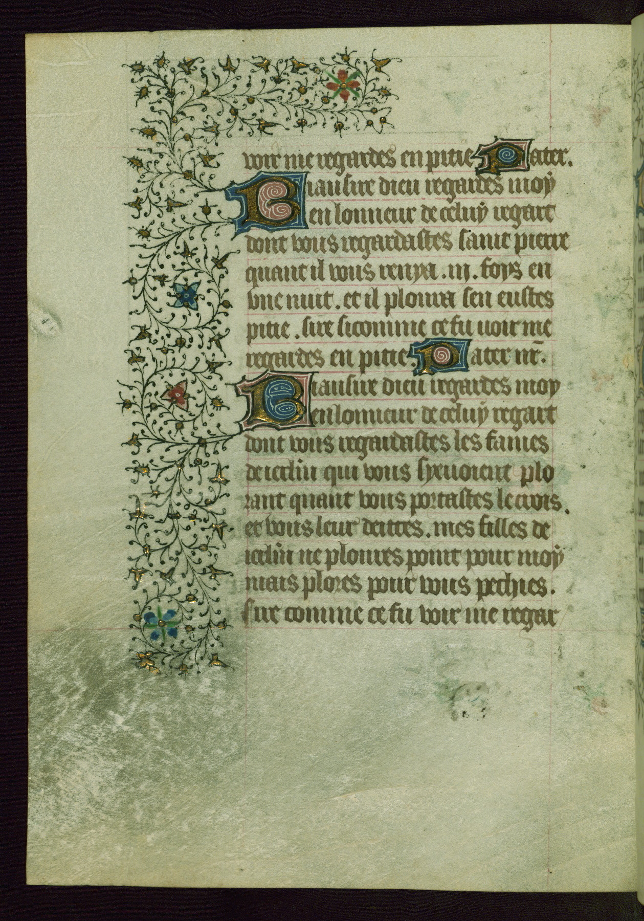 This Book of Hours was created ca. 1435-1440 in Amiens by artists from the circle of the Master of W.281 (Randall, cat. 112) for a female patron depicted on fol. 135r. The manuscript contains fourteen miniatures and is localized to Amiens by the contents of the calendar and litany, which include many saints particular to that region. Quire 12 (fols. 82-89) is misbound with quire 13 (fols. 90-97), with Suffrages and the Seven Verses of St. Bernard (fols. 82-89) intended to be after the Office of the Dead (fols. 90-128), as evinced by the location of the rubric for the Office of the Dead on fol. 81v.