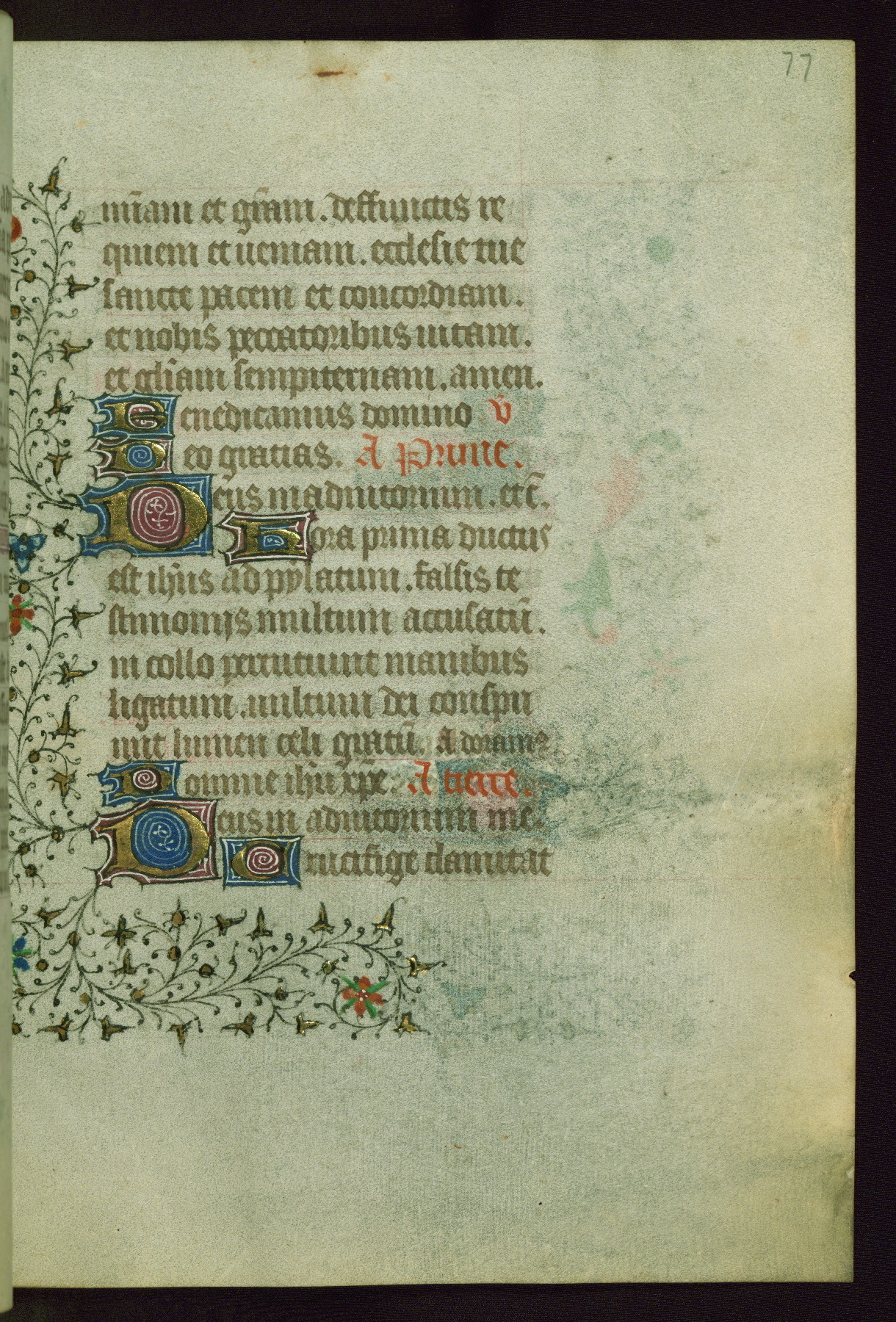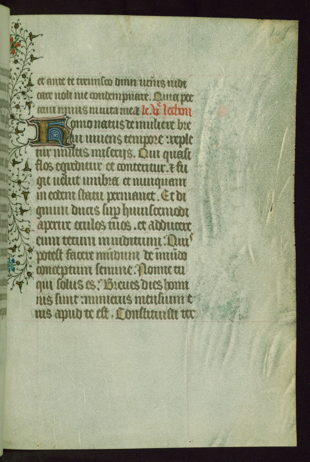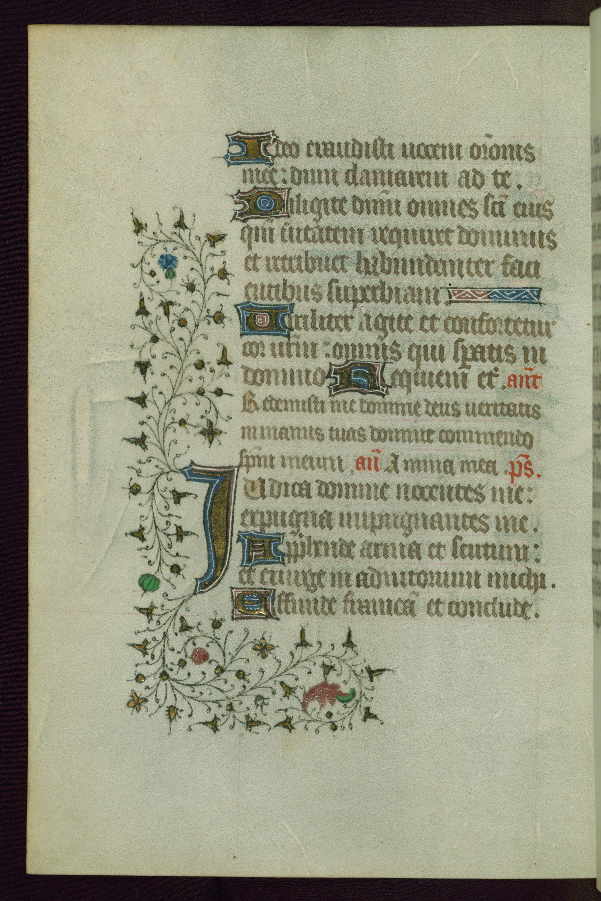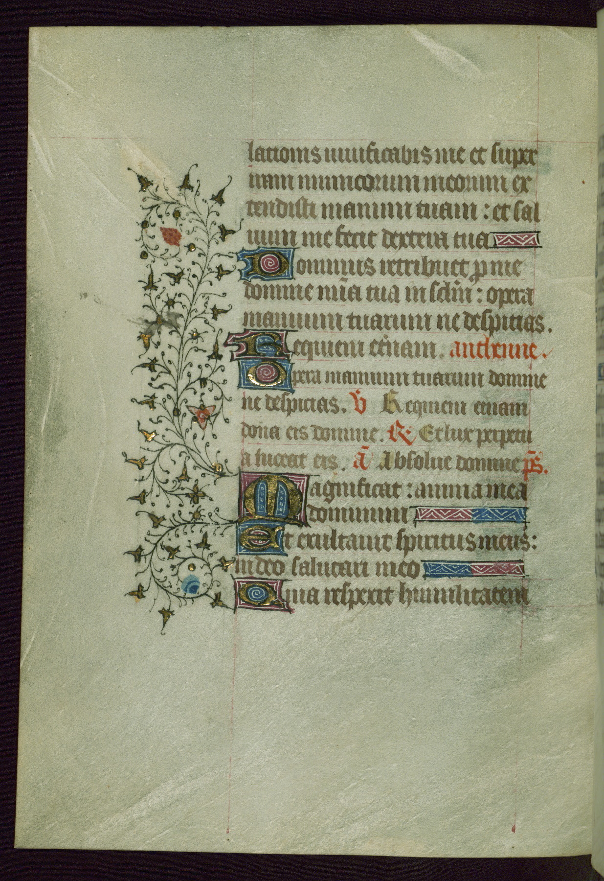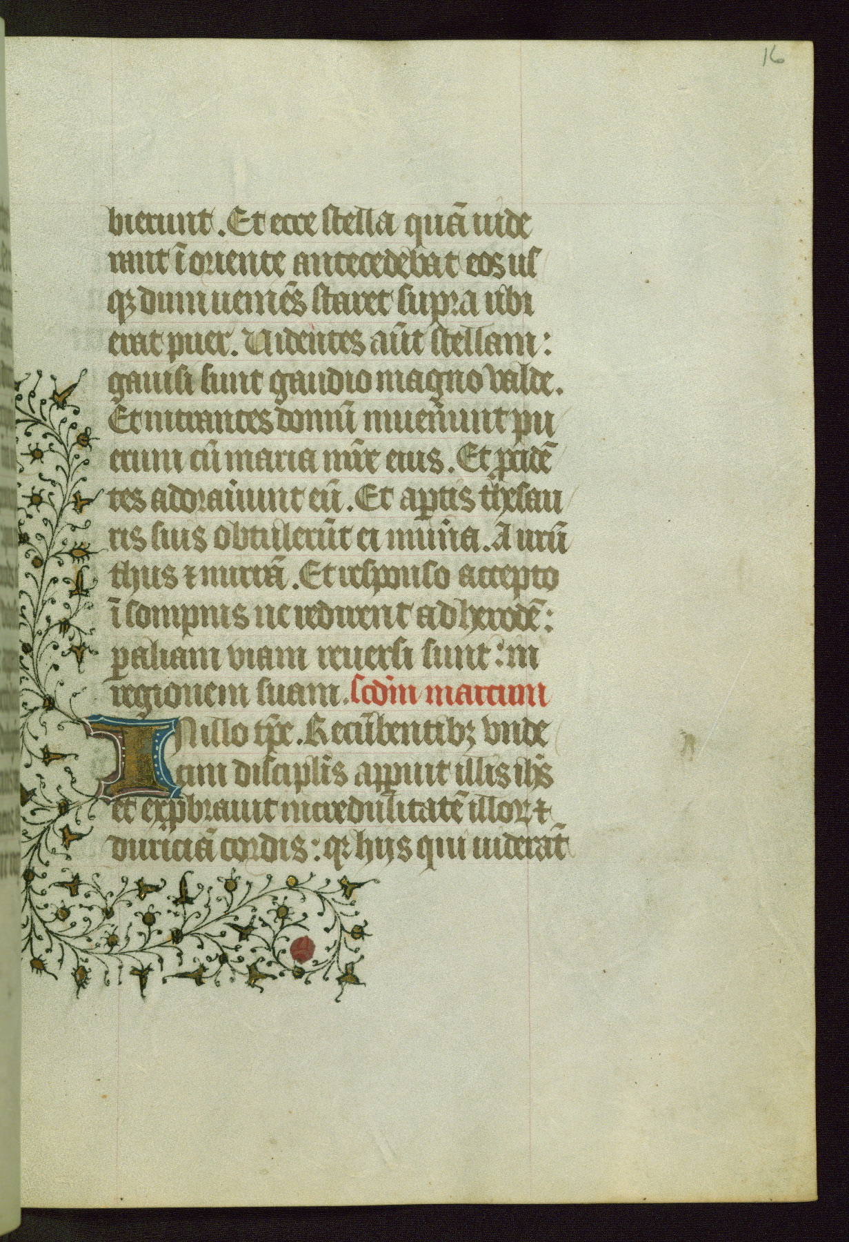 This Book of Hours was created ca. 1435-1440 in Amiens by artists from the circle of the Master of W.281 (Randall, cat. 112) for a female patron depicted on fol. 135r. The manuscript contains fourteen miniatures and is localized to Amiens by the contents of the calendar and litany, which include many saints particular to that region. Quire 12 (fols. 82-89) is misbound with quire 13 (fols. 90-97), with Suffrages and the Seven Verses of St. Bernard (fols. 82-89) intended to be after the Office of the Dead (fols. 90-128), as evinced by the location of the rubric for the Office of the Dead on fol. 81v.