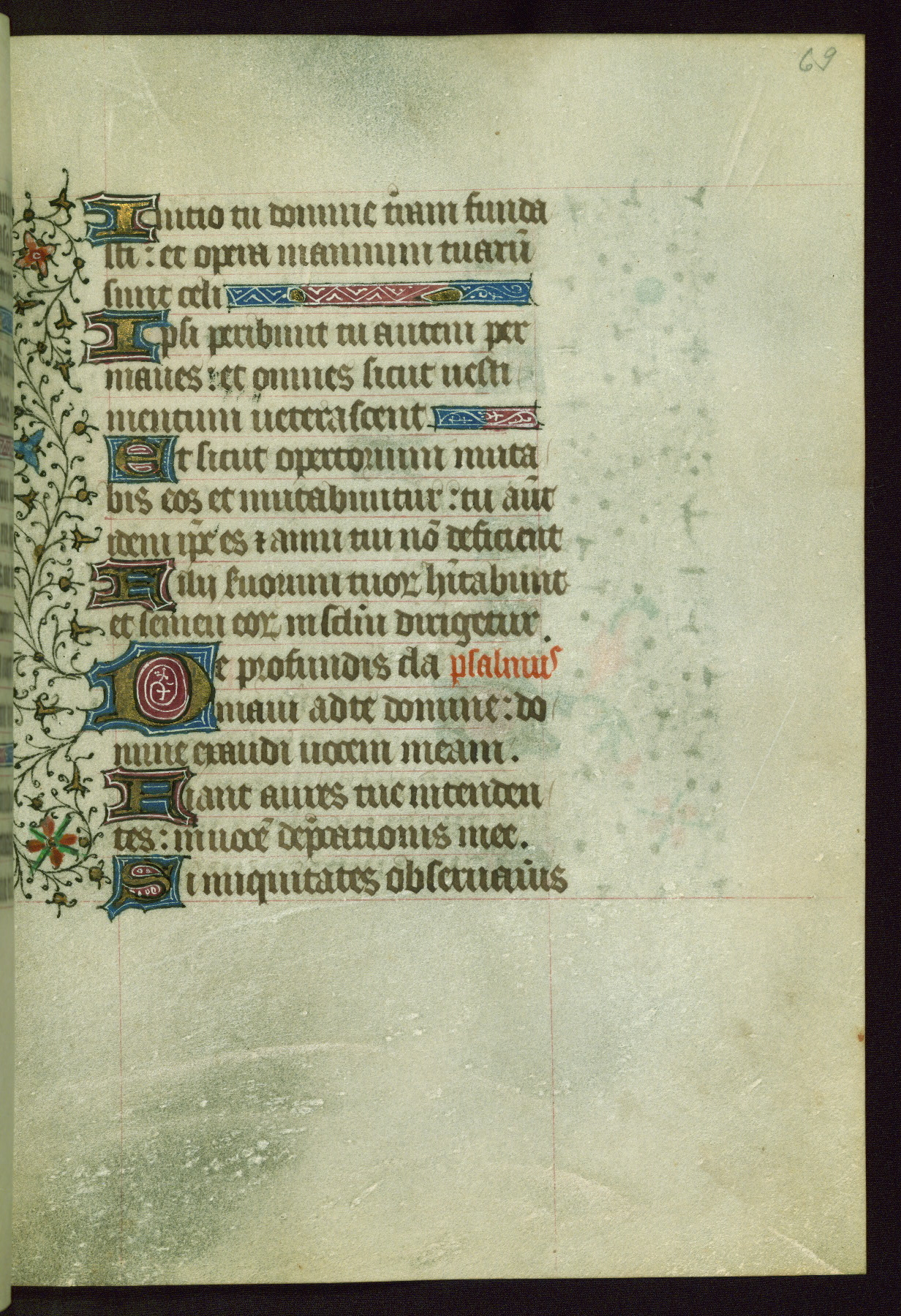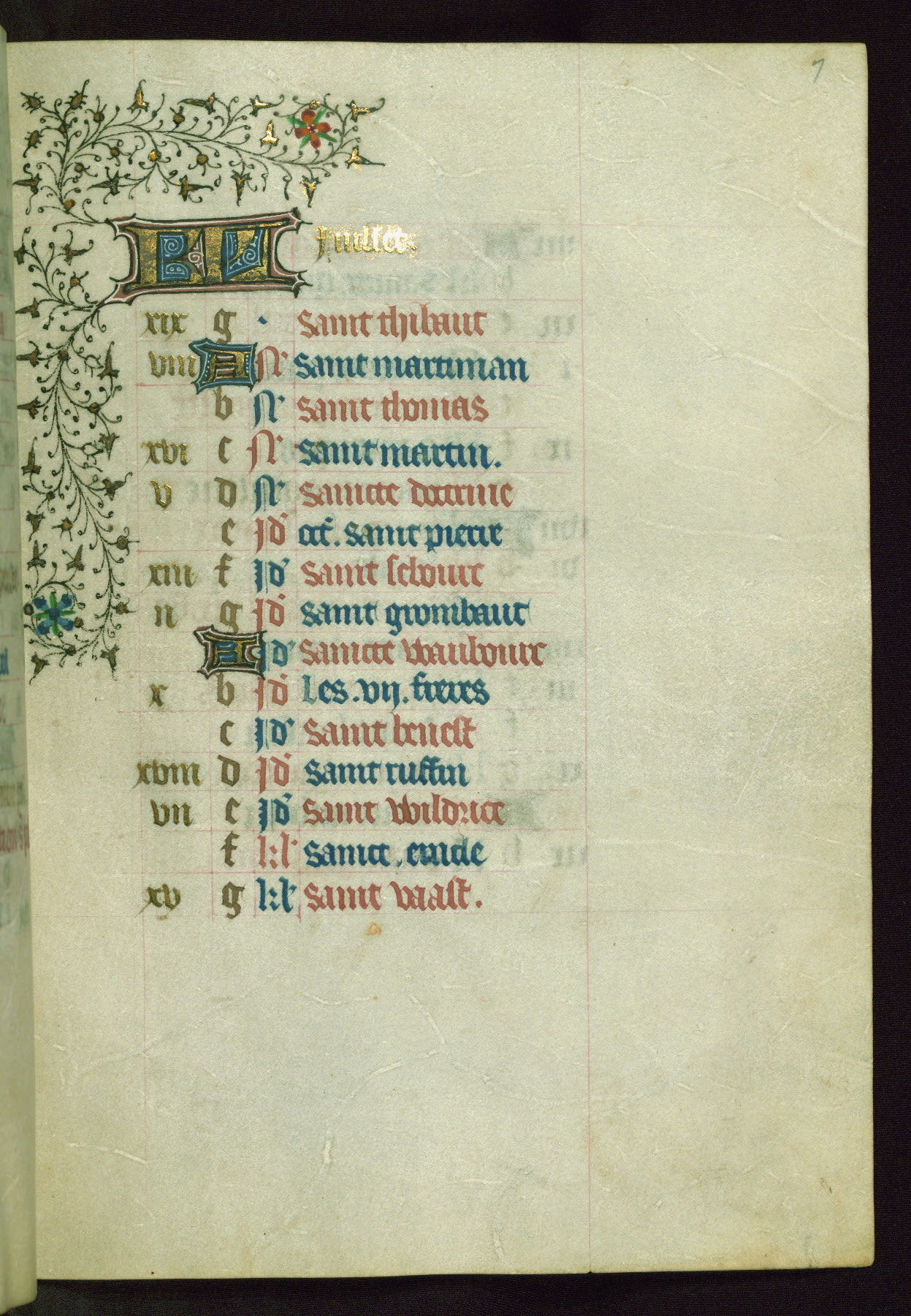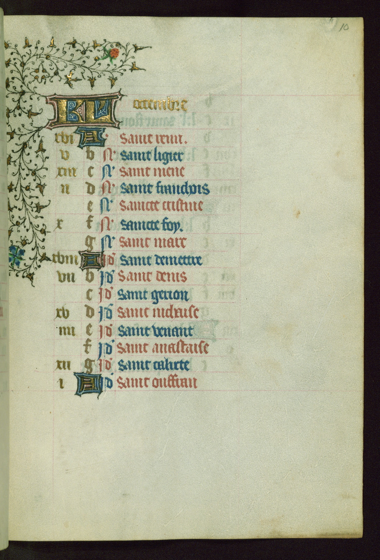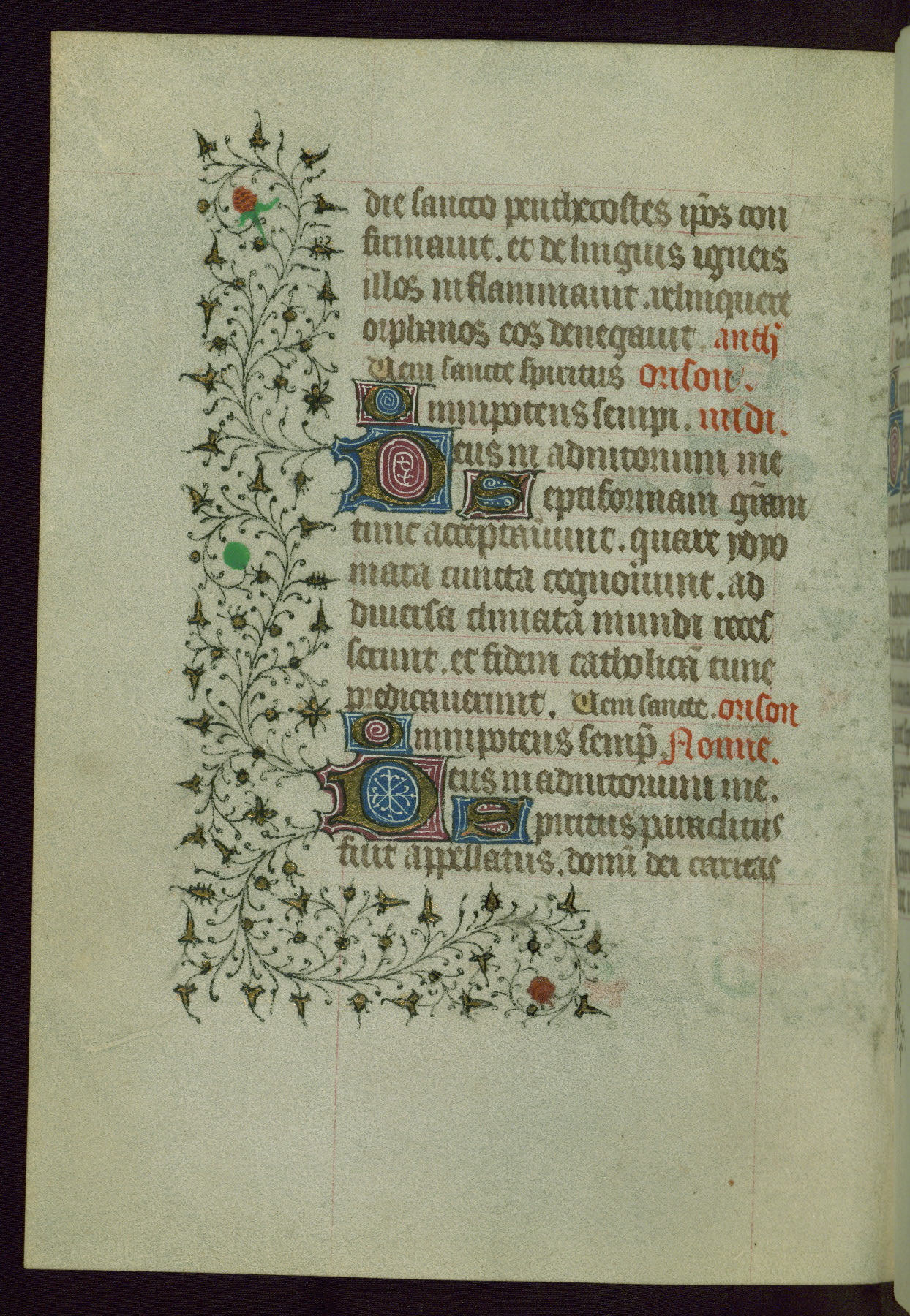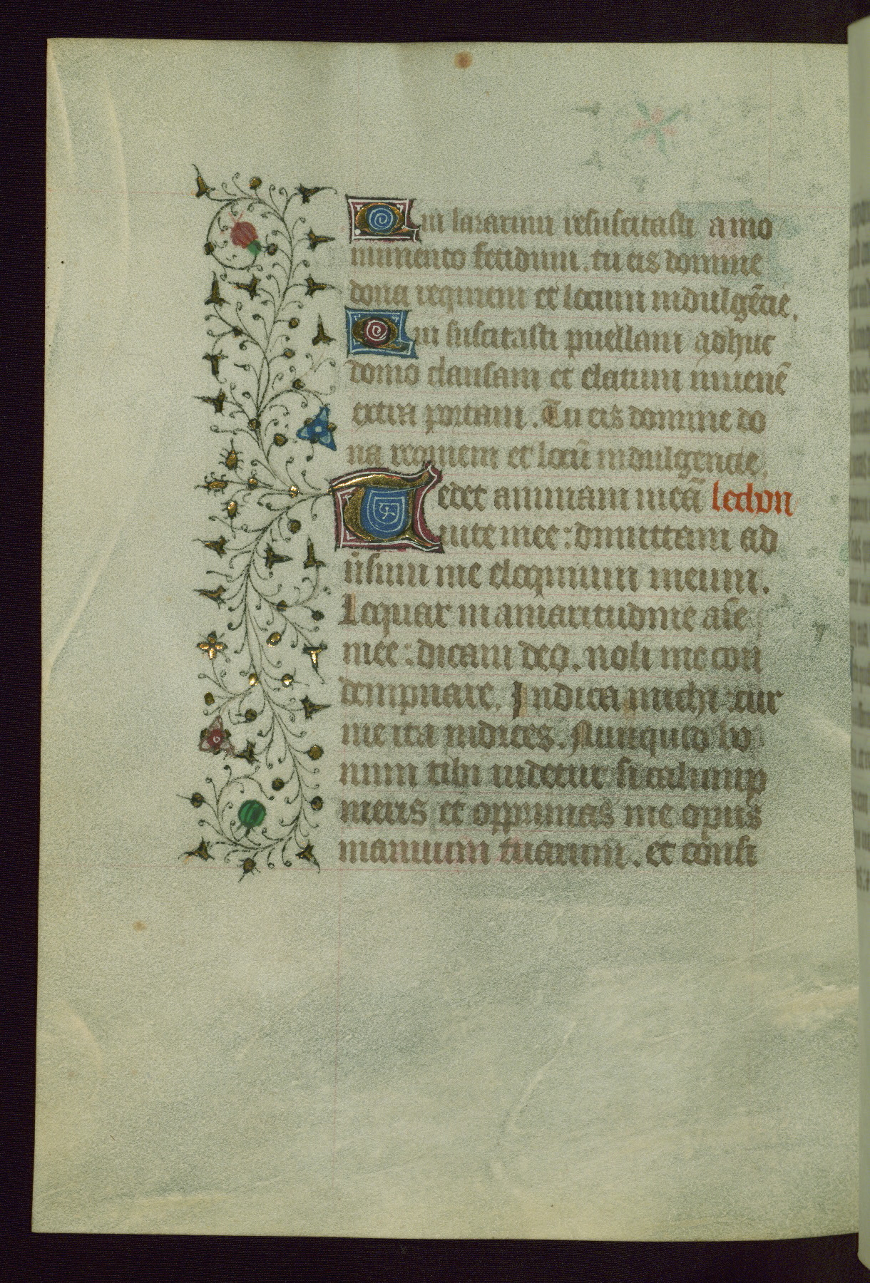 This Book of Hours was created ca. 1435-1440 in Amiens by artists from the circle of the Master of W.281 (Randall, cat. 112) for a female patron depicted on fol. 135r. The manuscript contains fourteen miniatures and is localized to Amiens by the contents of the calendar and litany, which include many saints particular to that region. Quire 12 (fols. 82-89) is misbound with quire 13 (fols. 90-97), with Suffrages and the Seven Verses of St. Bernard (fols. 82-89) intended to be after the Office of the Dead (fols. 90-128), as evinced by the location of the rubric for the Office of the Dead on fol. 81v.