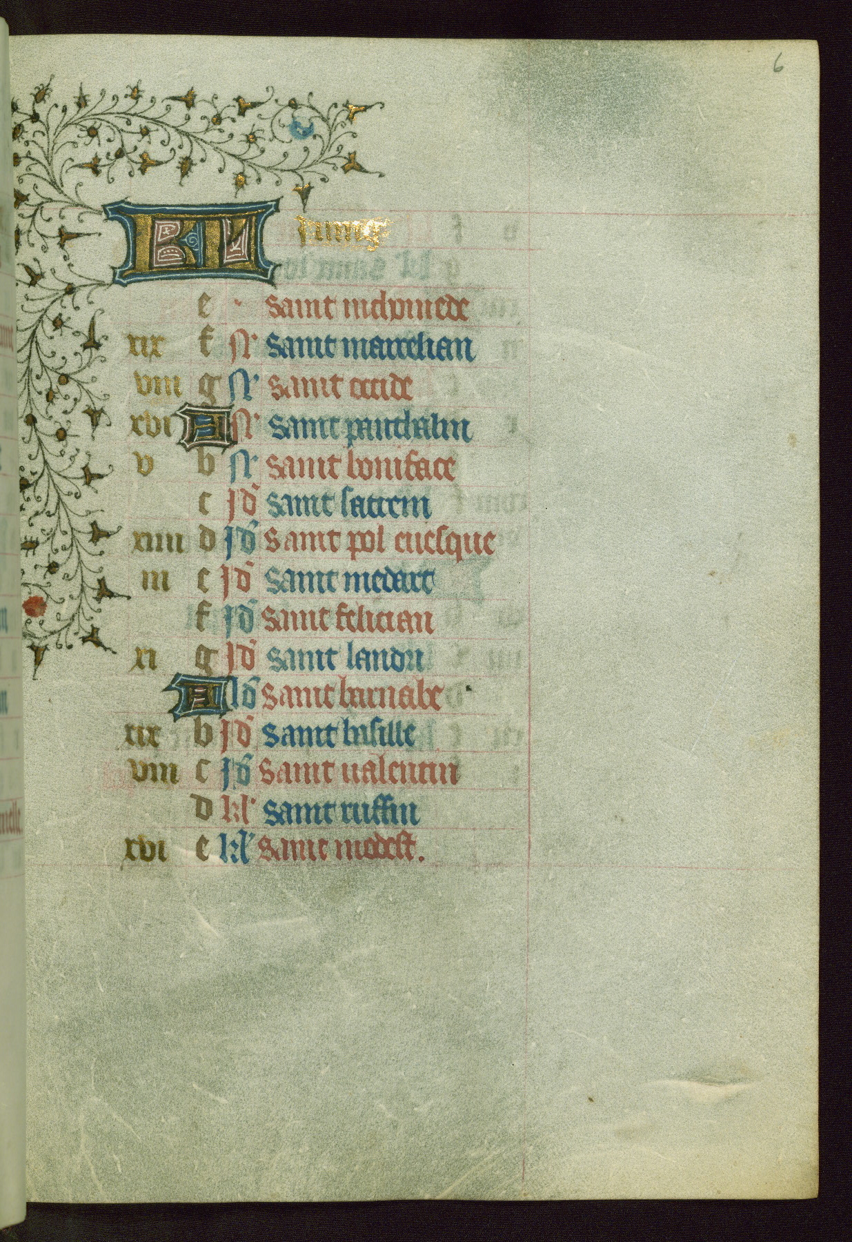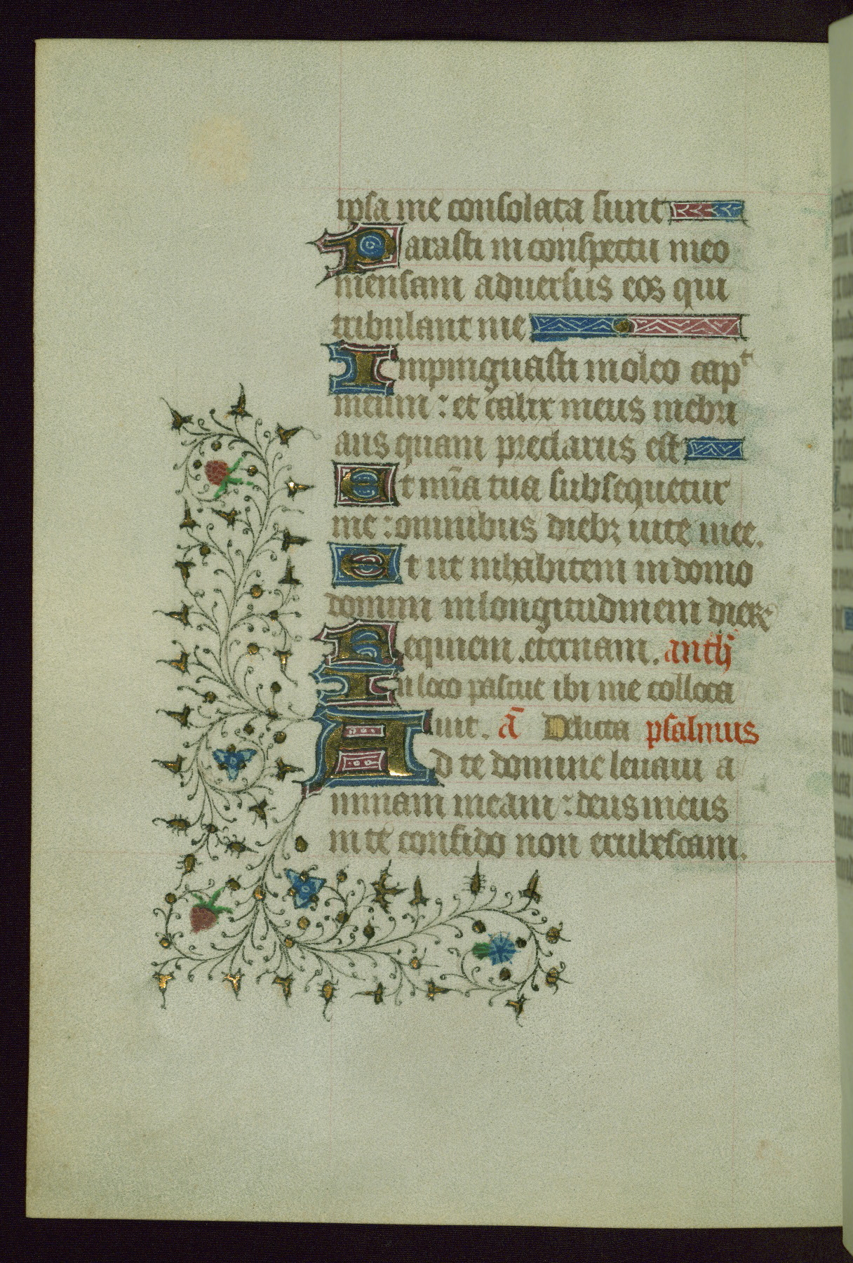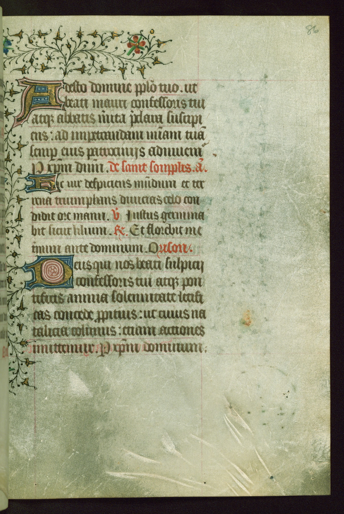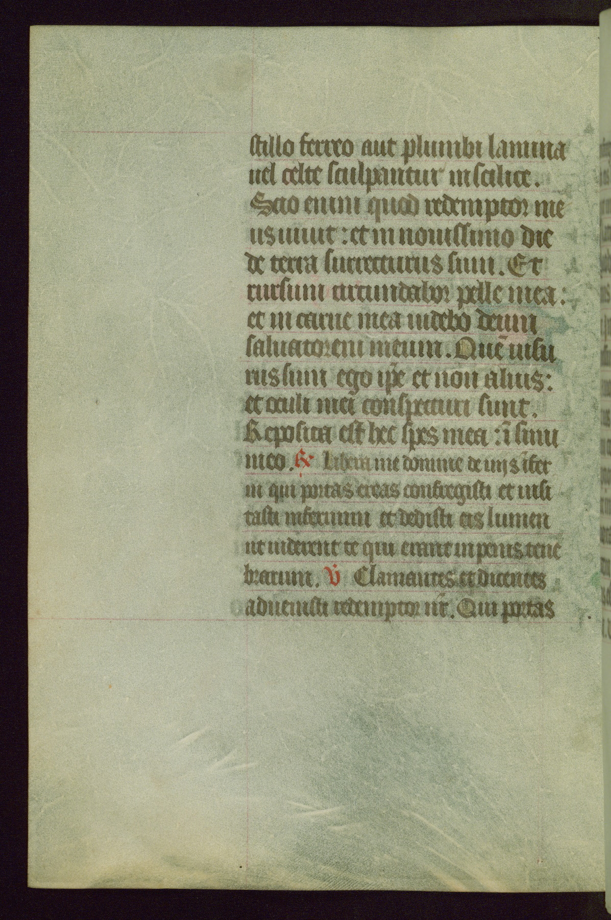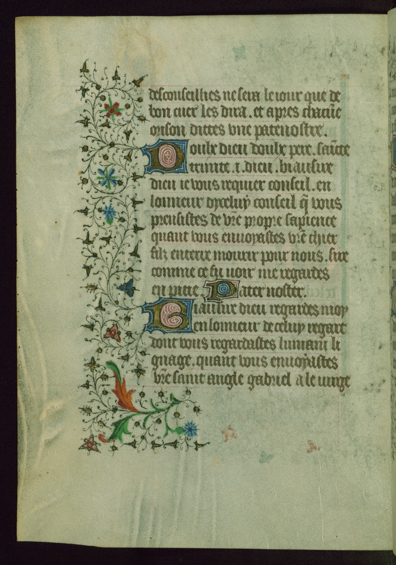 This Book of Hours was created ca. 1435-1440 in Amiens by artists from the circle of the Master of W.281 (Randall, cat. 112) for a female patron depicted on fol. 135r. The manuscript contains fourteen miniatures and is localized to Amiens by the contents of the calendar and litany, which include many saints particular to that region. Quire 12 (fols. 82-89) is misbound with quire 13 (fols. 90-97), with Suffrages and the Seven Verses of St. Bernard (fols. 82-89) intended to be after the Office of the Dead (fols. 90-128), as evinced by the location of the rubric for the Office of the Dead on fol. 81v.