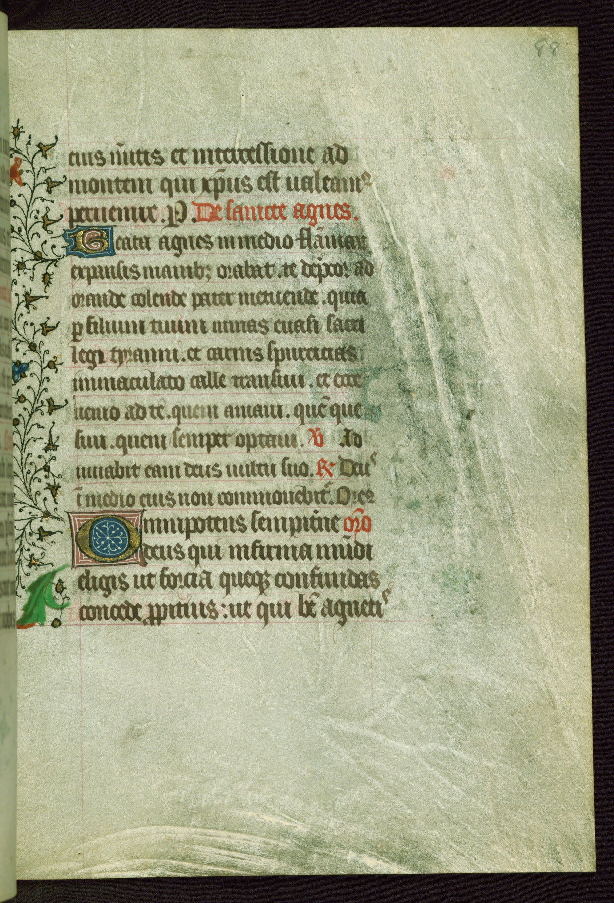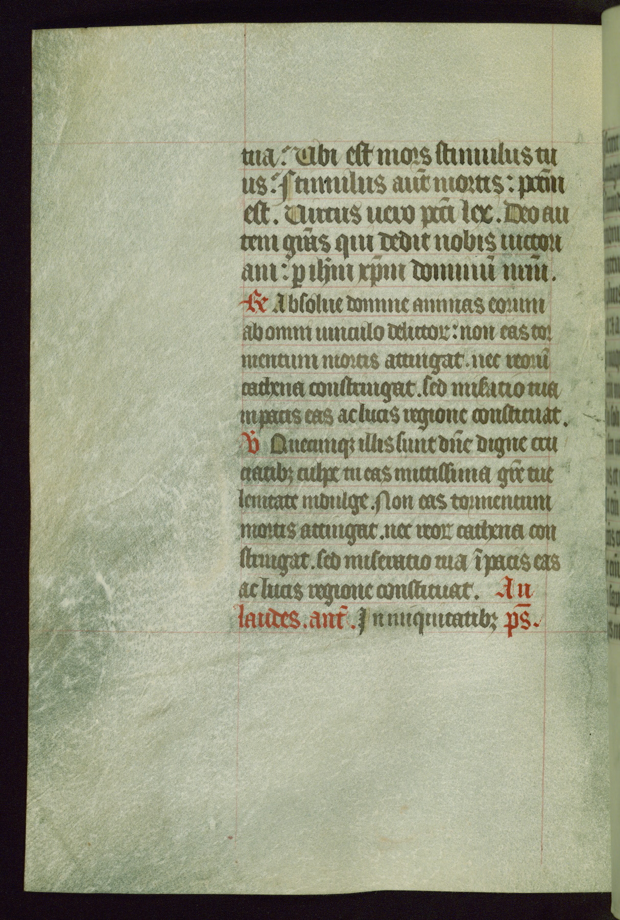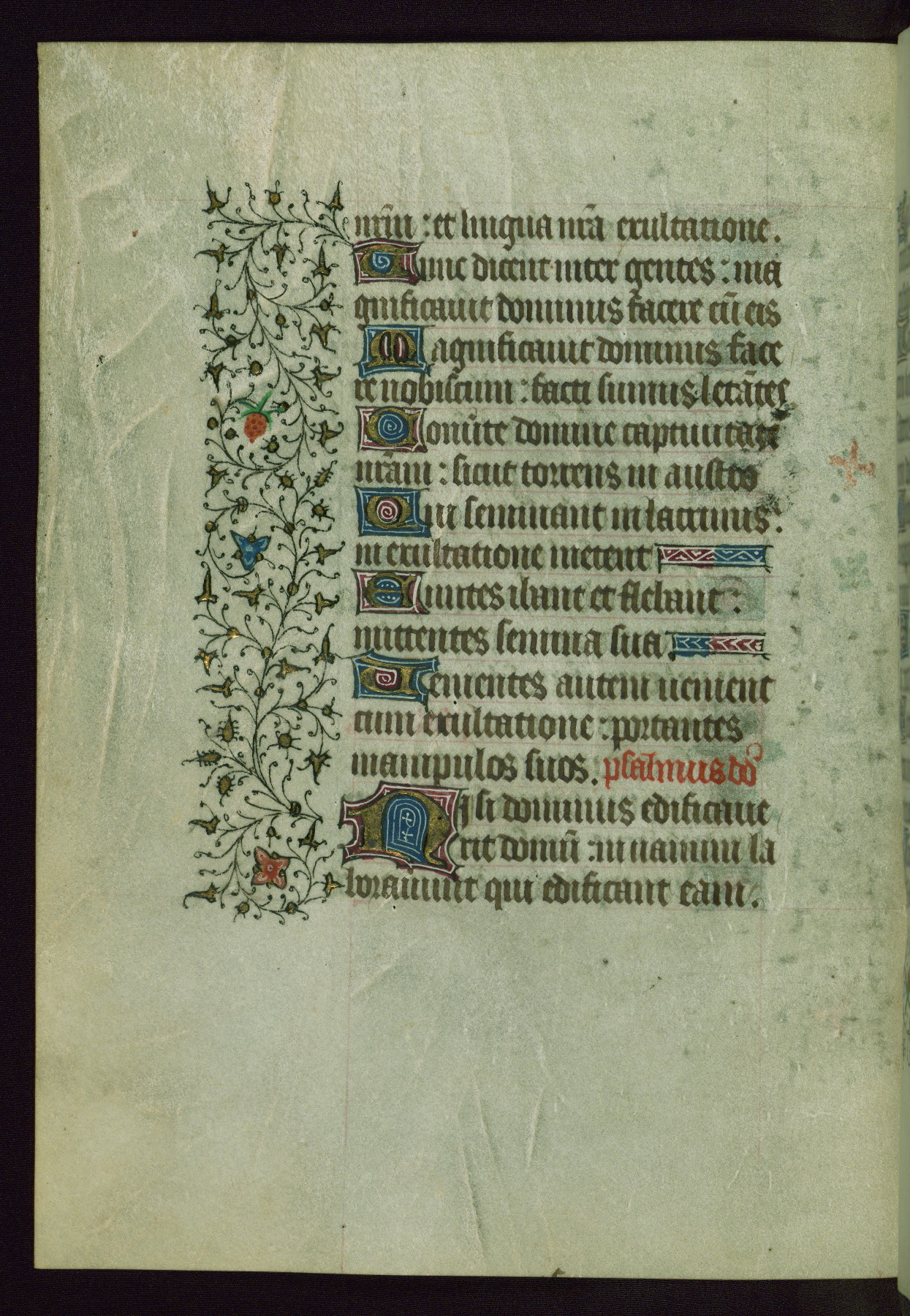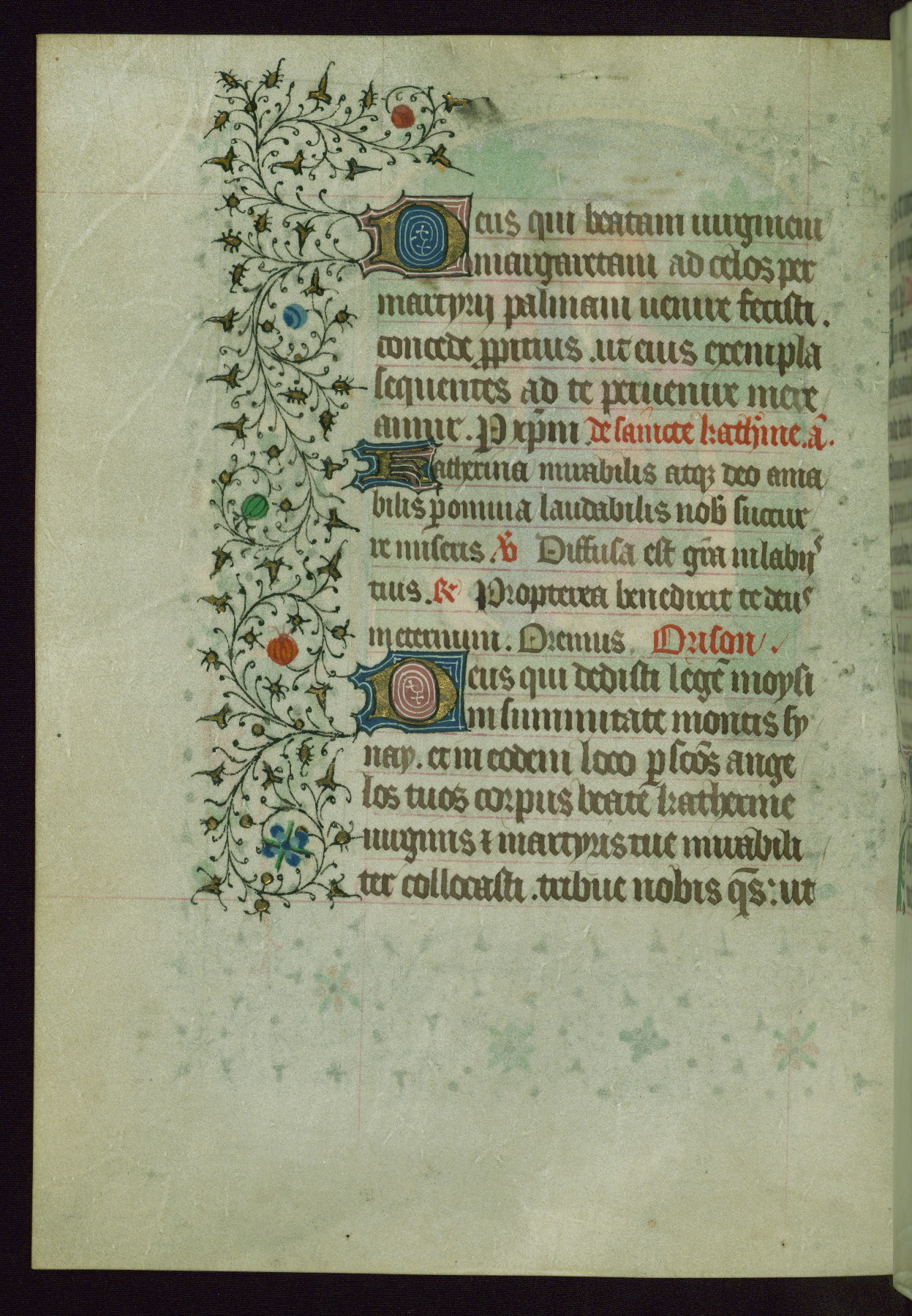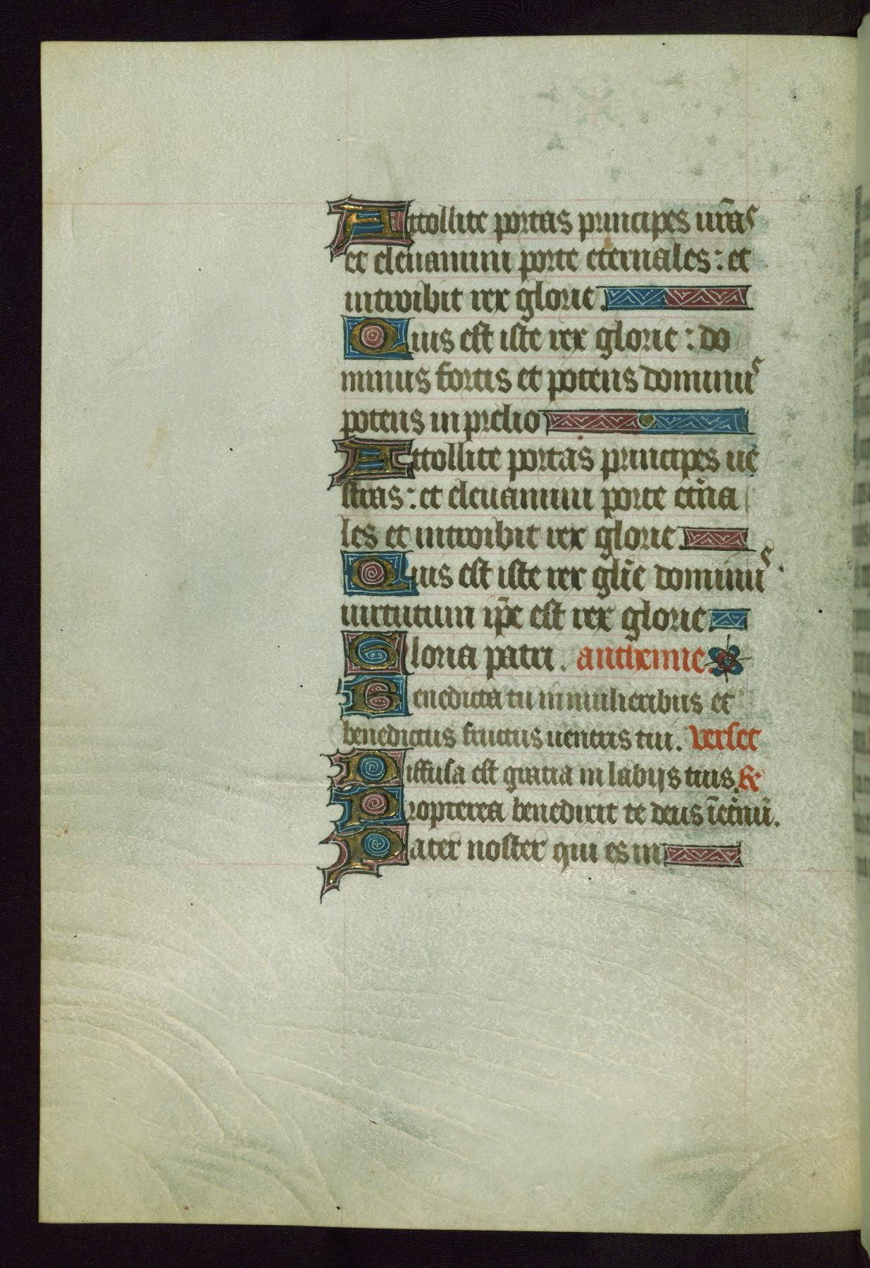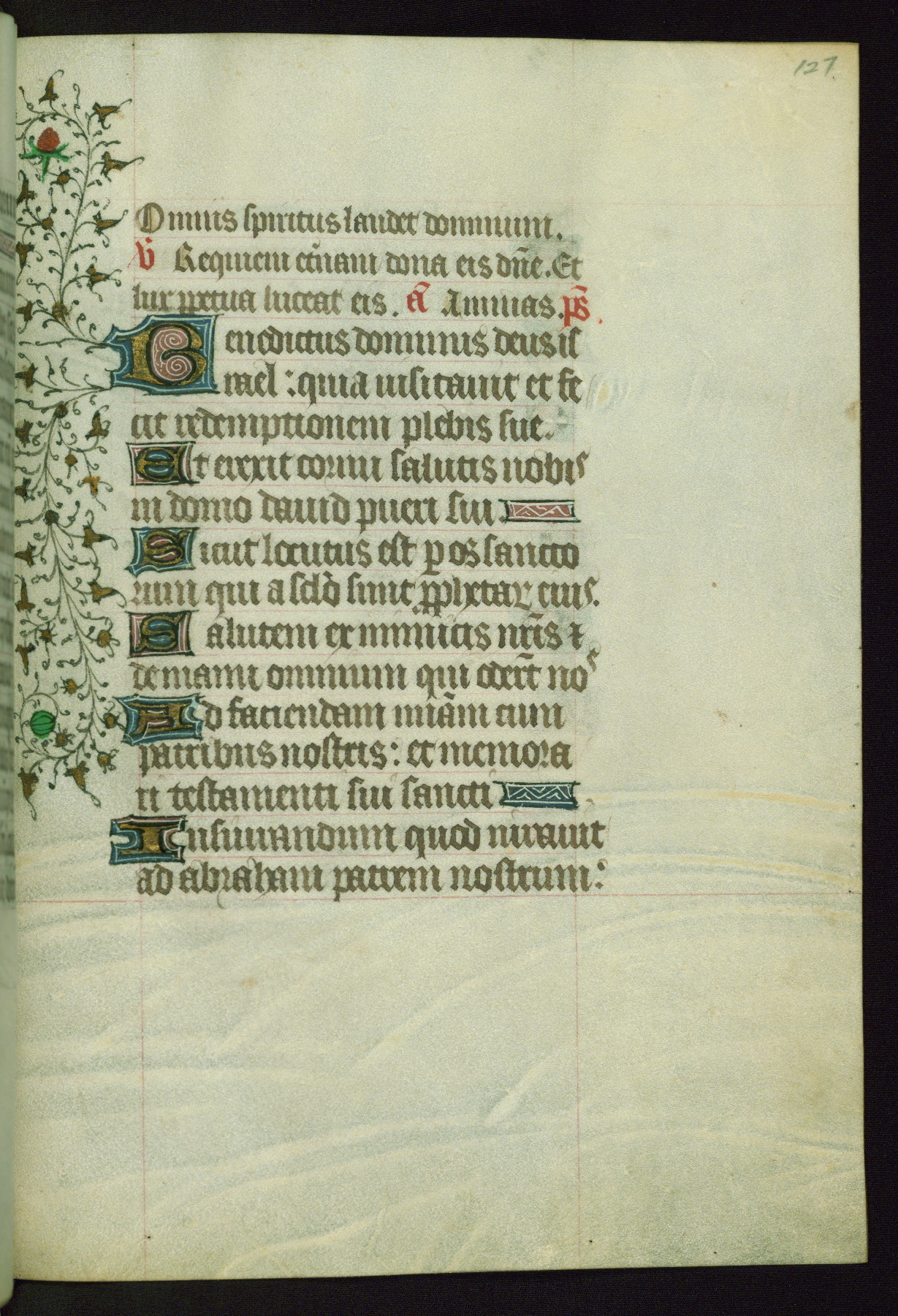 This Book of Hours was created ca. 1435-1440 in Amiens by artists from the circle of the Master of W.281 (Randall, cat. 112) for a female patron depicted on fol. 135r. The manuscript contains fourteen miniatures and is localized to Amiens by the contents of the calendar and litany, which include many saints particular to that region. Quire 12 (fols. 82-89) is misbound with quire 13 (fols. 90-97), with Suffrages and the Seven Verses of St. Bernard (fols. 82-89) intended to be after the Office of the Dead (fols. 90-128), as evinced by the location of the rubric for the Office of the Dead on fol. 81v.