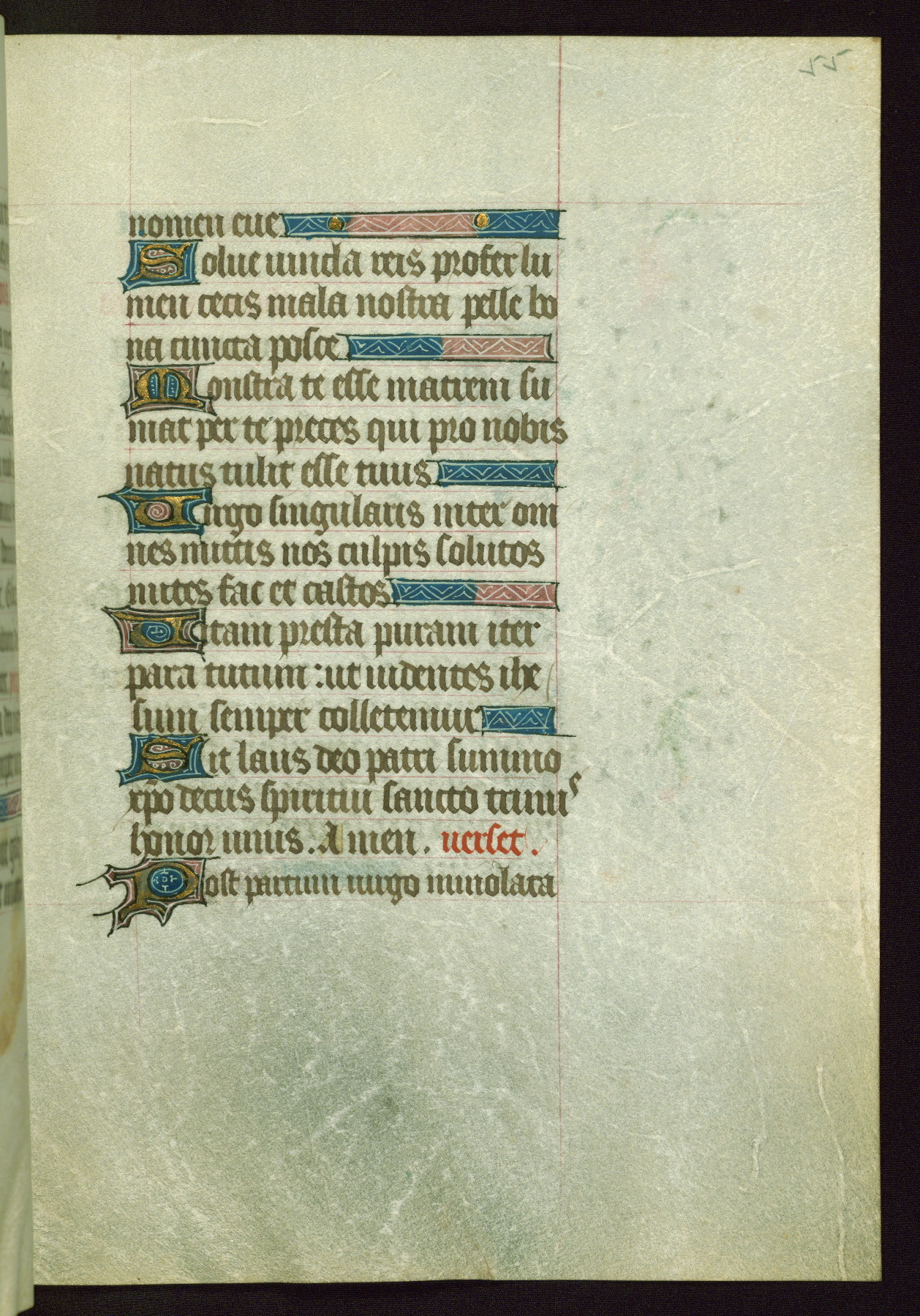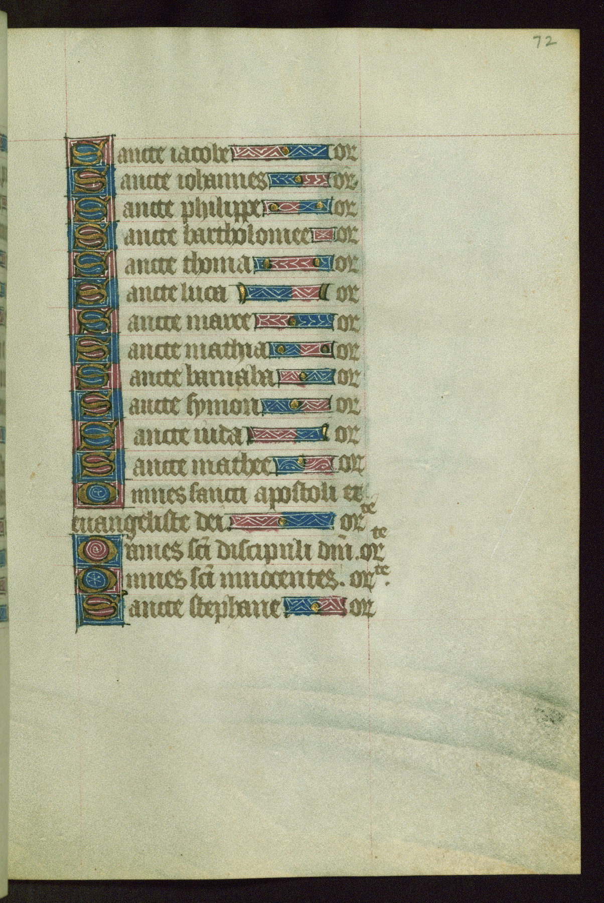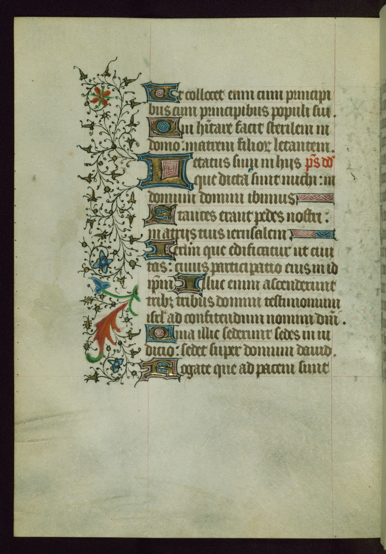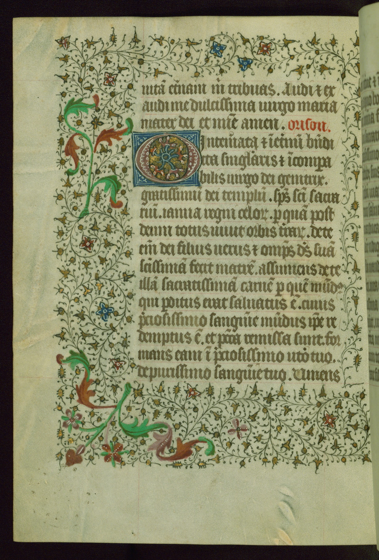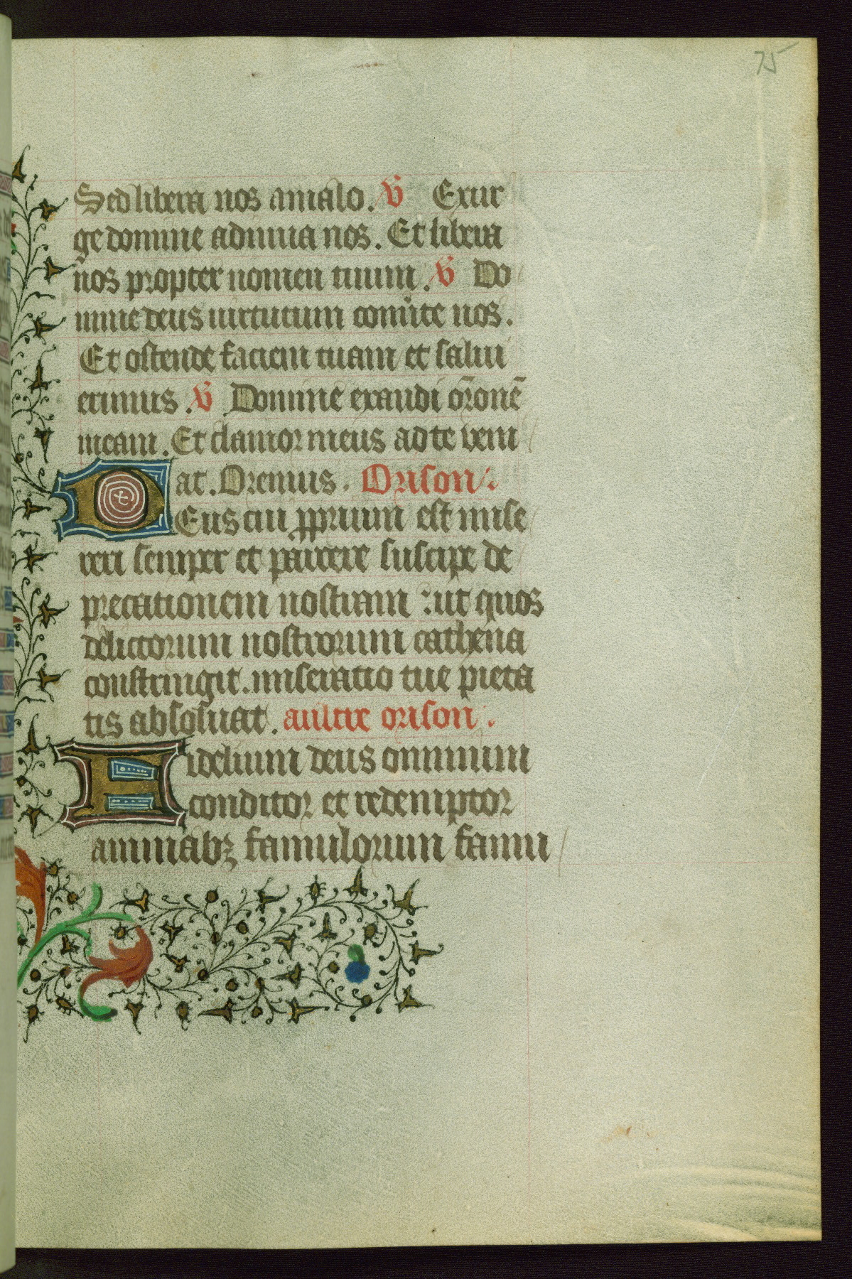 This Book of Hours was created ca. 1435-1440 in Amiens by artists from the circle of the Master of W.281 (Randall, cat. 112) for a female patron depicted on fol. 135r. The manuscript contains fourteen miniatures and is localized to Amiens by the contents of the calendar and litany, which include many saints particular to that region. Quire 12 (fols. 82-89) is misbound with quire 13 (fols. 90-97), with Suffrages and the Seven Verses of St. Bernard (fols. 82-89) intended to be after the Office of the Dead (fols. 90-128), as evinced by the location of the rubric for the Office of the Dead on fol. 81v.