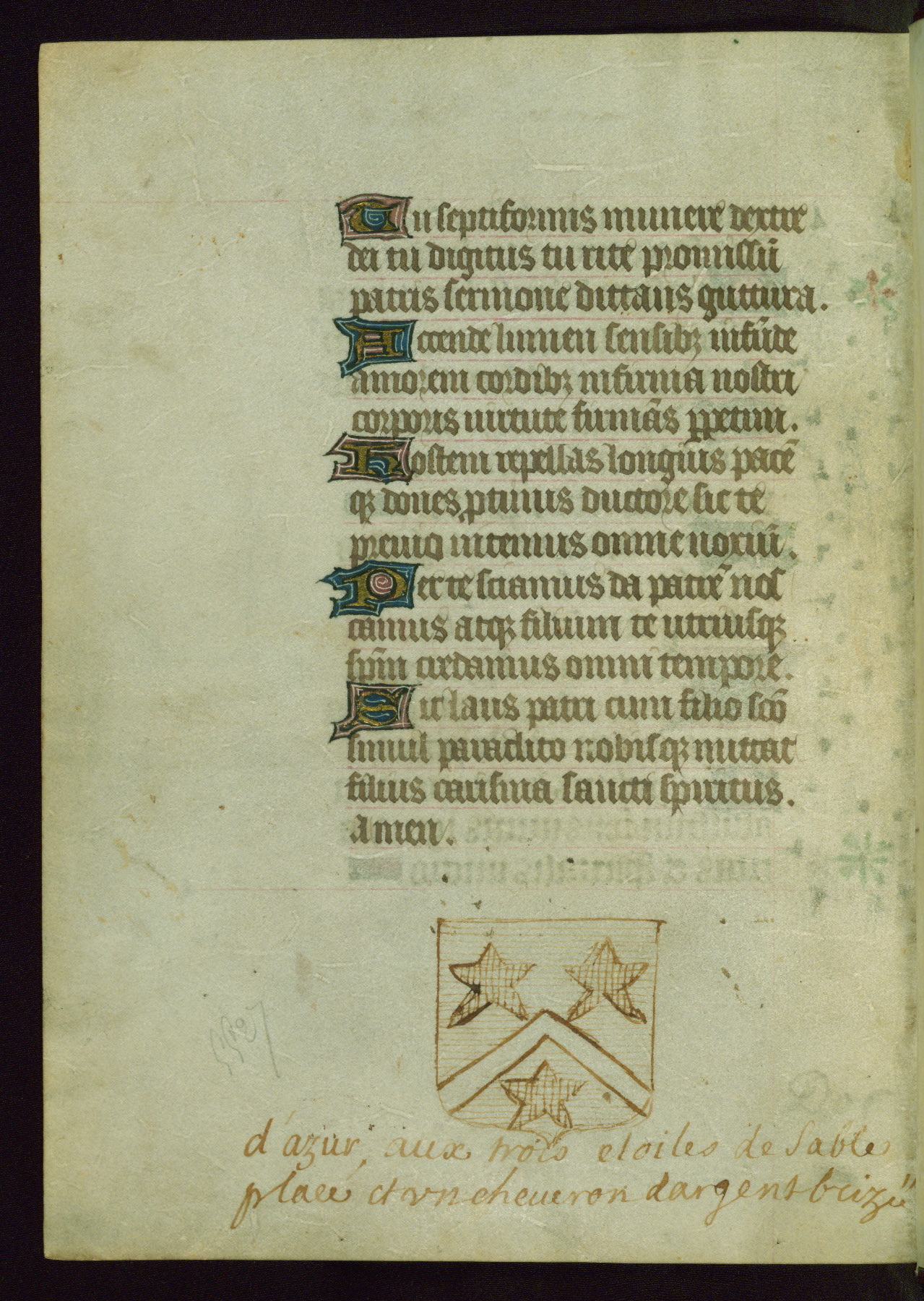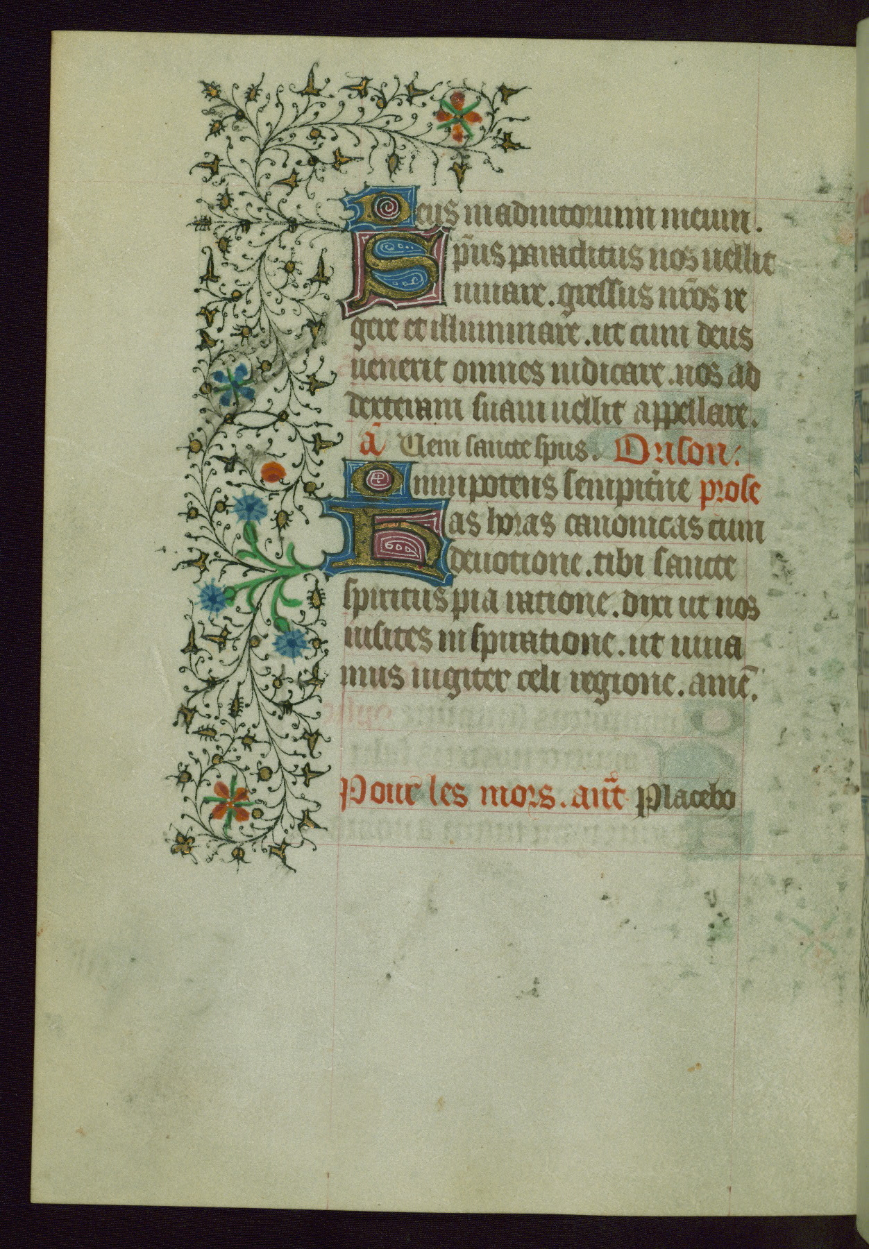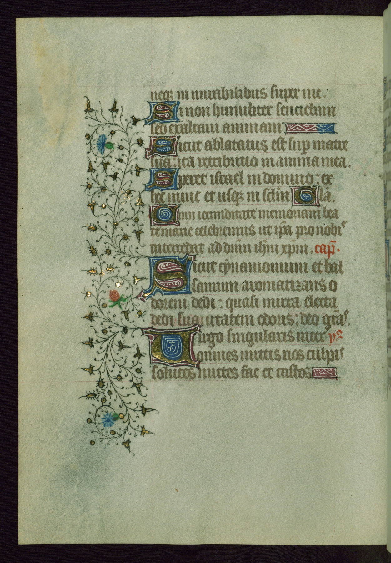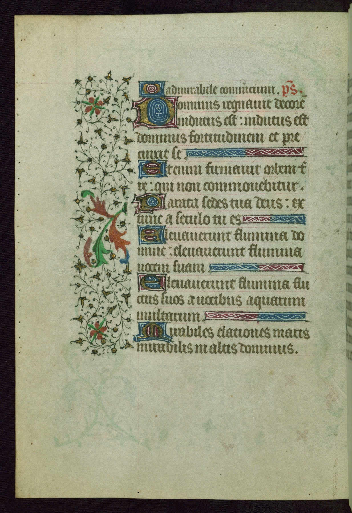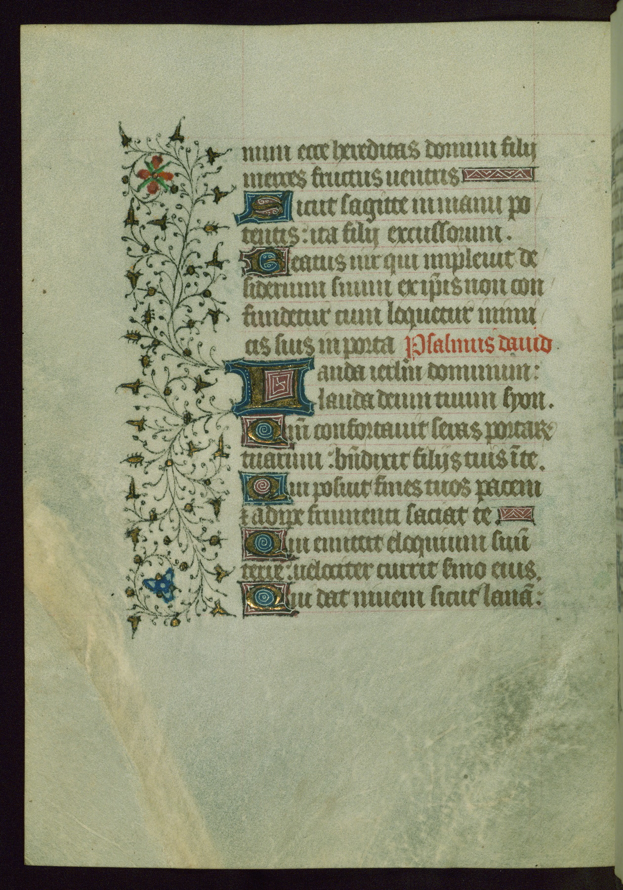 This Book of Hours was created ca. 1435-1440 in Amiens by artists from the circle of the Master of W.281 (Randall, cat. 112) for a female patron depicted on fol. 135r. The manuscript contains fourteen miniatures and is localized to Amiens by the contents of the calendar and litany, which include many saints particular to that region. Quire 12 (fols. 82-89) is misbound with quire 13 (fols. 90-97), with Suffrages and the Seven Verses of St. Bernard (fols. 82-89) intended to be after the Office of the Dead (fols. 90-128), as evinced by the location of the rubric for the Office of the Dead on fol. 81v.