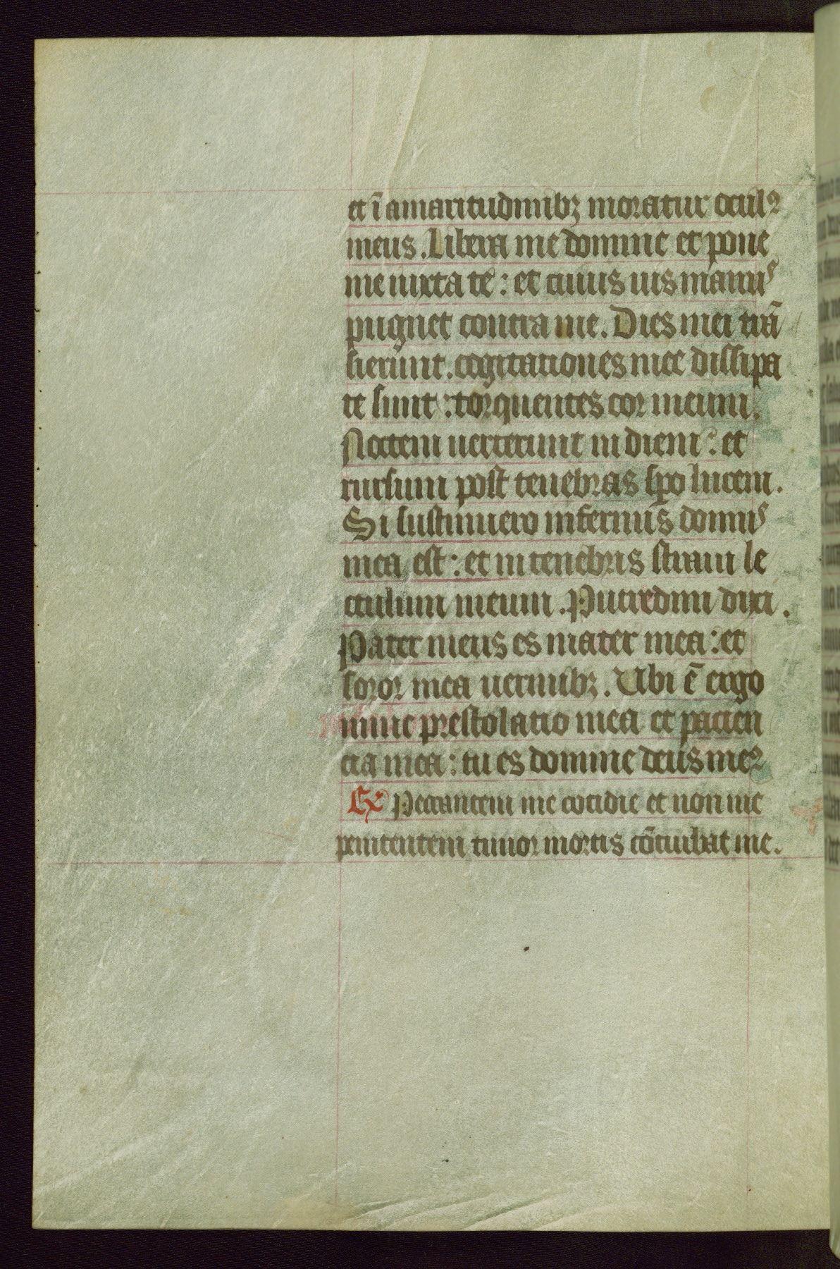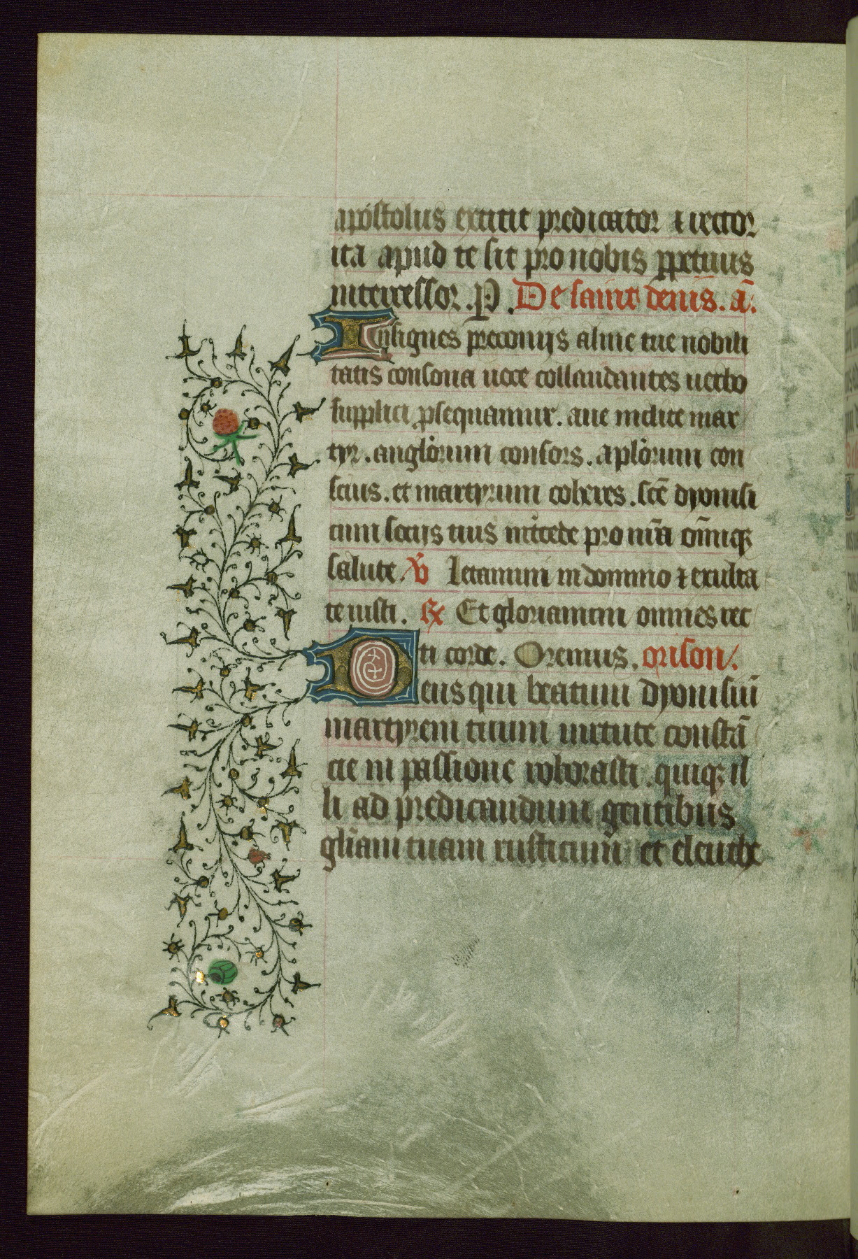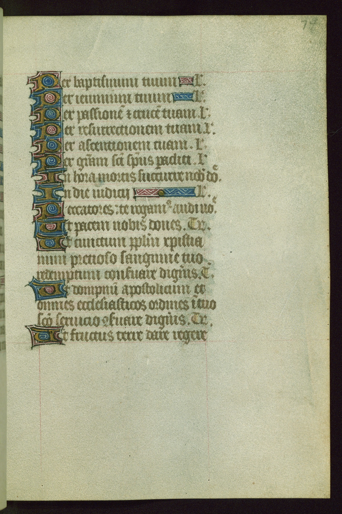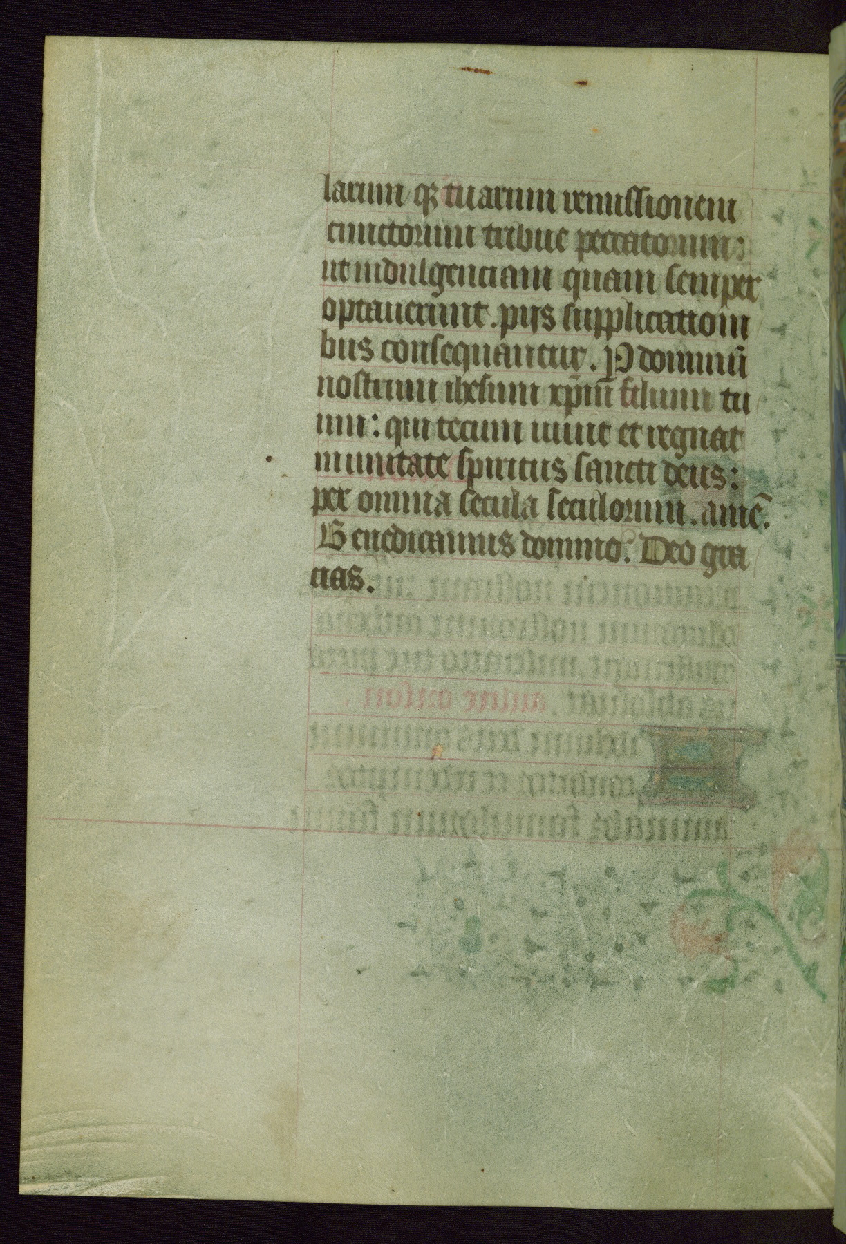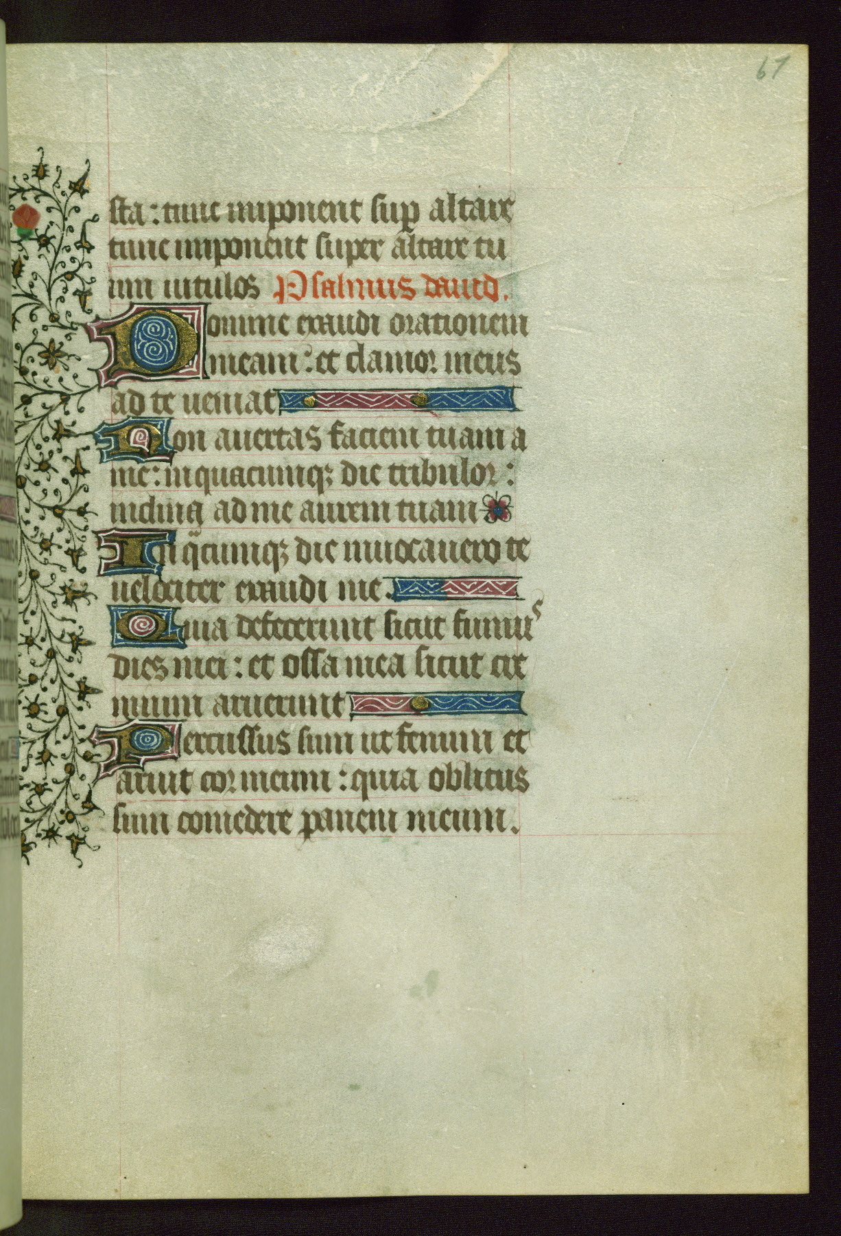 This Book of Hours was created ca. 1435-1440 in Amiens by artists from the circle of the Master of W.281 (Randall, cat. 112) for a female patron depicted on fol. 135r. The manuscript contains fourteen miniatures and is localized to Amiens by the contents of the calendar and litany, which include many saints particular to that region. Quire 12 (fols. 82-89) is misbound with quire 13 (fols. 90-97), with Suffrages and the Seven Verses of St. Bernard (fols. 82-89) intended to be after the Office of the Dead (fols. 90-128), as evinced by the location of the rubric for the Office of the Dead on fol. 81v.