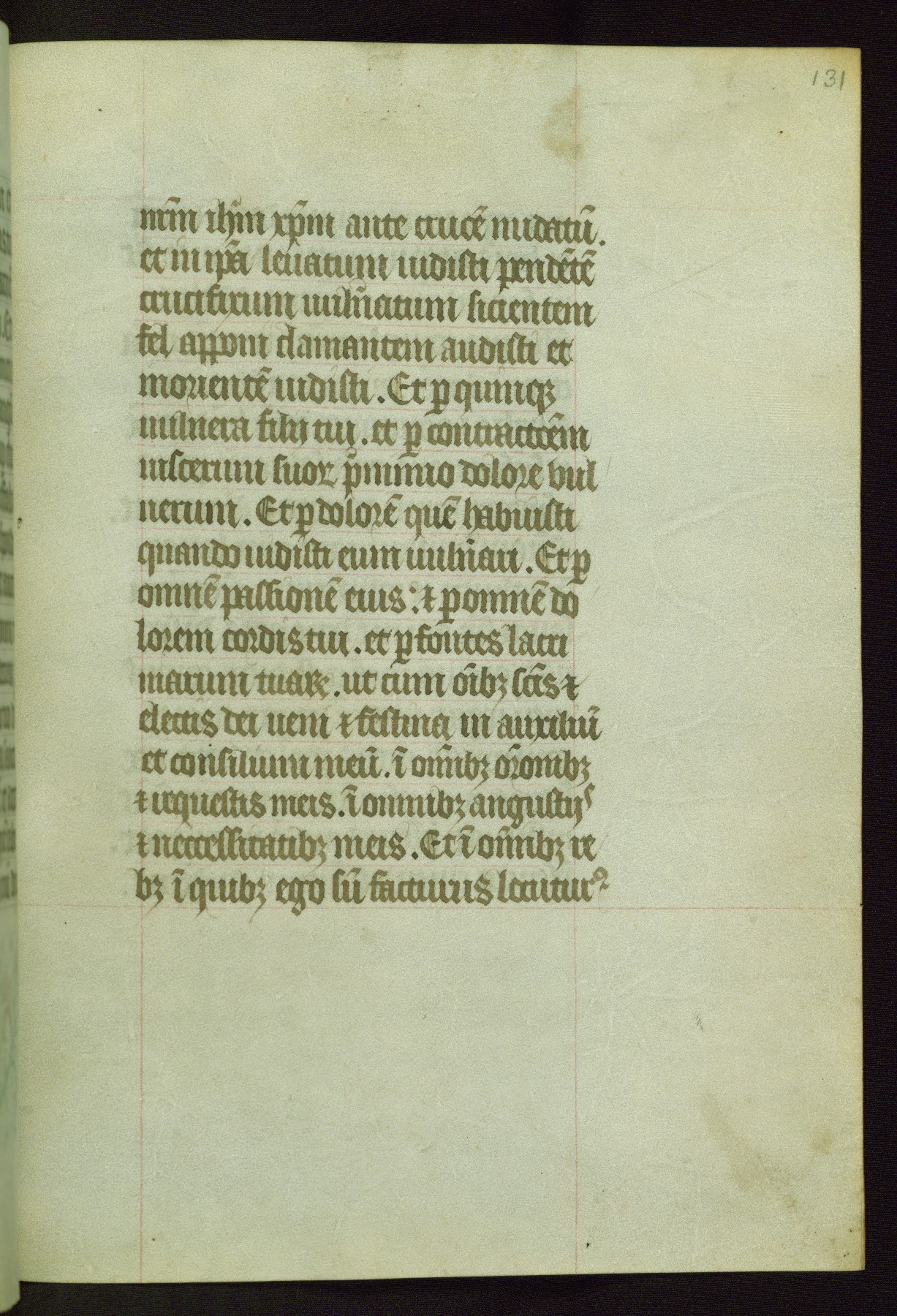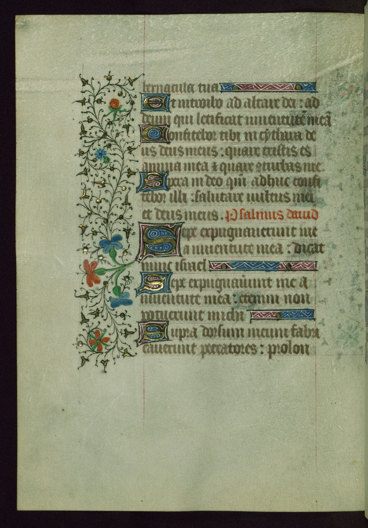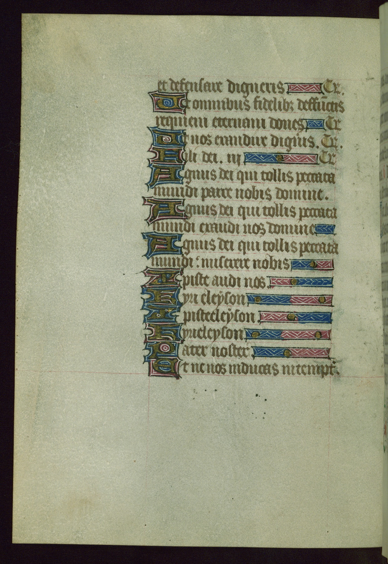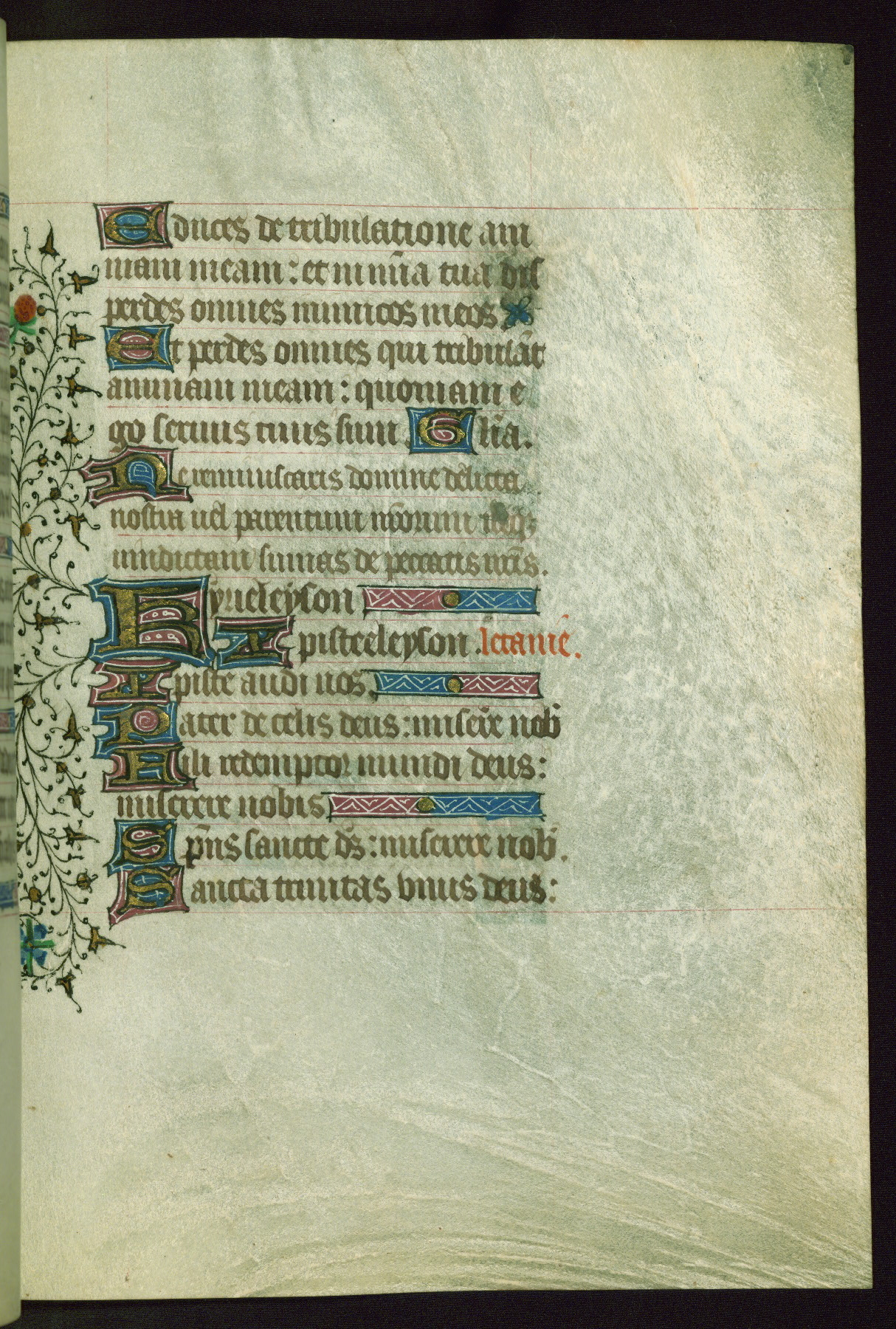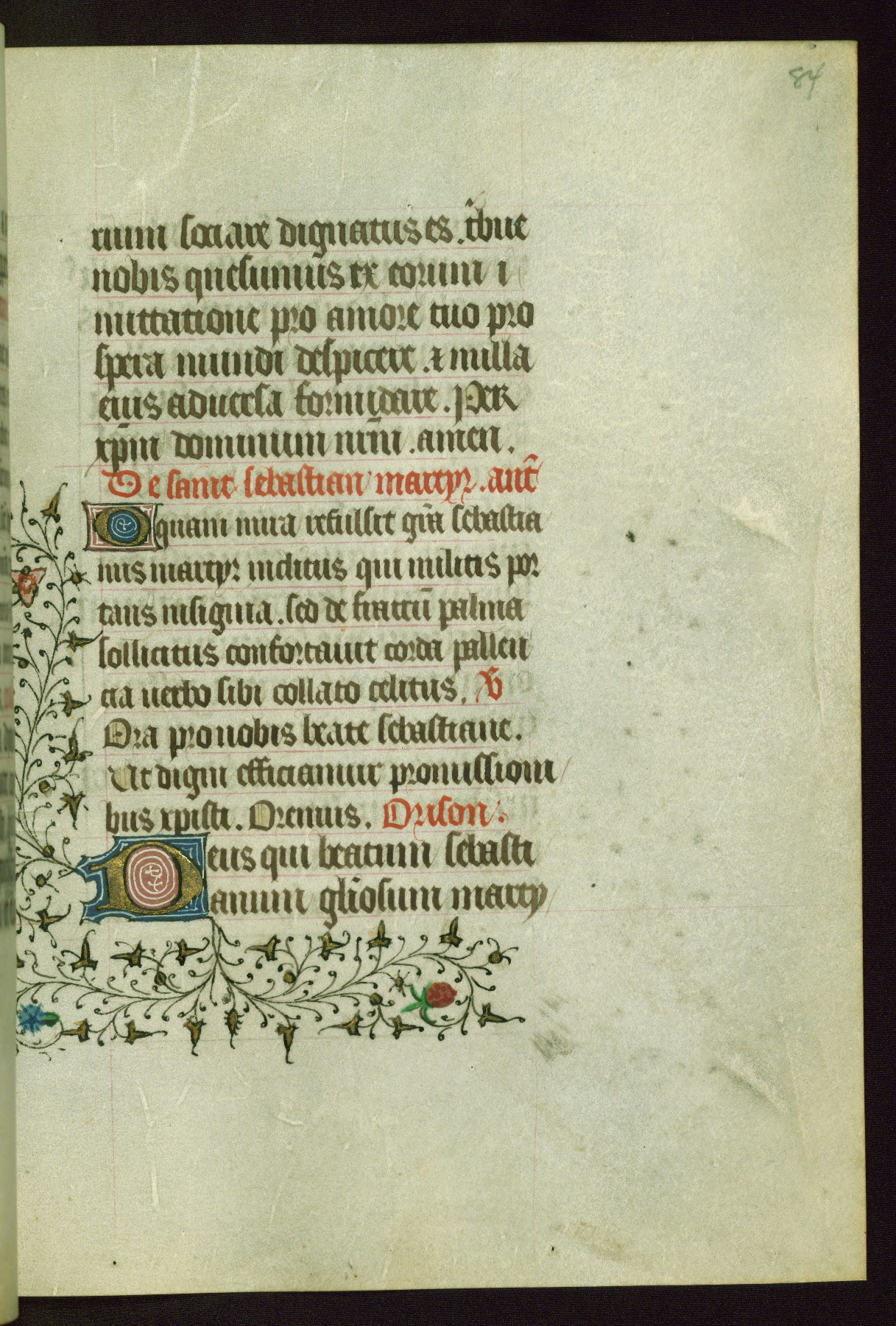 This Book of Hours was created ca. 1435-1440 in Amiens by artists from the circle of the Master of W.281 (Randall, cat. 112) for a female patron depicted on fol. 135r. The manuscript contains fourteen miniatures and is localized to Amiens by the contents of the calendar and litany, which include many saints particular to that region. Quire 12 (fols. 82-89) is misbound with quire 13 (fols. 90-97), with Suffrages and the Seven Verses of St. Bernard (fols. 82-89) intended to be after the Office of the Dead (fols. 90-128), as evinced by the location of the rubric for the Office of the Dead on fol. 81v.