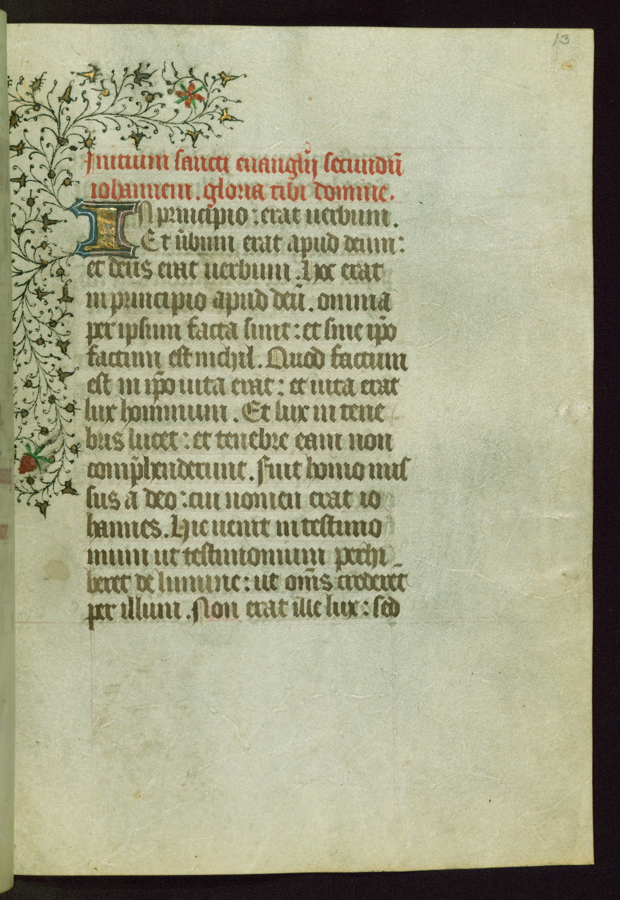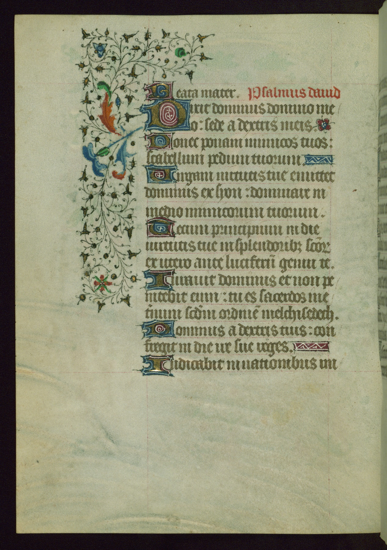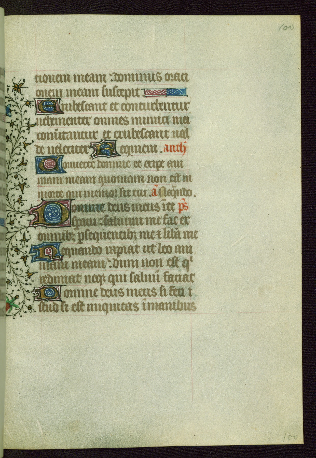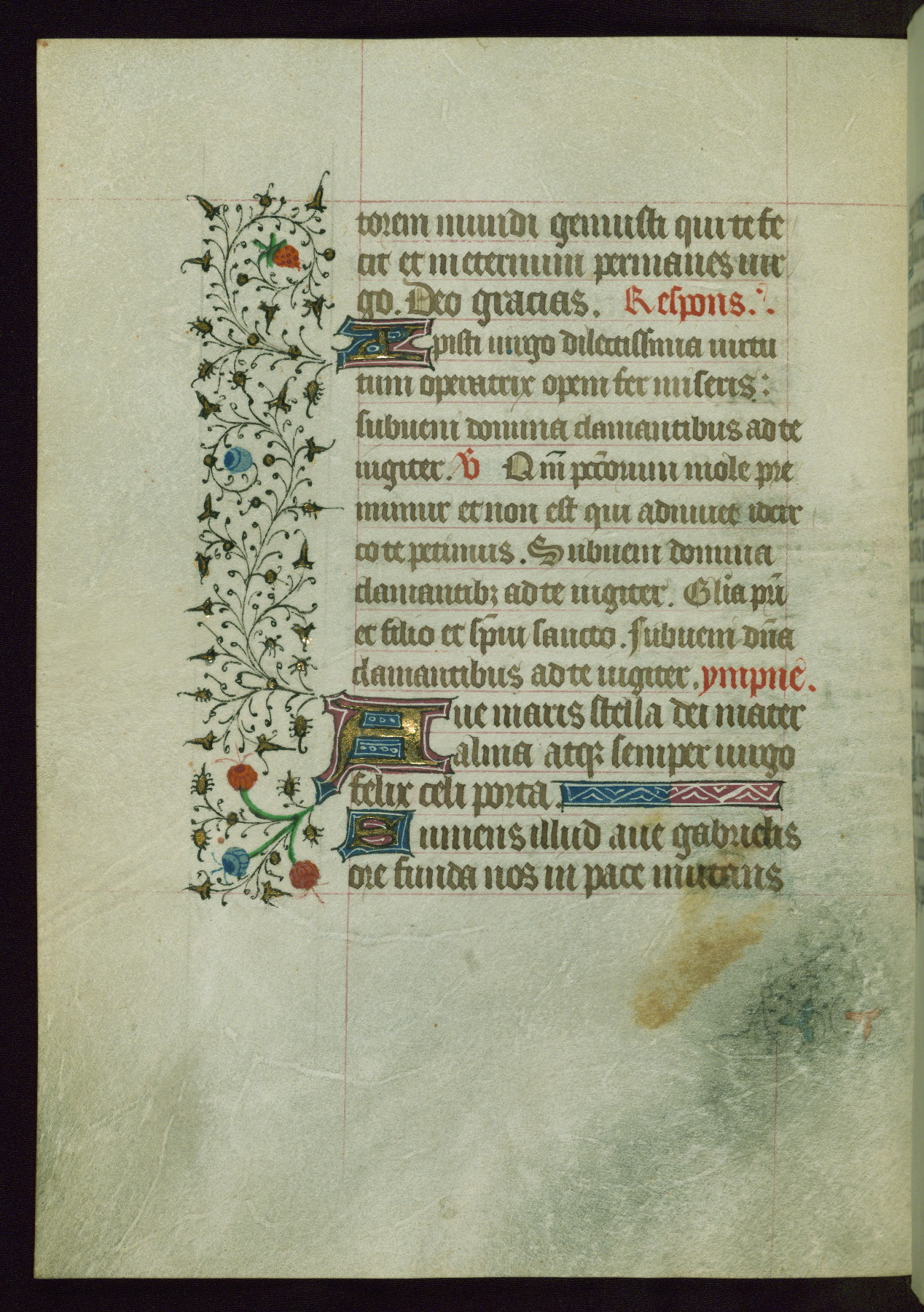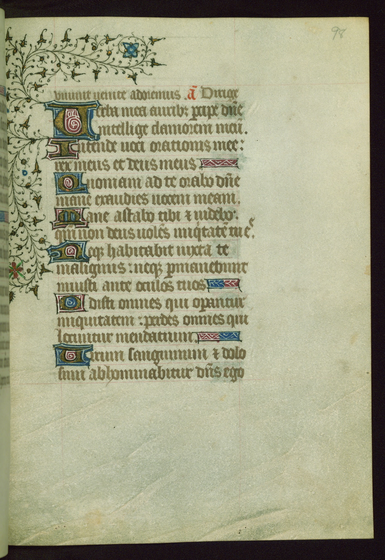 This Book of Hours was created ca. 1435-1440 in Amiens by artists from the circle of the Master of W.281 (Randall, cat. 112) for a female patron depicted on fol. 135r. The manuscript contains fourteen miniatures and is localized to Amiens by the contents of the calendar and litany, which include many saints particular to that region. Quire 12 (fols. 82-89) is misbound with quire 13 (fols. 90-97), with Suffrages and the Seven Verses of St. Bernard (fols. 82-89) intended to be after the Office of the Dead (fols. 90-128), as evinced by the location of the rubric for the Office of the Dead on fol. 81v.