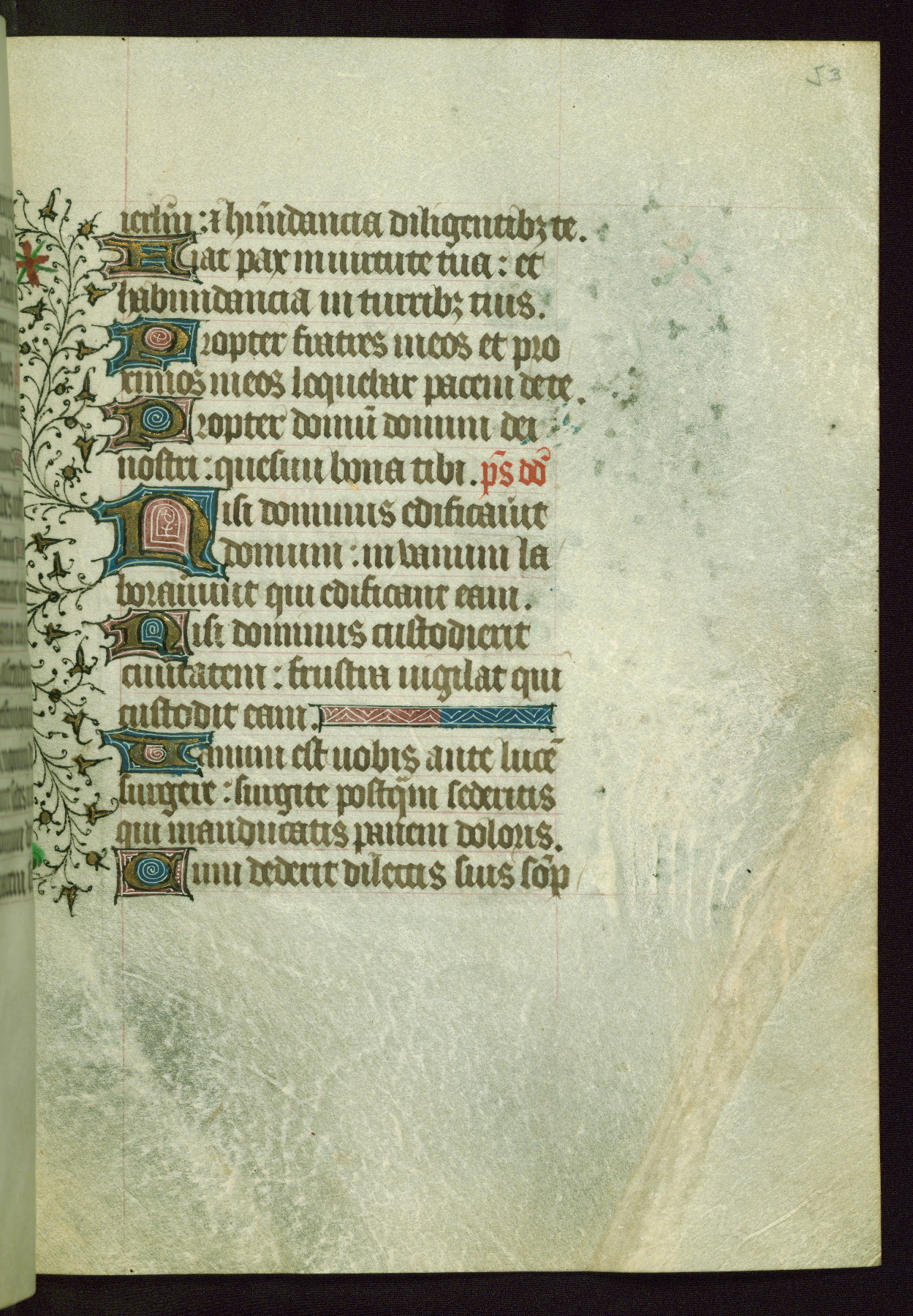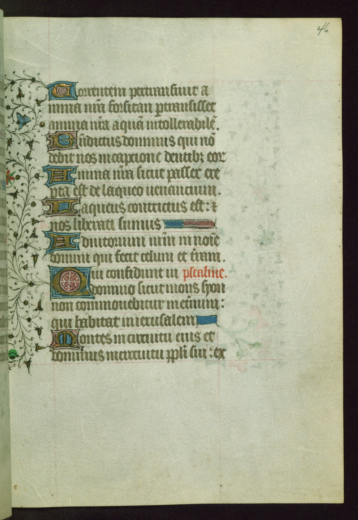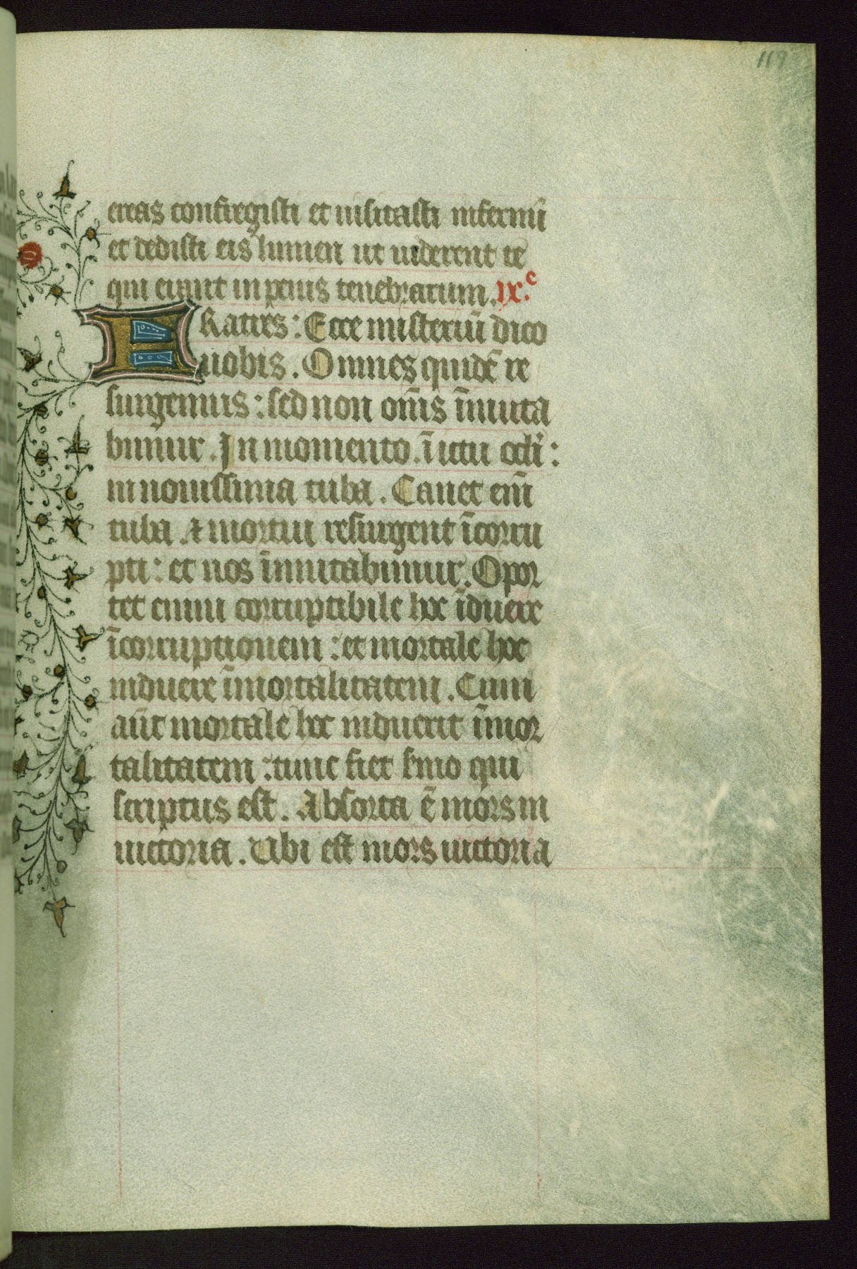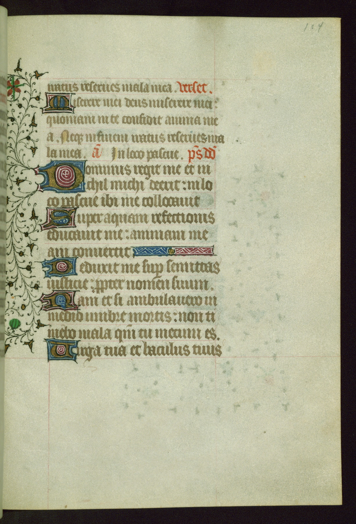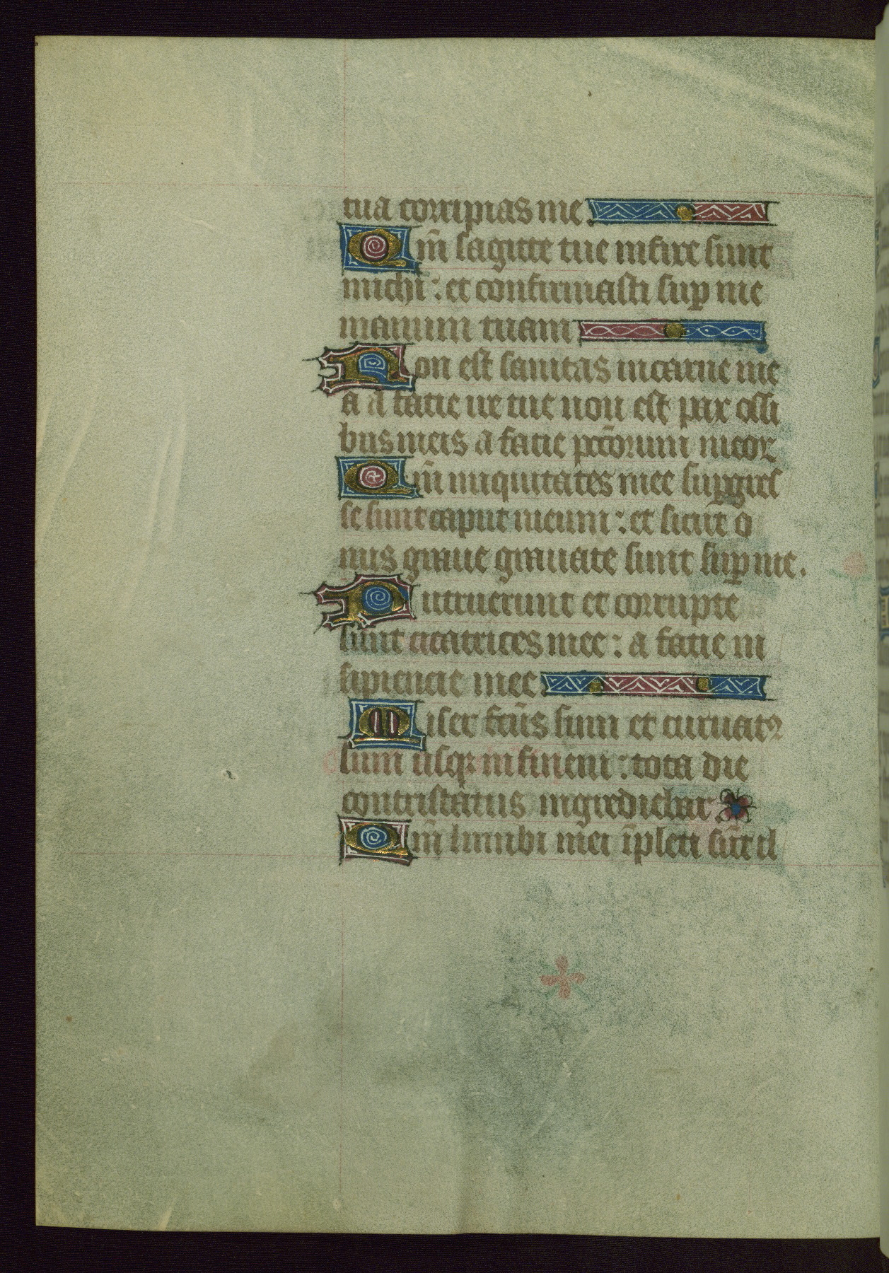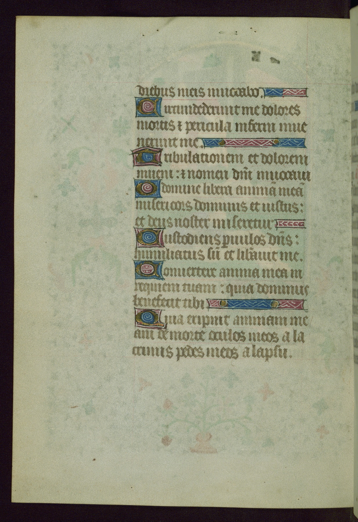 This Book of Hours was created ca. 1435-1440 in Amiens by artists from the circle of the Master of W.281 (Randall, cat. 112) for a female patron depicted on fol. 135r. The manuscript contains fourteen miniatures and is localized to Amiens by the contents of the calendar and litany, which include many saints particular to that region. Quire 12 (fols. 82-89) is misbound with quire 13 (fols. 90-97), with Suffrages and the Seven Verses of St. Bernard (fols. 82-89) intended to be after the Office of the Dead (fols. 90-128), as evinced by the location of the rubric for the Office of the Dead on fol. 81v.