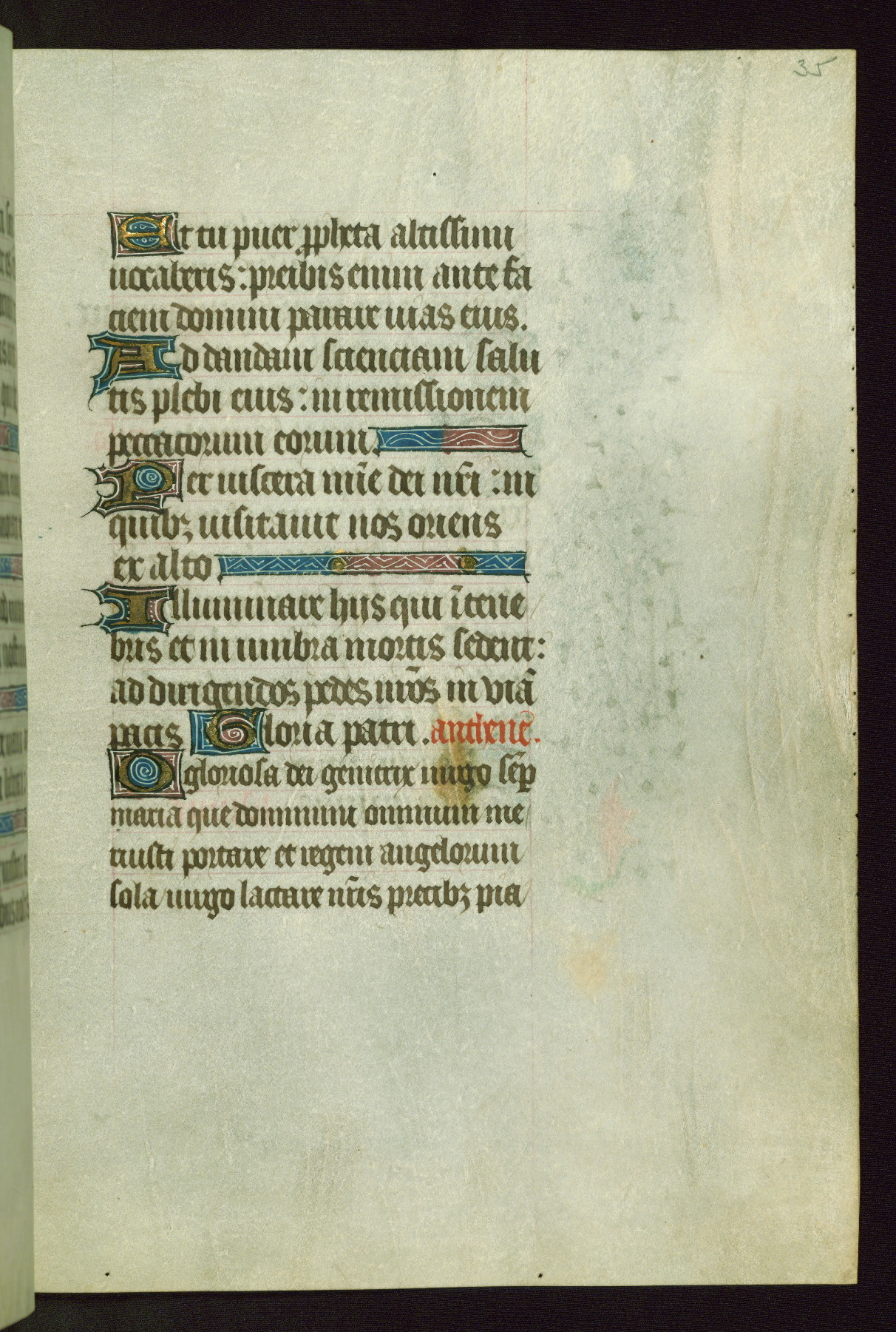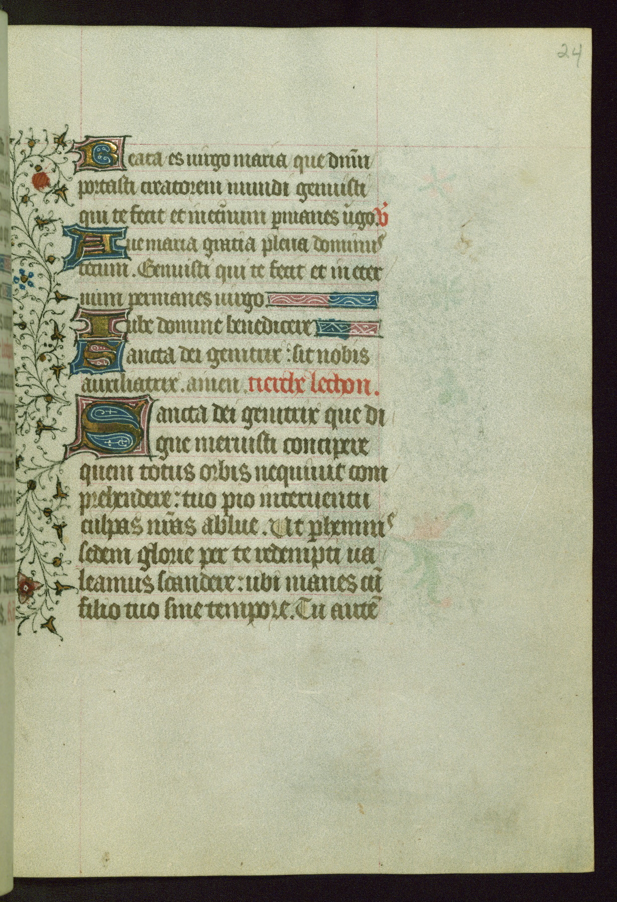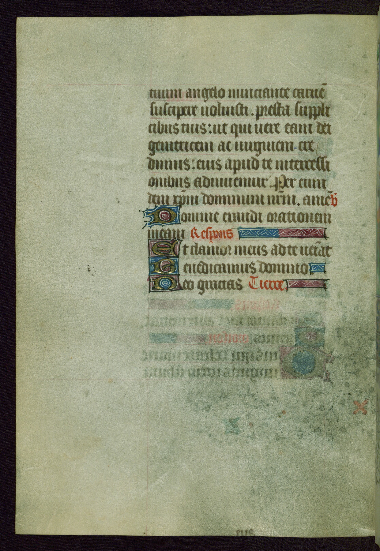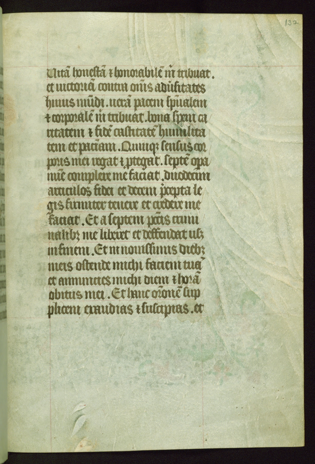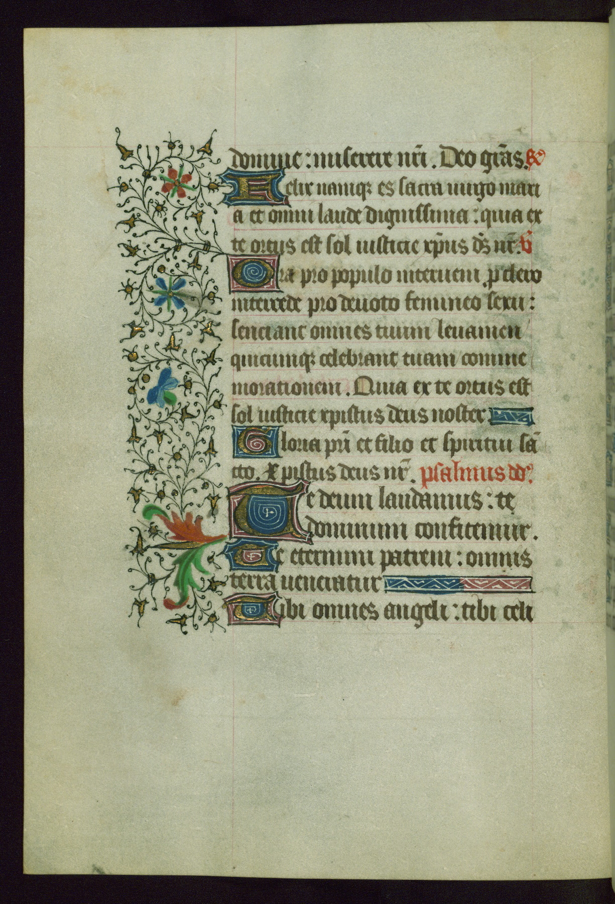 This Book of Hours was created ca. 1435-1440 in Amiens by artists from the circle of the Master of W.281 (Randall, cat. 112) for a female patron depicted on fol. 135r. The manuscript contains fourteen miniatures and is localized to Amiens by the contents of the calendar and litany, which include many saints particular to that region. Quire 12 (fols. 82-89) is misbound with quire 13 (fols. 90-97), with Suffrages and the Seven Verses of St. Bernard (fols. 82-89) intended to be after the Office of the Dead (fols. 90-128), as evinced by the location of the rubric for the Office of the Dead on fol. 81v.
