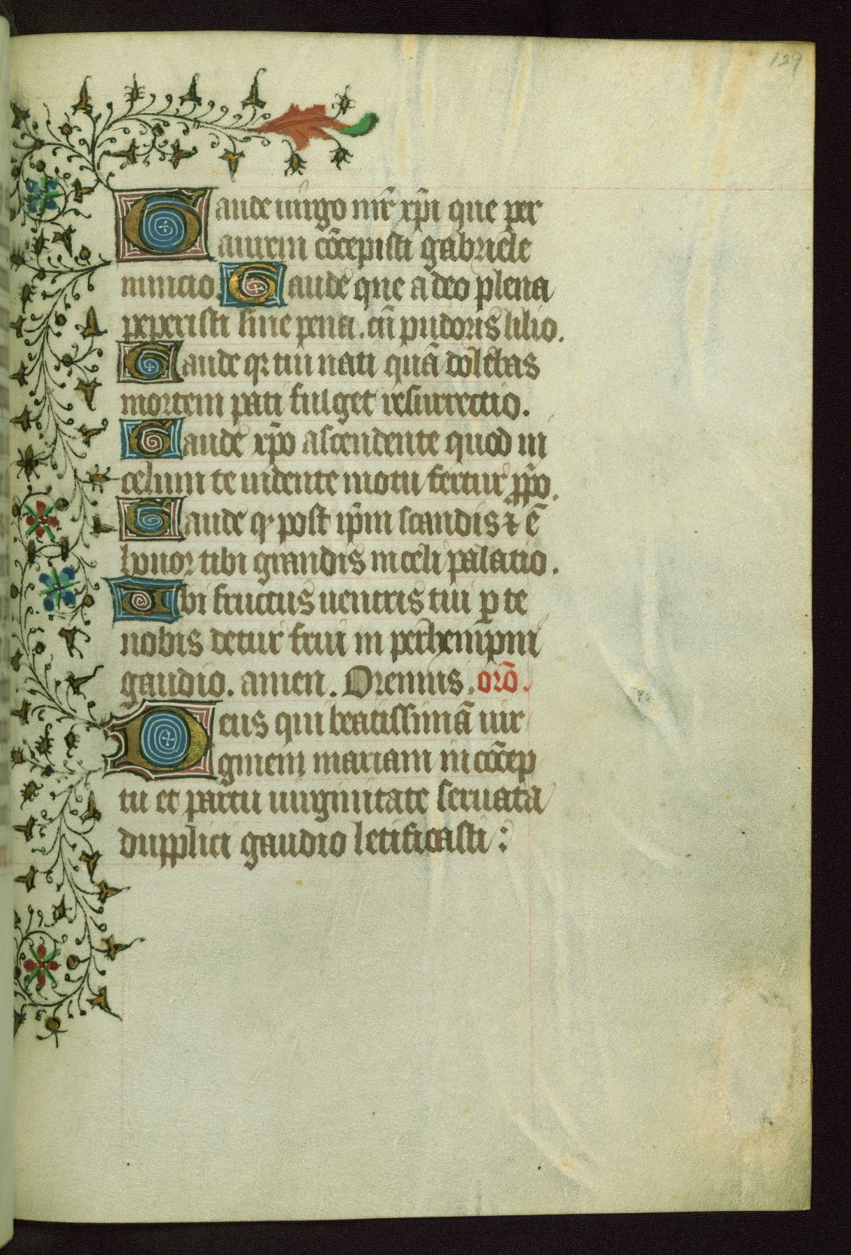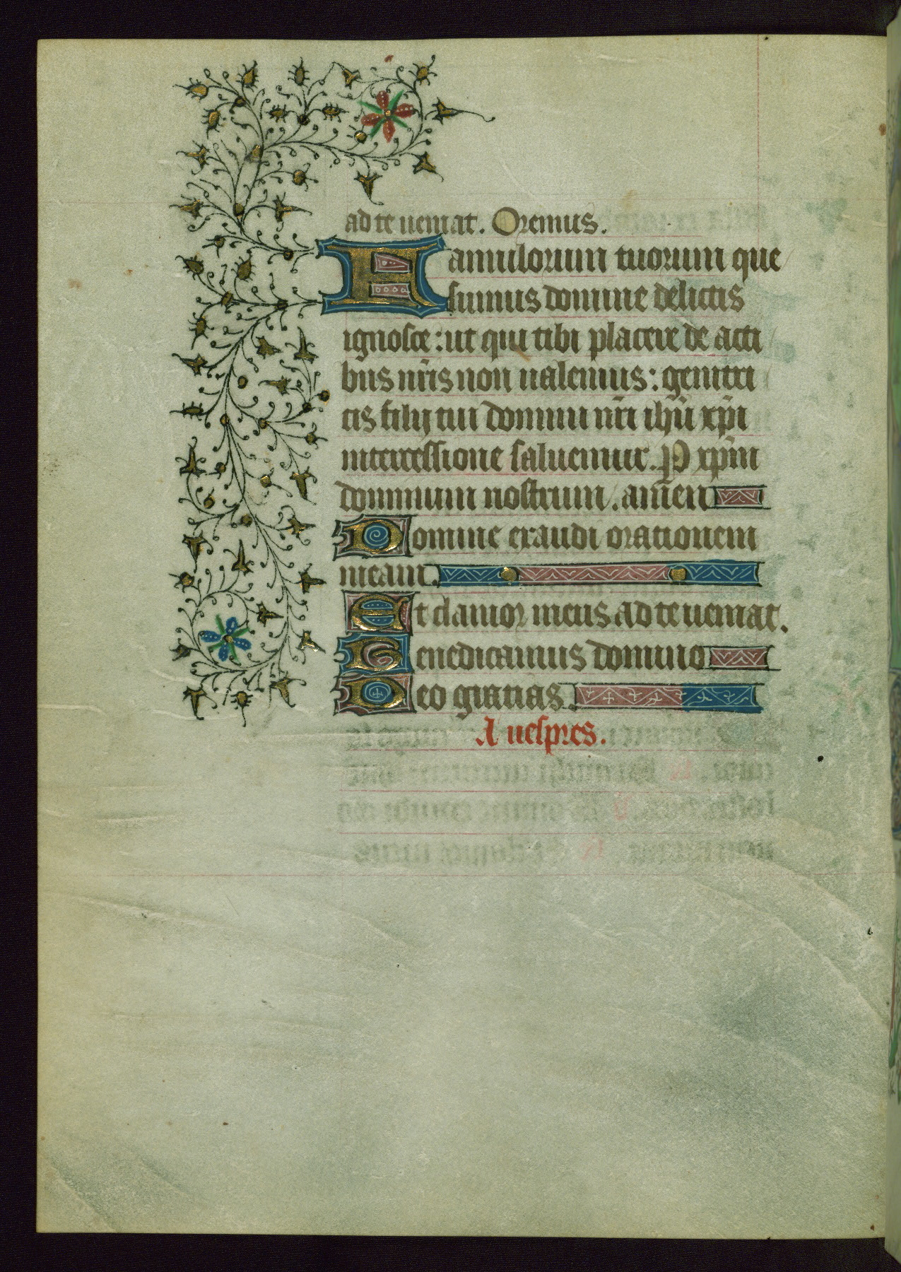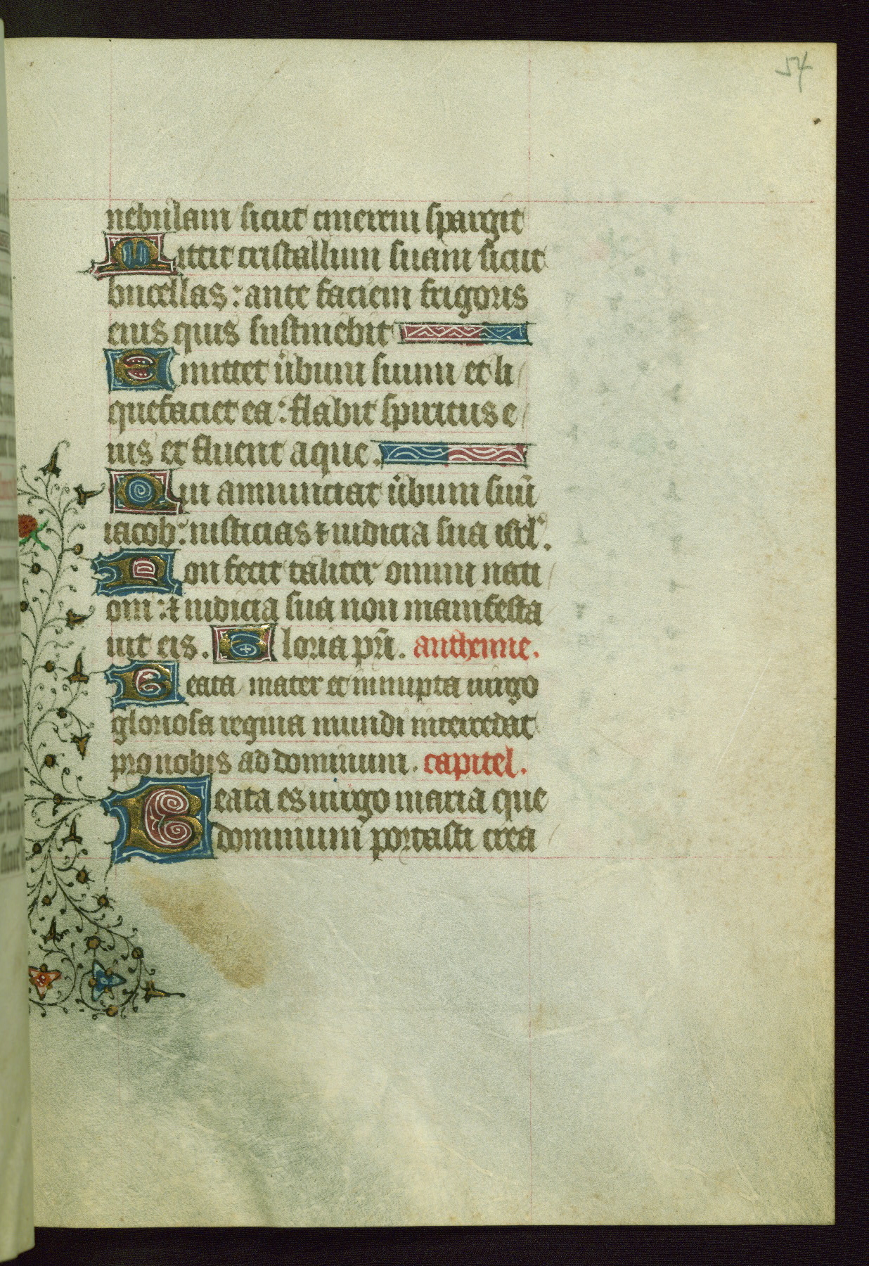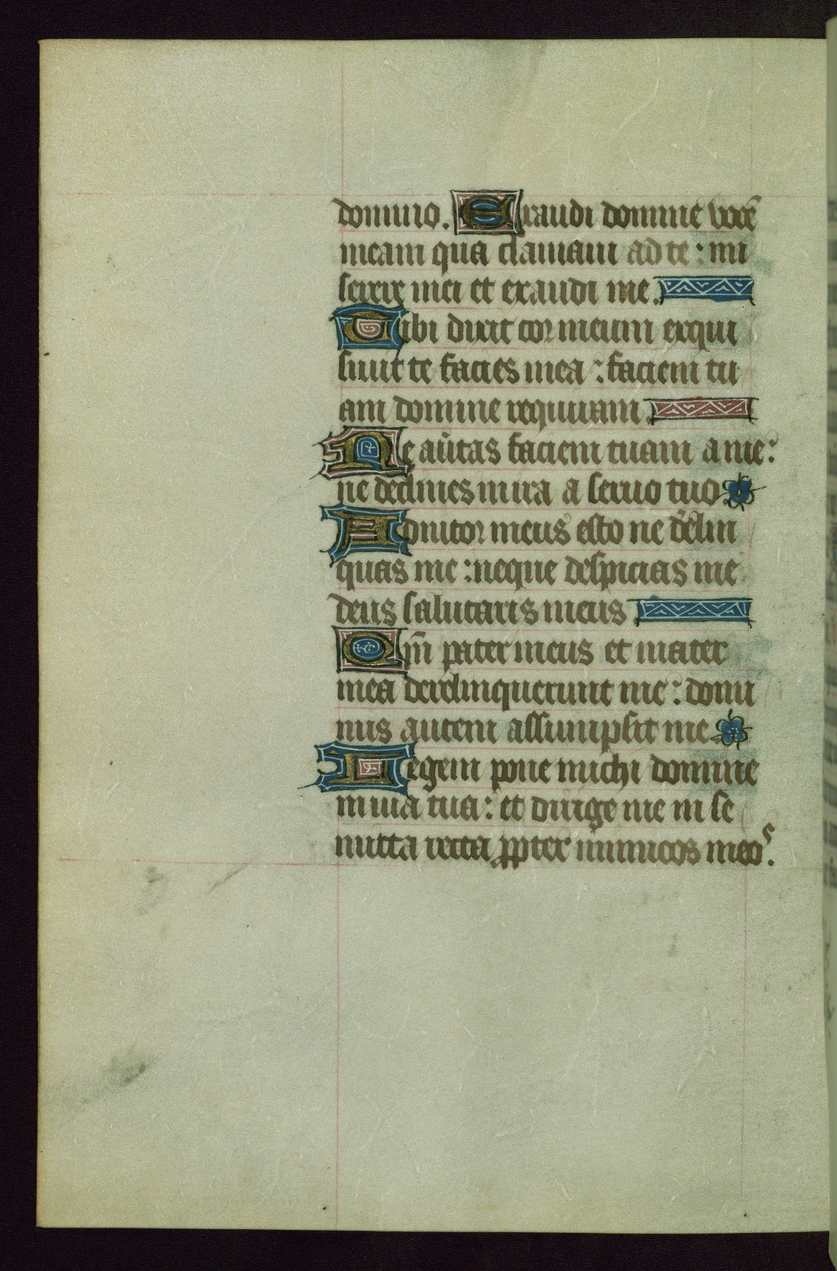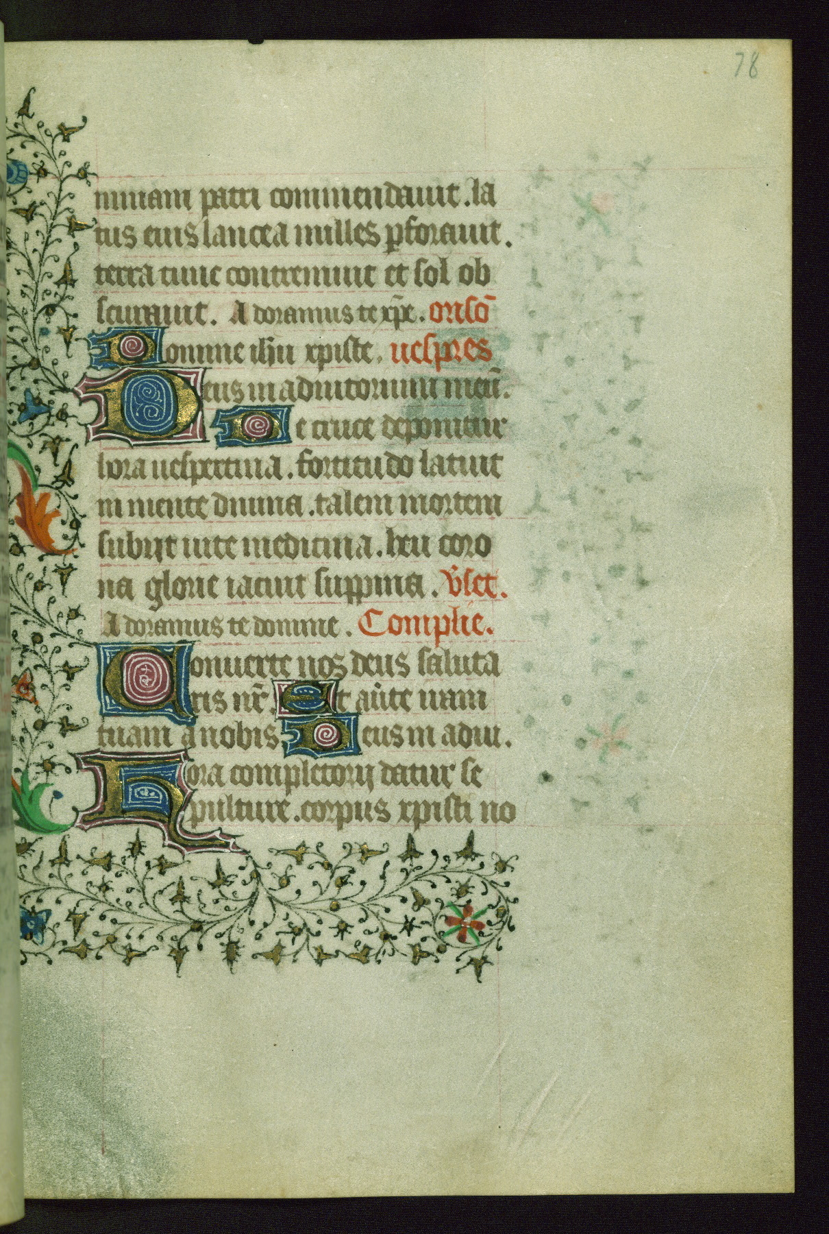 This Book of Hours was created ca. 1435-1440 in Amiens by artists from the circle of the Master of W.281 (Randall, cat. 112) for a female patron depicted on fol. 135r. The manuscript contains fourteen miniatures and is localized to Amiens by the contents of the calendar and litany, which include many saints particular to that region. Quire 12 (fols. 82-89) is misbound with quire 13 (fols. 90-97), with Suffrages and the Seven Verses of St. Bernard (fols. 82-89) intended to be after the Office of the Dead (fols. 90-128), as evinced by the location of the rubric for the Office of the Dead on fol. 81v.