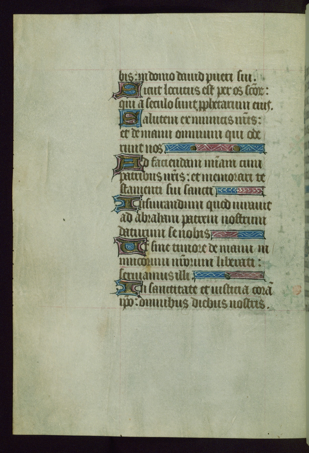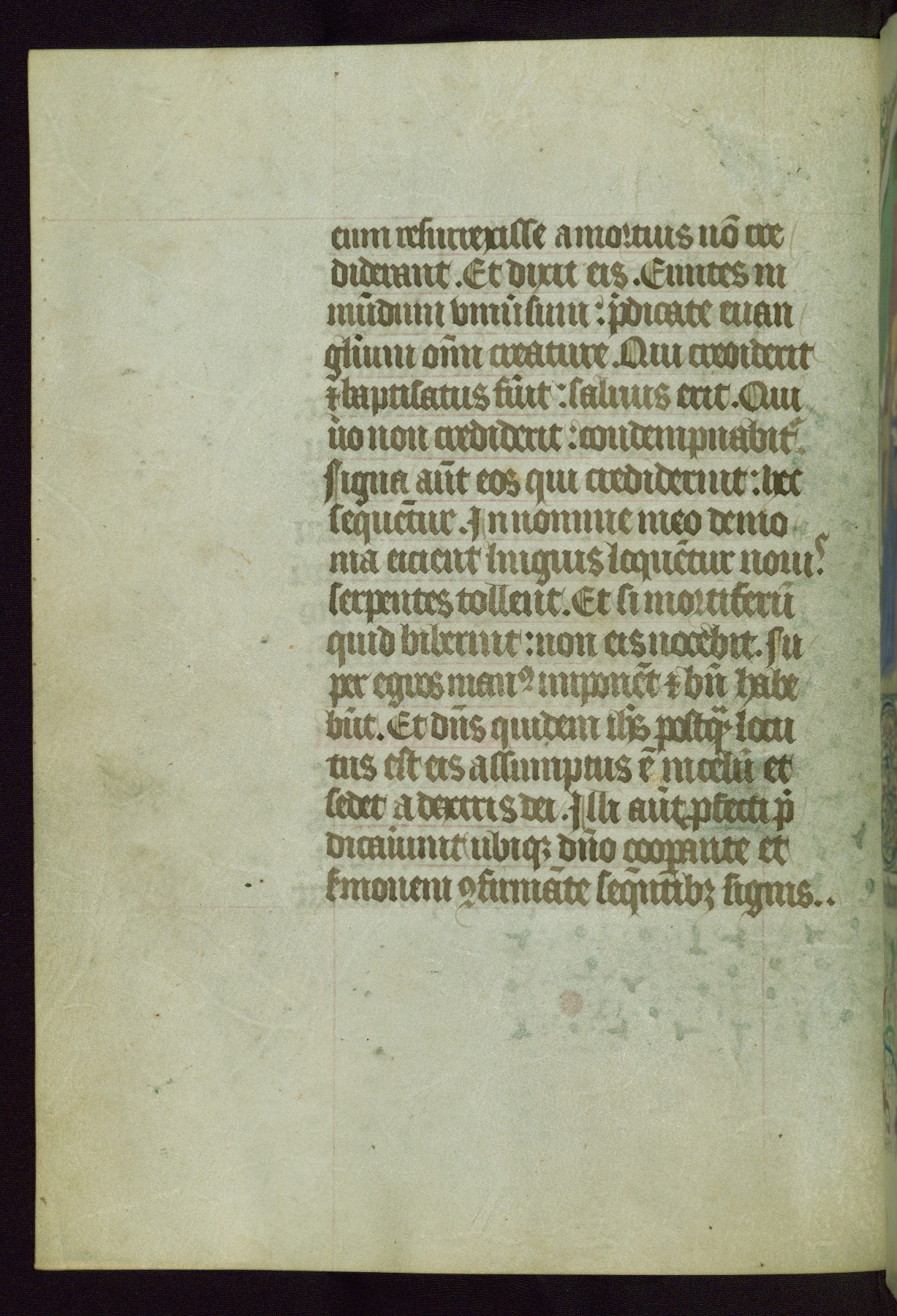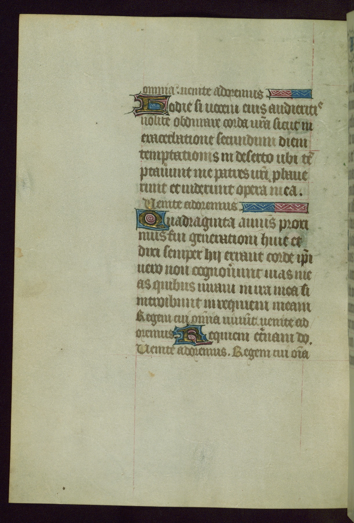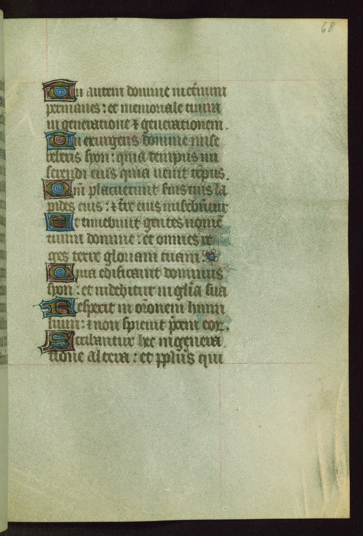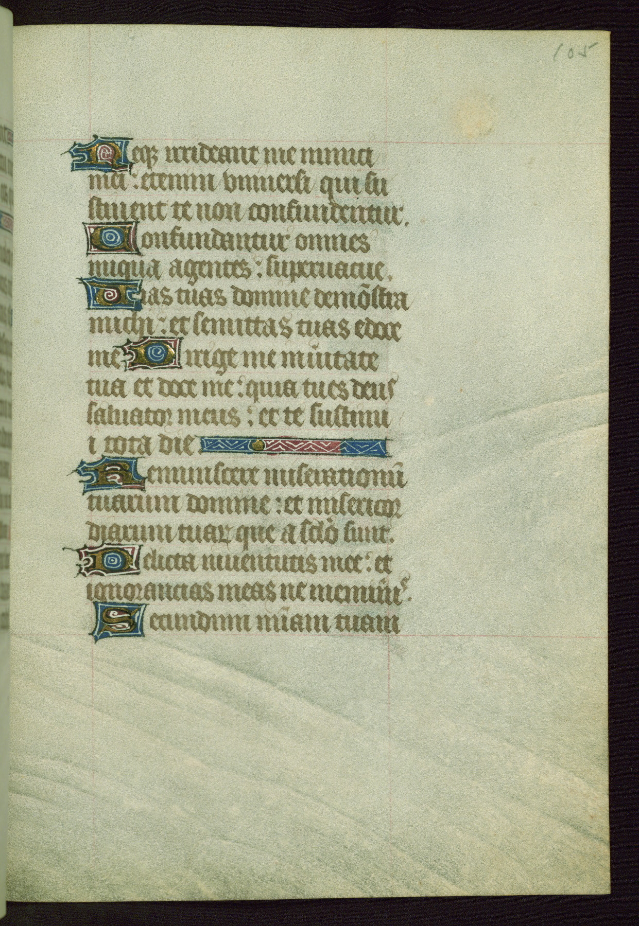 This Book of Hours was created ca. 1435-1440 in Amiens by artists from the circle of the Master of W.281 (Randall, cat. 112) for a female patron depicted on fol. 135r. The manuscript contains fourteen miniatures and is localized to Amiens by the contents of the calendar and litany, which include many saints particular to that region. Quire 12 (fols. 82-89) is misbound with quire 13 (fols. 90-97), with Suffrages and the Seven Verses of St. Bernard (fols. 82-89) intended to be after the Office of the Dead (fols. 90-128), as evinced by the location of the rubric for the Office of the Dead on fol. 81v.