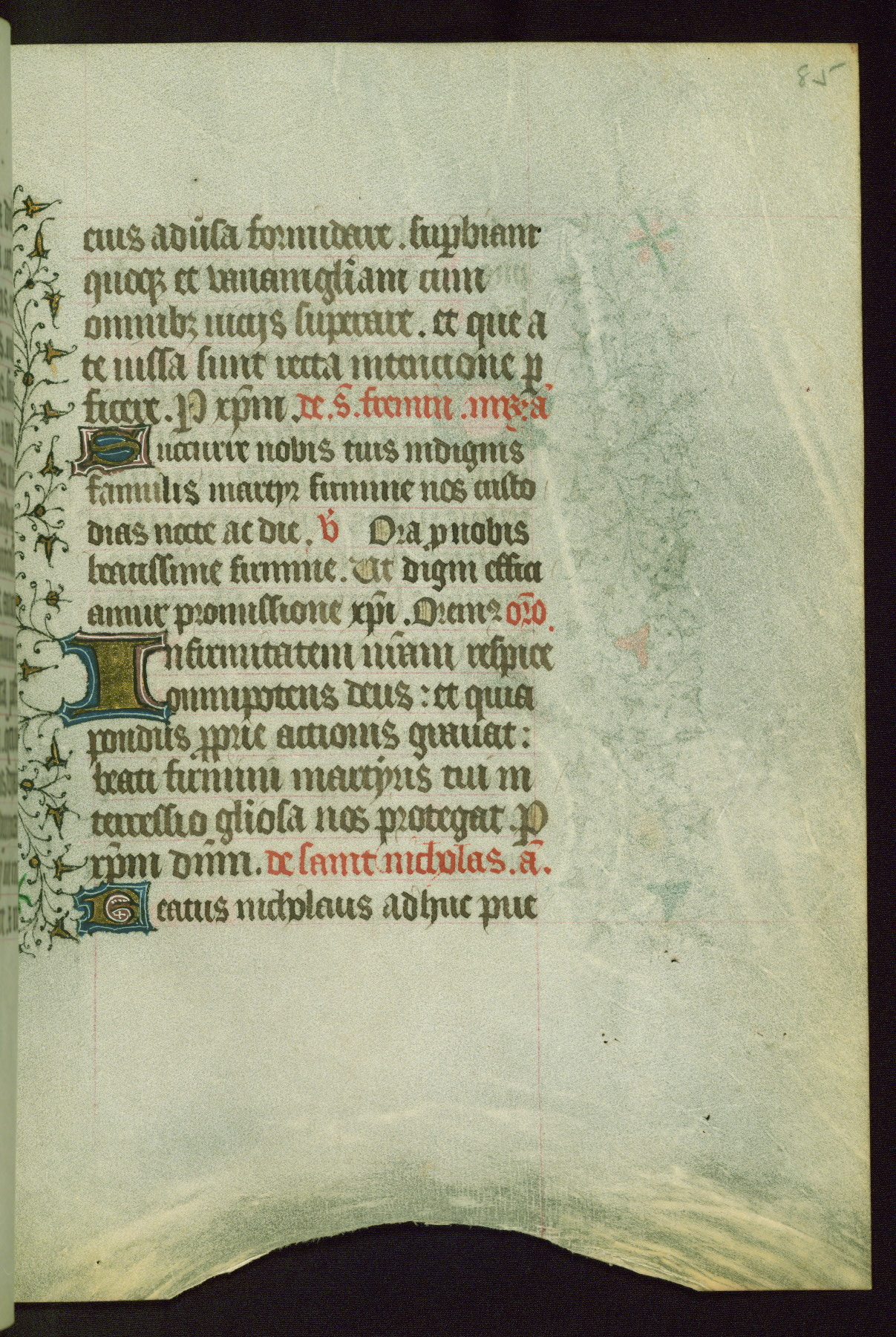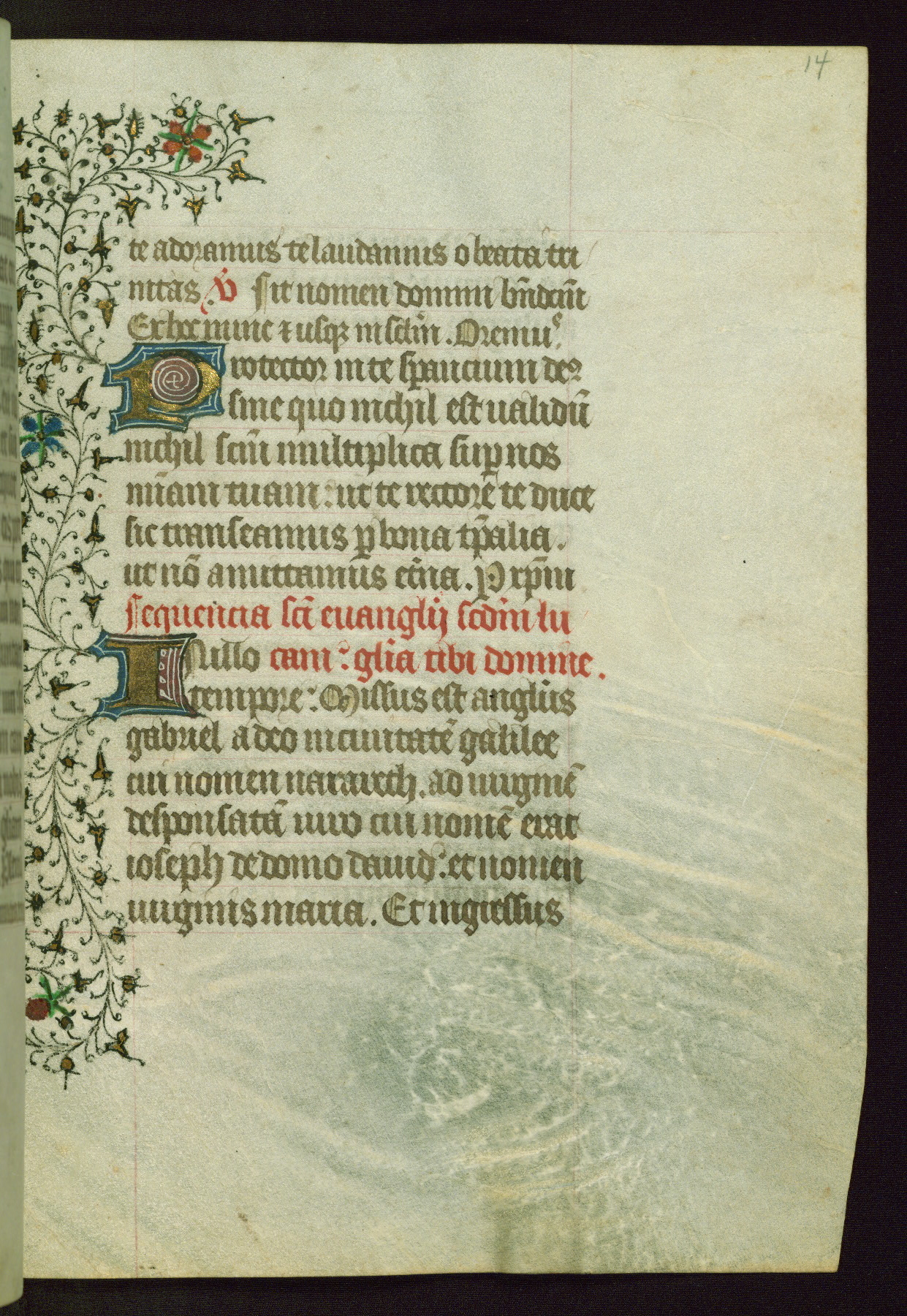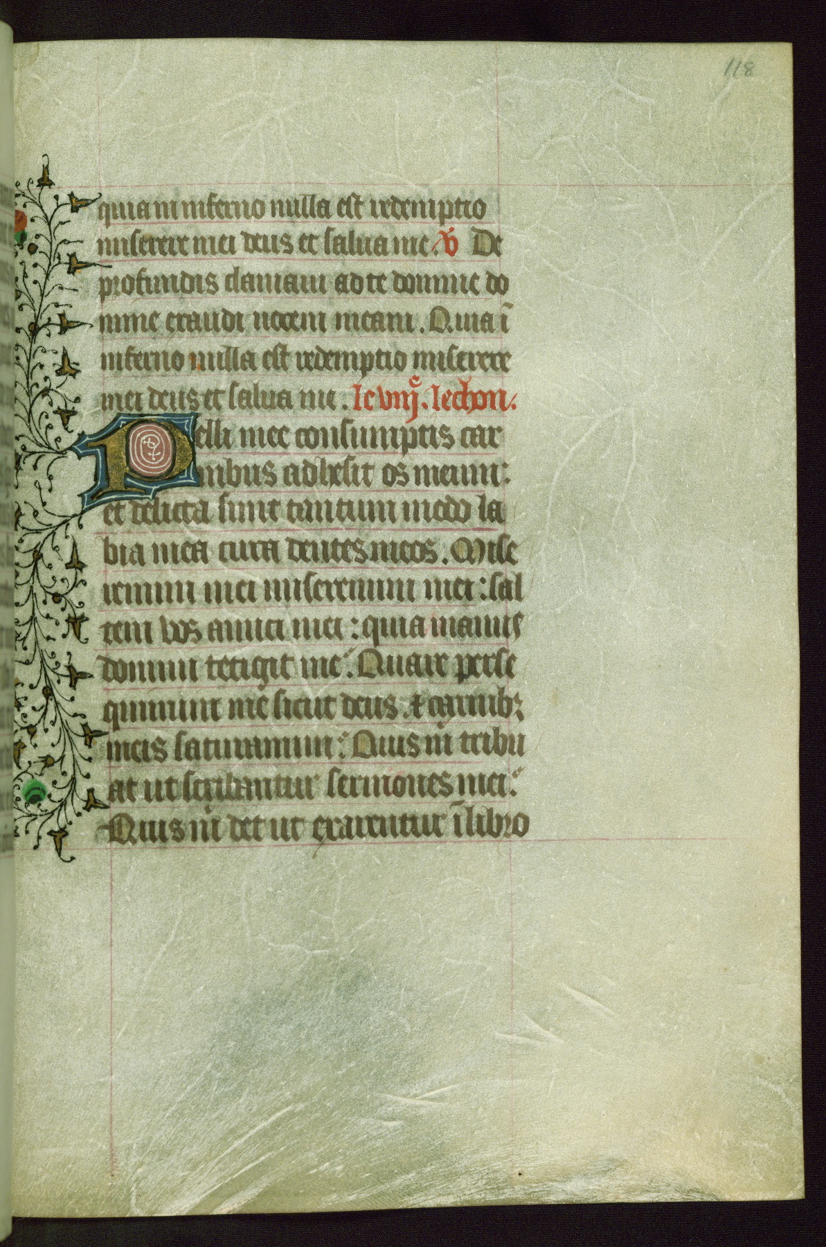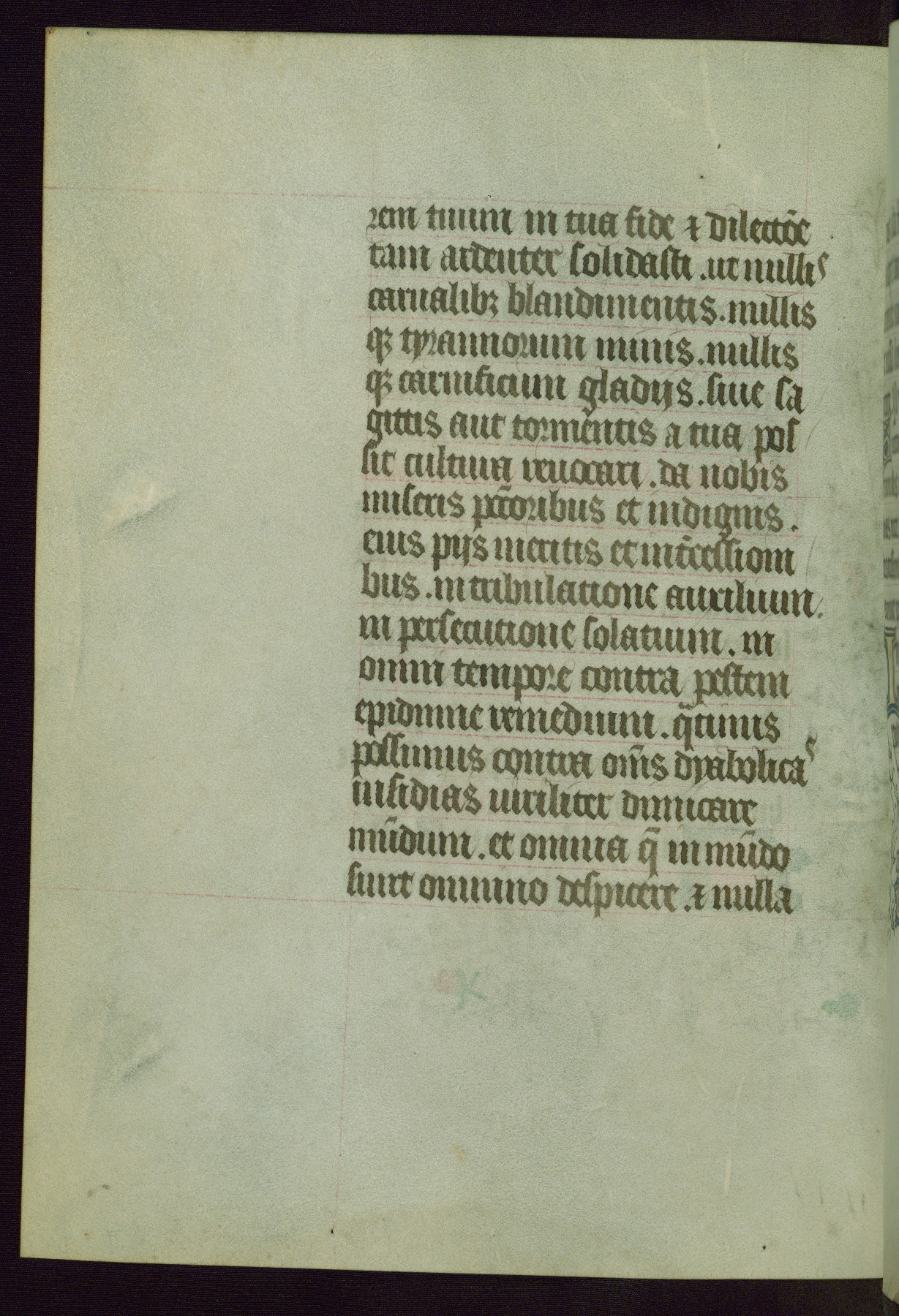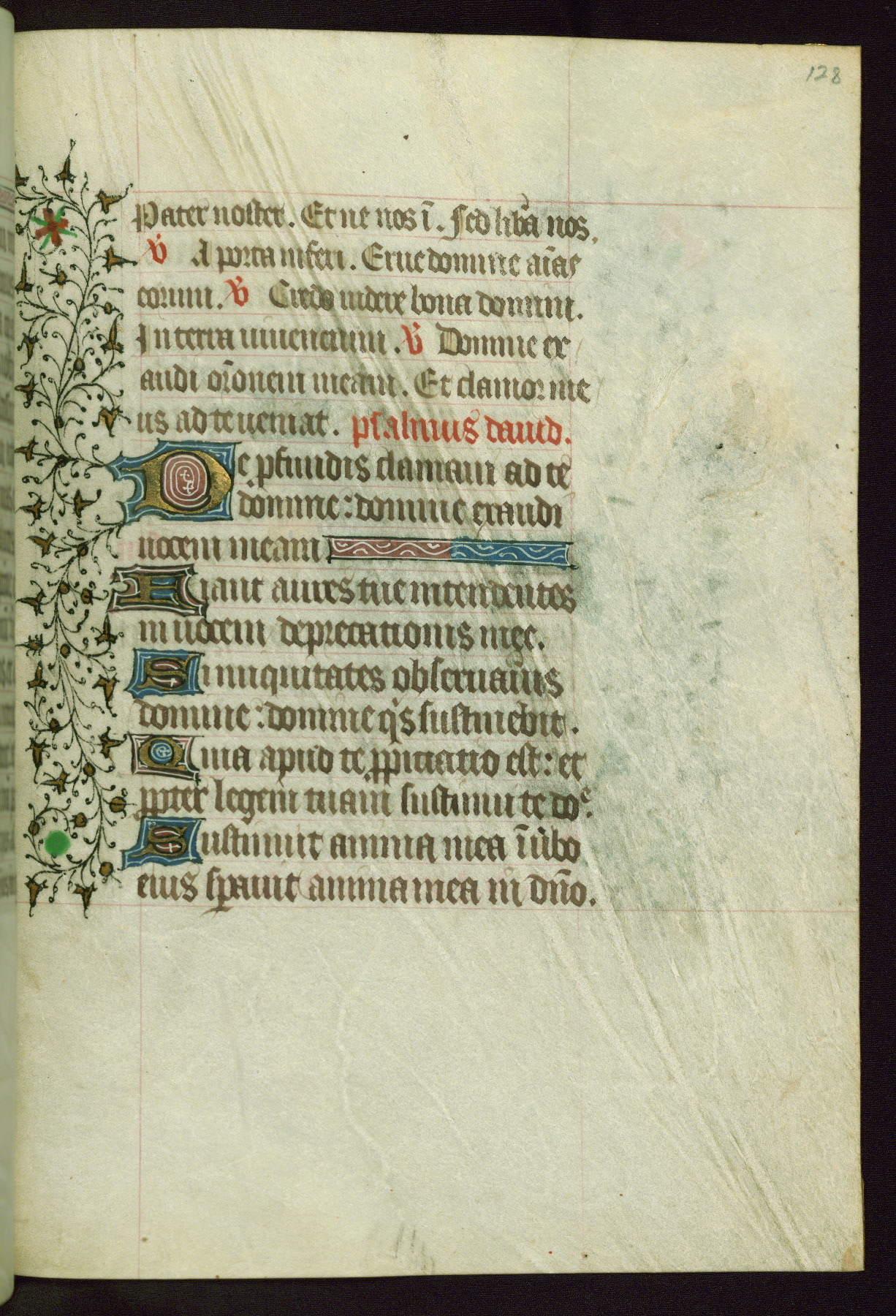 This Book of Hours was created ca. 1435-1440 in Amiens by artists from the circle of the Master of W.281 (Randall, cat. 112) for a female patron depicted on fol. 135r. The manuscript contains fourteen miniatures and is localized to Amiens by the contents of the calendar and litany, which include many saints particular to that region. Quire 12 (fols. 82-89) is misbound with quire 13 (fols. 90-97), with Suffrages and the Seven Verses of St. Bernard (fols. 82-89) intended to be after the Office of the Dead (fols. 90-128), as evinced by the location of the rubric for the Office of the Dead on fol. 81v.