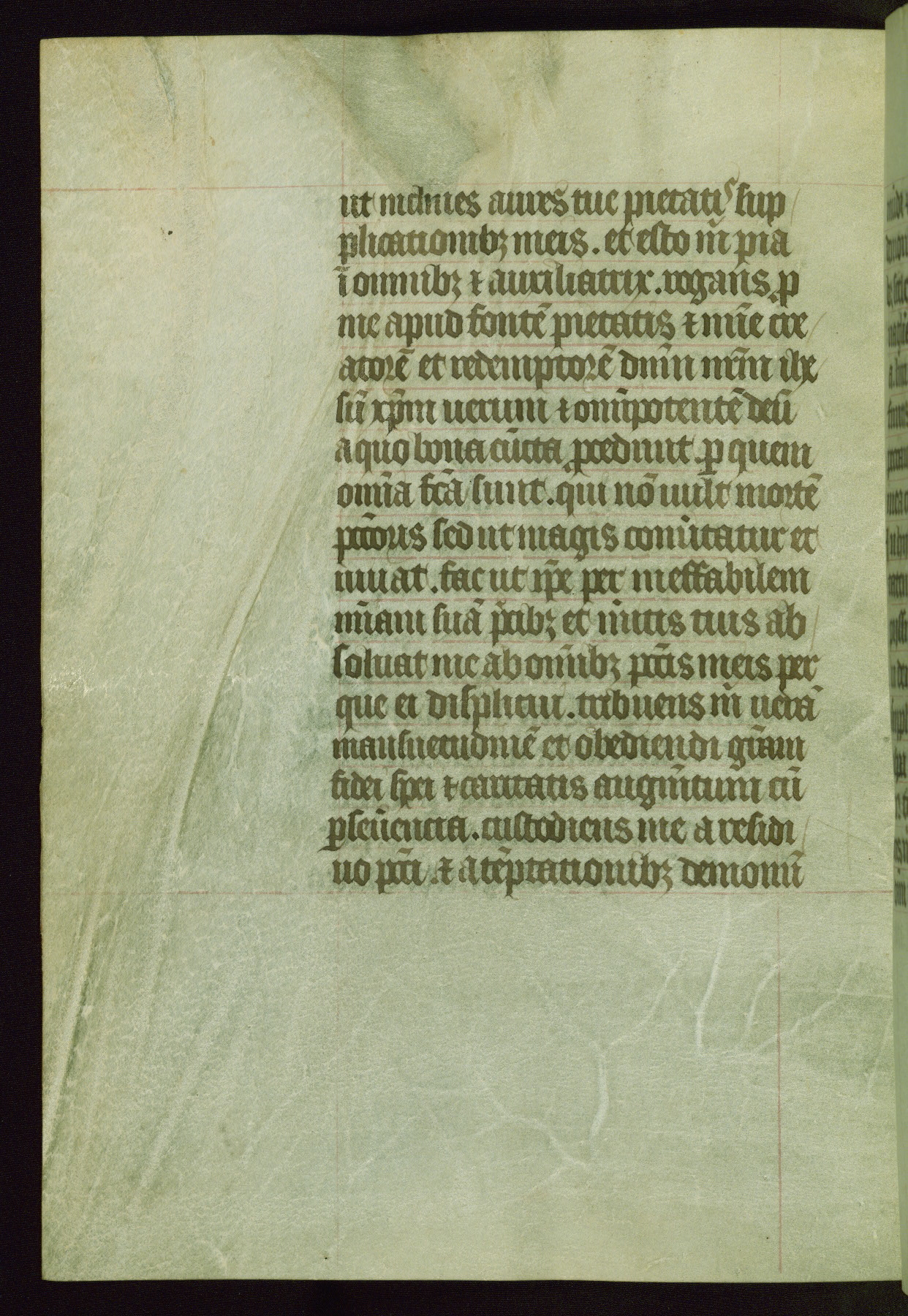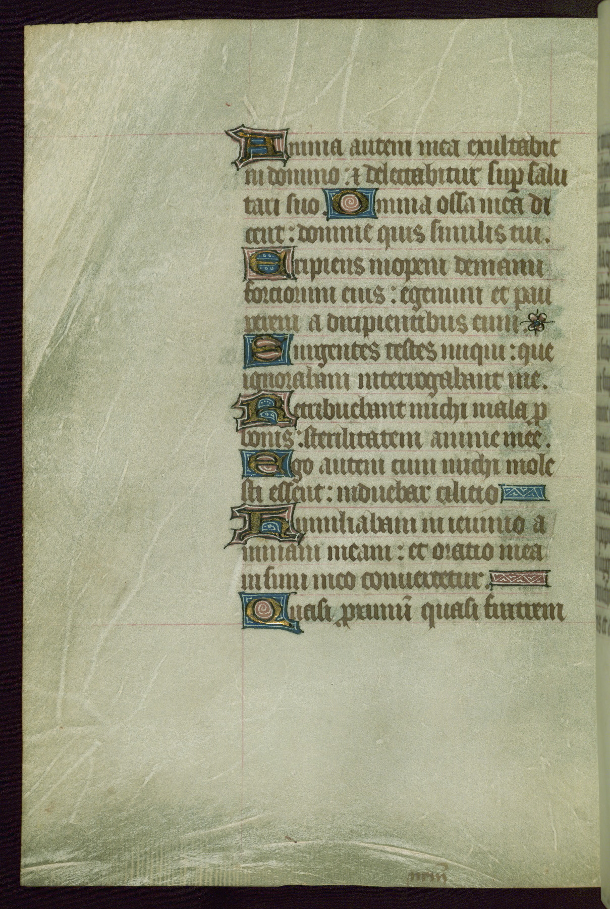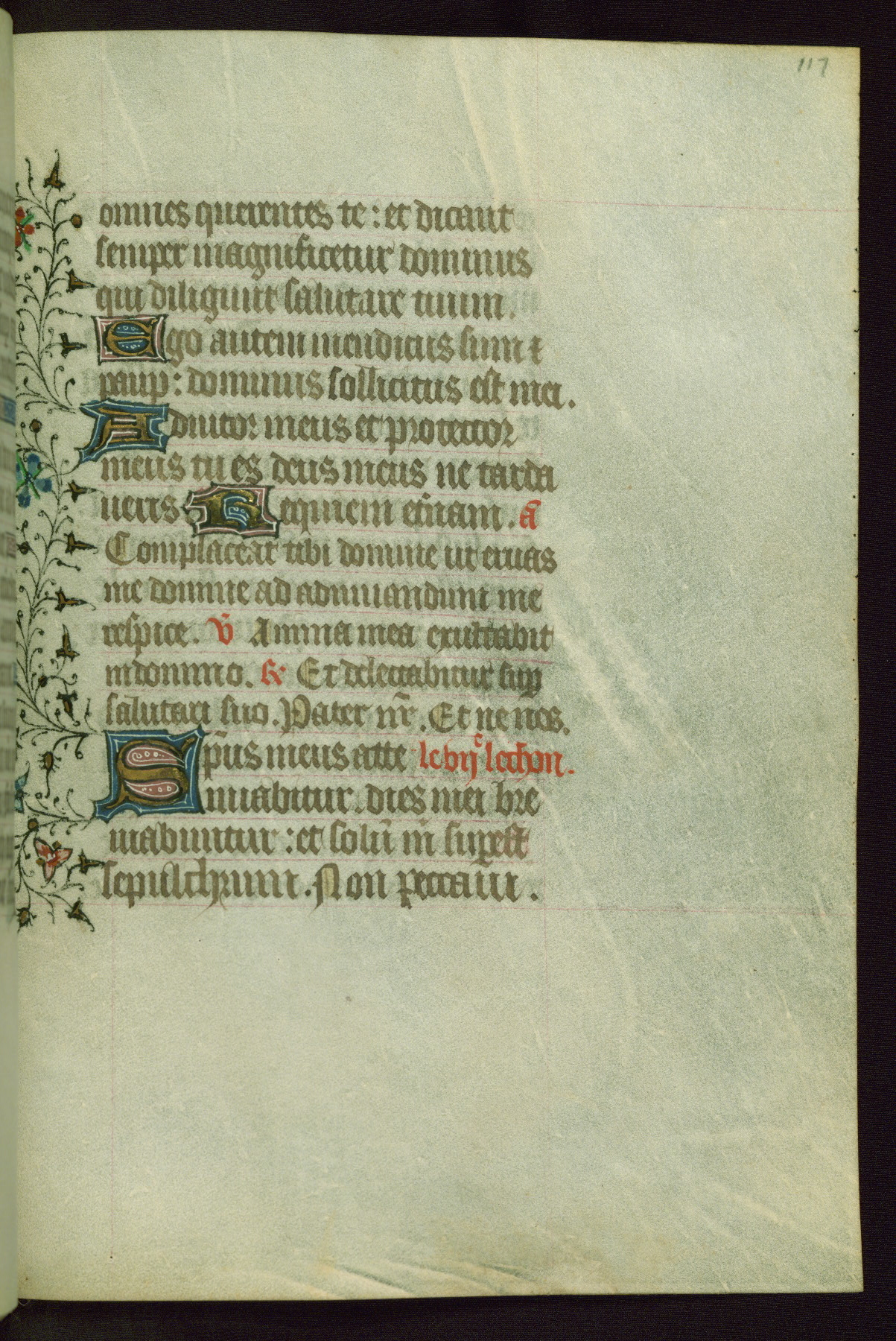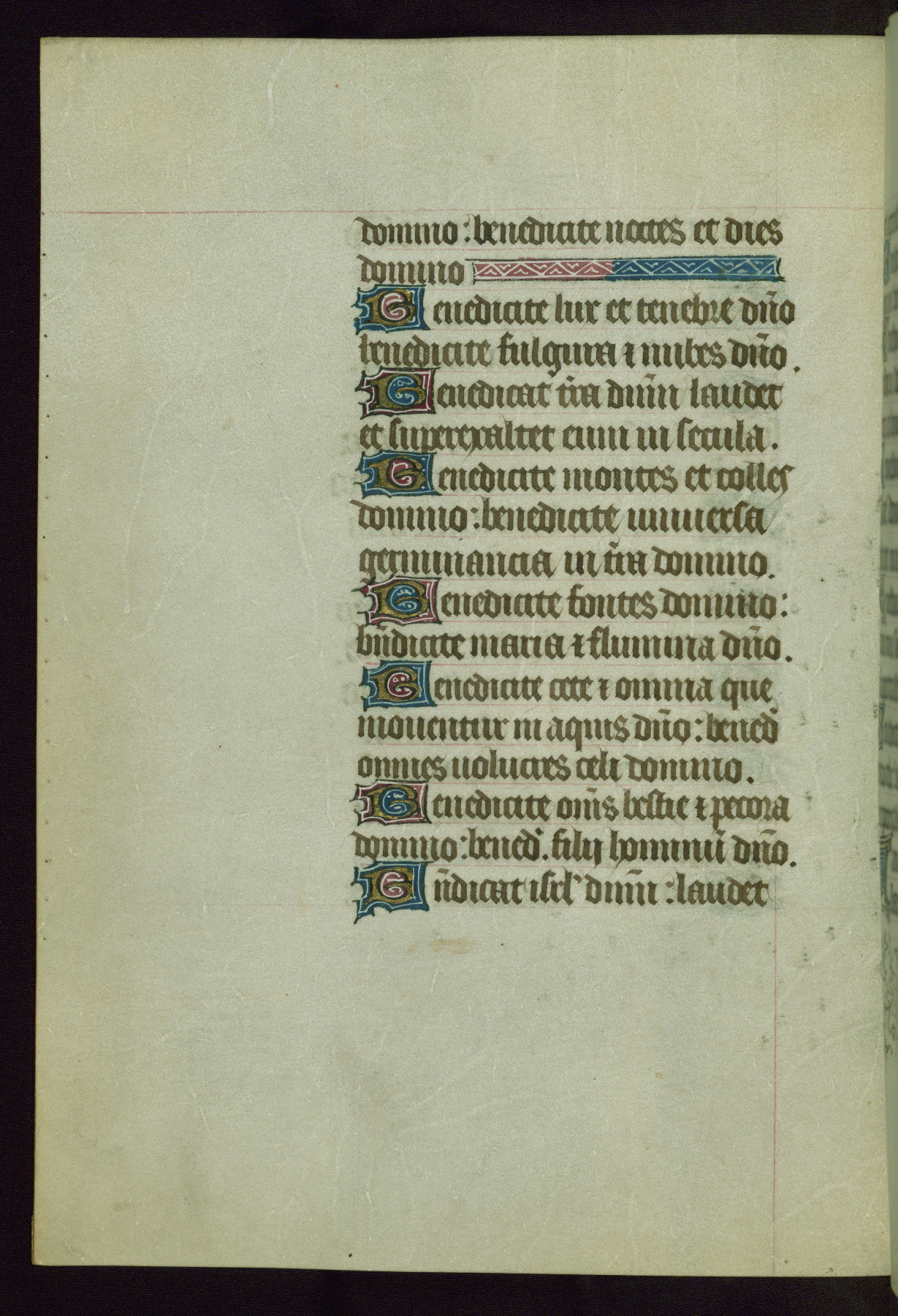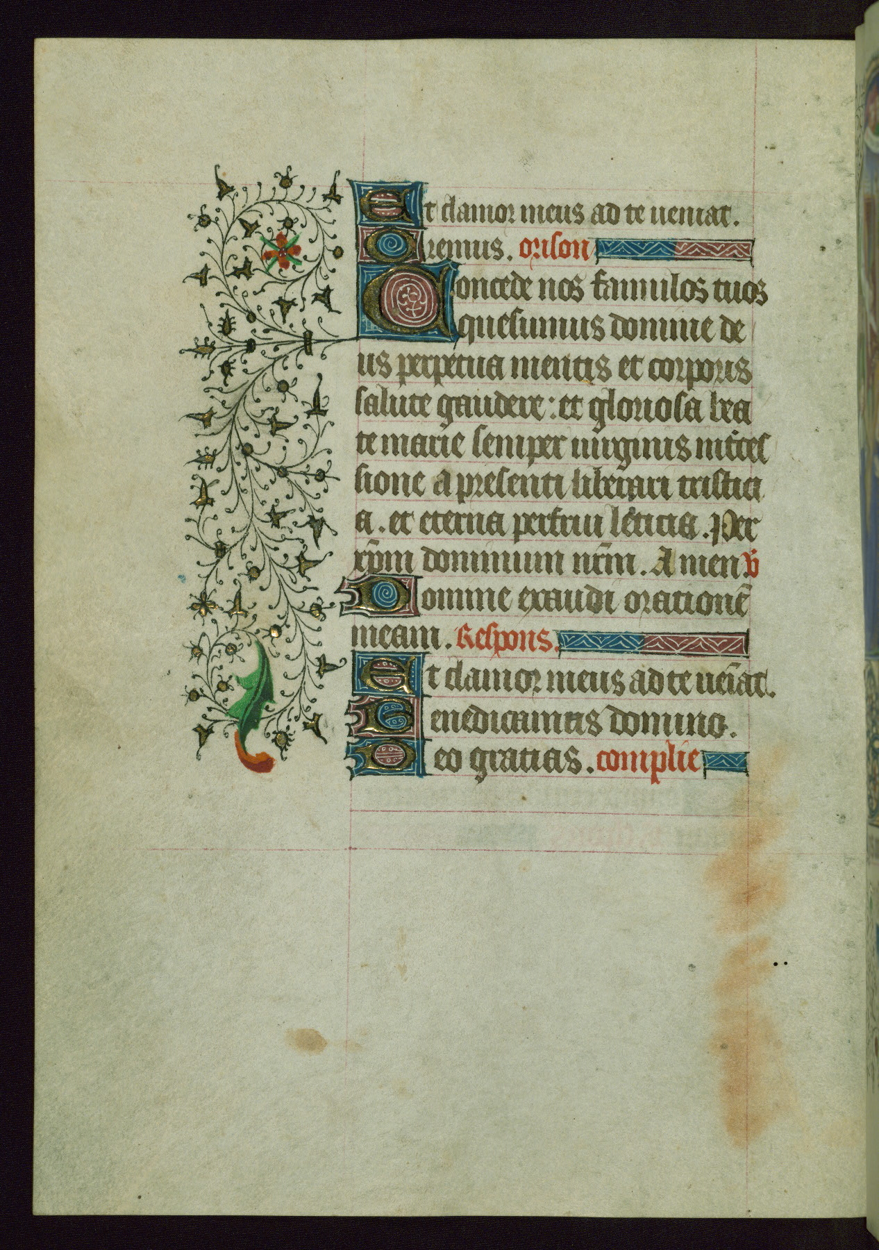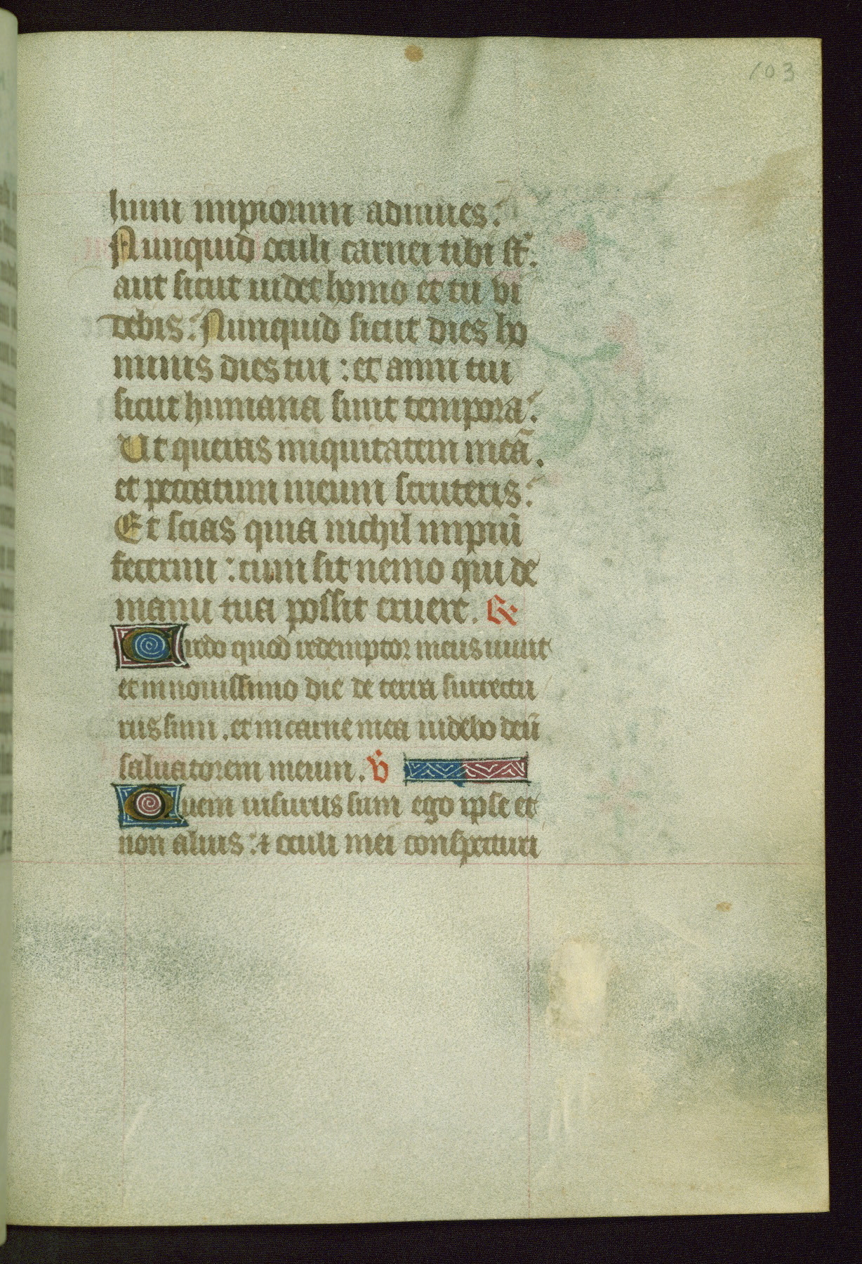 This Book of Hours was created ca. 1435-1440 in Amiens by artists from the circle of the Master of W.281 (Randall, cat. 112) for a female patron depicted on fol. 135r. The manuscript contains fourteen miniatures and is localized to Amiens by the contents of the calendar and litany, which include many saints particular to that region. Quire 12 (fols. 82-89) is misbound with quire 13 (fols. 90-97), with Suffrages and the Seven Verses of St. Bernard (fols. 82-89) intended to be after the Office of the Dead (fols. 90-128), as evinced by the location of the rubric for the Office of the Dead on fol. 81v.