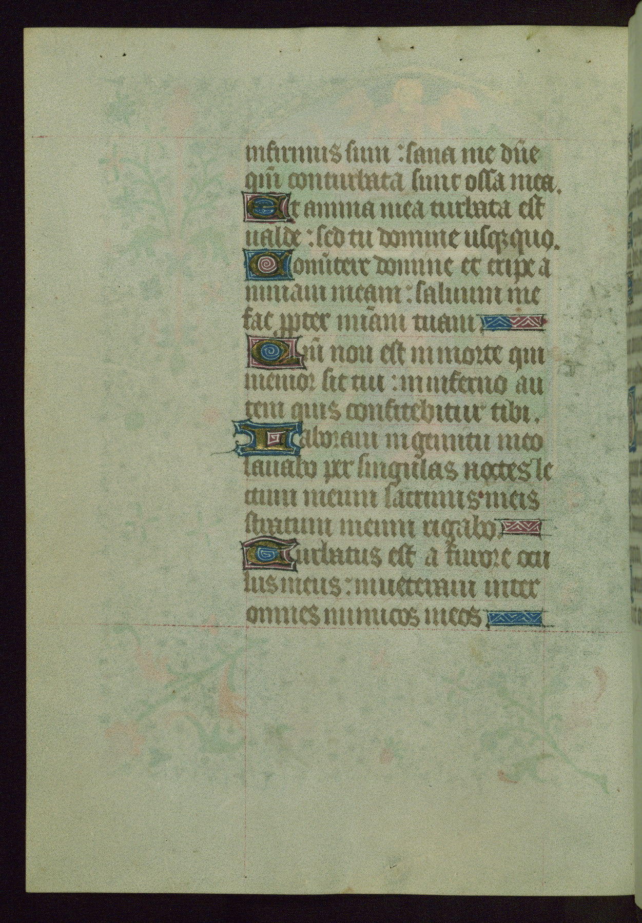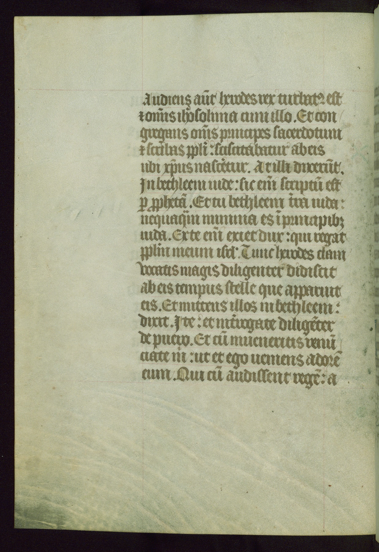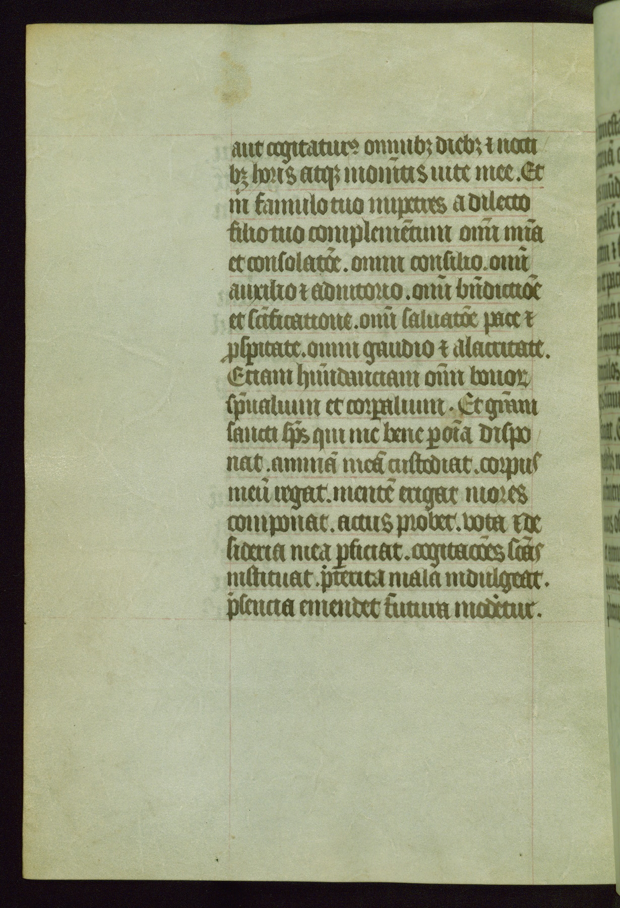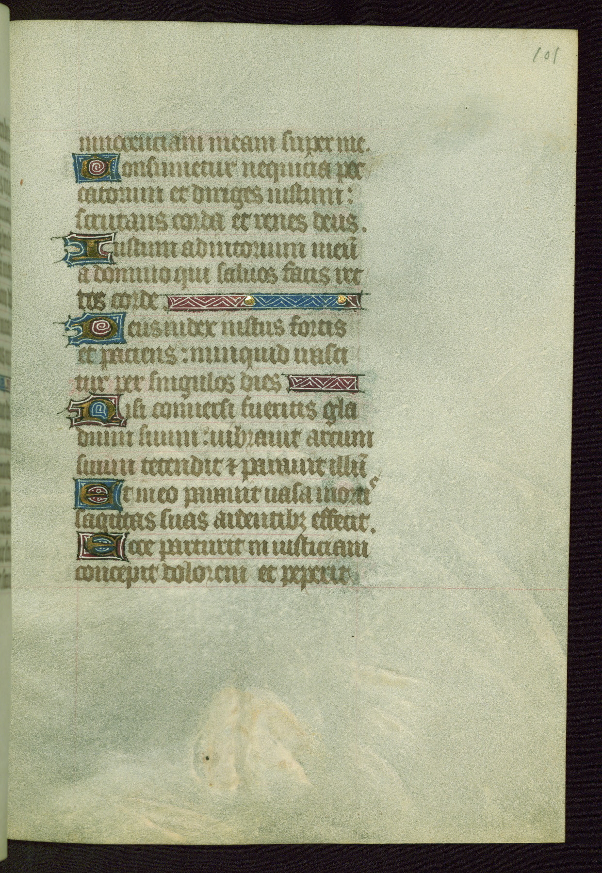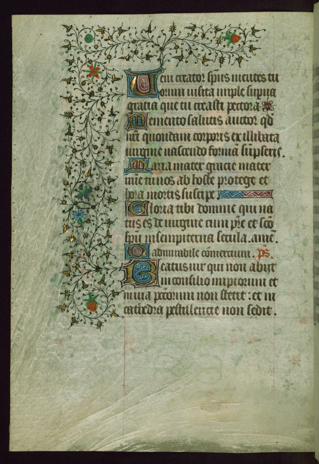 This Book of Hours was created ca. 1435-1440 in Amiens by artists from the circle of the Master of W.281 (Randall, cat. 112) for a female patron depicted on fol. 135r. The manuscript contains fourteen miniatures and is localized to Amiens by the contents of the calendar and litany, which include many saints particular to that region. Quire 12 (fols. 82-89) is misbound with quire 13 (fols. 90-97), with Suffrages and the Seven Verses of St. Bernard (fols. 82-89) intended to be after the Office of the Dead (fols. 90-128), as evinced by the location of the rubric for the Office of the Dead on fol. 81v.