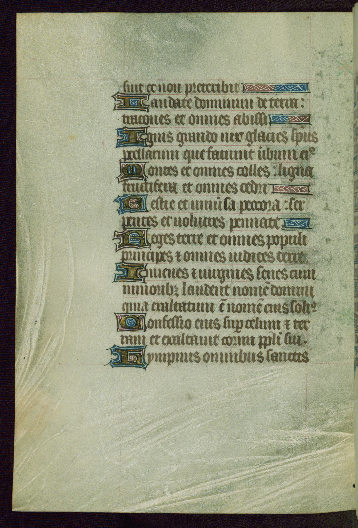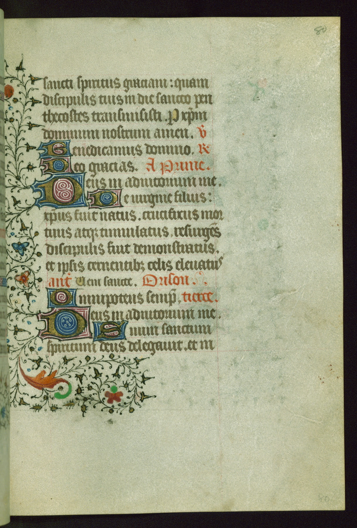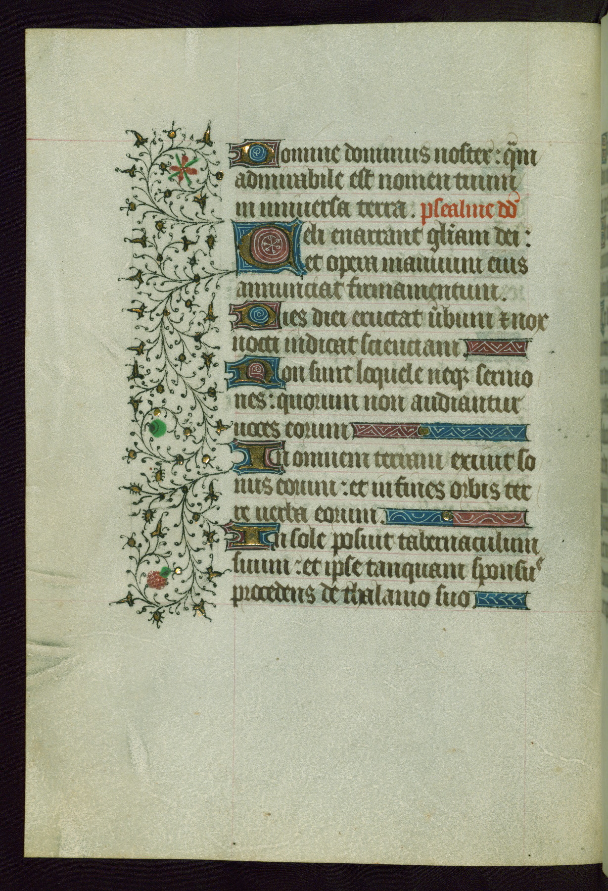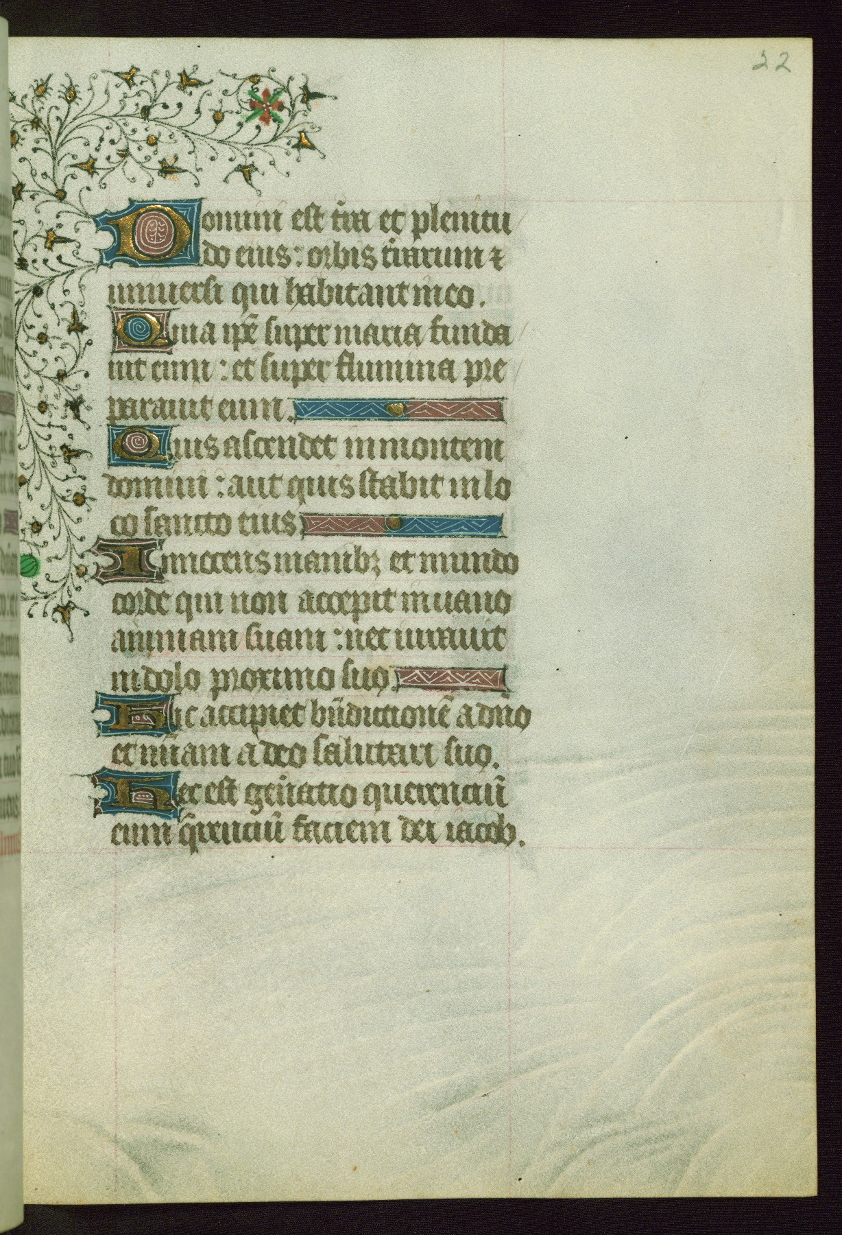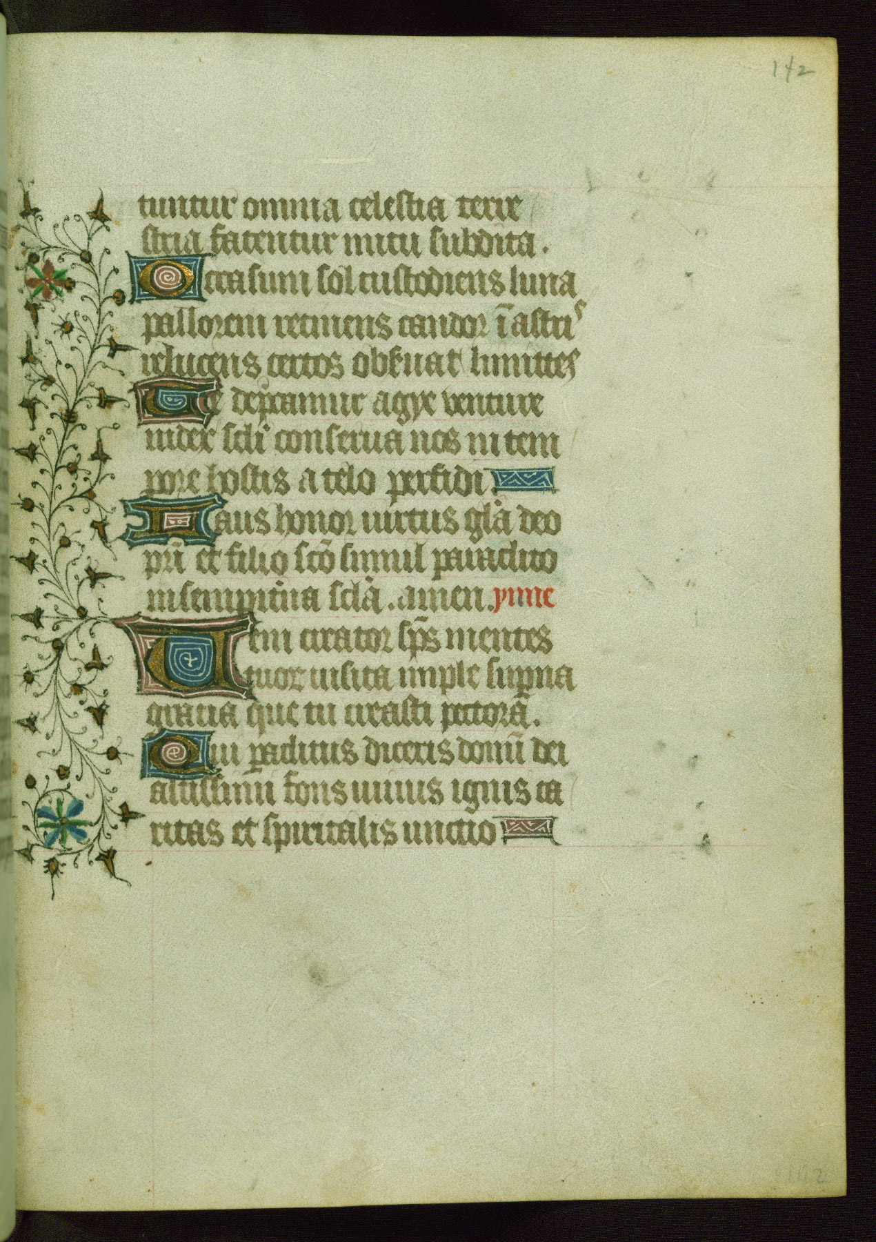 This Book of Hours was created ca. 1435-1440 in Amiens by artists from the circle of the Master of W.281 (Randall, cat. 112) for a female patron depicted on fol. 135r. The manuscript contains fourteen miniatures and is localized to Amiens by the contents of the calendar and litany, which include many saints particular to that region. Quire 12 (fols. 82-89) is misbound with quire 13 (fols. 90-97), with Suffrages and the Seven Verses of St. Bernard (fols. 82-89) intended to be after the Office of the Dead (fols. 90-128), as evinced by the location of the rubric for the Office of the Dead on fol. 81v.