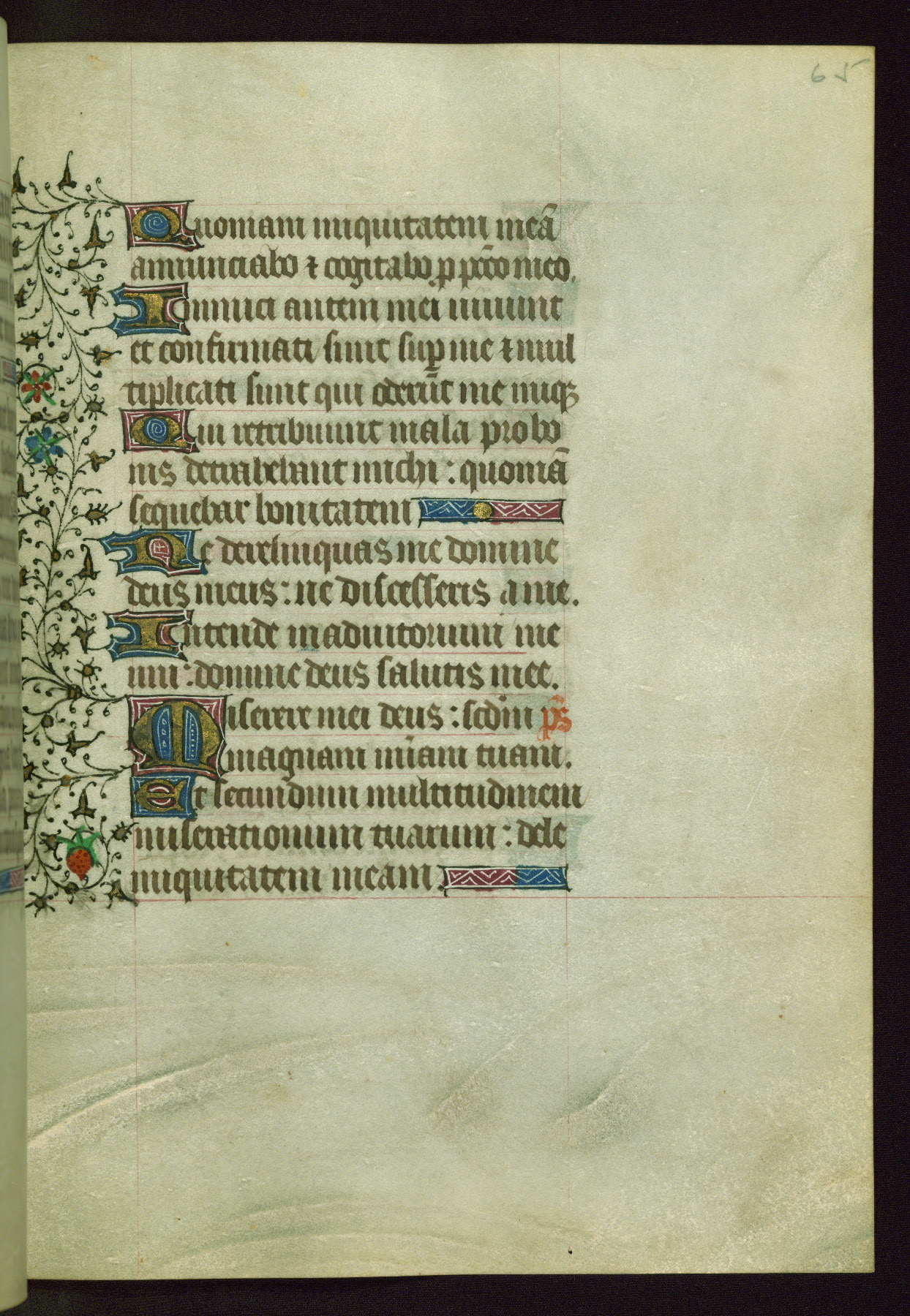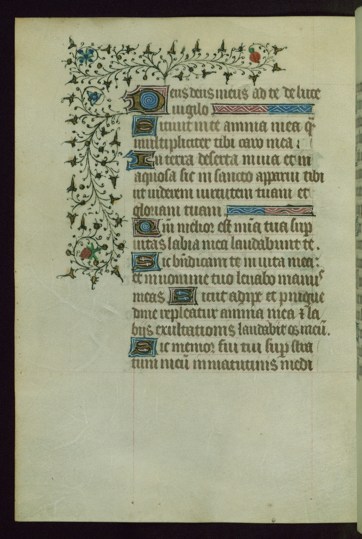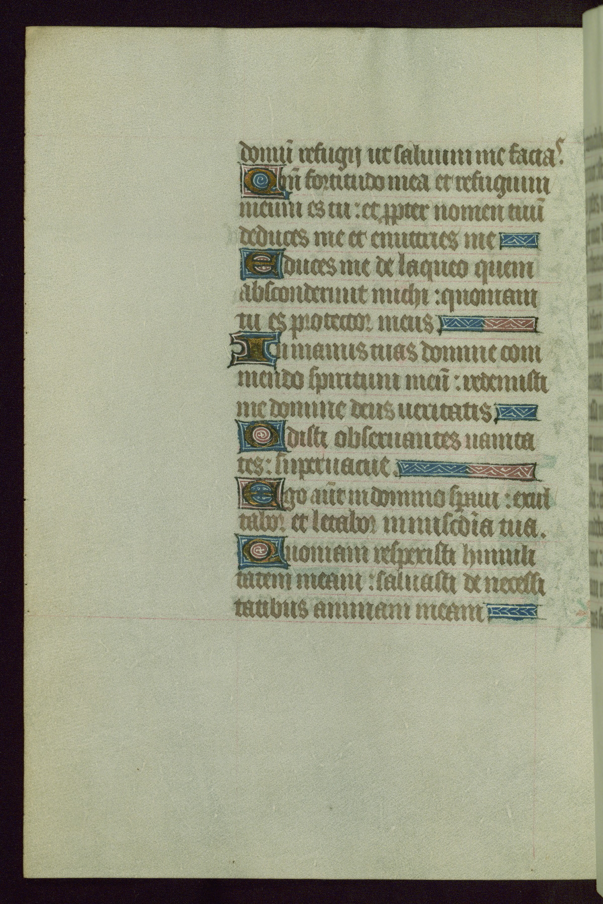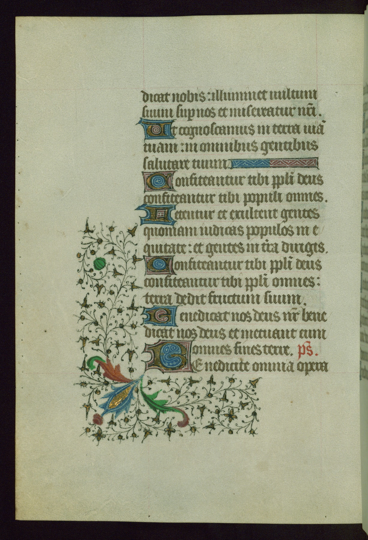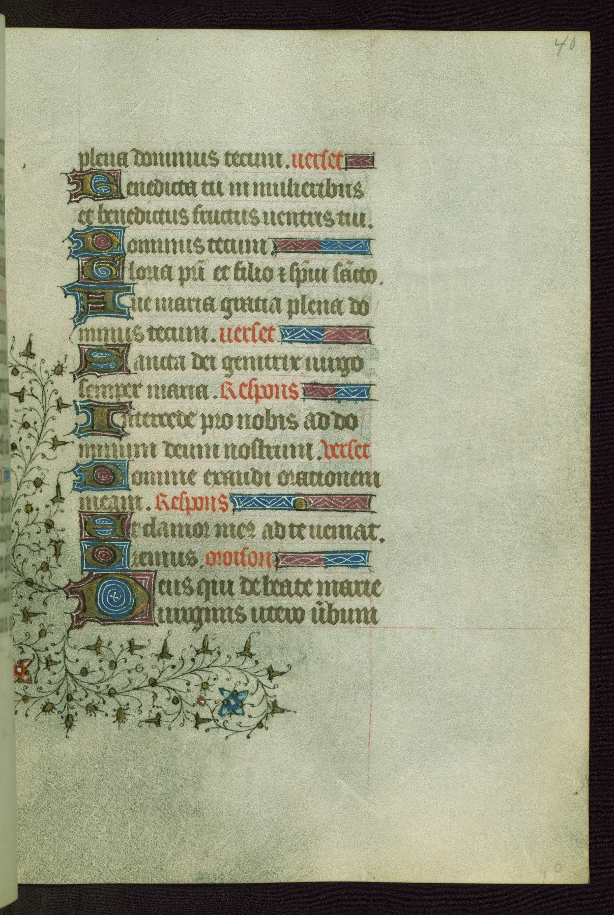 This Book of Hours was created ca. 1435-1440 in Amiens by artists from the circle of the Master of W.281 (Randall, cat. 112) for a female patron depicted on fol. 135r. The manuscript contains fourteen miniatures and is localized to Amiens by the contents of the calendar and litany, which include many saints particular to that region. Quire 12 (fols. 82-89) is misbound with quire 13 (fols. 90-97), with Suffrages and the Seven Verses of St. Bernard (fols. 82-89) intended to be after the Office of the Dead (fols. 90-128), as evinced by the location of the rubric for the Office of the Dead on fol. 81v.
