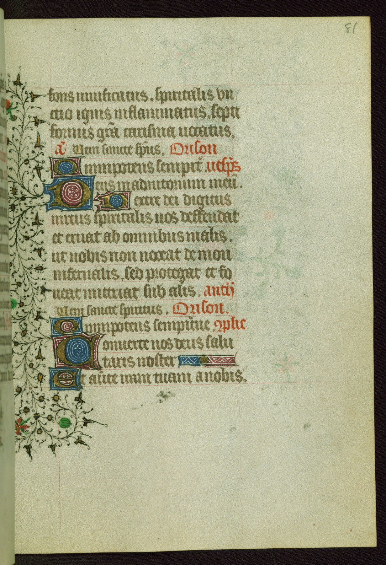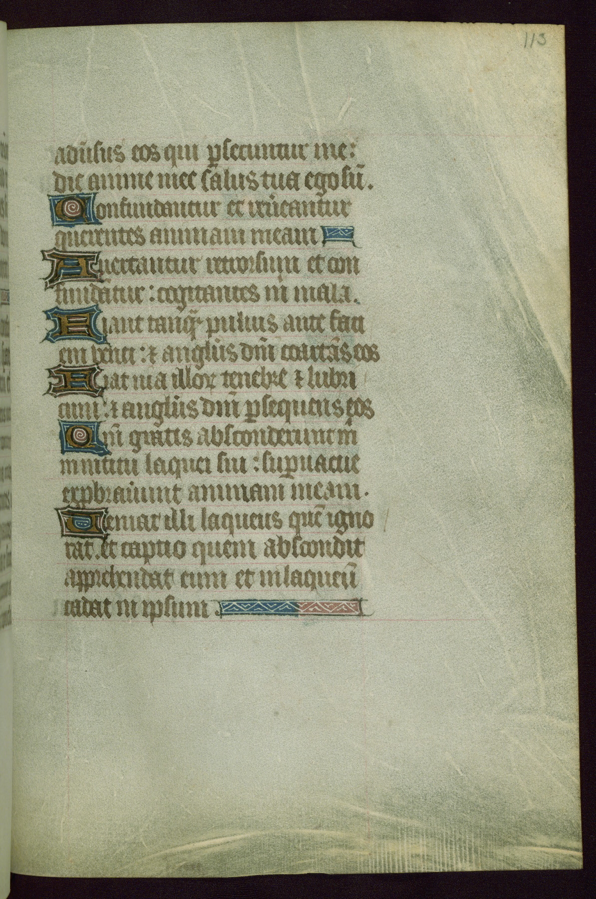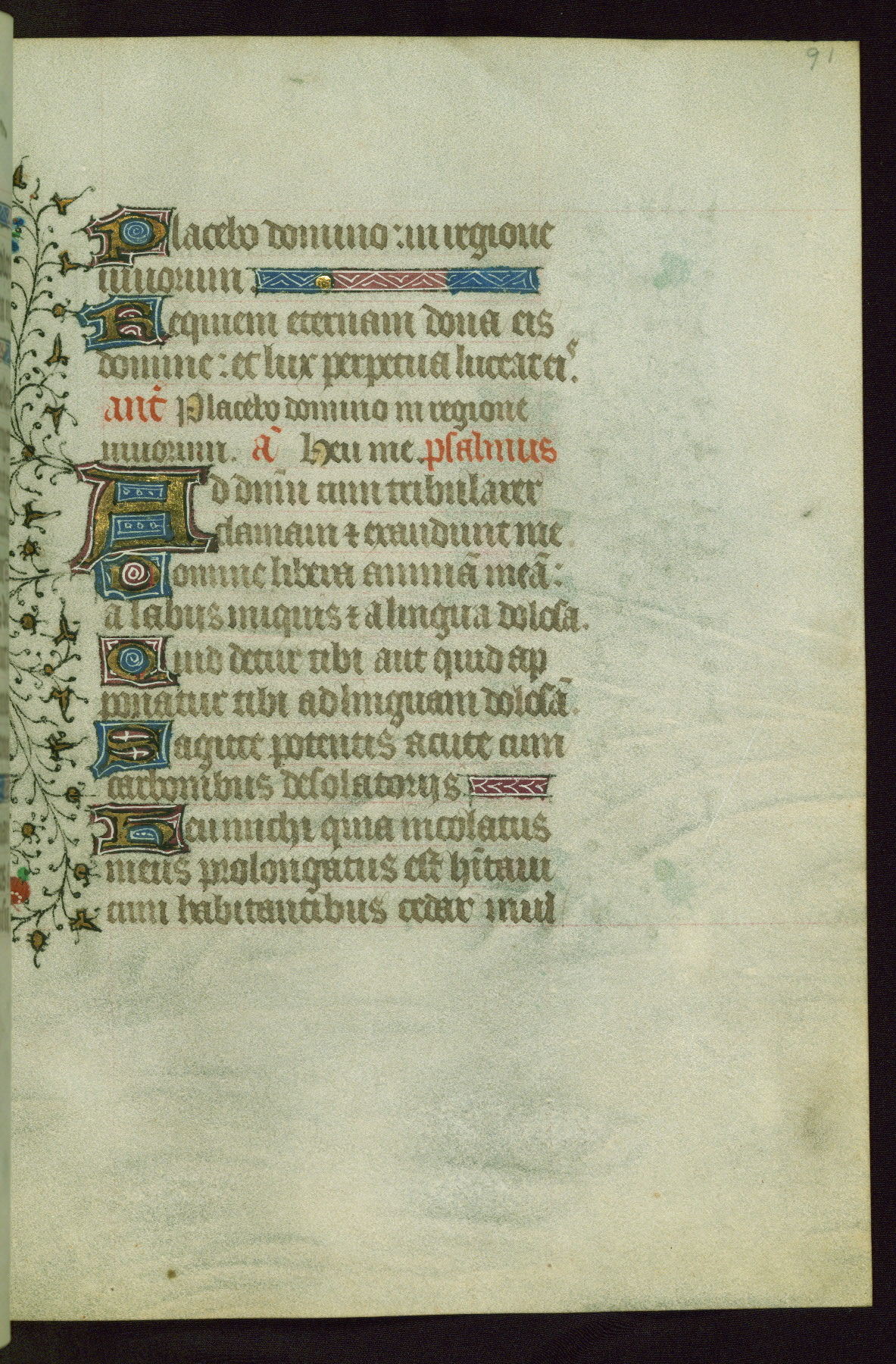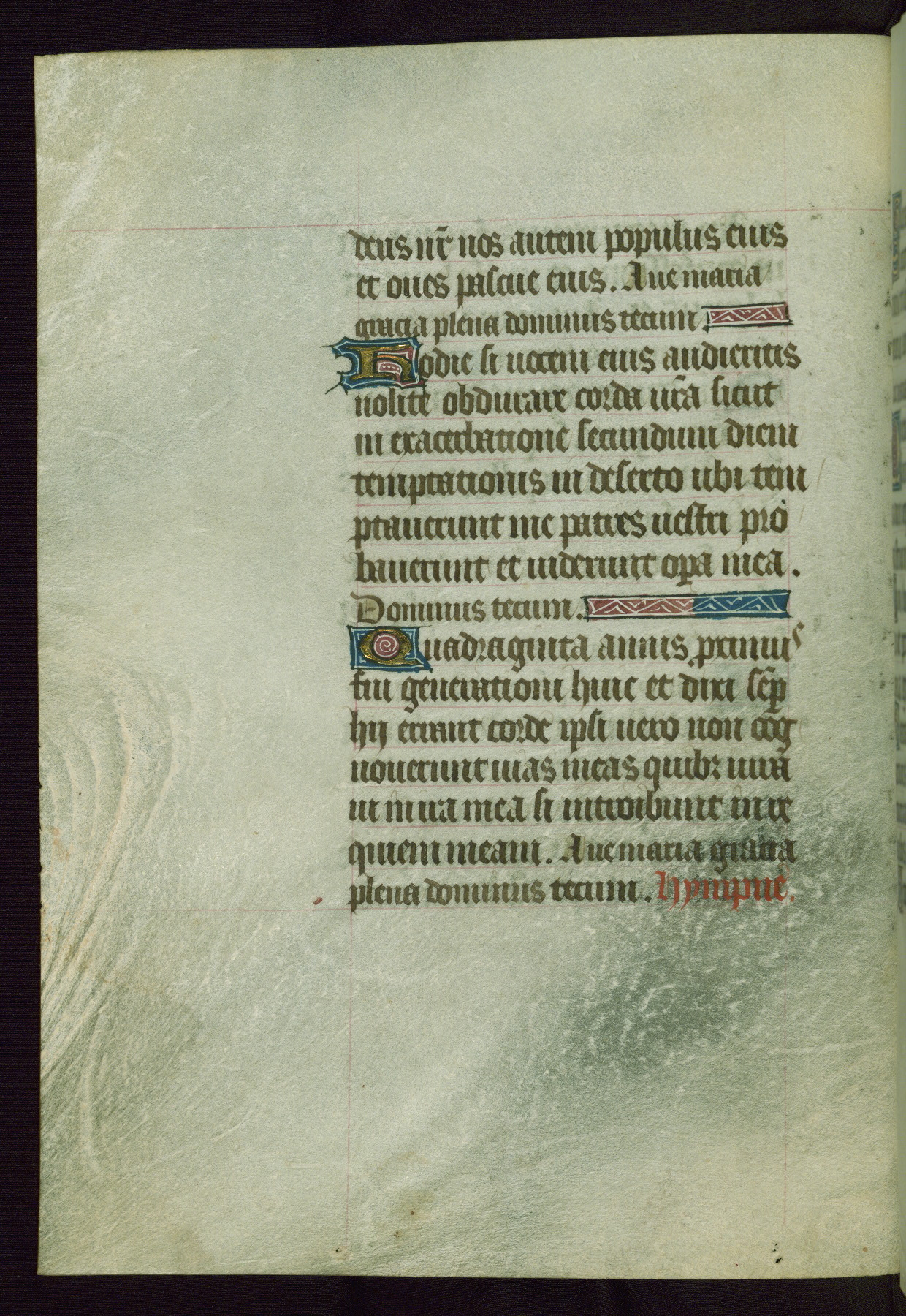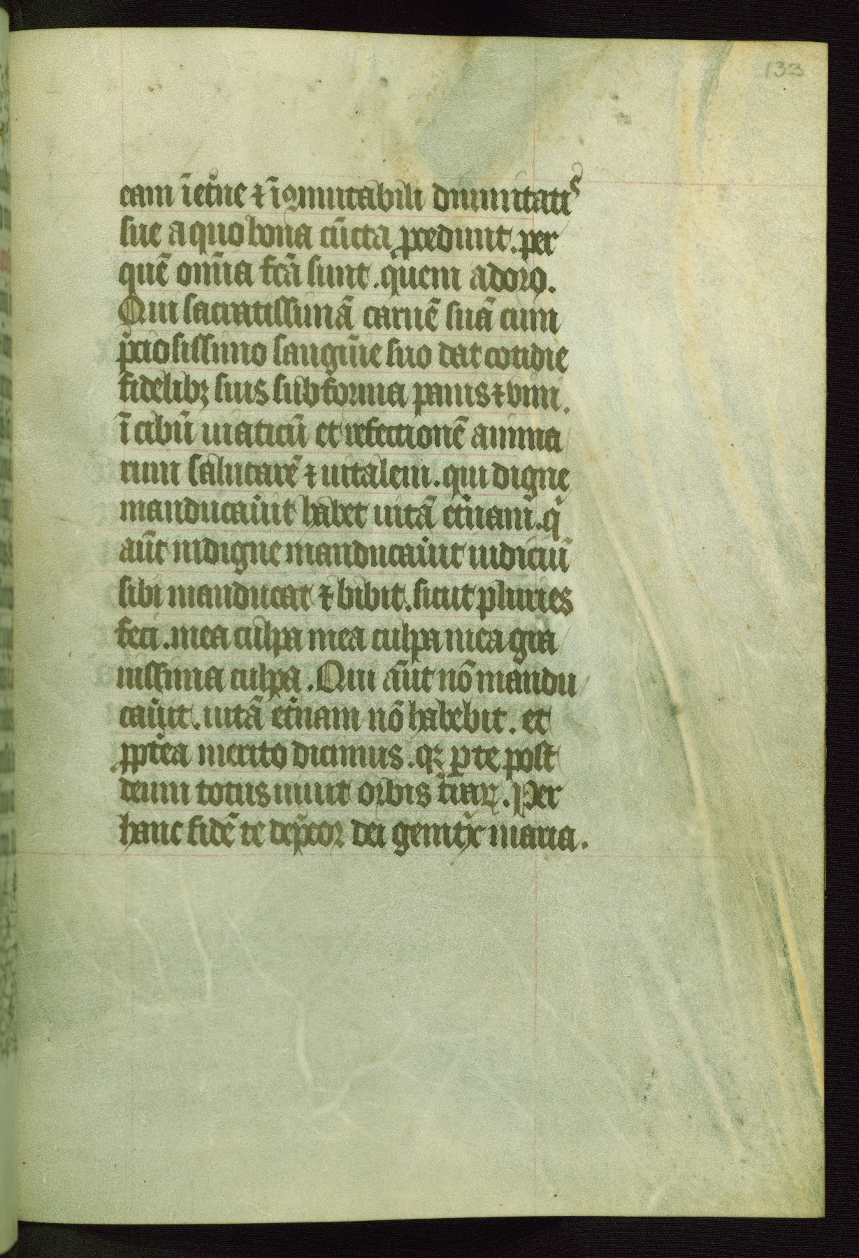 This Book of Hours was created ca. 1435-1440 in Amiens by artists from the circle of the Master of W.281 (Randall, cat. 112) for a female patron depicted on fol. 135r. The manuscript contains fourteen miniatures and is localized to Amiens by the contents of the calendar and litany, which include many saints particular to that region. Quire 12 (fols. 82-89) is misbound with quire 13 (fols. 90-97), with Suffrages and the Seven Verses of St. Bernard (fols. 82-89) intended to be after the Office of the Dead (fols. 90-128), as evinced by the location of the rubric for the Office of the Dead on fol. 81v.