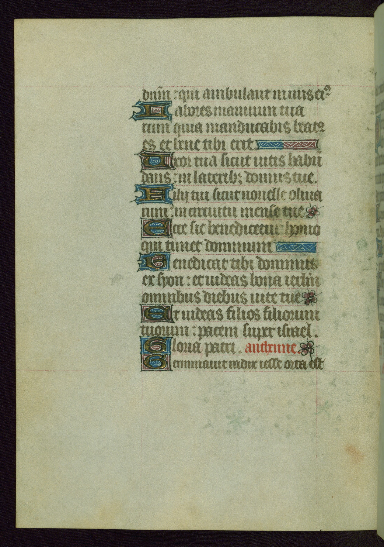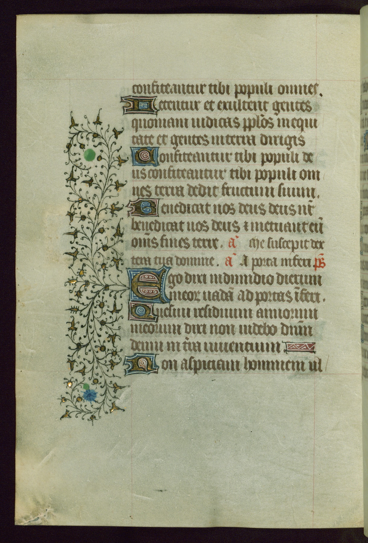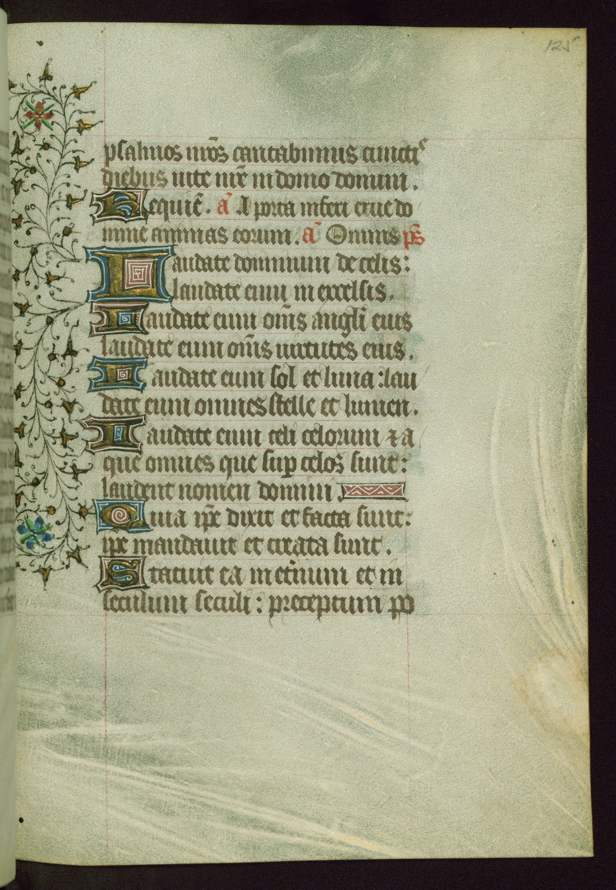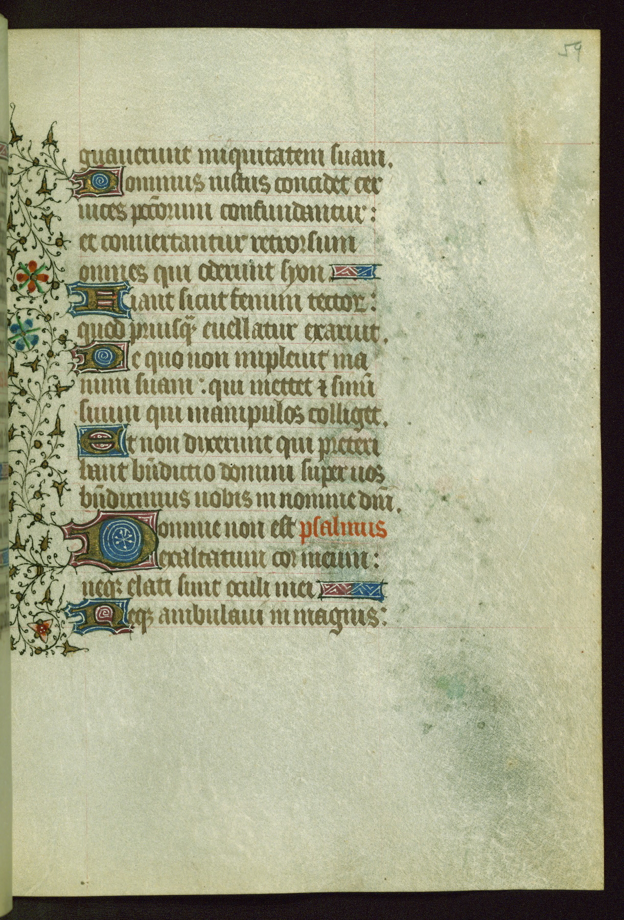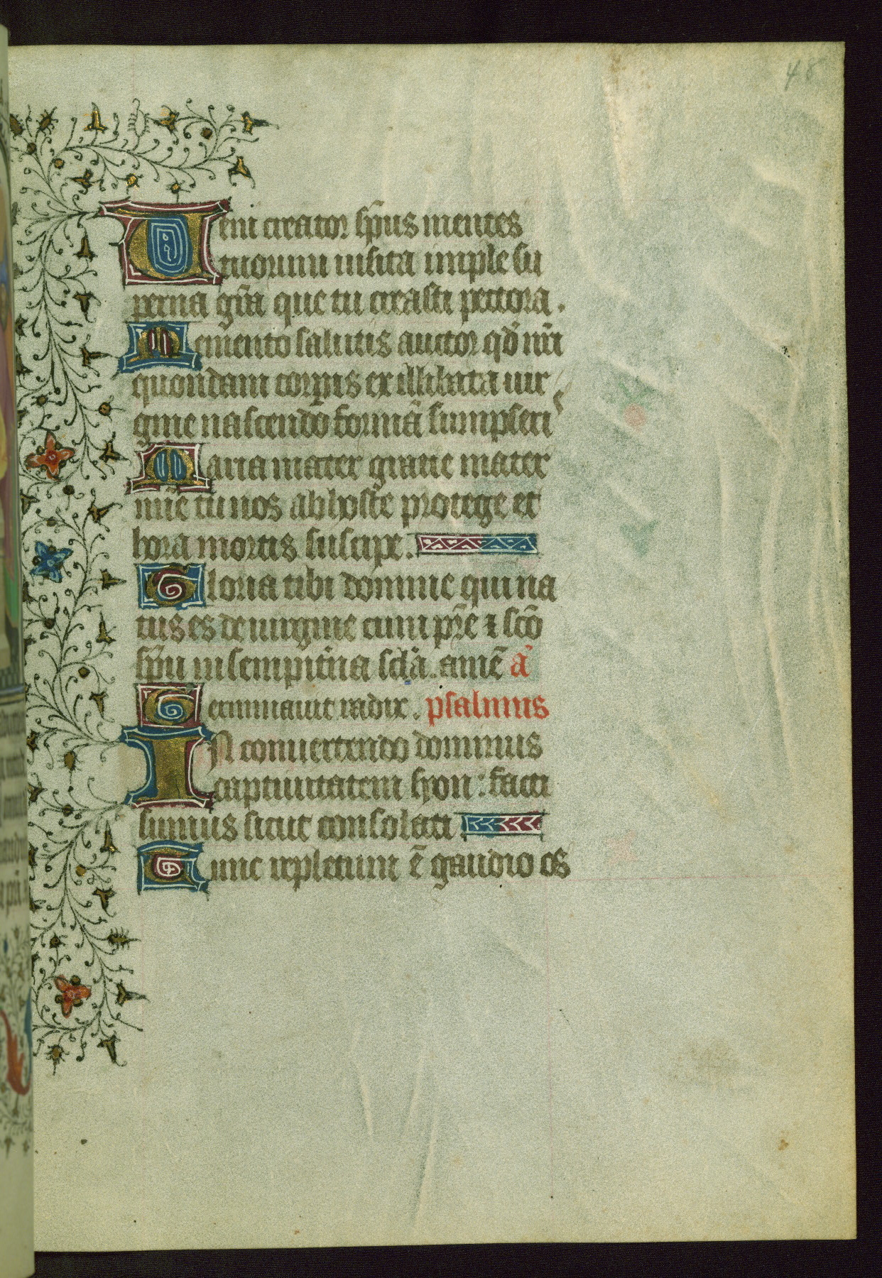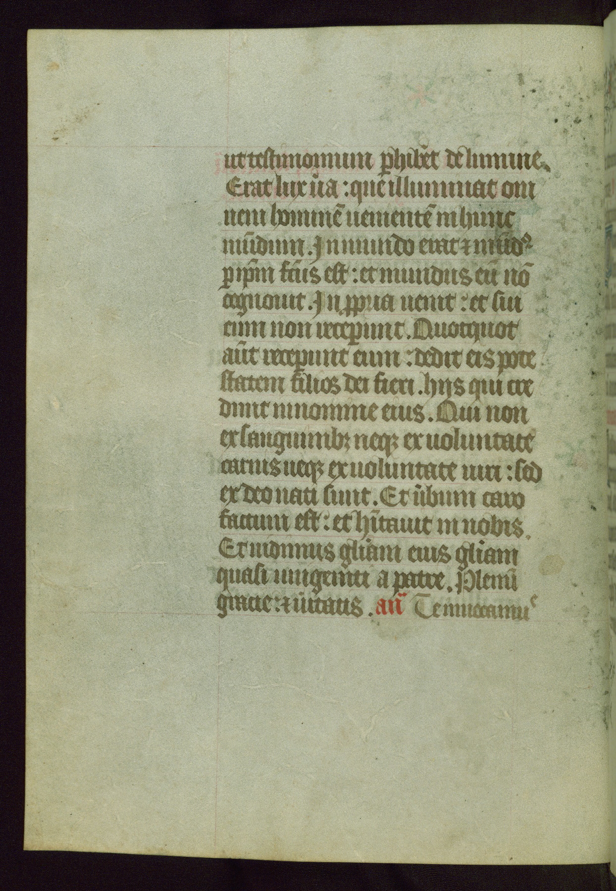 This Book of Hours was created ca. 1435-1440 in Amiens by artists from the circle of the Master of W.281 (Randall, cat. 112) for a female patron depicted on fol. 135r. The manuscript contains fourteen miniatures and is localized to Amiens by the contents of the calendar and litany, which include many saints particular to that region. Quire 12 (fols. 82-89) is misbound with quire 13 (fols. 90-97), with Suffrages and the Seven Verses of St. Bernard (fols. 82-89) intended to be after the Office of the Dead (fols. 90-128), as evinced by the location of the rubric for the Office of the Dead on fol. 81v.