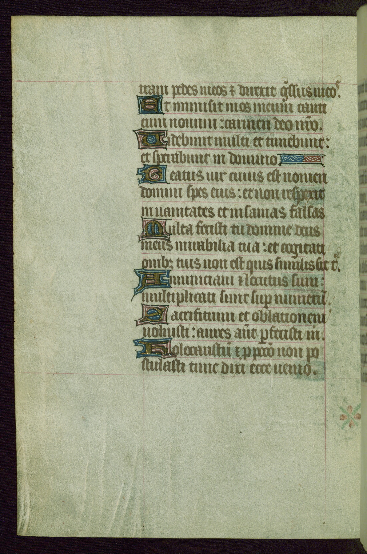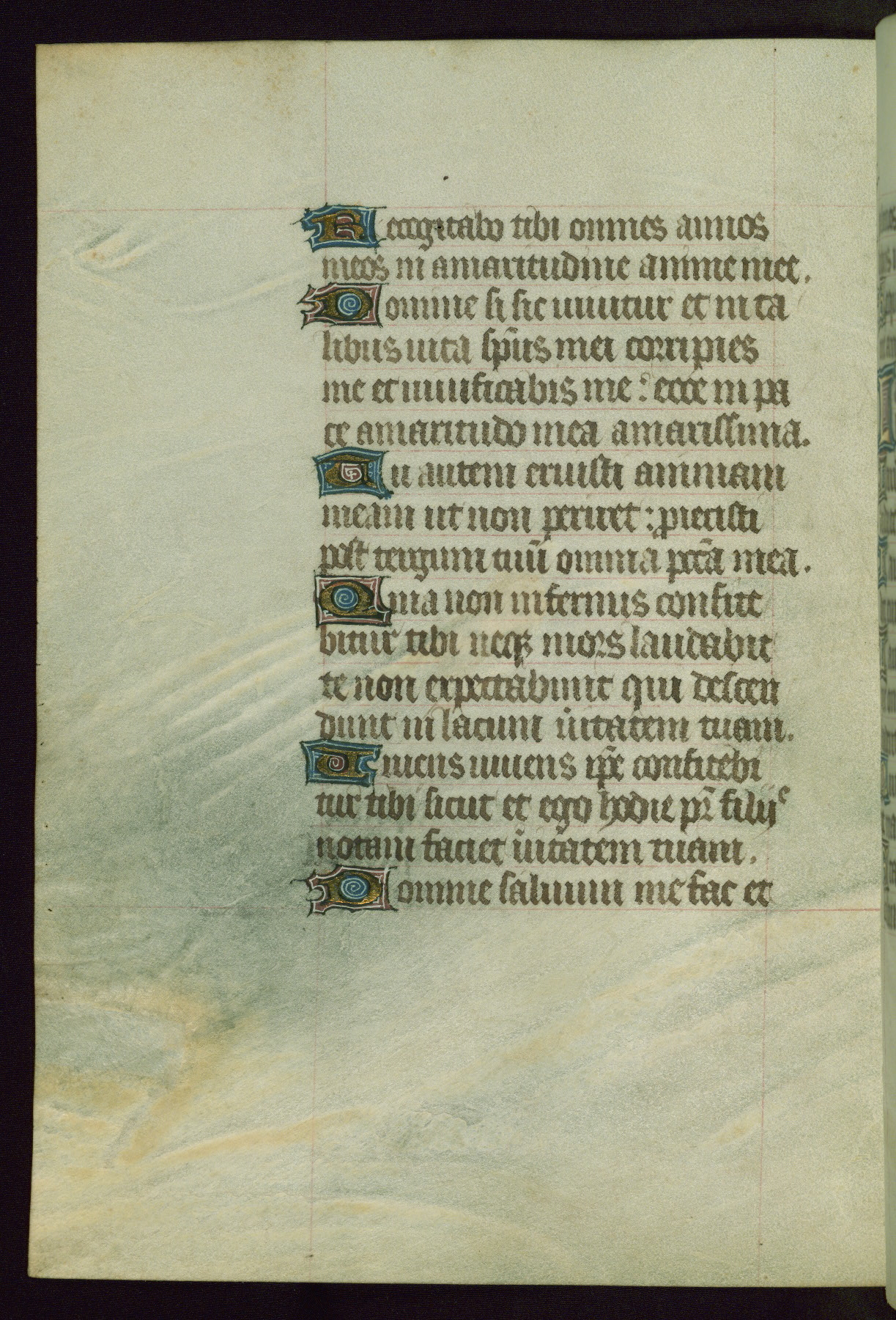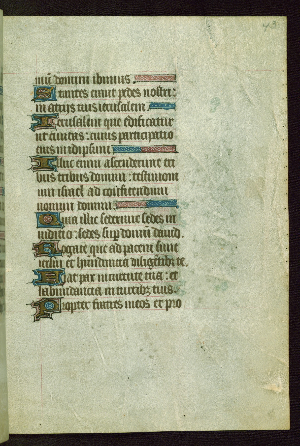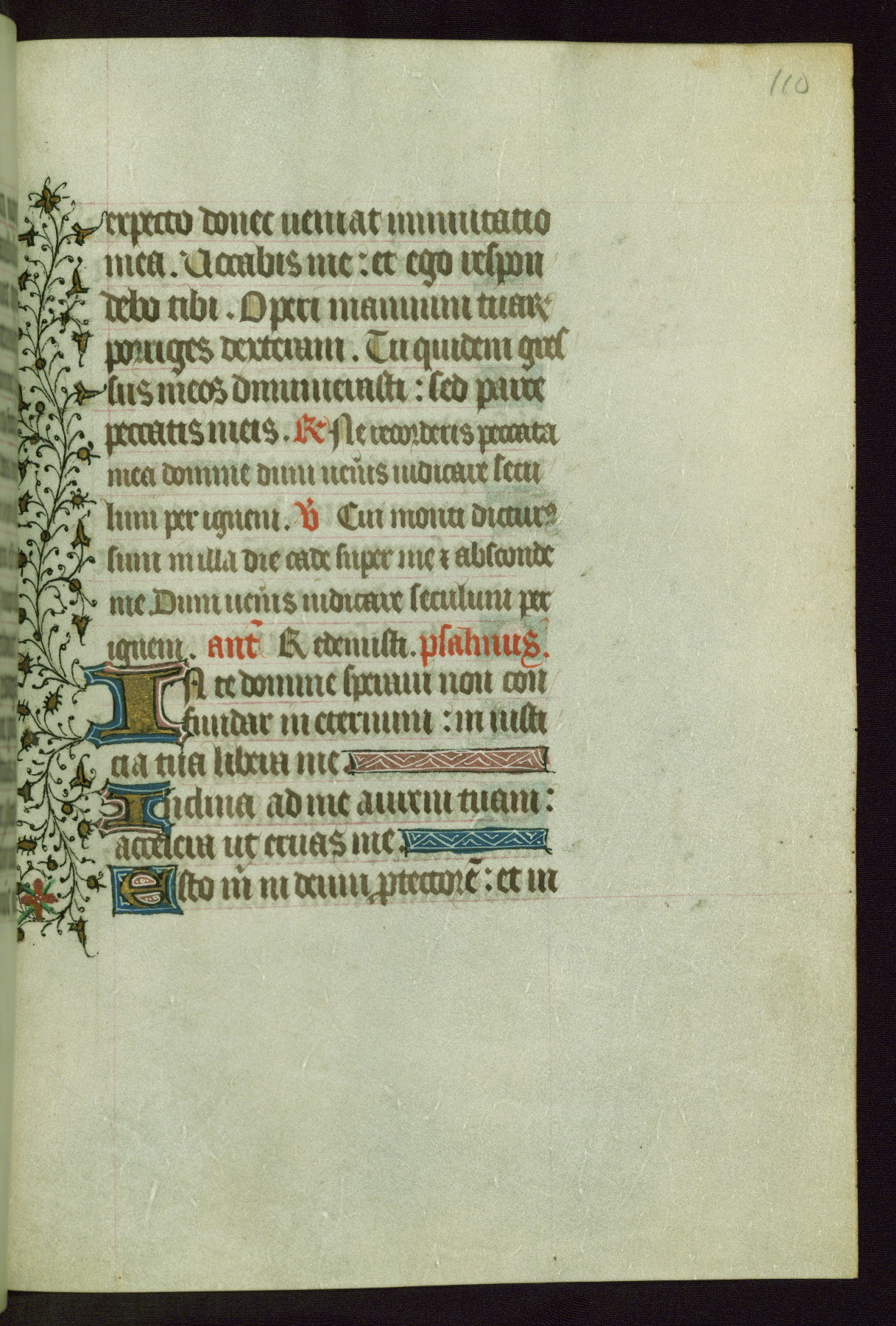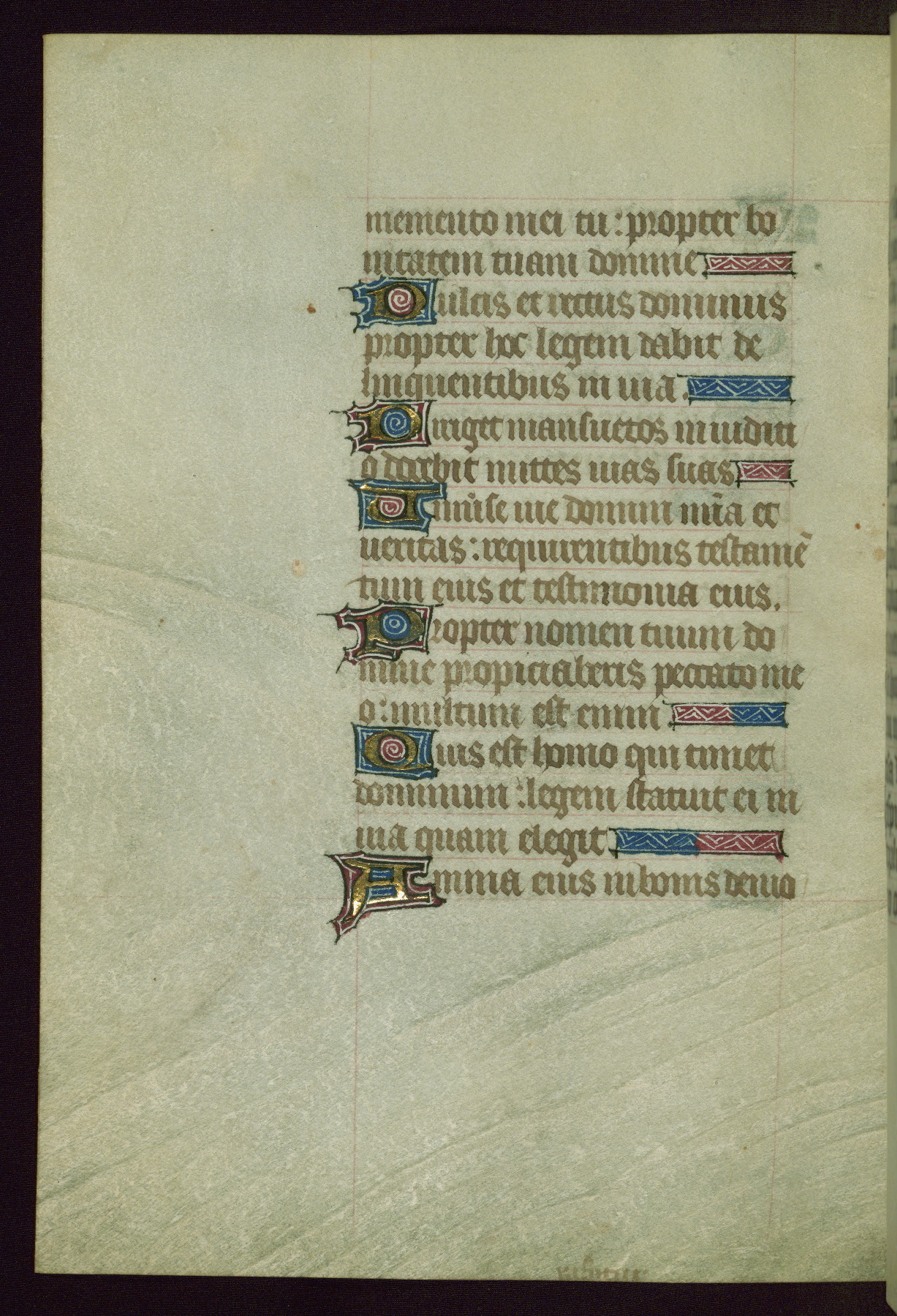 This Book of Hours was created ca. 1435-1440 in Amiens by artists from the circle of the Master of W.281 (Randall, cat. 112) for a female patron depicted on fol. 135r. The manuscript contains fourteen miniatures and is localized to Amiens by the contents of the calendar and litany, which include many saints particular to that region. Quire 12 (fols. 82-89) is misbound with quire 13 (fols. 90-97), with Suffrages and the Seven Verses of St. Bernard (fols. 82-89) intended to be after the Office of the Dead (fols. 90-128), as evinced by the location of the rubric for the Office of the Dead on fol. 81v.
