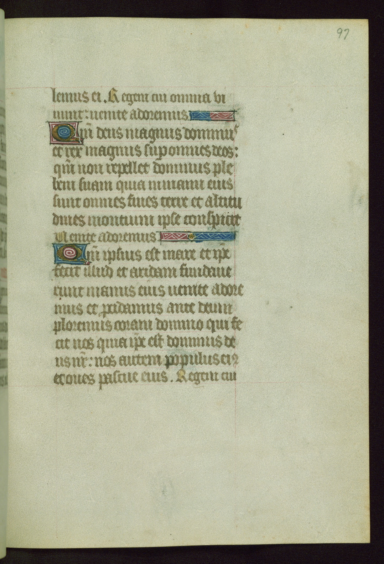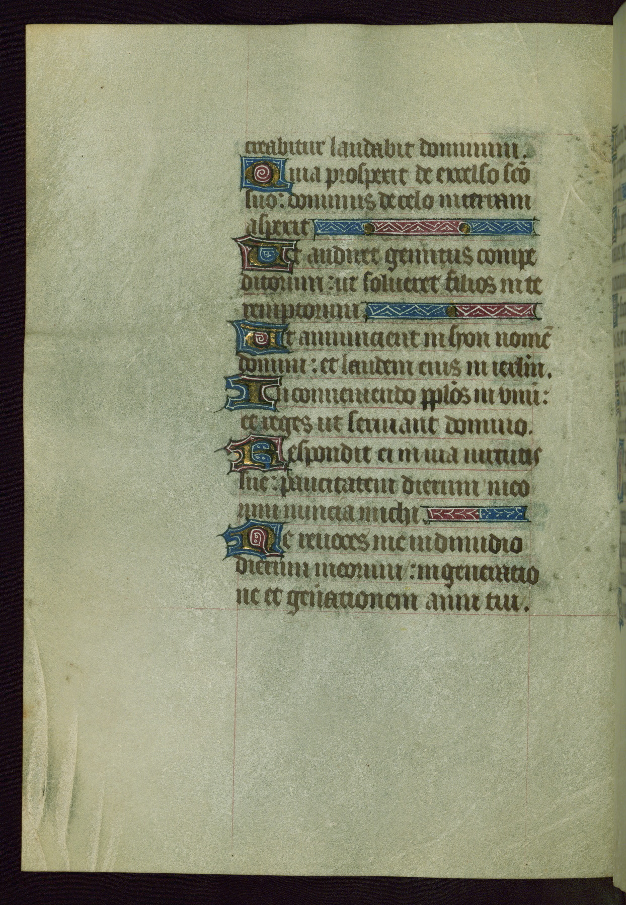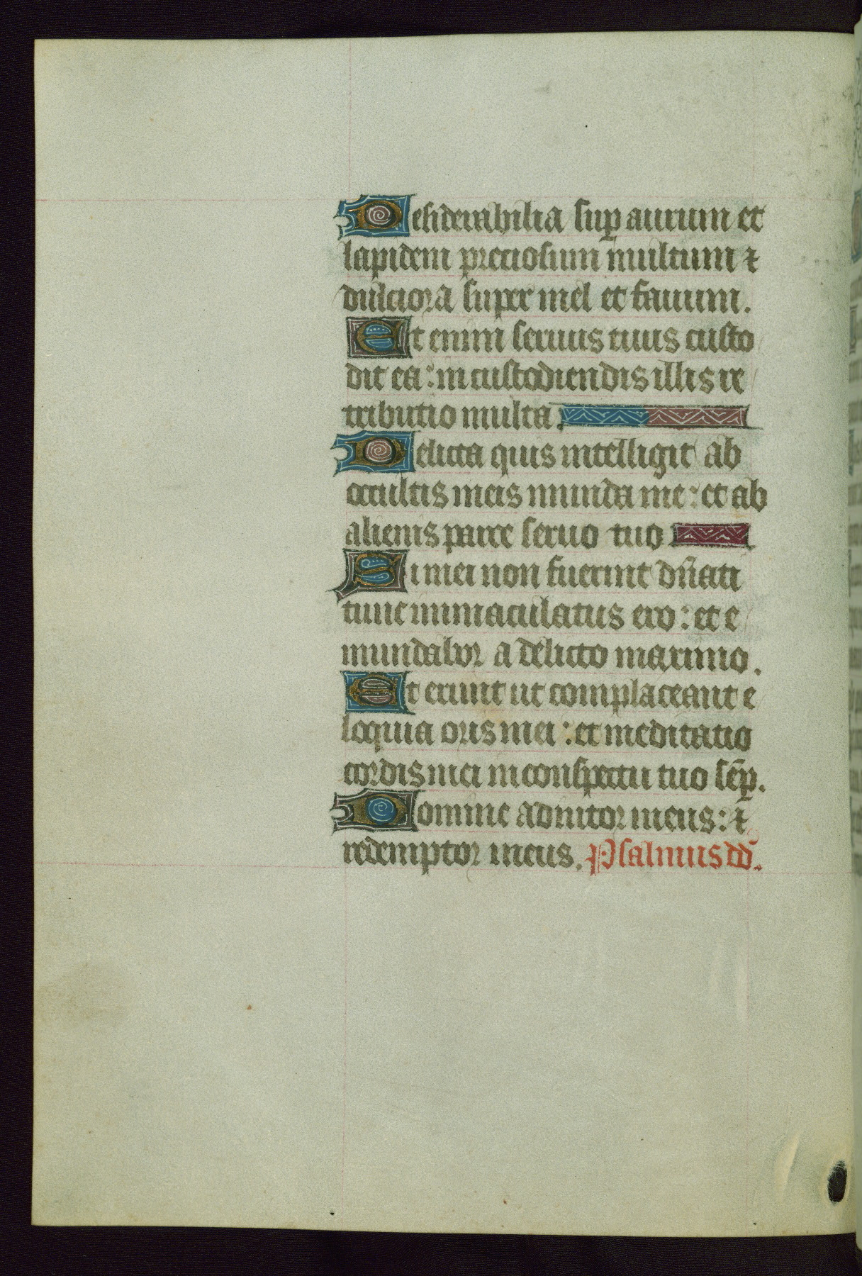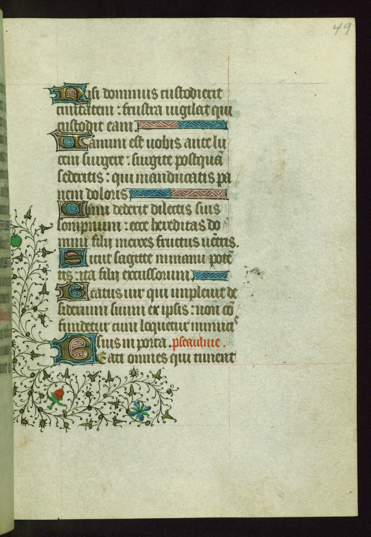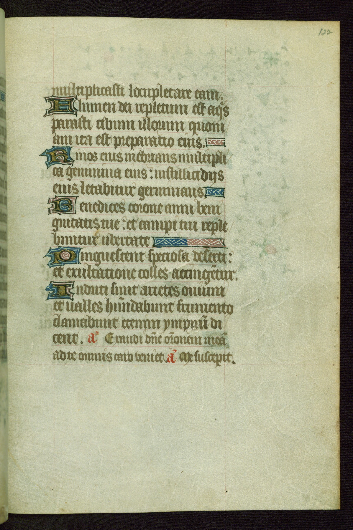 This Book of Hours was created ca. 1435-1440 in Amiens by artists from the circle of the Master of W.281 (Randall, cat. 112) for a female patron depicted on fol. 135r. The manuscript contains fourteen miniatures and is localized to Amiens by the contents of the calendar and litany, which include many saints particular to that region. Quire 12 (fols. 82-89) is misbound with quire 13 (fols. 90-97), with Suffrages and the Seven Verses of St. Bernard (fols. 82-89) intended to be after the Office of the Dead (fols. 90-128), as evinced by the location of the rubric for the Office of the Dead on fol. 81v.