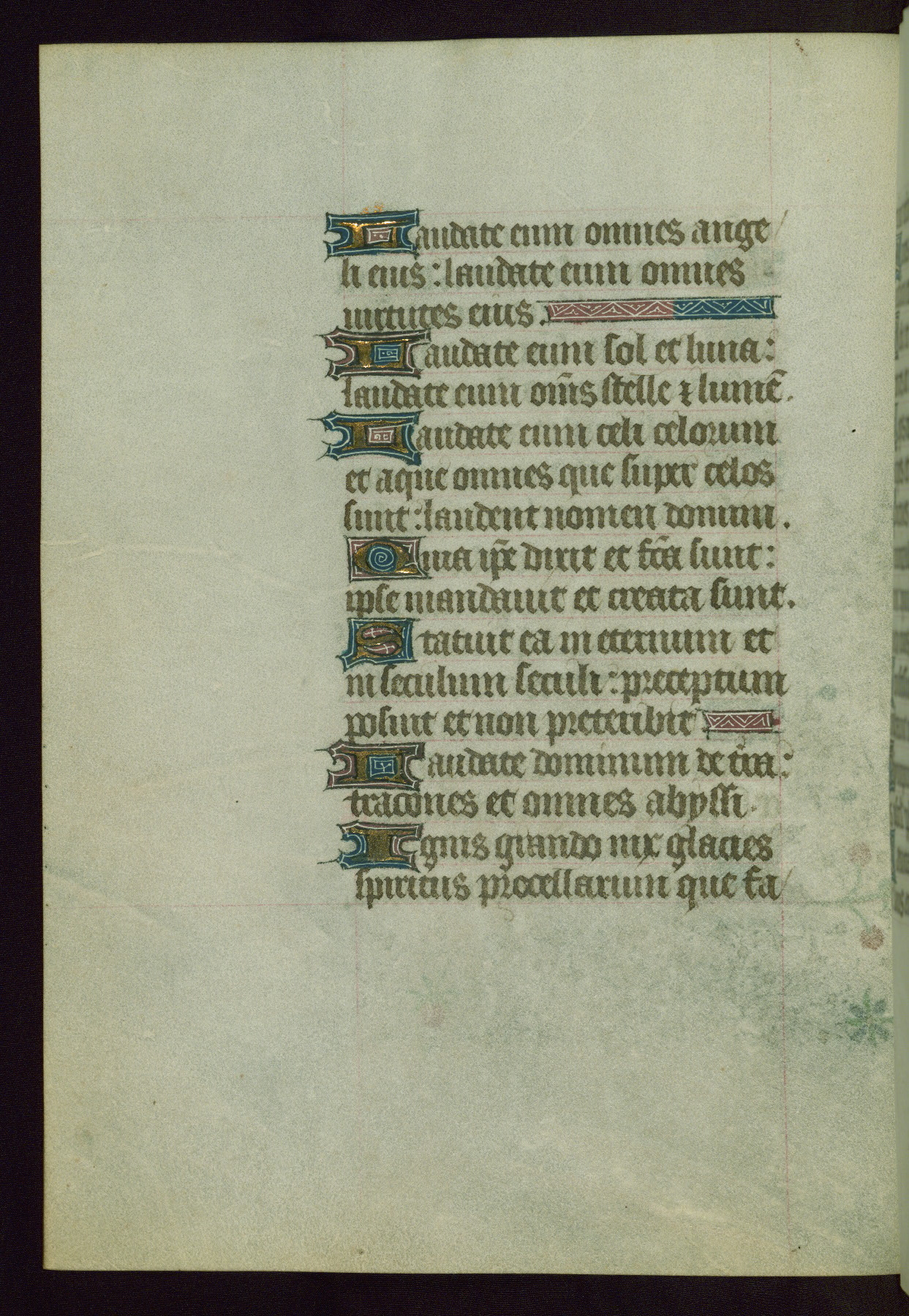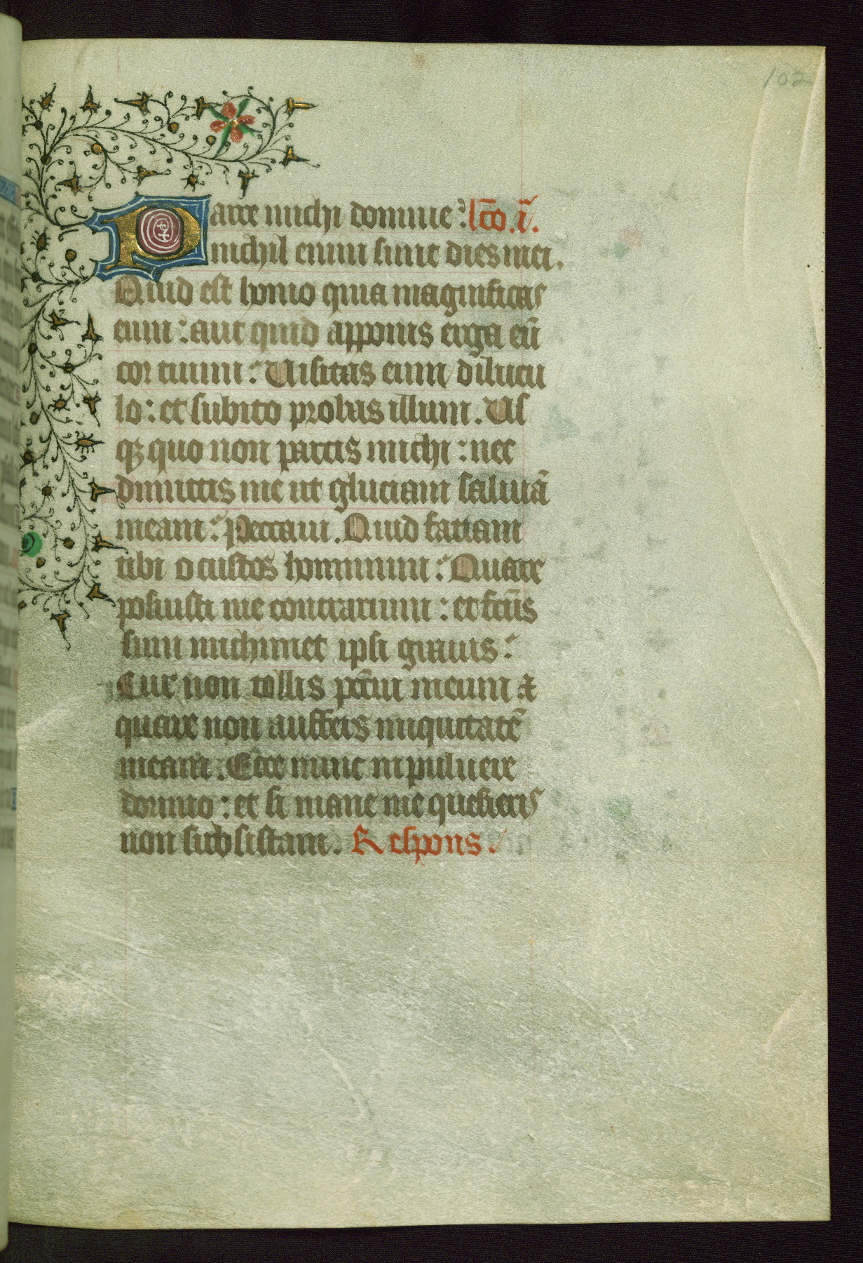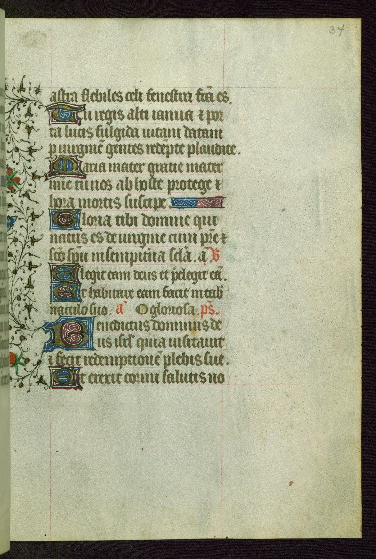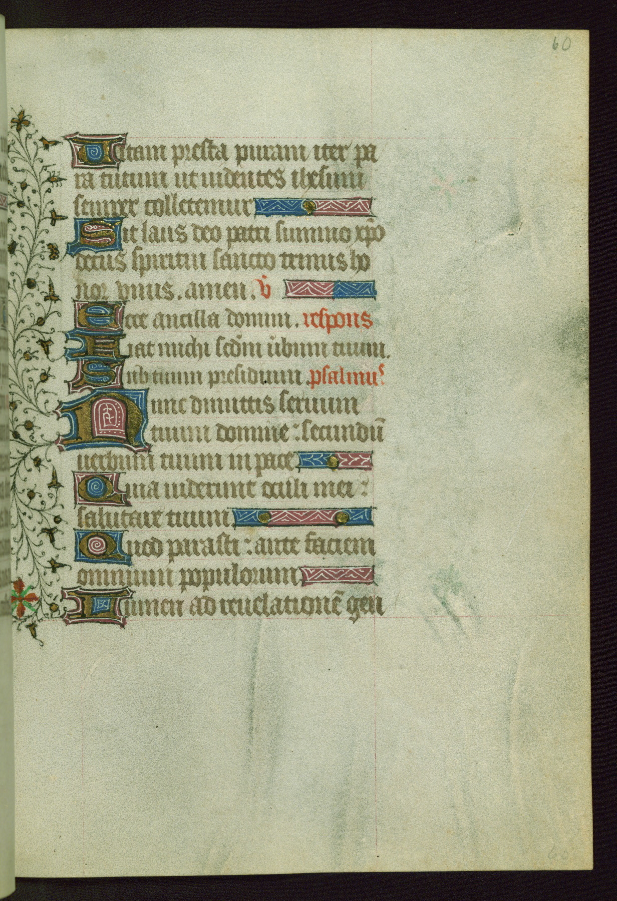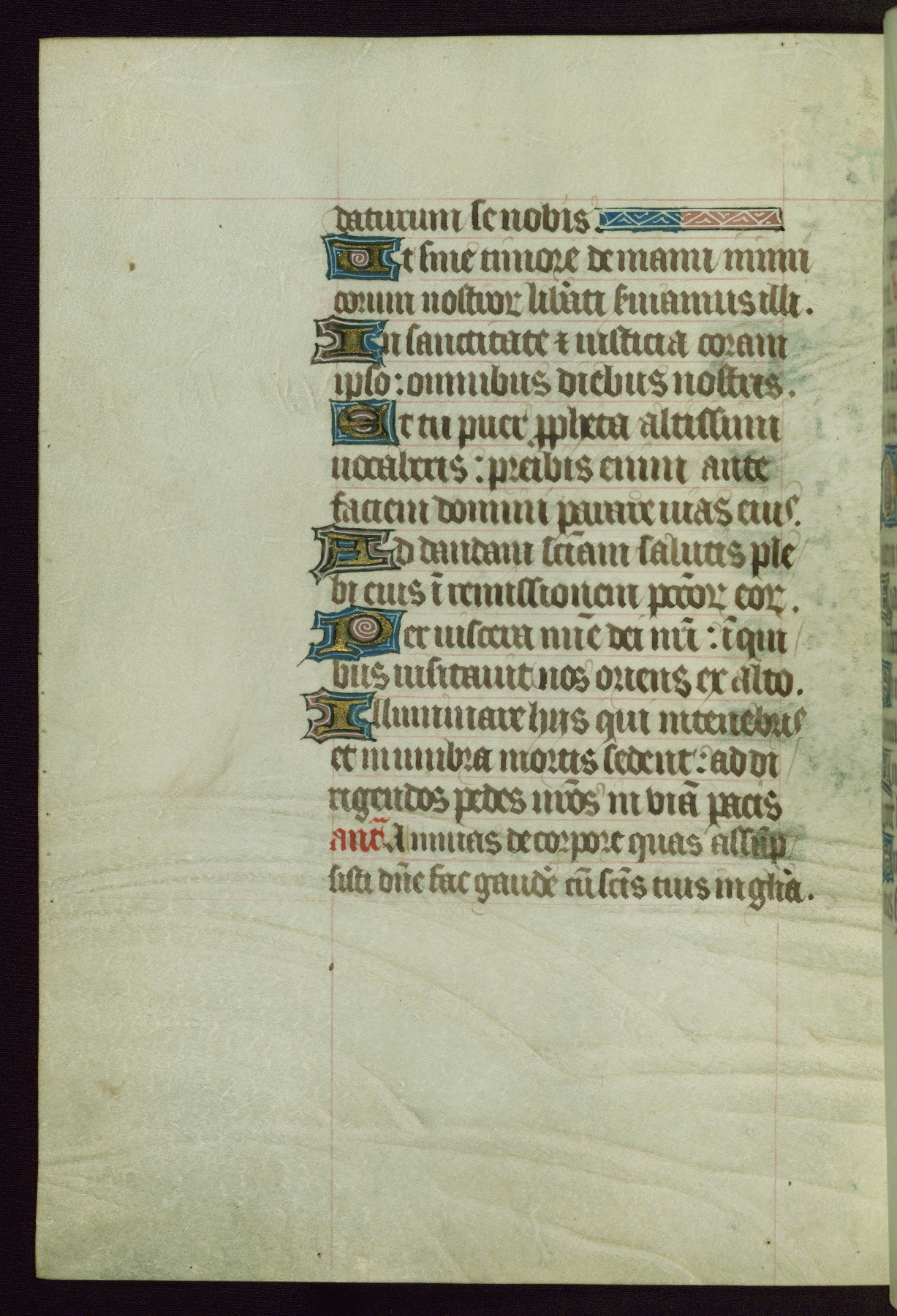 This Book of Hours was created ca. 1435-1440 in Amiens by artists from the circle of the Master of W.281 (Randall, cat. 112) for a female patron depicted on fol. 135r. The manuscript contains fourteen miniatures and is localized to Amiens by the contents of the calendar and litany, which include many saints particular to that region. Quire 12 (fols. 82-89) is misbound with quire 13 (fols. 90-97), with Suffrages and the Seven Verses of St. Bernard (fols. 82-89) intended to be after the Office of the Dead (fols. 90-128), as evinced by the location of the rubric for the Office of the Dead on fol. 81v.