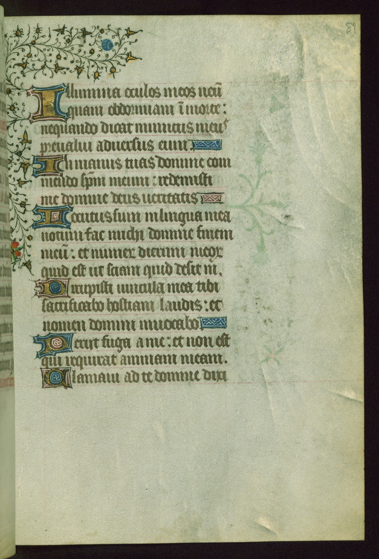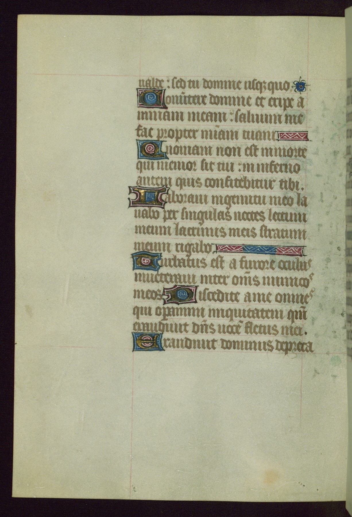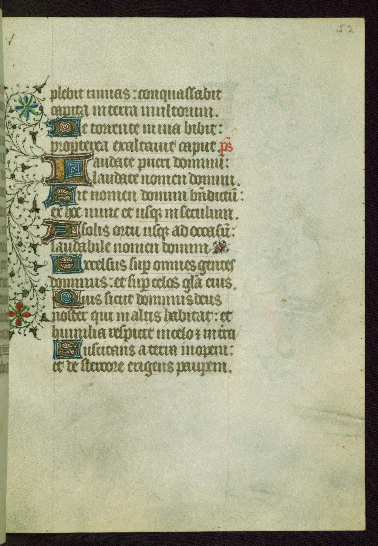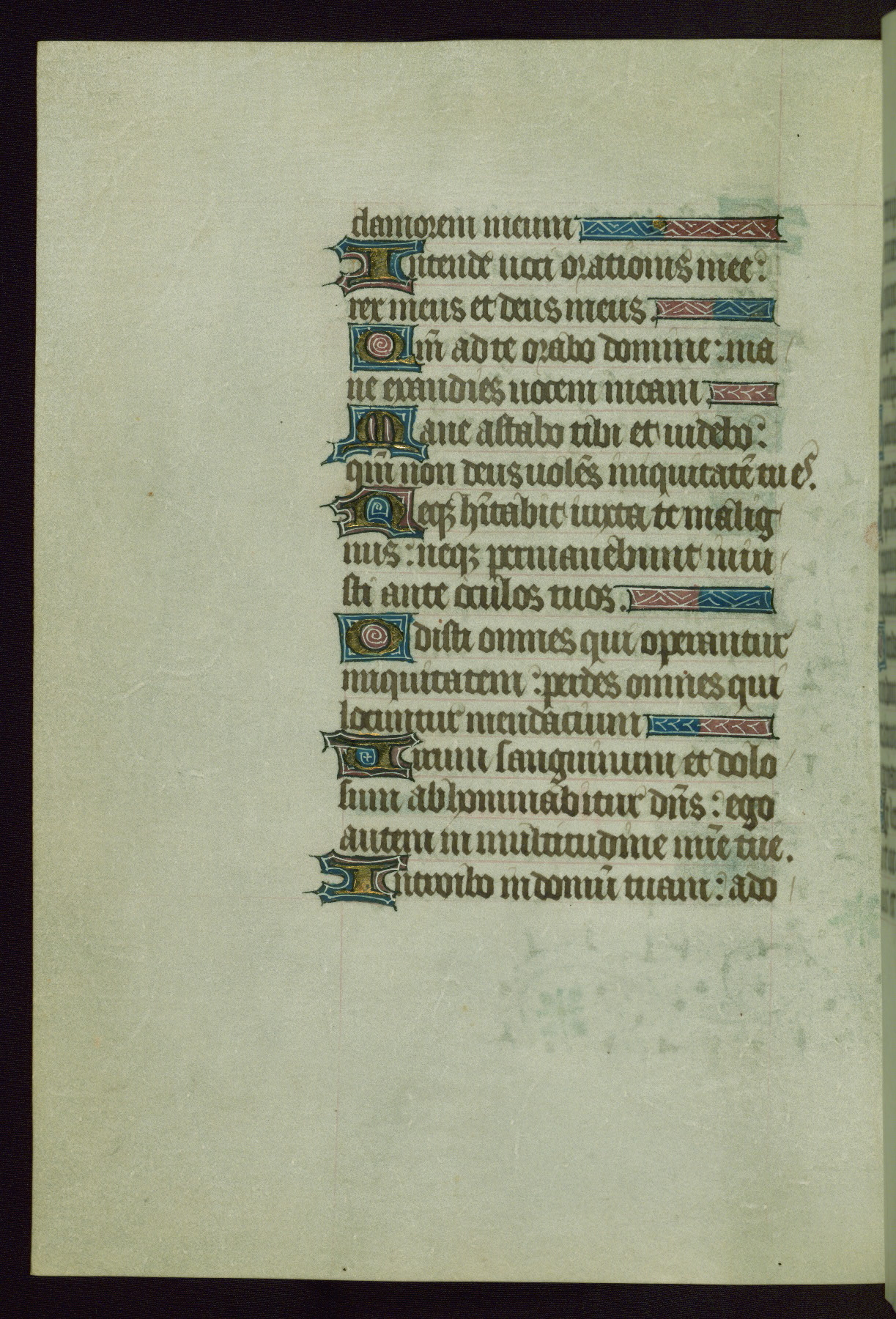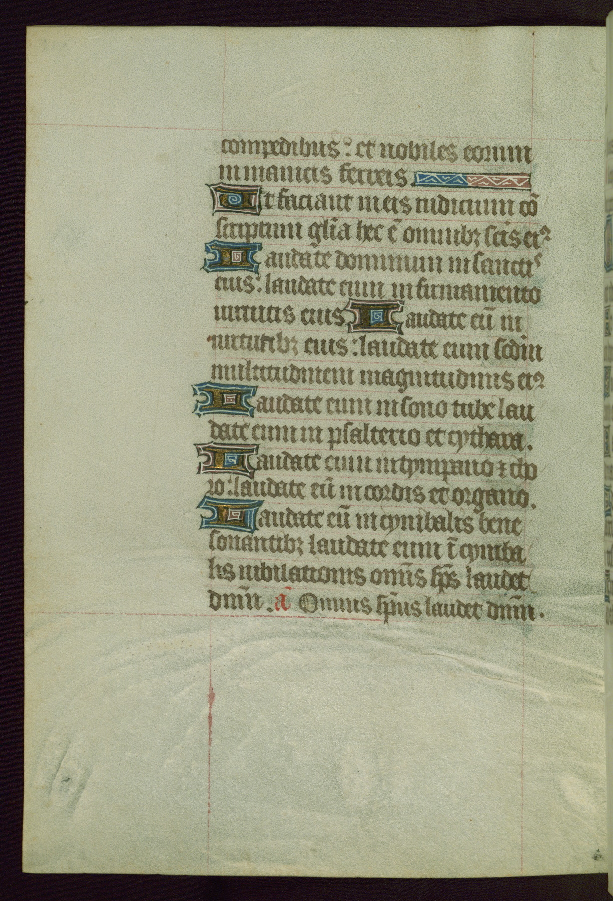 This Book of Hours was created ca. 1435-1440 in Amiens by artists from the circle of the Master of W.281 (Randall, cat. 112) for a female patron depicted on fol. 135r. The manuscript contains fourteen miniatures and is localized to Amiens by the contents of the calendar and litany, which include many saints particular to that region. Quire 12 (fols. 82-89) is misbound with quire 13 (fols. 90-97), with Suffrages and the Seven Verses of St. Bernard (fols. 82-89) intended to be after the Office of the Dead (fols. 90-128), as evinced by the location of the rubric for the Office of the Dead on fol. 81v.