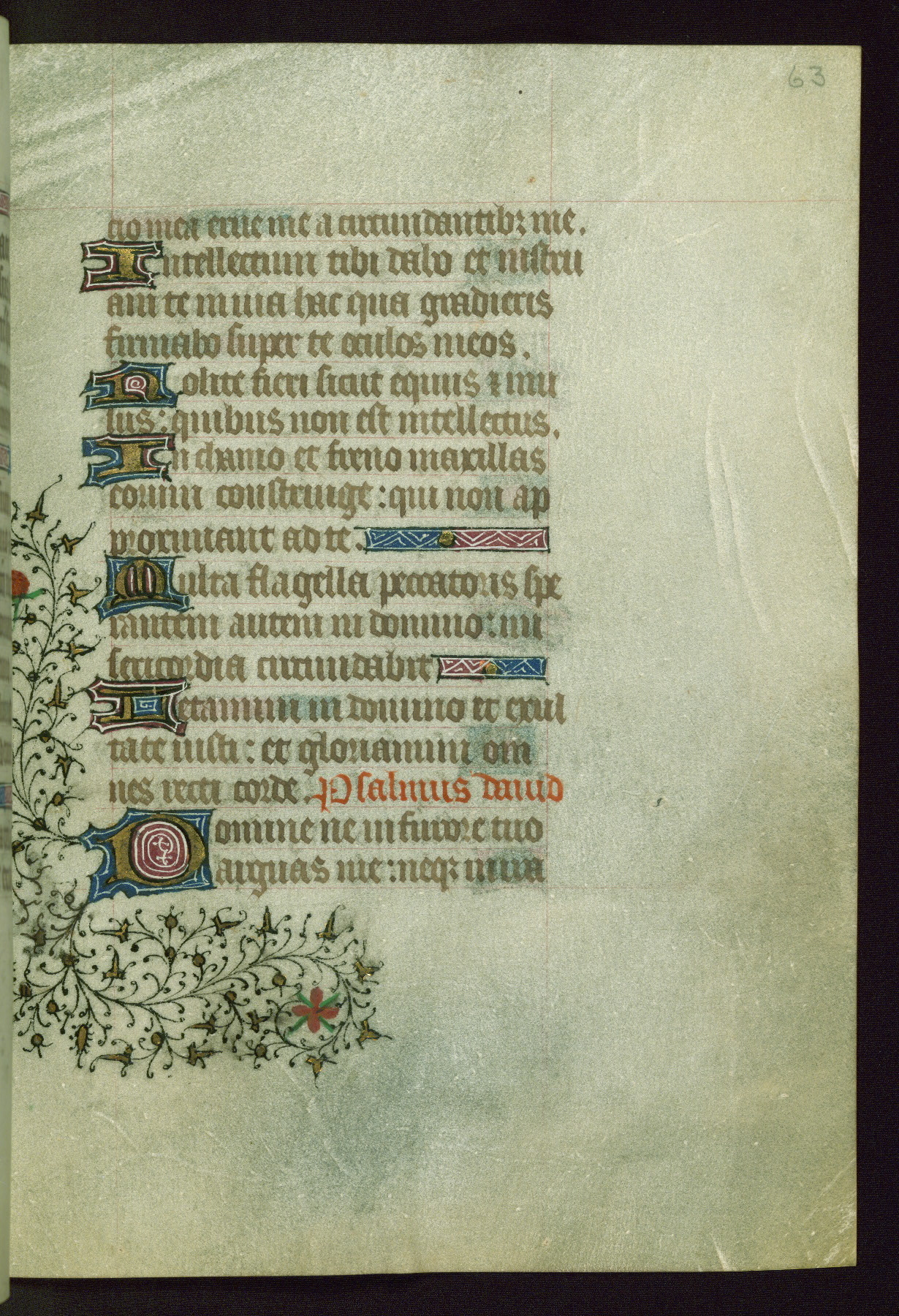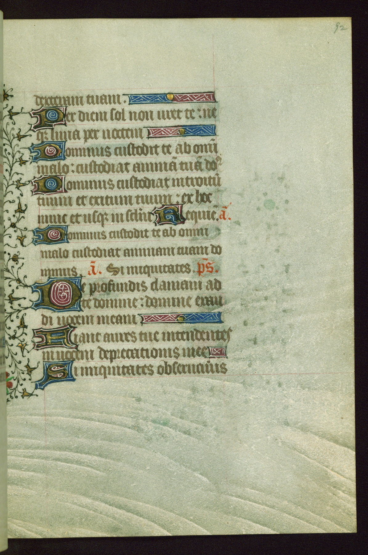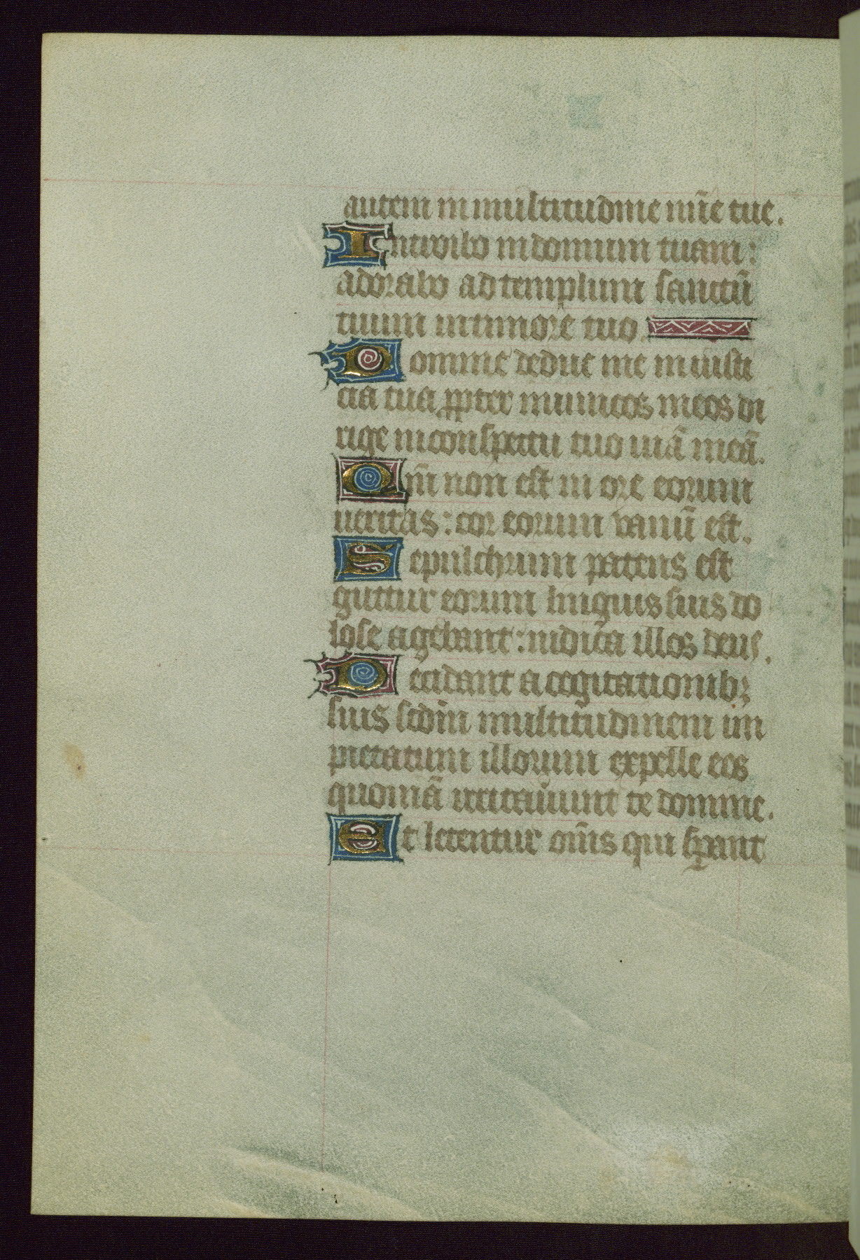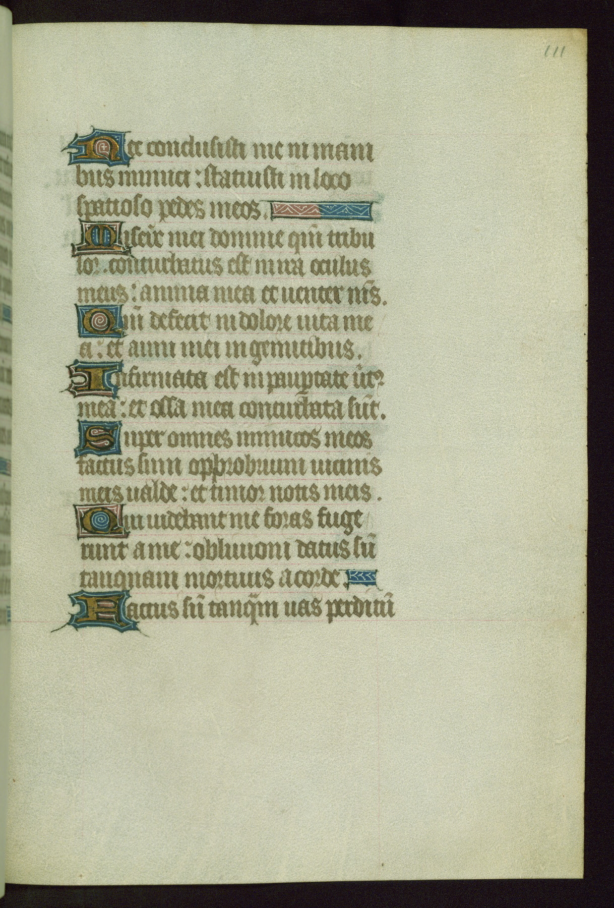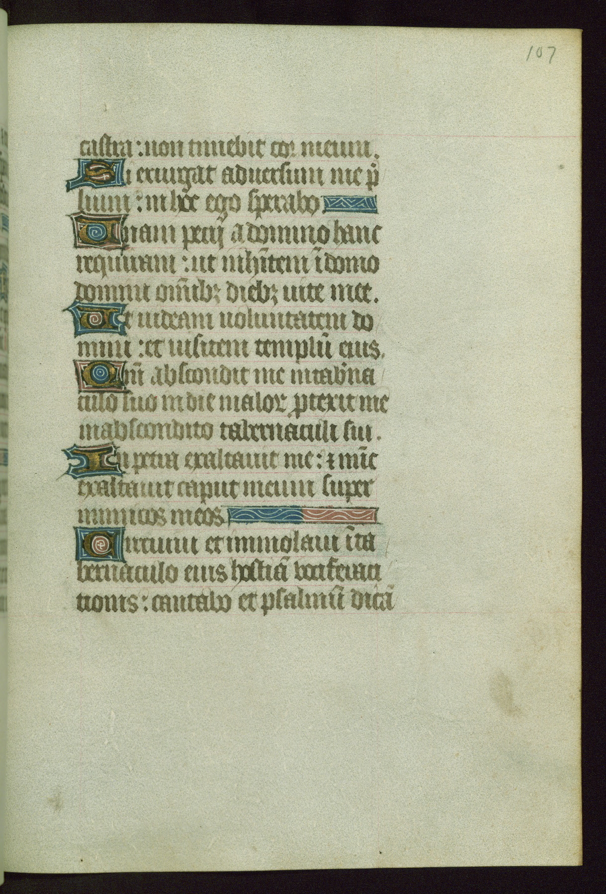 This Book of Hours was created ca. 1435-1440 in Amiens by artists from the circle of the Master of W.281 (Randall, cat. 112) for a female patron depicted on fol. 135r. The manuscript contains fourteen miniatures and is localized to Amiens by the contents of the calendar and litany, which include many saints particular to that region. Quire 12 (fols. 82-89) is misbound with quire 13 (fols. 90-97), with Suffrages and the Seven Verses of St. Bernard (fols. 82-89) intended to be after the Office of the Dead (fols. 90-128), as evinced by the location of the rubric for the Office of the Dead on fol. 81v.