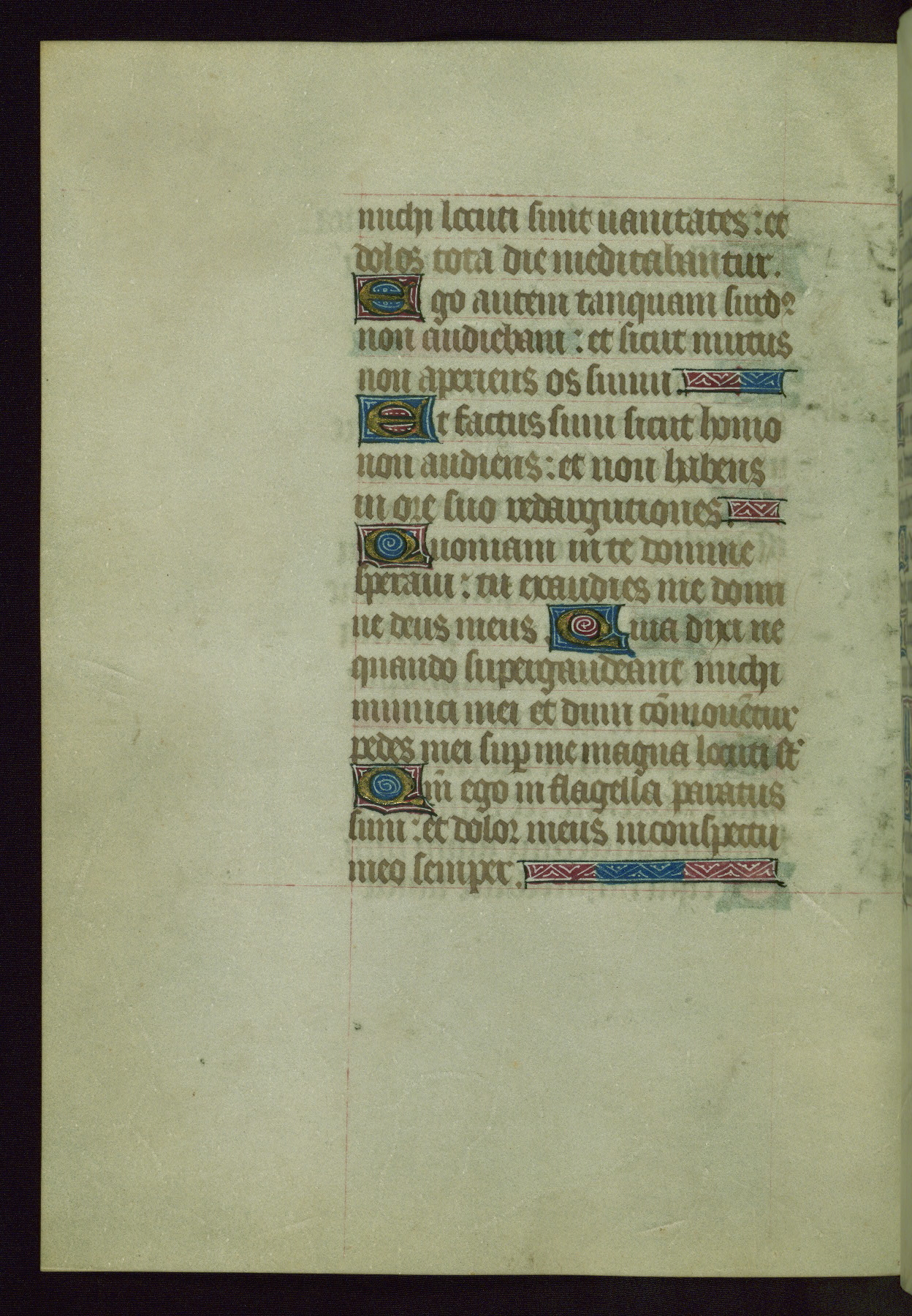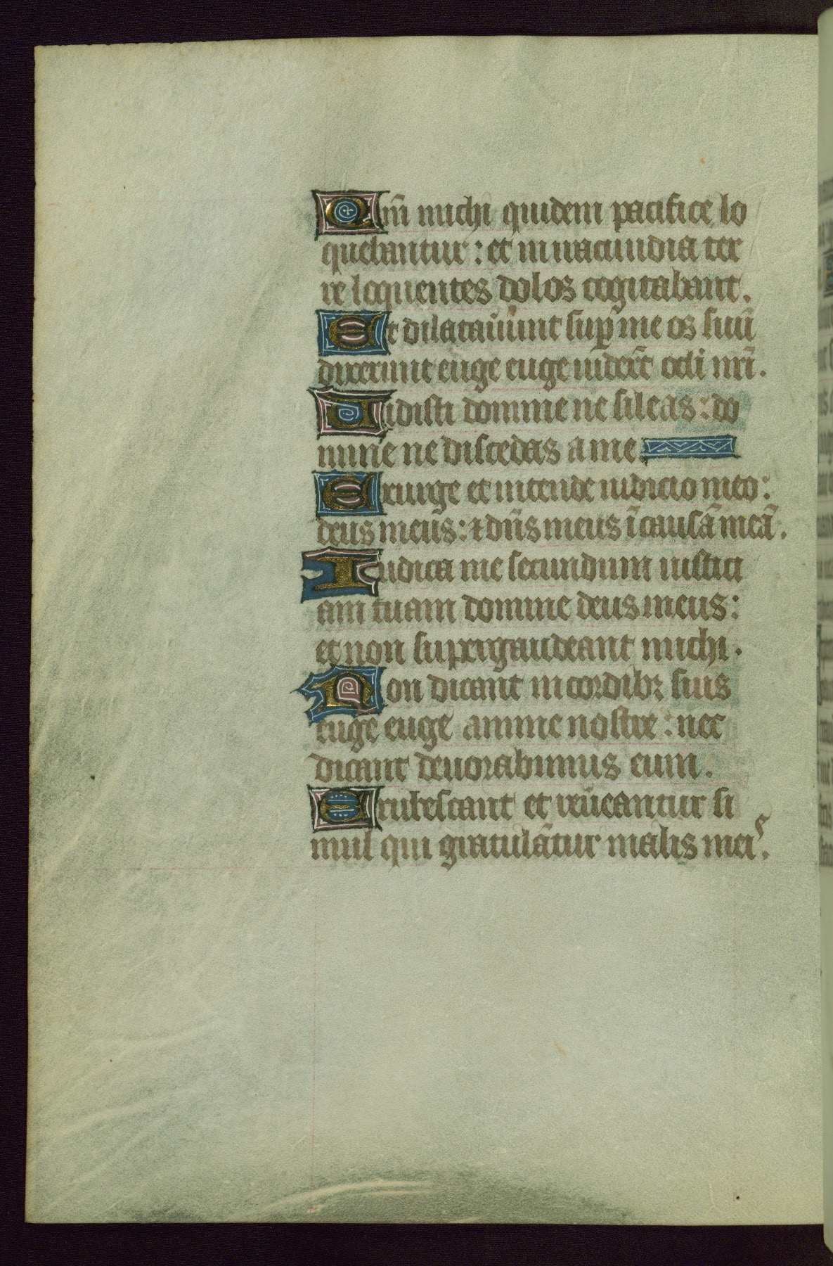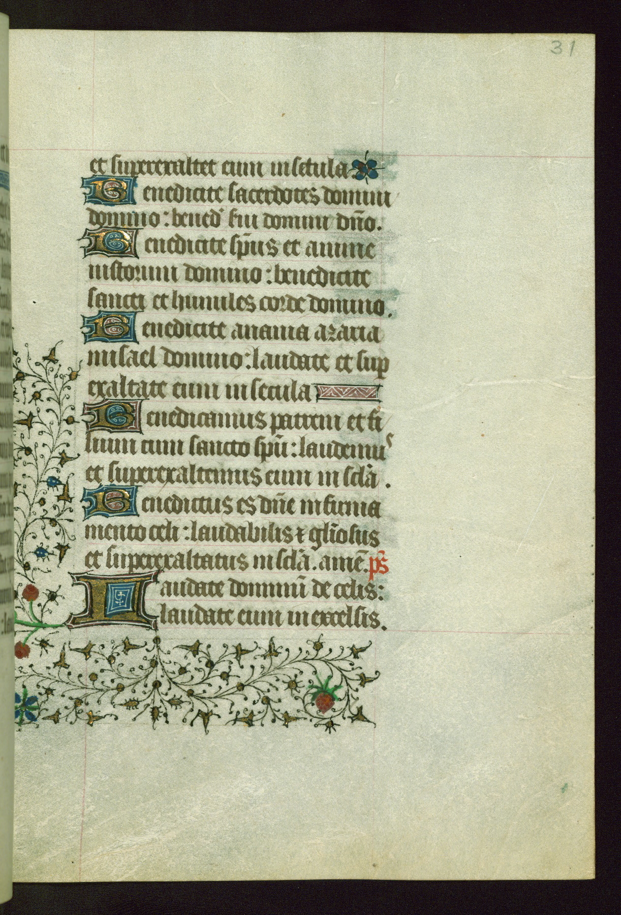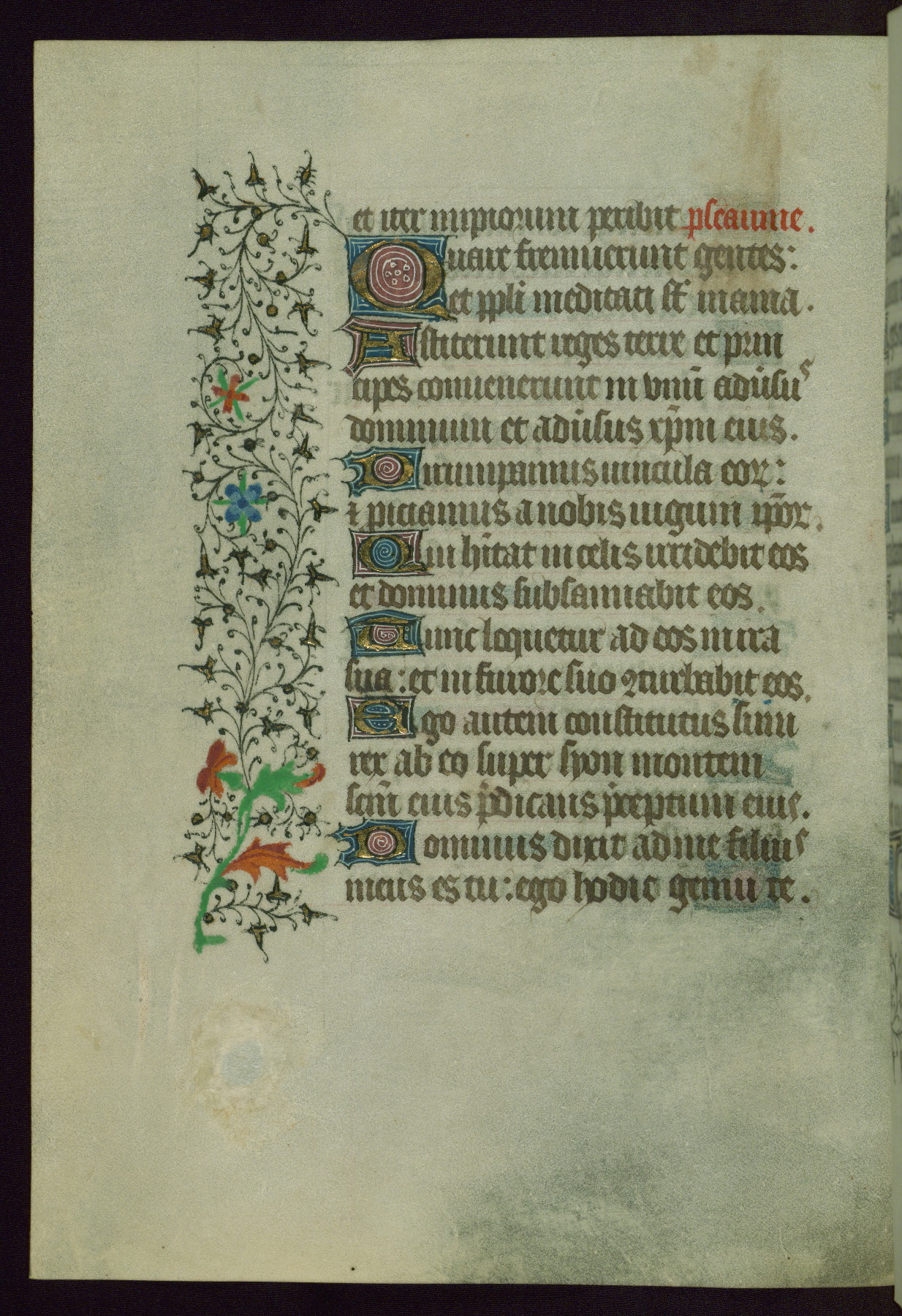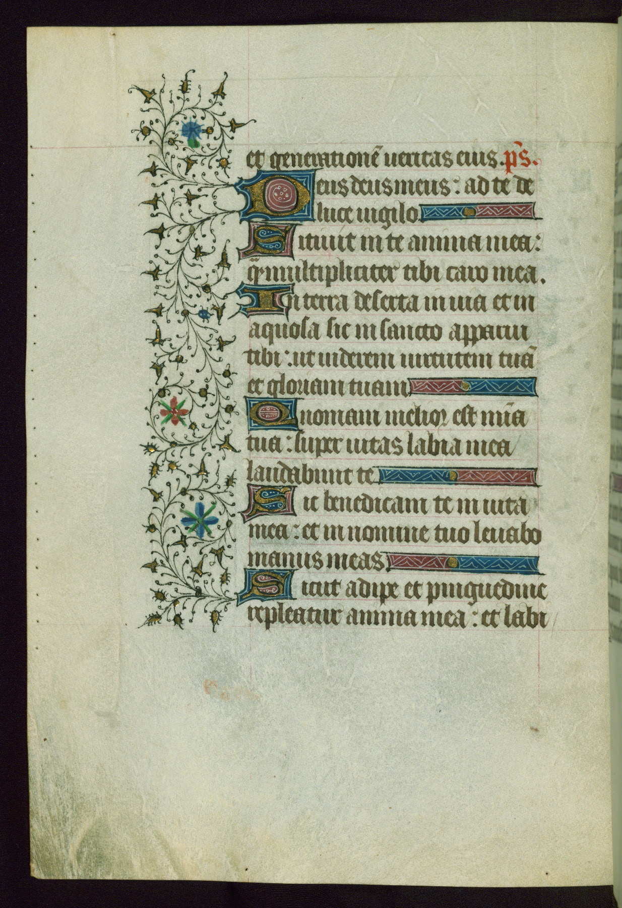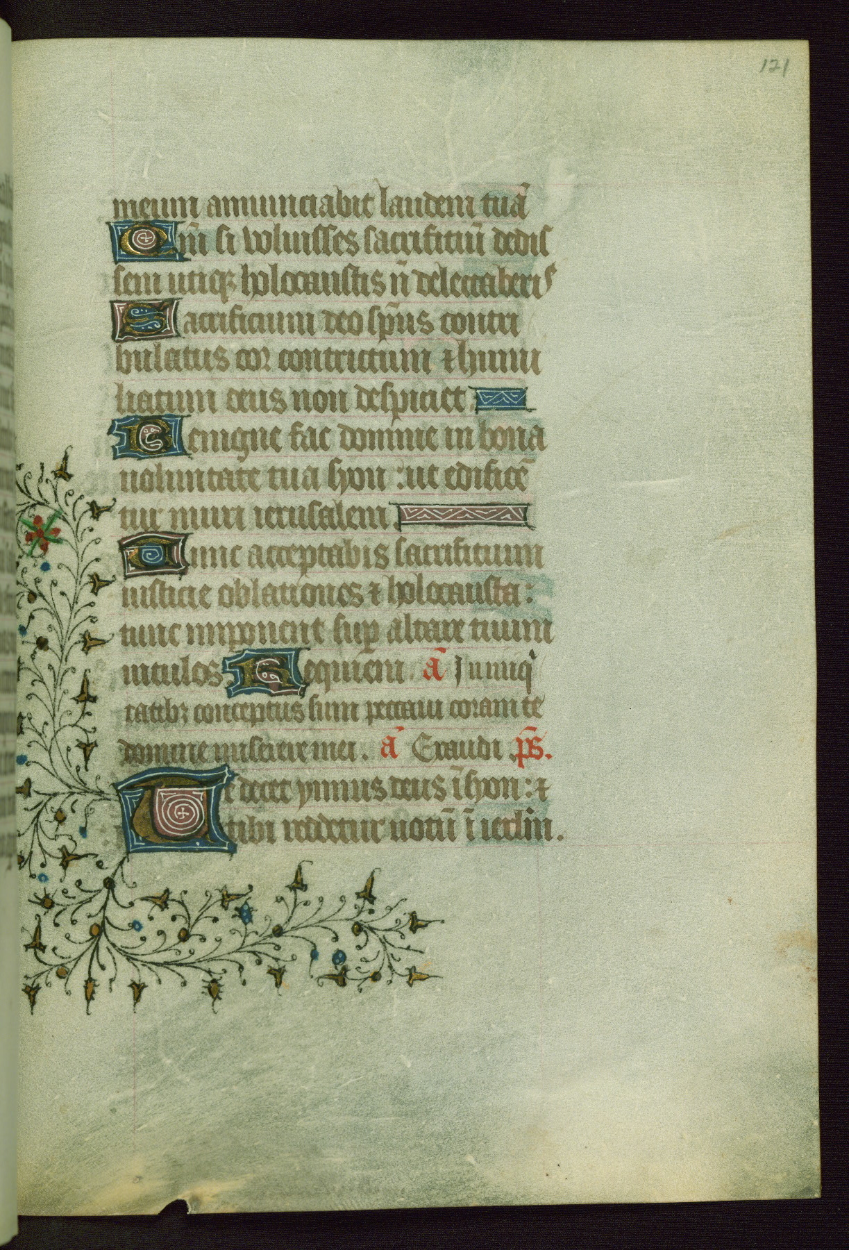 This Book of Hours was created ca. 1435-1440 in Amiens by artists from the circle of the Master of W.281 (Randall, cat. 112) for a female patron depicted on fol. 135r. The manuscript contains fourteen miniatures and is localized to Amiens by the contents of the calendar and litany, which include many saints particular to that region. Quire 12 (fols. 82-89) is misbound with quire 13 (fols. 90-97), with Suffrages and the Seven Verses of St. Bernard (fols. 82-89) intended to be after the Office of the Dead (fols. 90-128), as evinced by the location of the rubric for the Office of the Dead on fol. 81v.