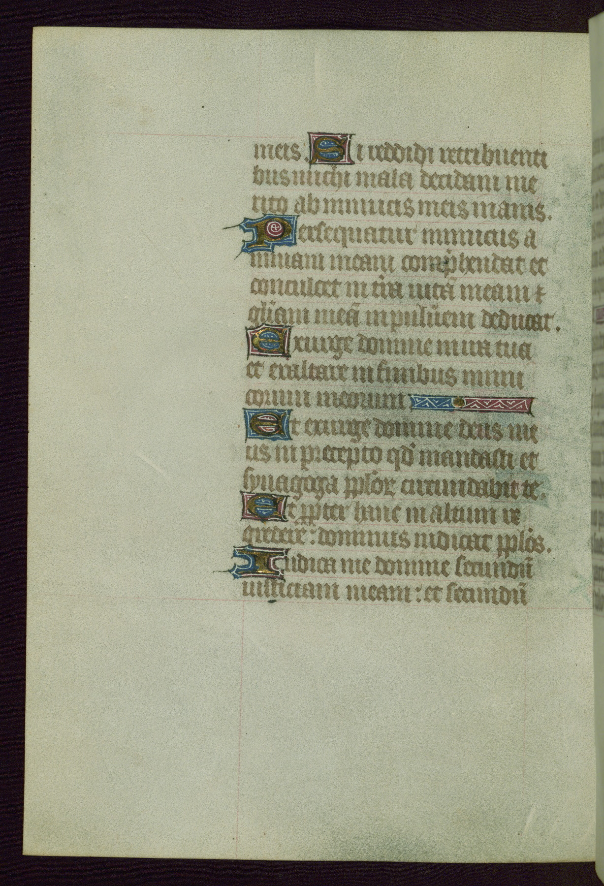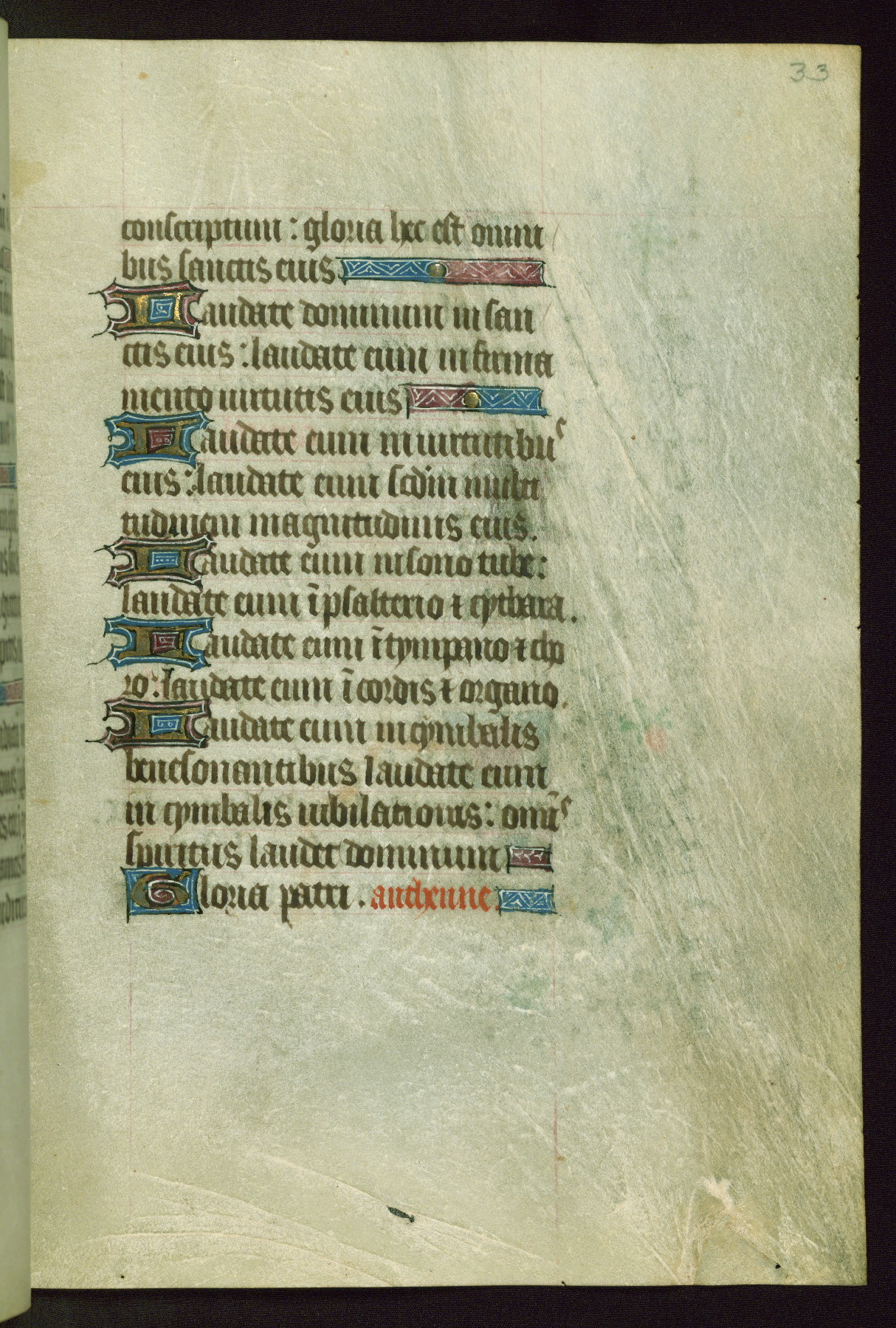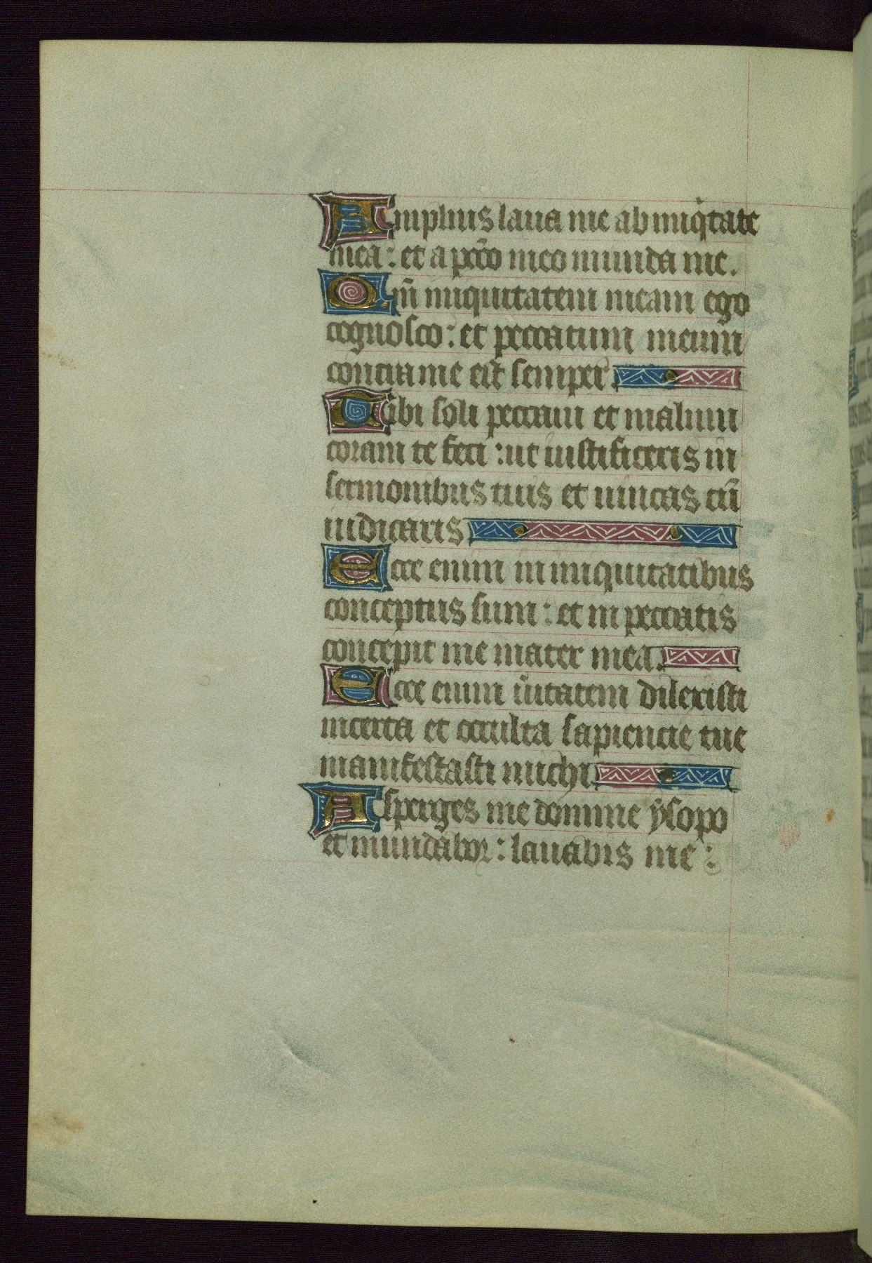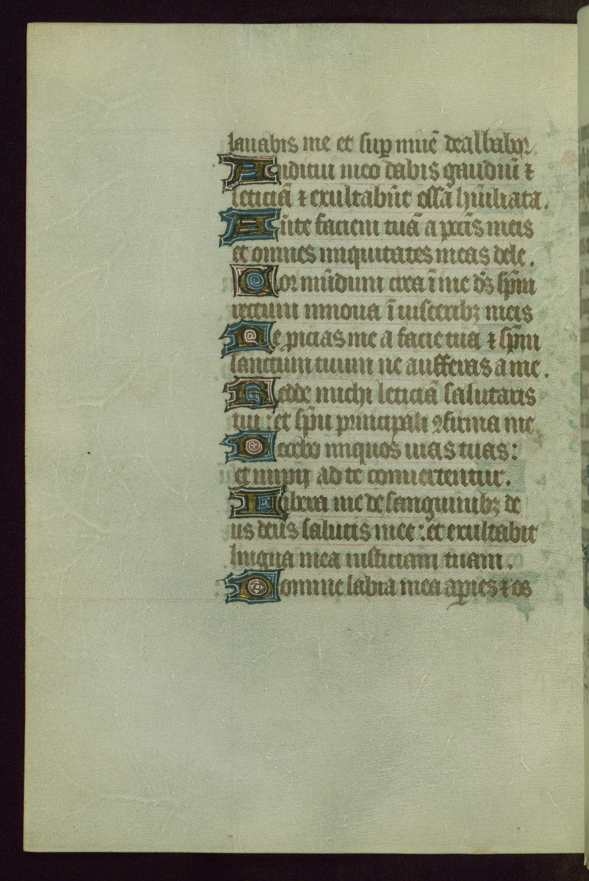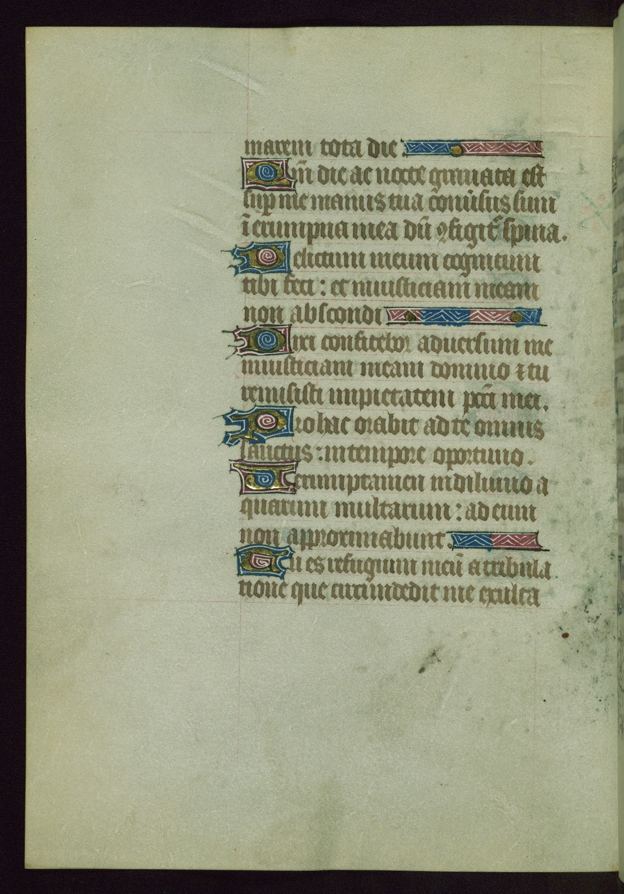 This Book of Hours was created ca. 1435-1440 in Amiens by artists from the circle of the Master of W.281 (Randall, cat. 112) for a female patron depicted on fol. 135r. The manuscript contains fourteen miniatures and is localized to Amiens by the contents of the calendar and litany, which include many saints particular to that region. Quire 12 (fols. 82-89) is misbound with quire 13 (fols. 90-97), with Suffrages and the Seven Verses of St. Bernard (fols. 82-89) intended to be after the Office of the Dead (fols. 90-128), as evinced by the location of the rubric for the Office of the Dead on fol. 81v.