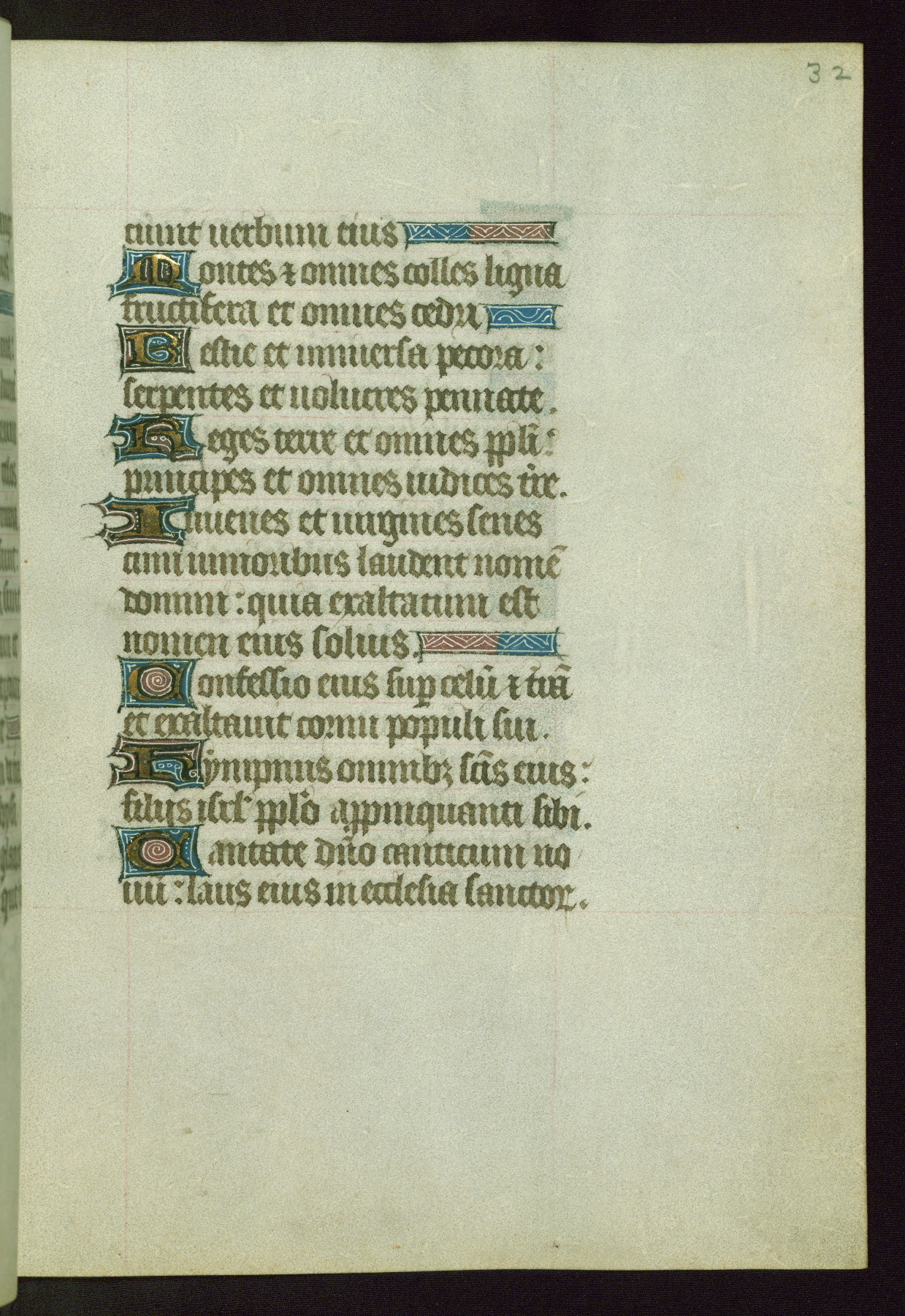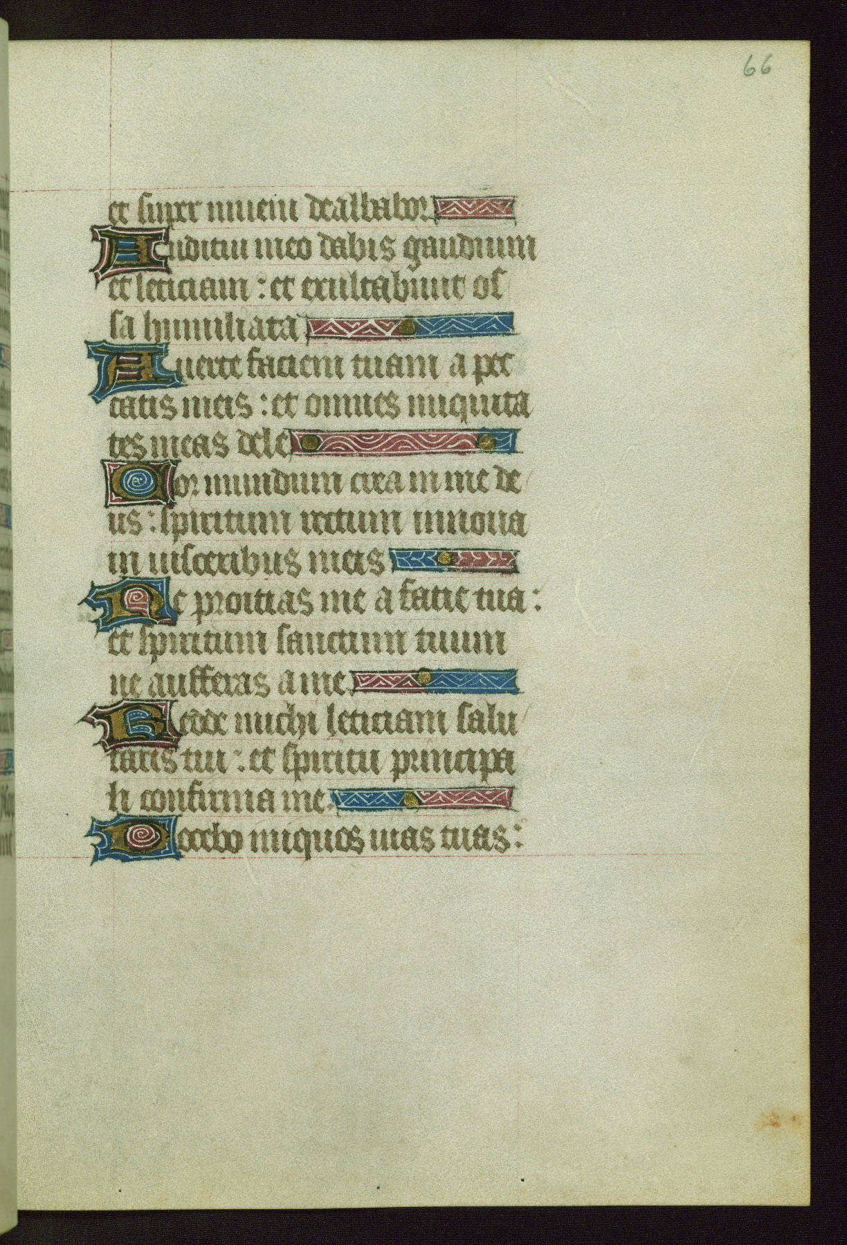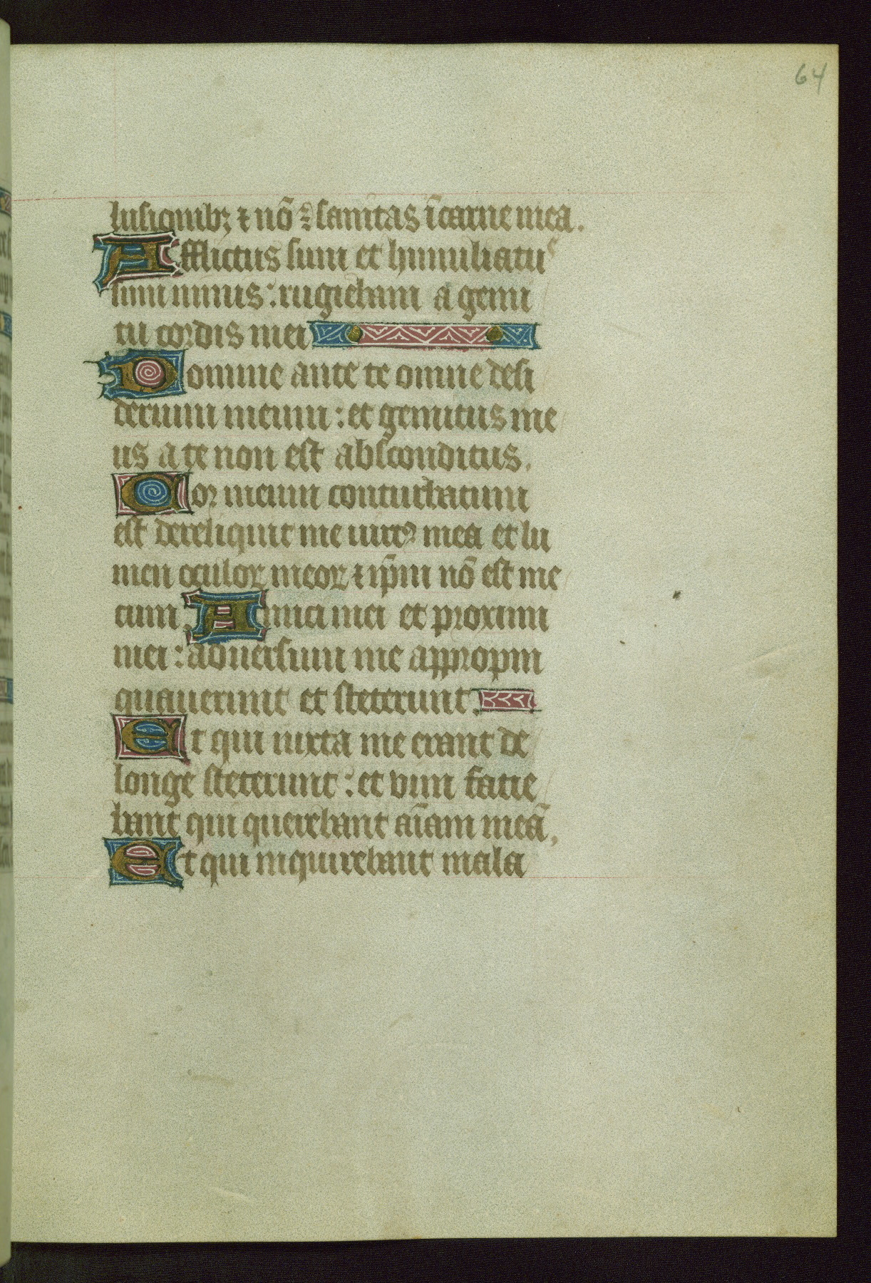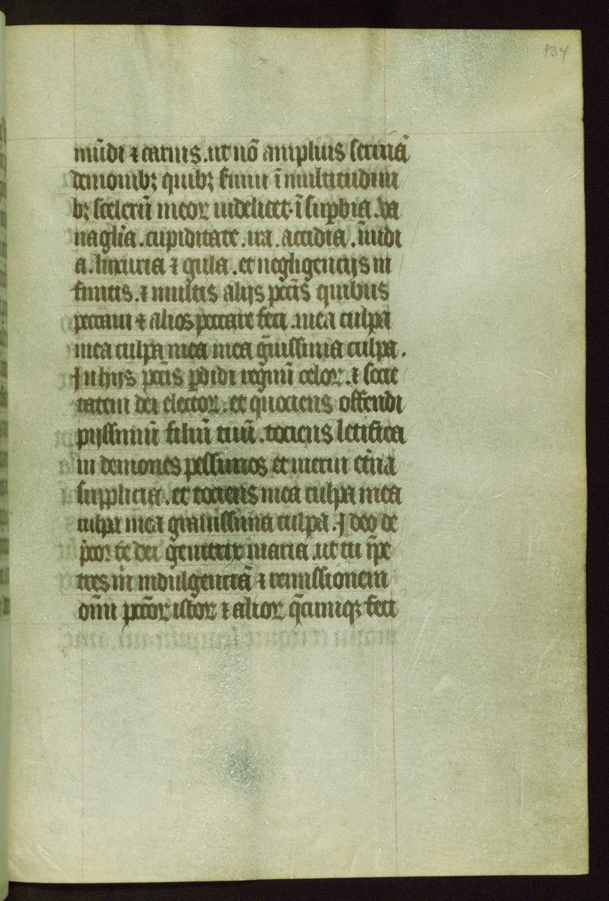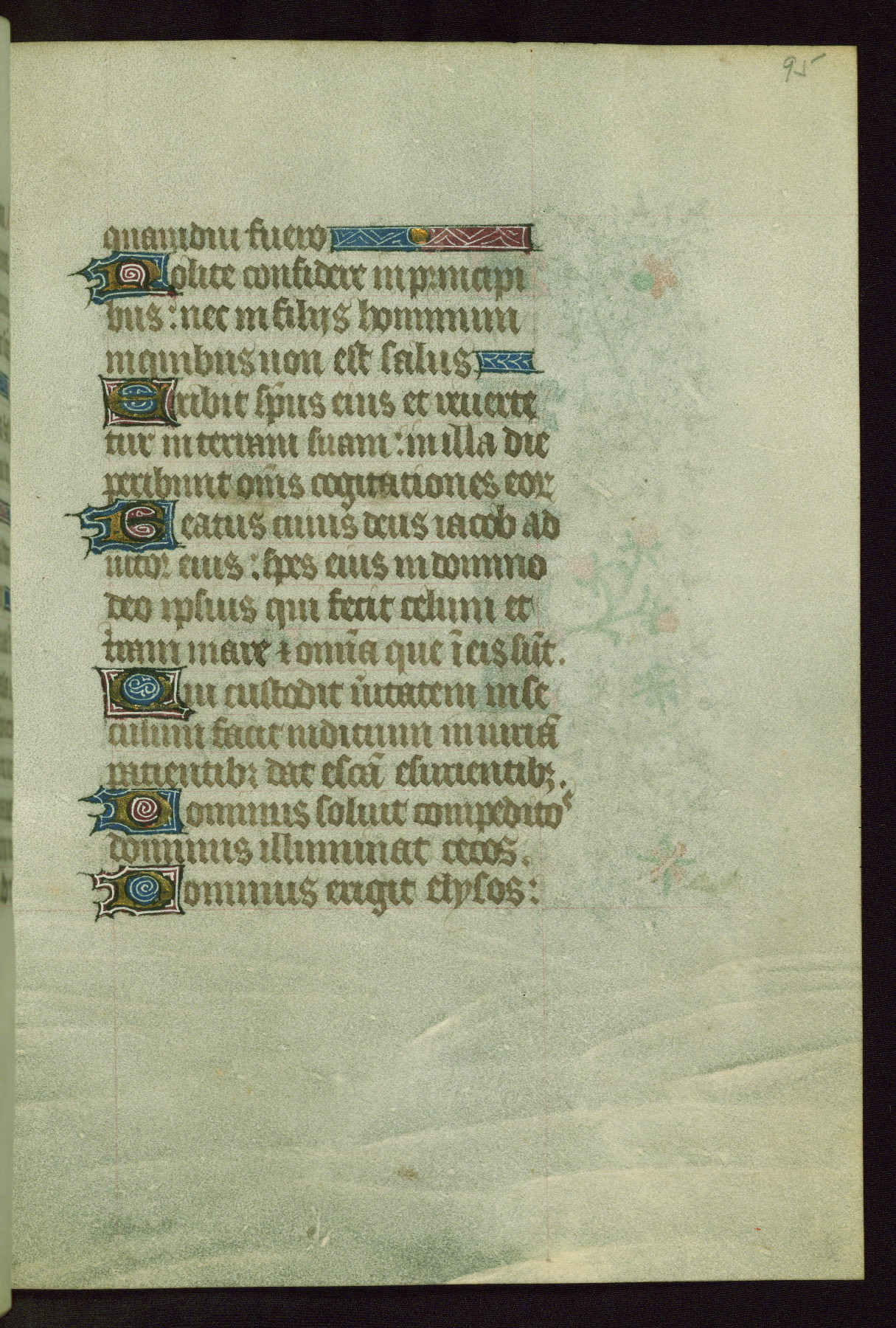 This Book of Hours was created ca. 1435-1440 in Amiens by artists from the circle of the Master of W.281 (Randall, cat. 112) for a female patron depicted on fol. 135r. The manuscript contains fourteen miniatures and is localized to Amiens by the contents of the calendar and litany, which include many saints particular to that region. Quire 12 (fols. 82-89) is misbound with quire 13 (fols. 90-97), with Suffrages and the Seven Verses of St. Bernard (fols. 82-89) intended to be after the Office of the Dead (fols. 90-128), as evinced by the location of the rubric for the Office of the Dead on fol. 81v.