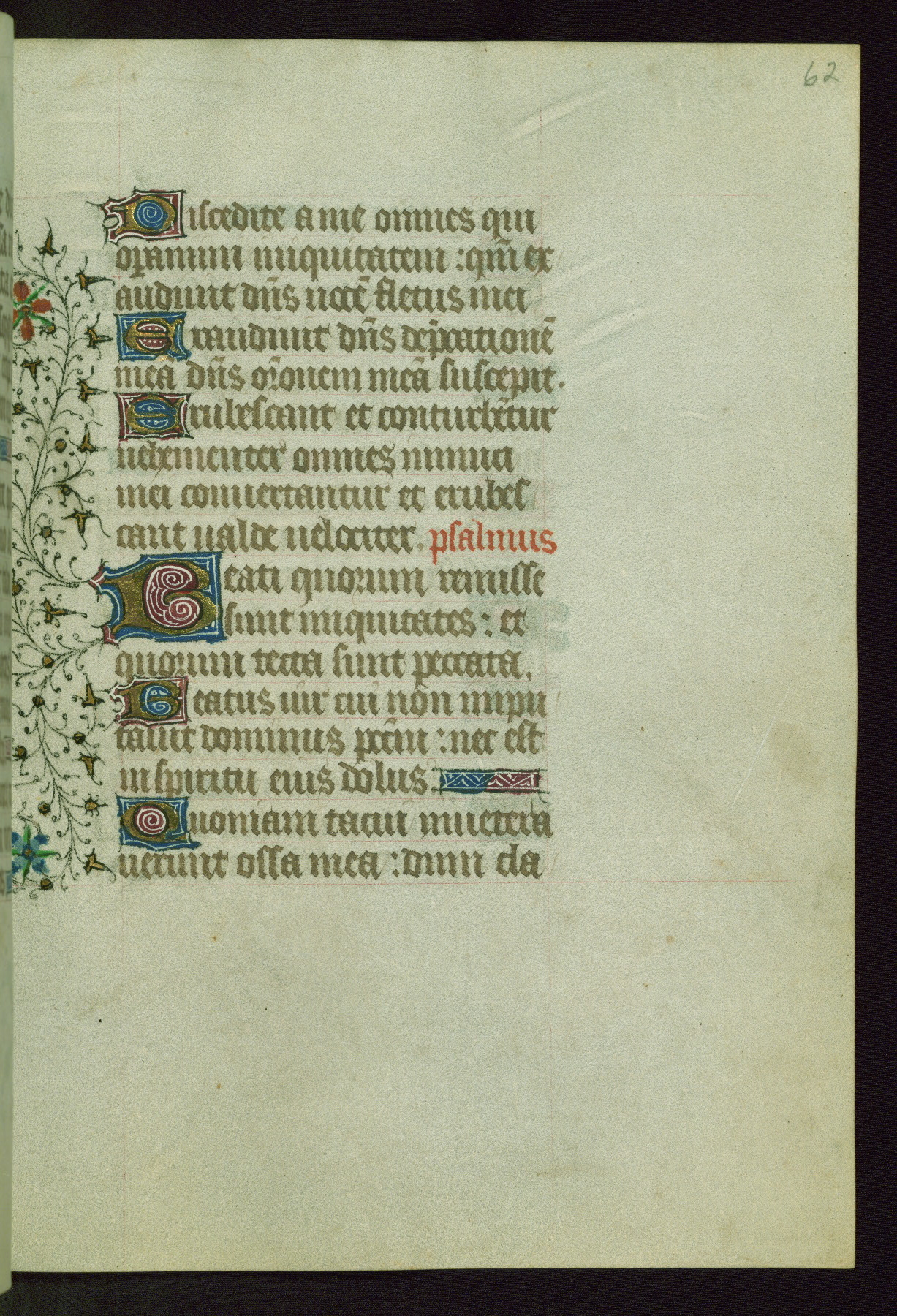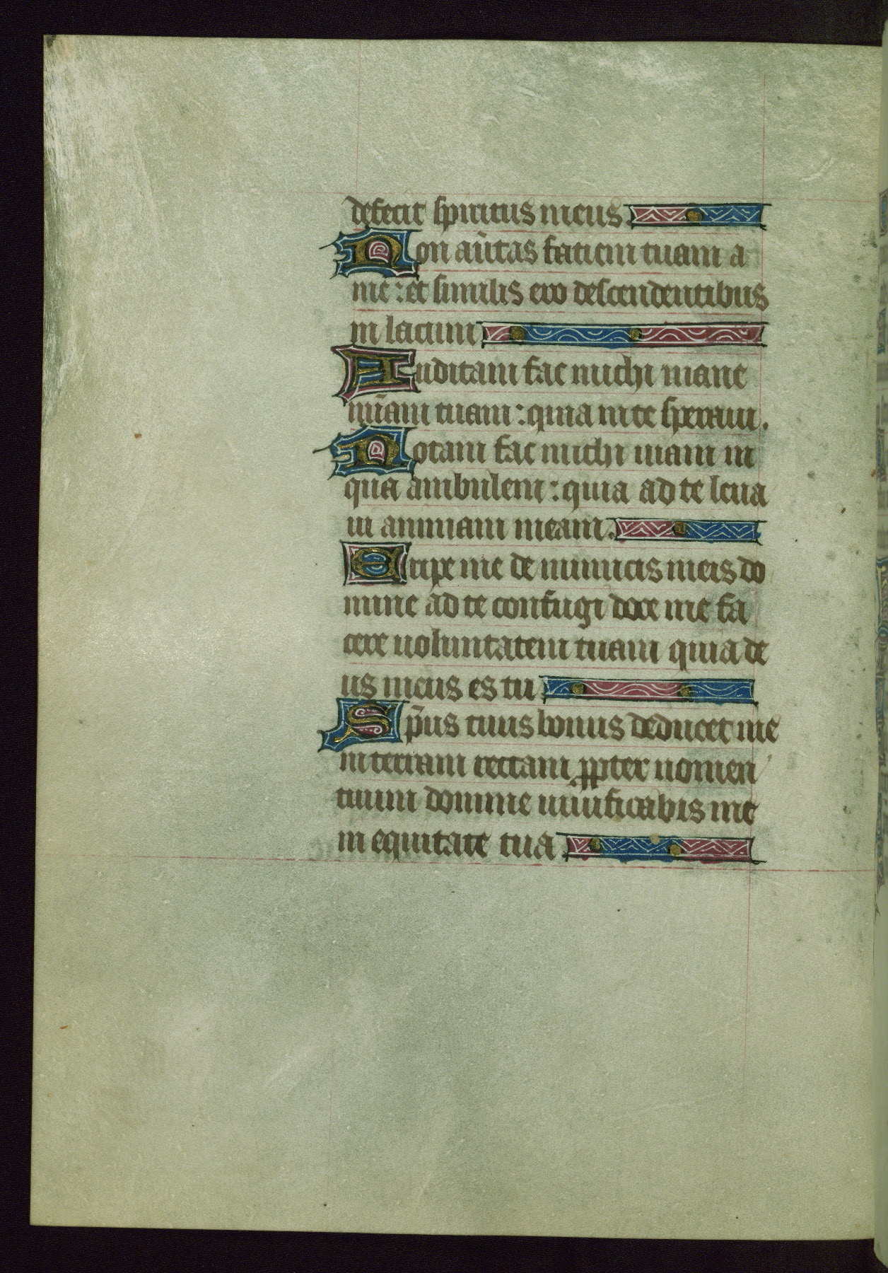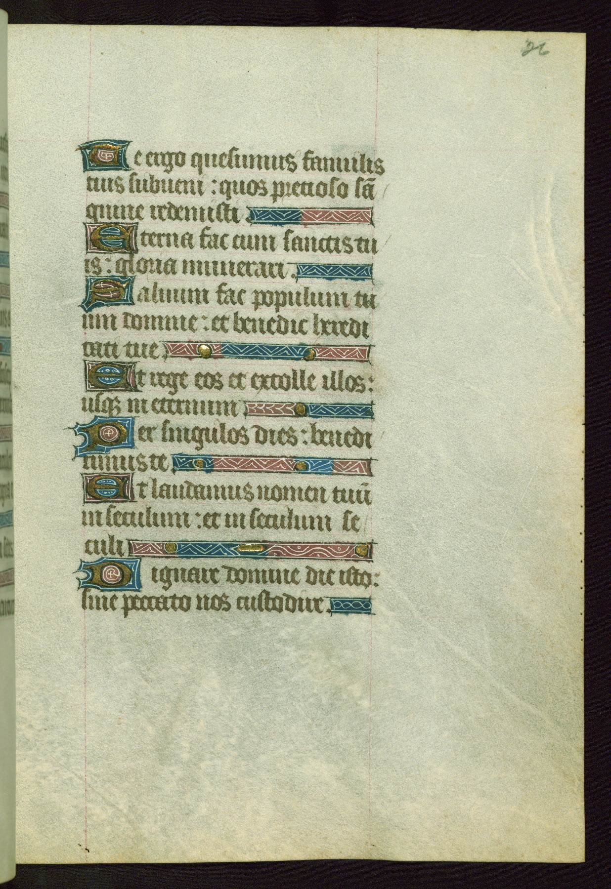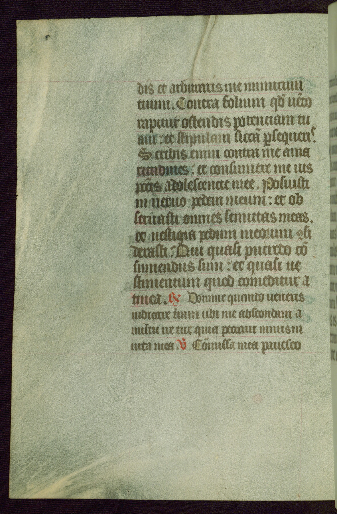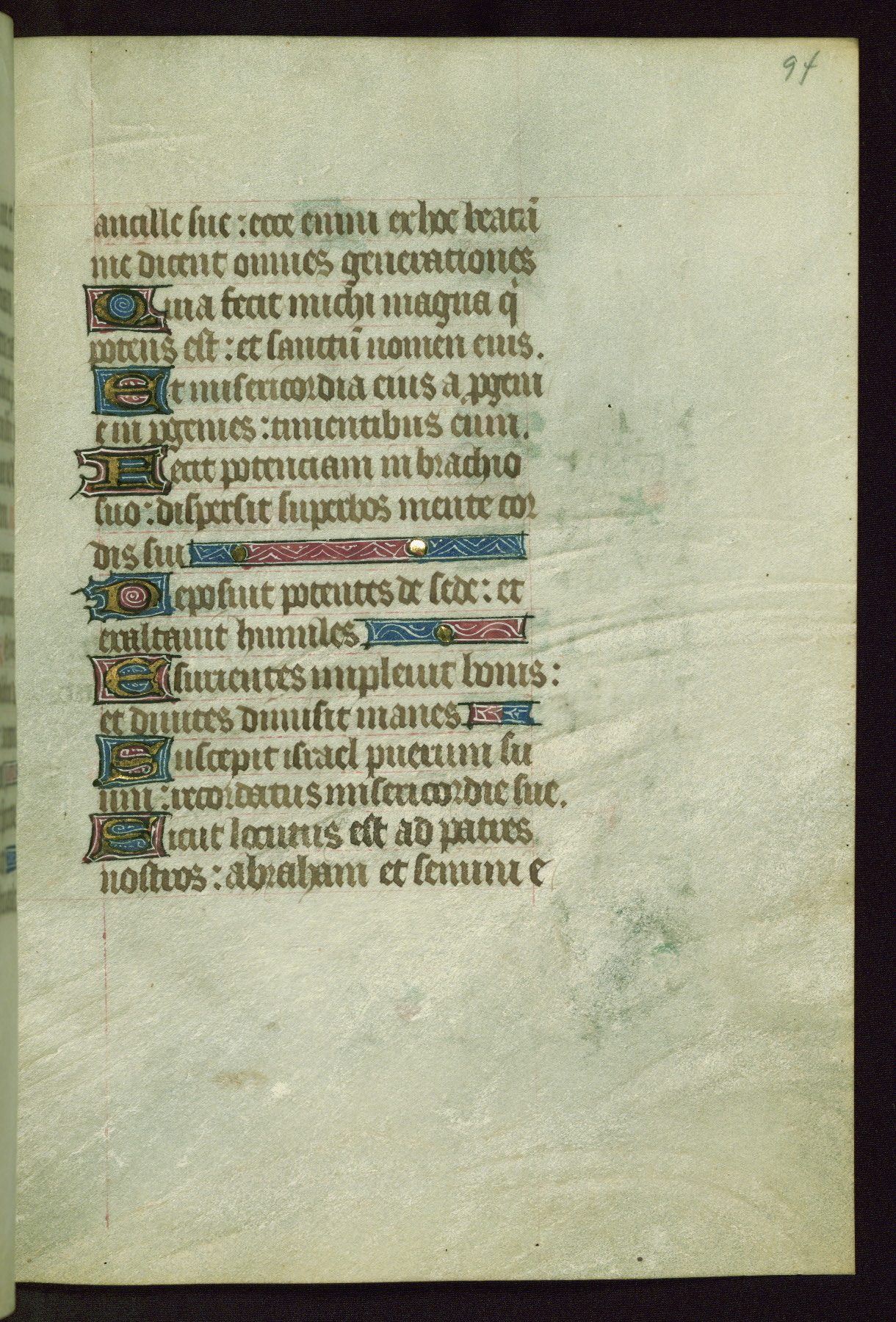 This Book of Hours was created ca. 1435-1440 in Amiens by artists from the circle of the Master of W.281 (Randall, cat. 112) for a female patron depicted on fol. 135r. The manuscript contains fourteen miniatures and is localized to Amiens by the contents of the calendar and litany, which include many saints particular to that region. Quire 12 (fols. 82-89) is misbound with quire 13 (fols. 90-97), with Suffrages and the Seven Verses of St. Bernard (fols. 82-89) intended to be after the Office of the Dead (fols. 90-128), as evinced by the location of the rubric for the Office of the Dead on fol. 81v.
