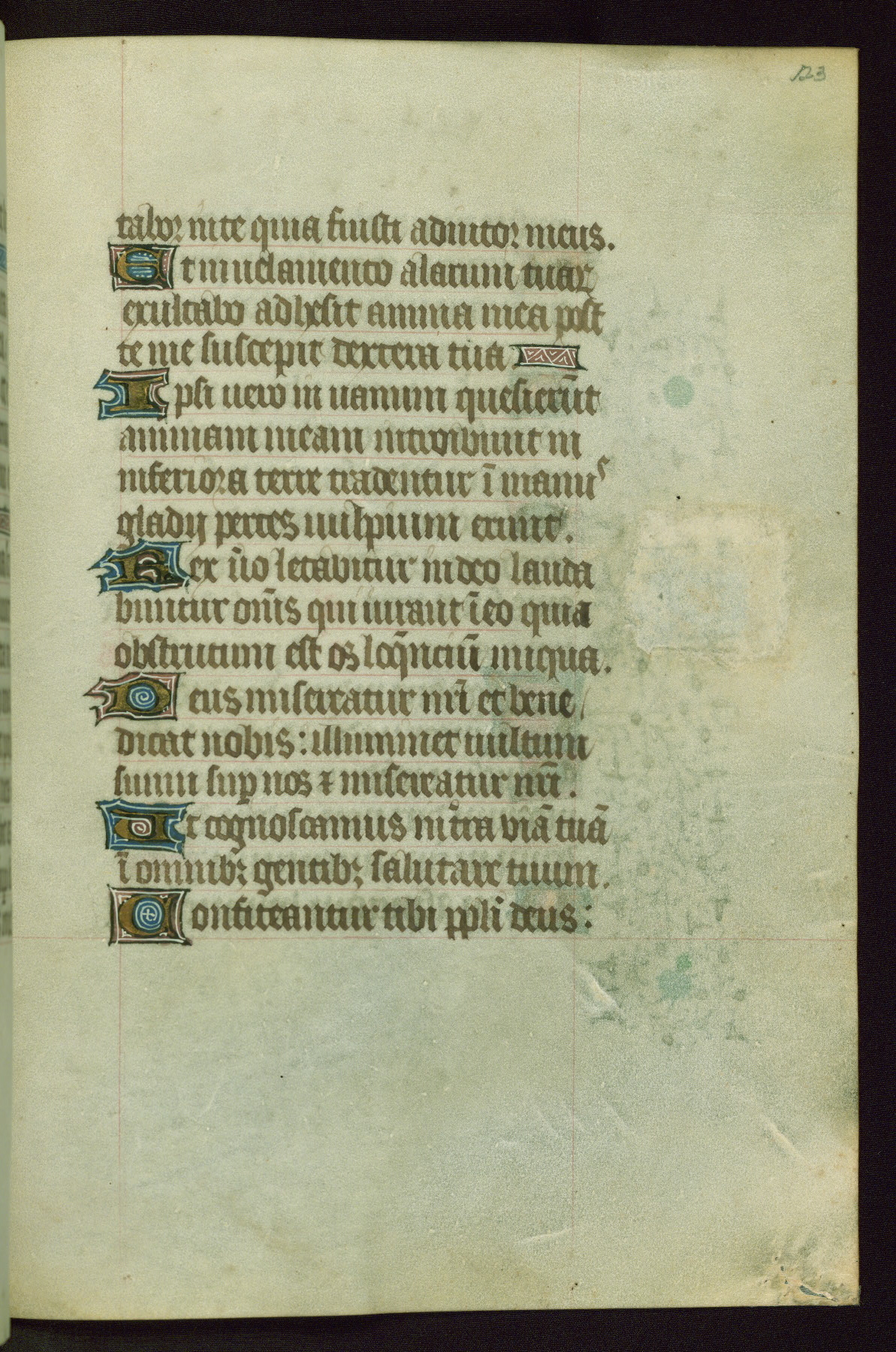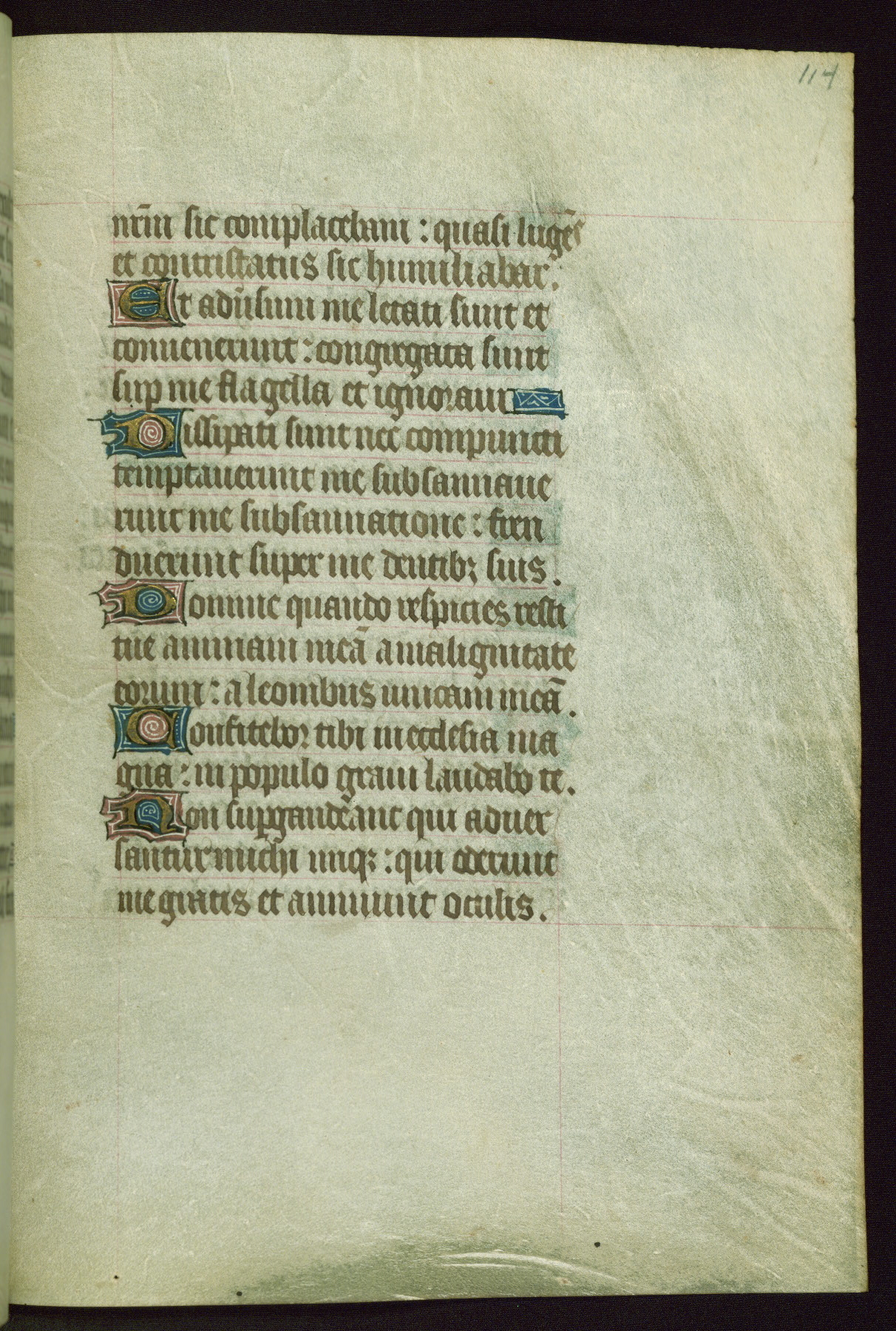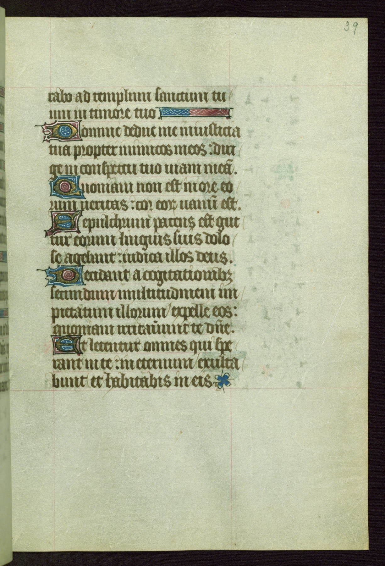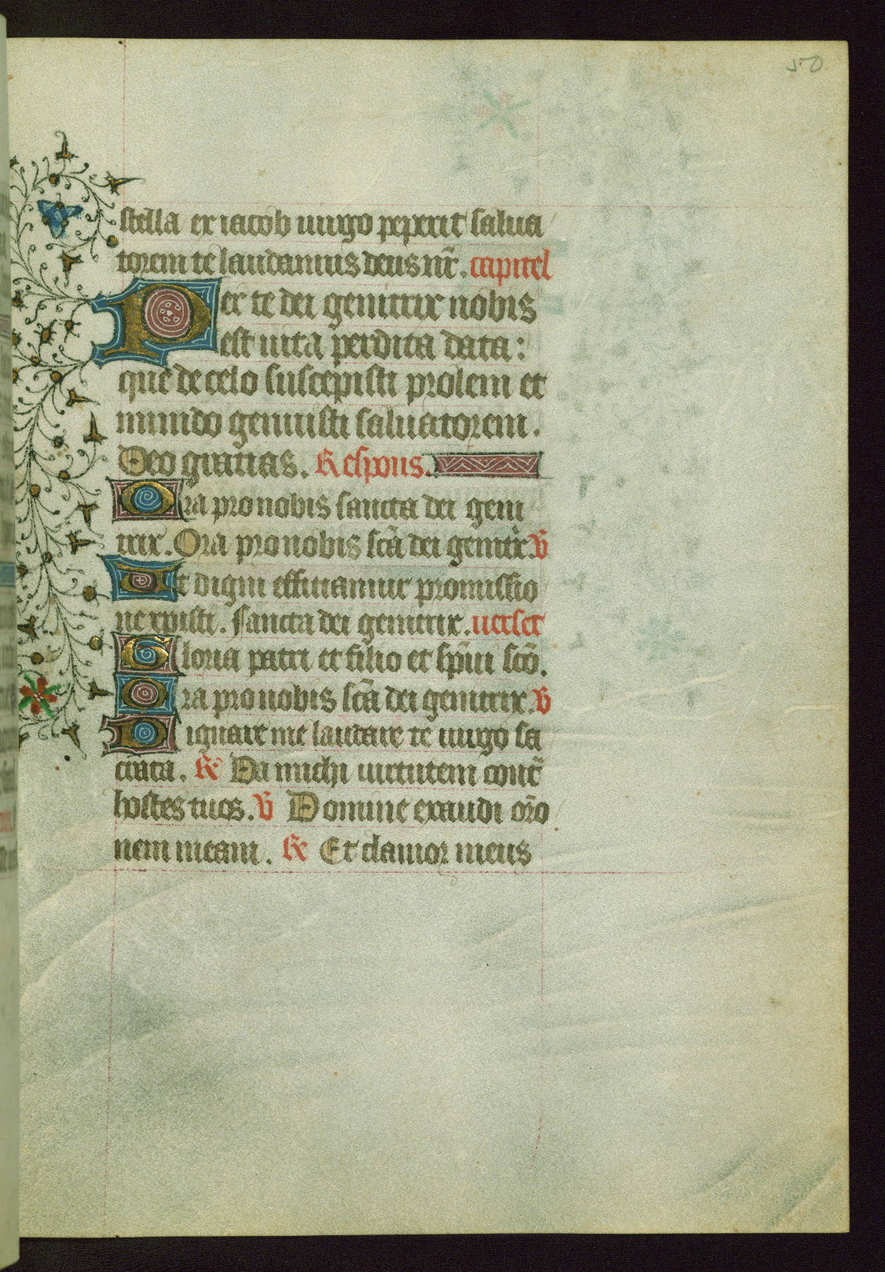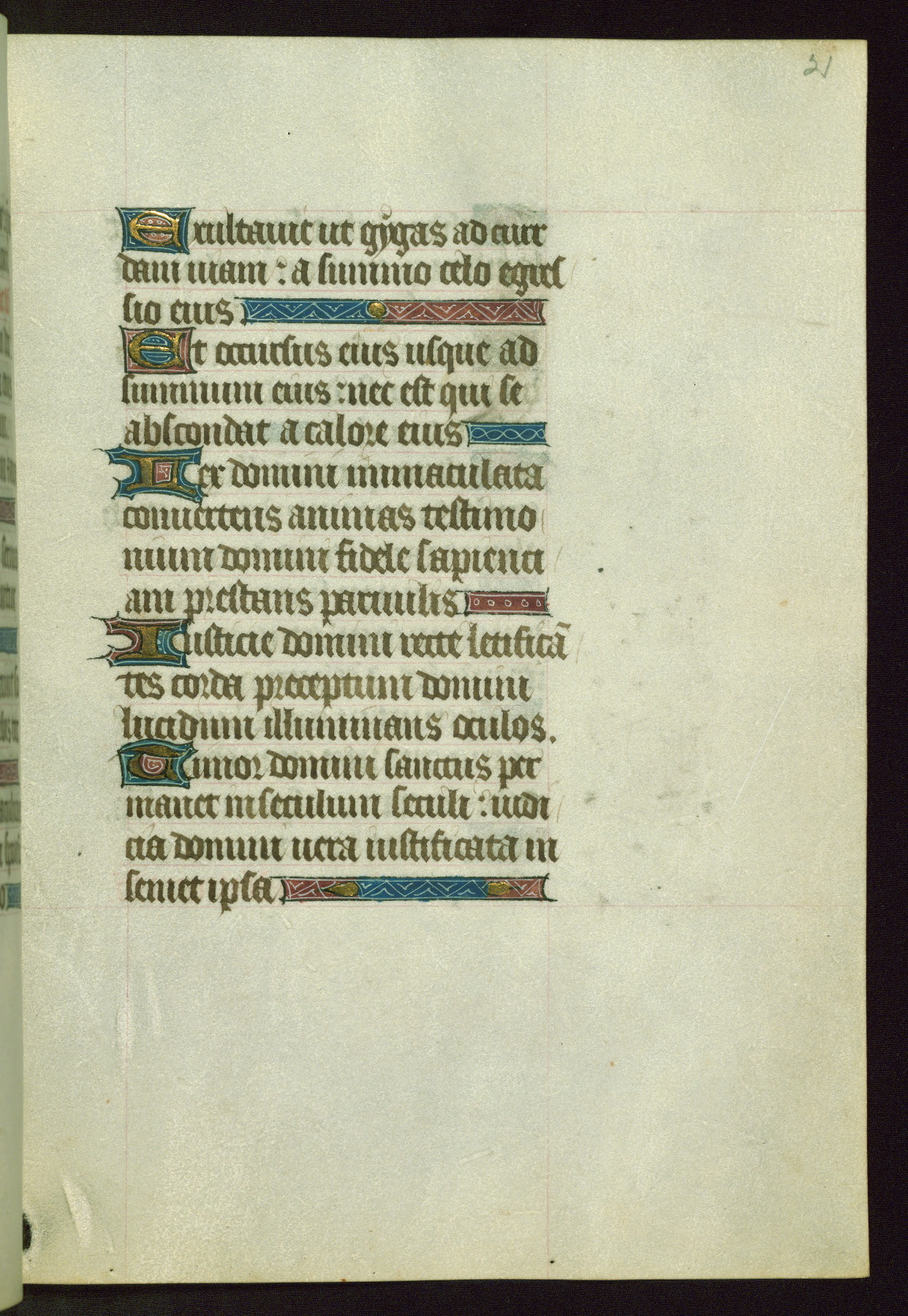This Book of Hours was created ca. 1435-1440 in Amiens by artists from the circle of the Master of W.281 (Randall, cat. 112) for a female patron depicted on fol. 135r. The manuscript contains fourteen miniatures and is localized to Amiens by the contents of the calendar and litany, which include many saints particular to that region. Quire 12 (fols. 82-89) is misbound with quire 13 (fols. 90-97), with Suffrages and the Seven Verses of St. Bernard (fols. 82-89) intended to be after the Office of the Dead (fols. 90-128), as evinced by the location of the rubric for the Office of the Dead on fol. 81v.