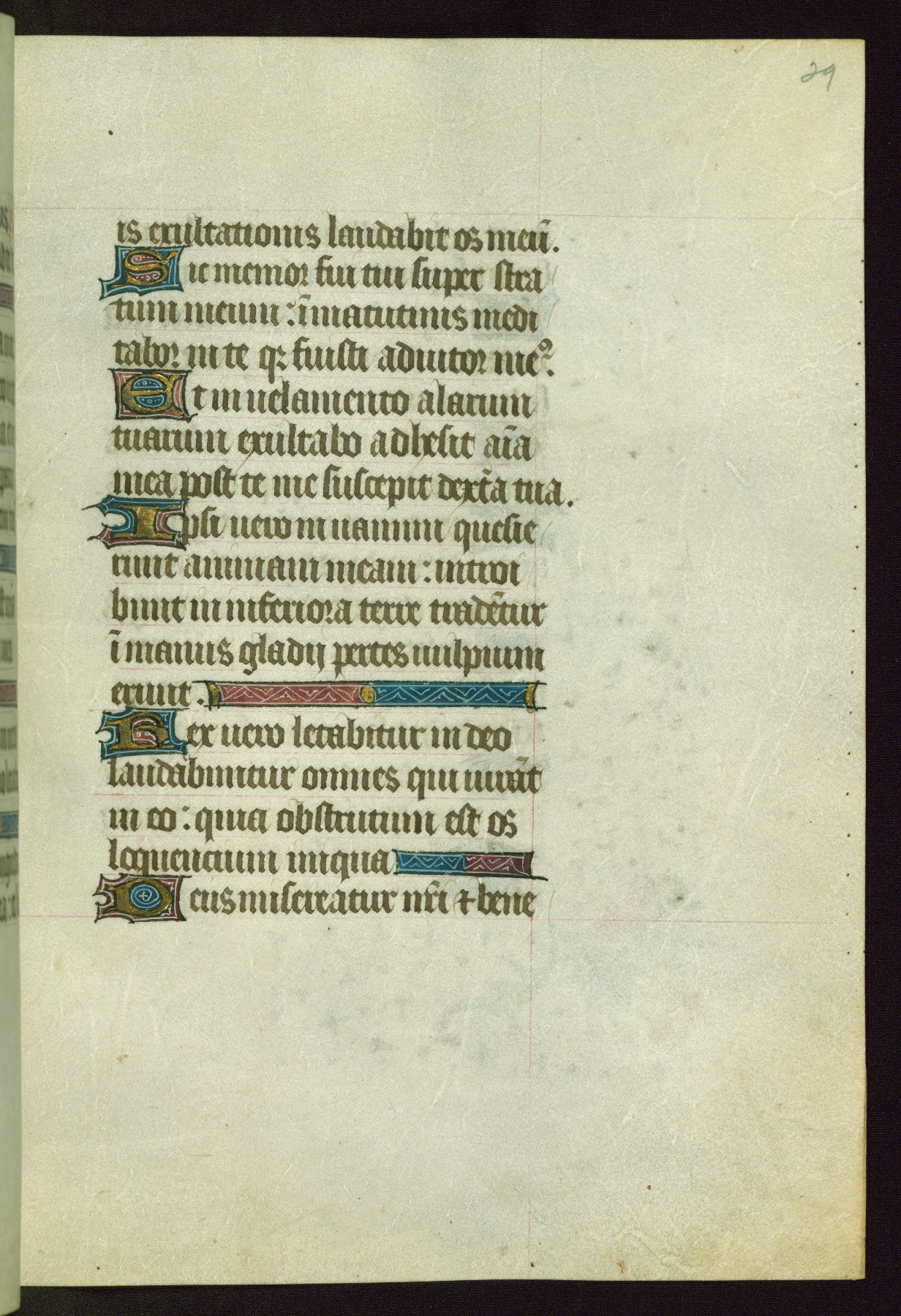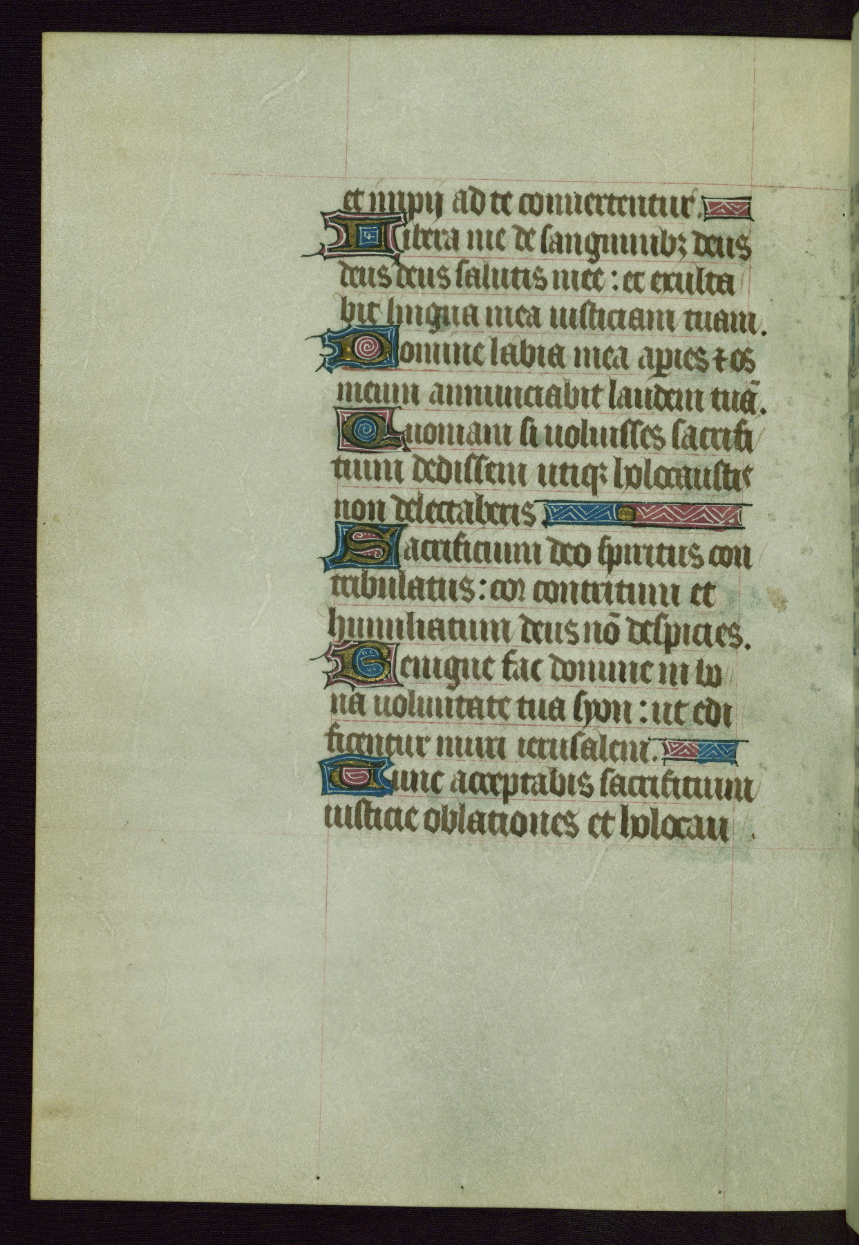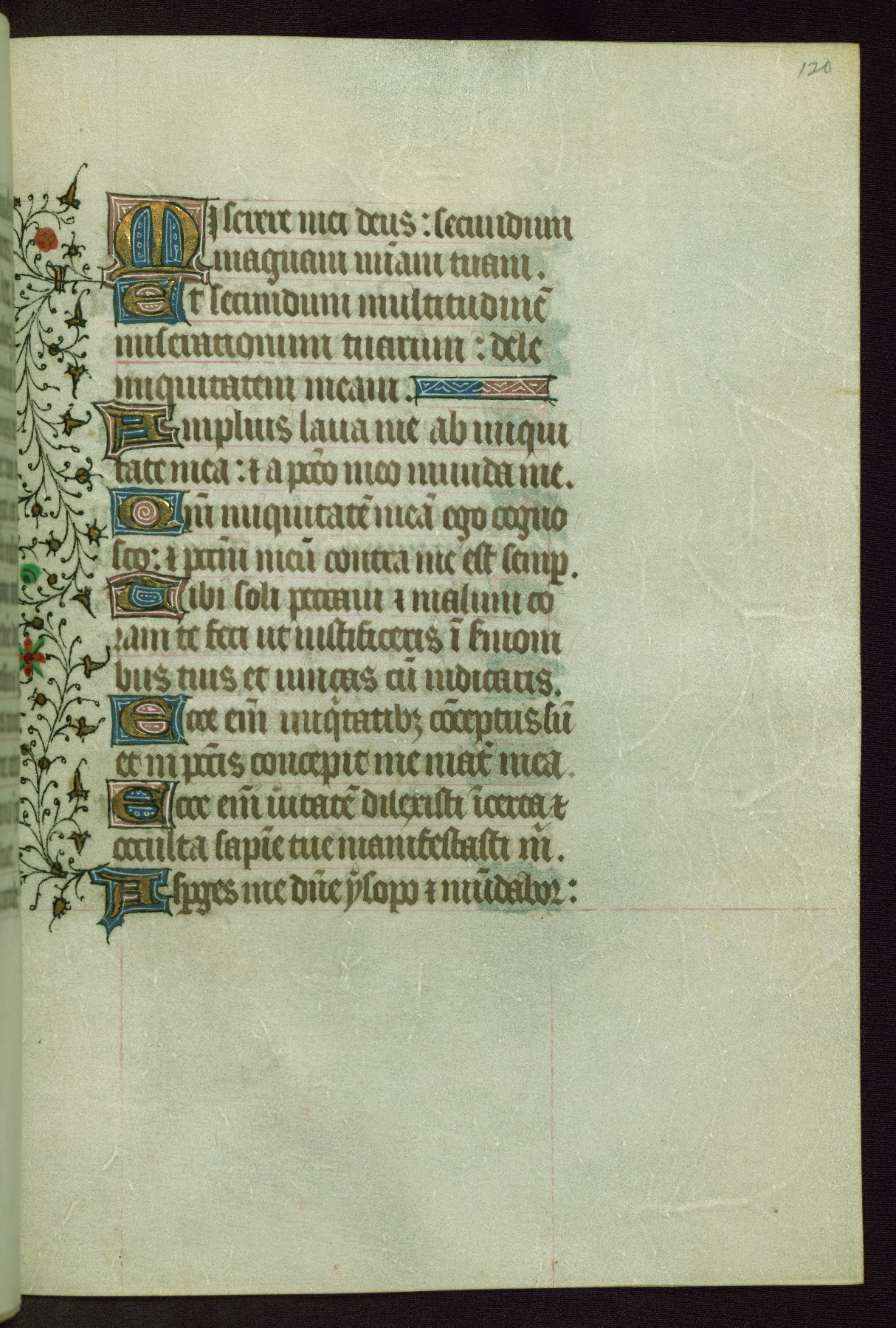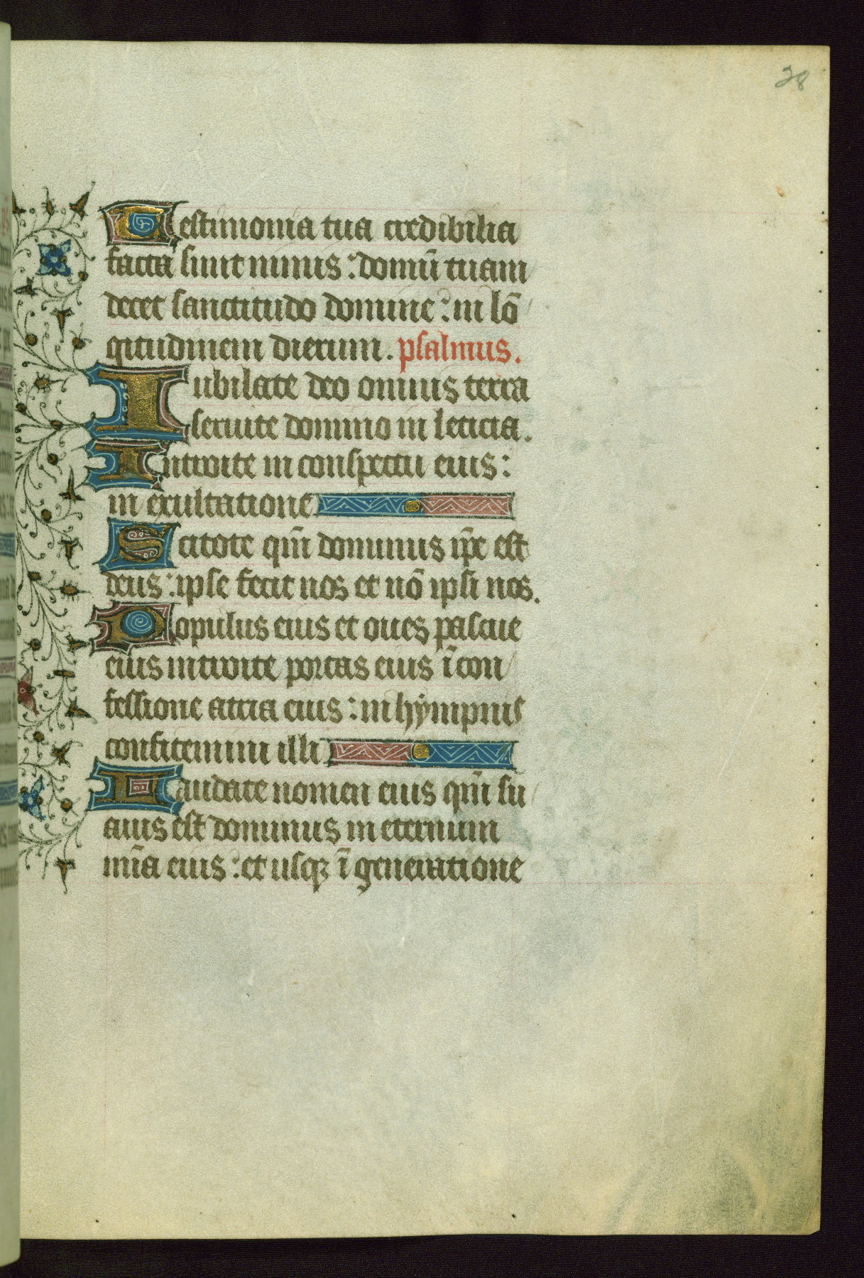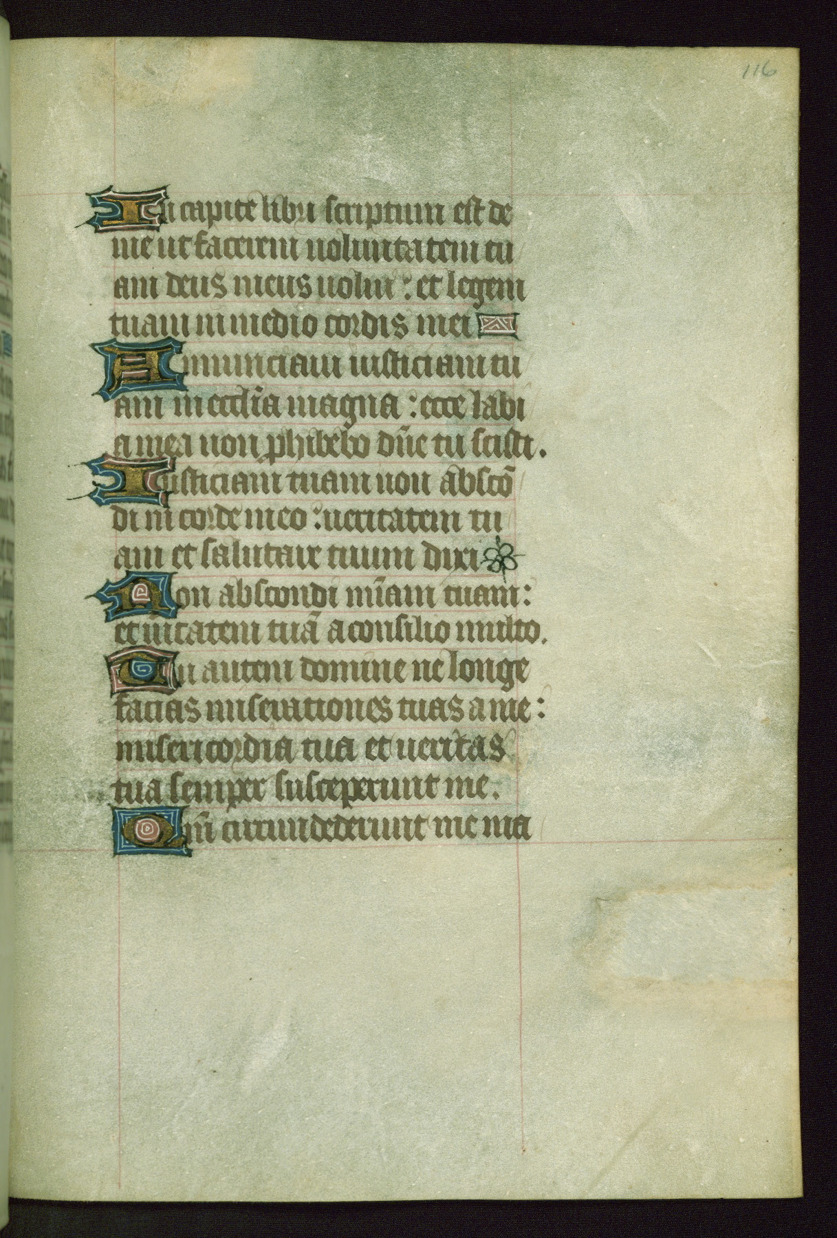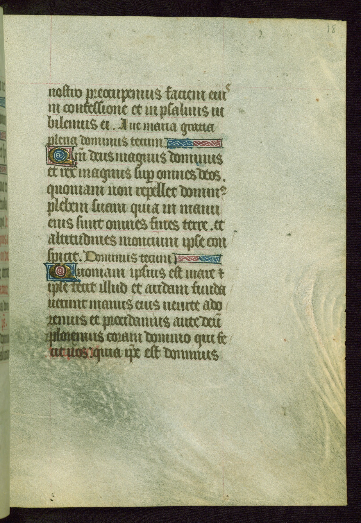 This Book of Hours was created ca. 1435-1440 in Amiens by artists from the circle of the Master of W.281 (Randall, cat. 112) for a female patron depicted on fol. 135r. The manuscript contains fourteen miniatures and is localized to Amiens by the contents of the calendar and litany, which include many saints particular to that region. Quire 12 (fols. 82-89) is misbound with quire 13 (fols. 90-97), with Suffrages and the Seven Verses of St. Bernard (fols. 82-89) intended to be after the Office of the Dead (fols. 90-128), as evinced by the location of the rubric for the Office of the Dead on fol. 81v.