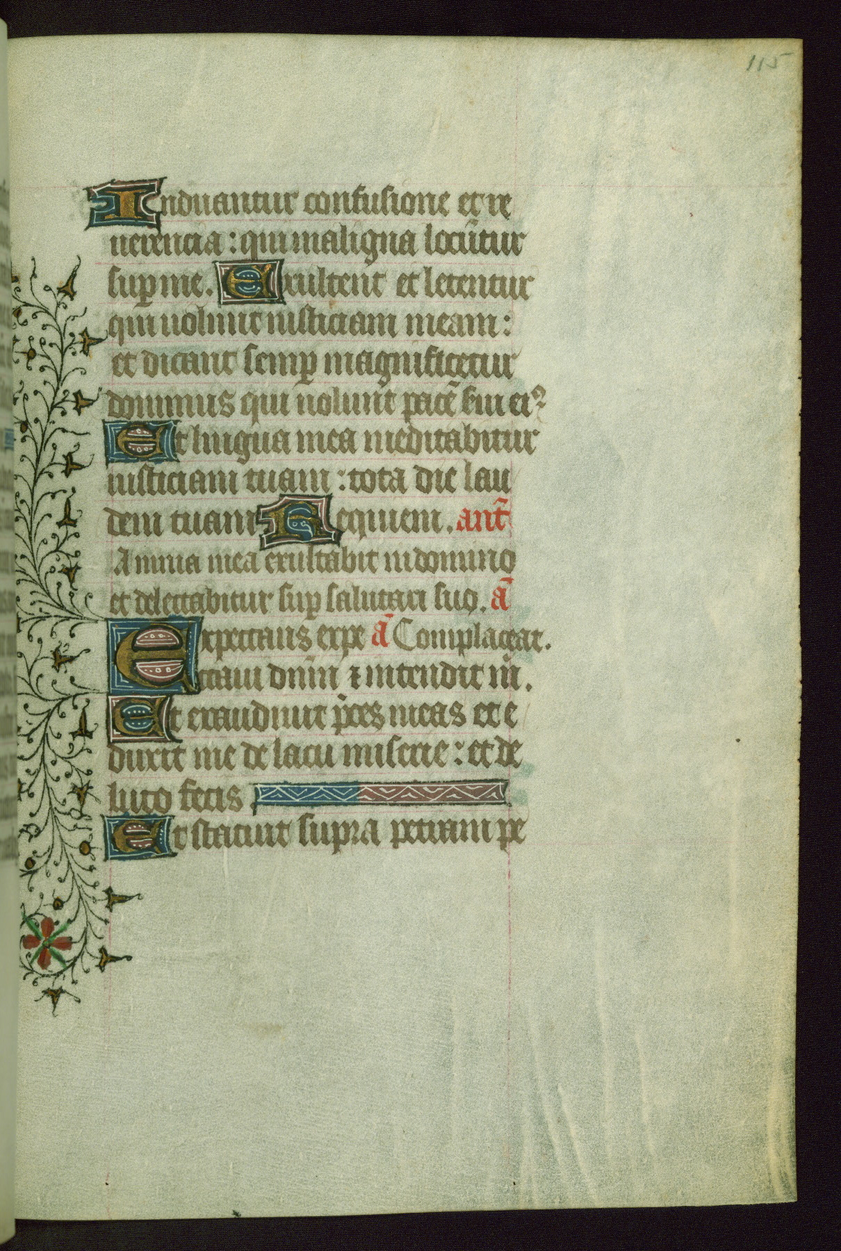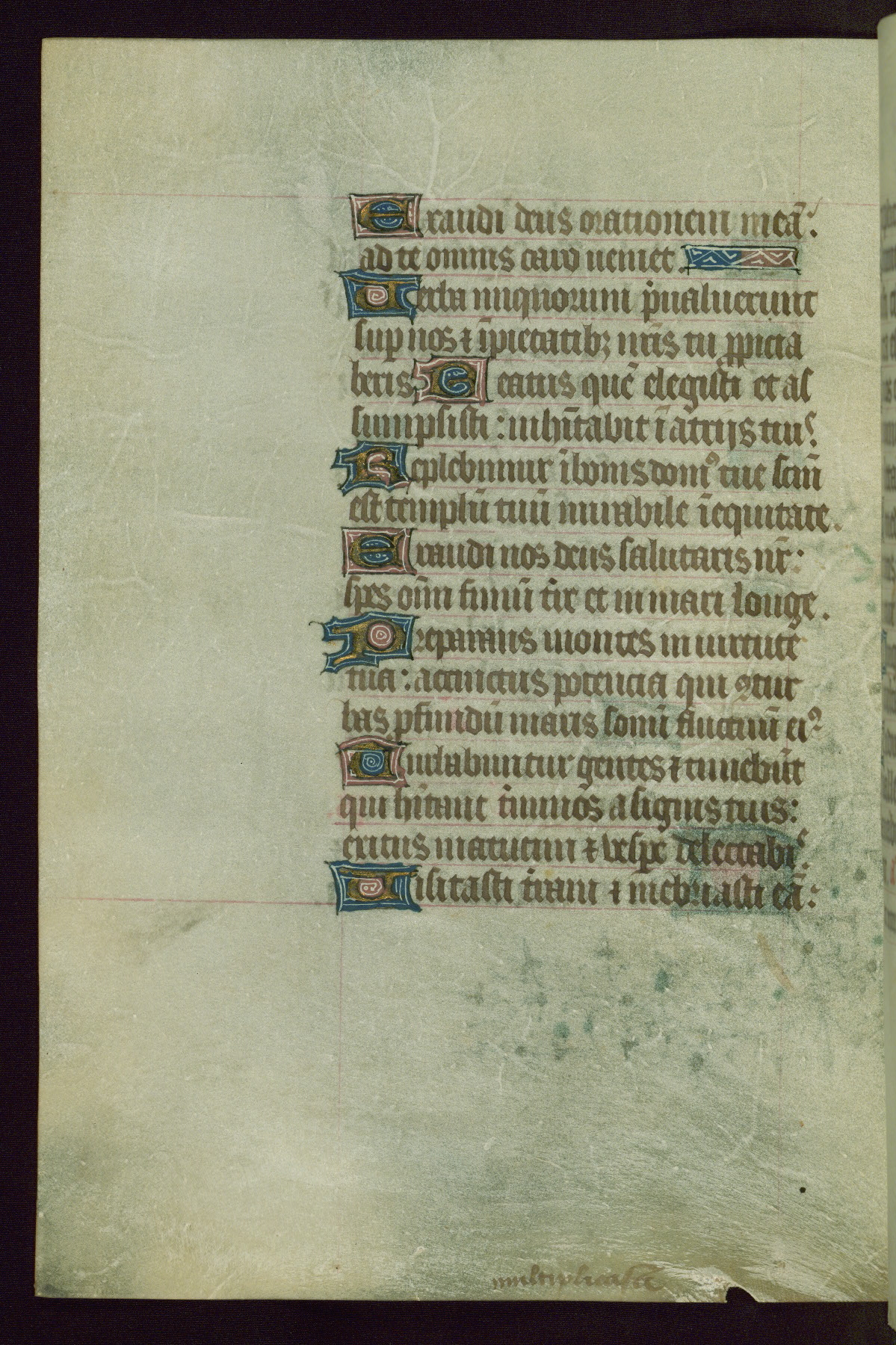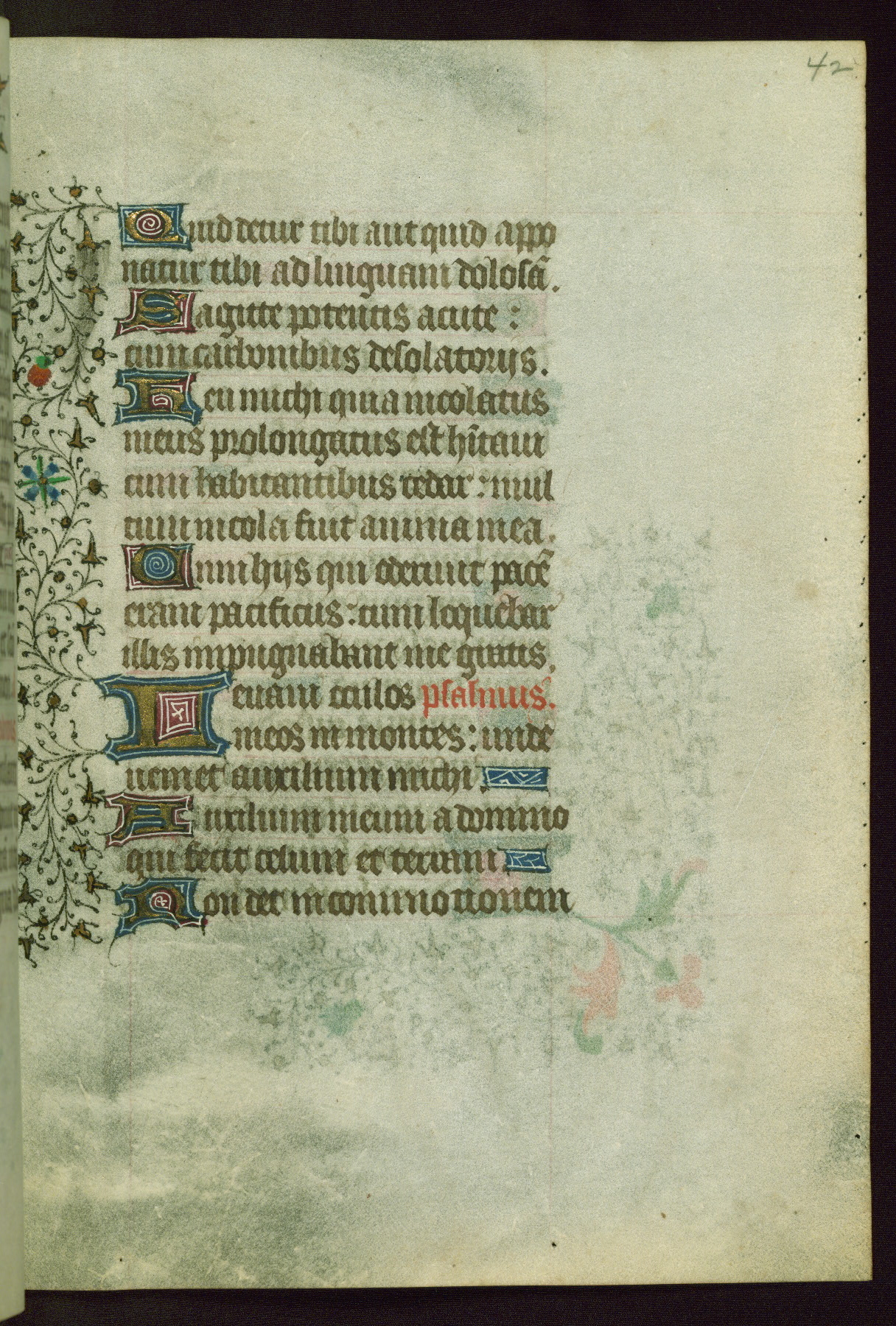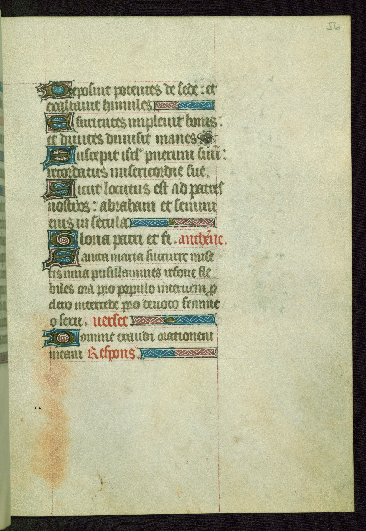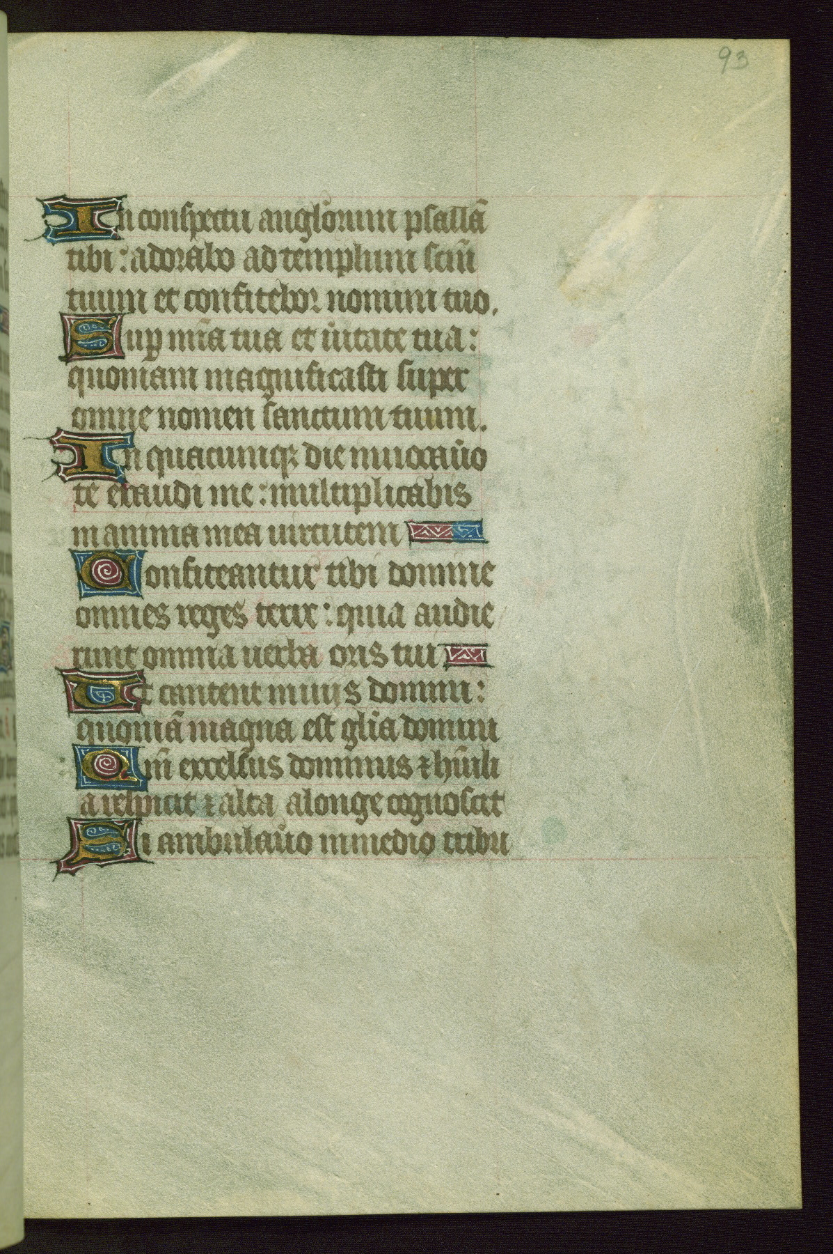 This Book of Hours was created ca. 1435-1440 in Amiens by artists from the circle of the Master of W.281 (Randall, cat. 112) for a female patron depicted on fol. 135r. The manuscript contains fourteen miniatures and is localized to Amiens by the contents of the calendar and litany, which include many saints particular to that region. Quire 12 (fols. 82-89) is misbound with quire 13 (fols. 90-97), with Suffrages and the Seven Verses of St. Bernard (fols. 82-89) intended to be after the Office of the Dead (fols. 90-128), as evinced by the location of the rubric for the Office of the Dead on fol. 81v.