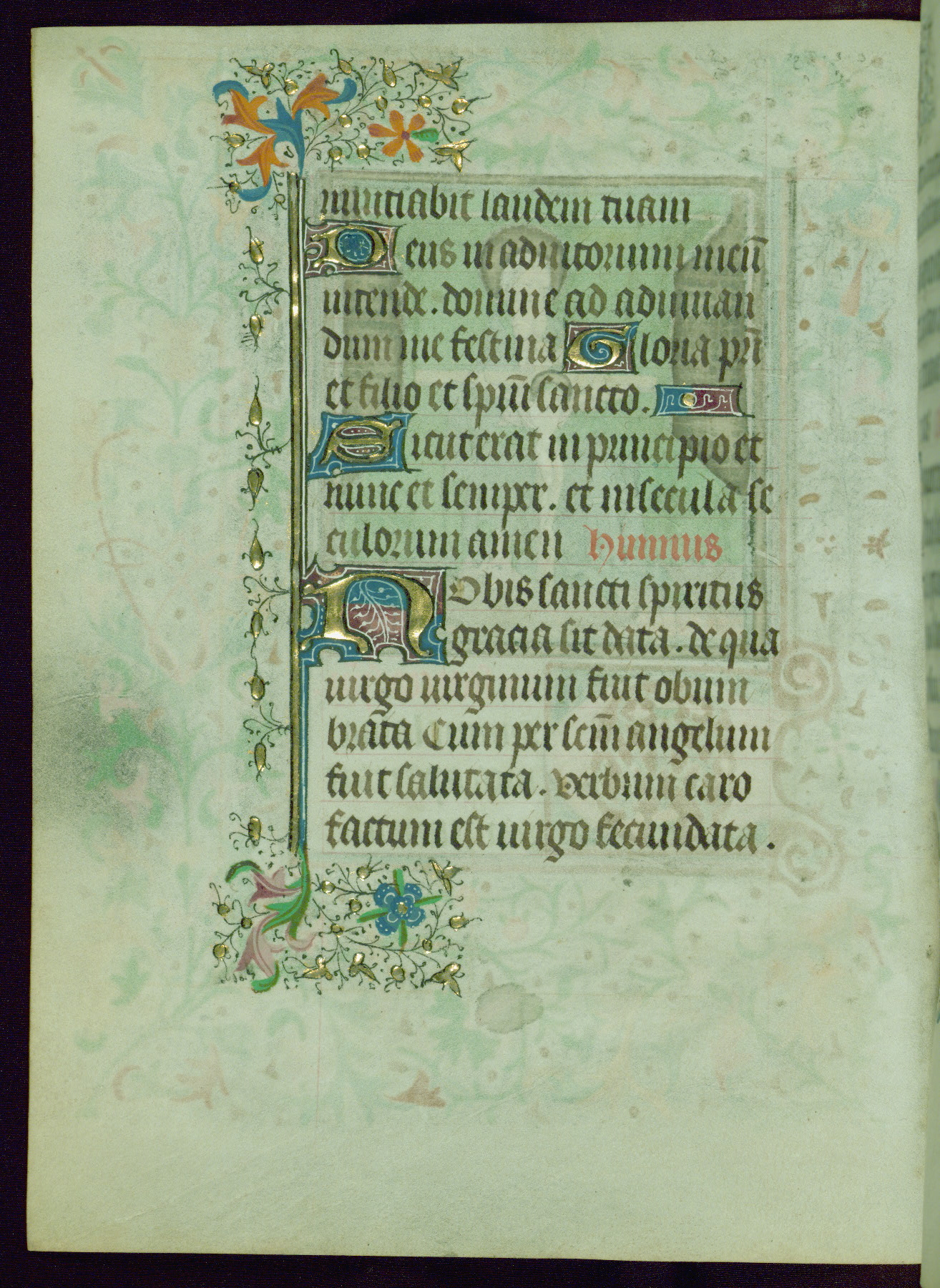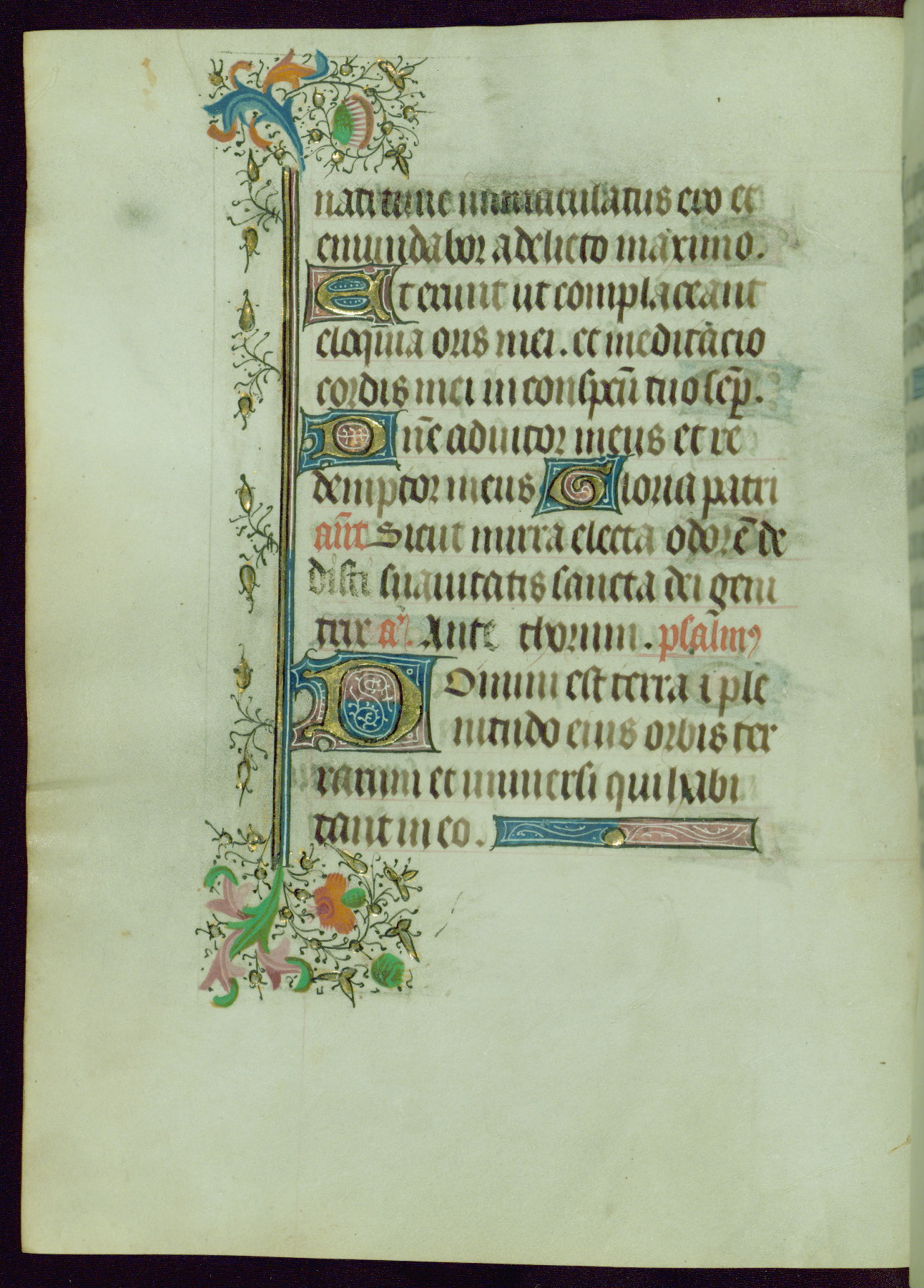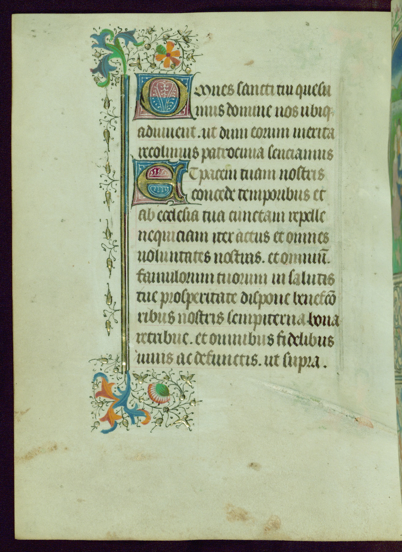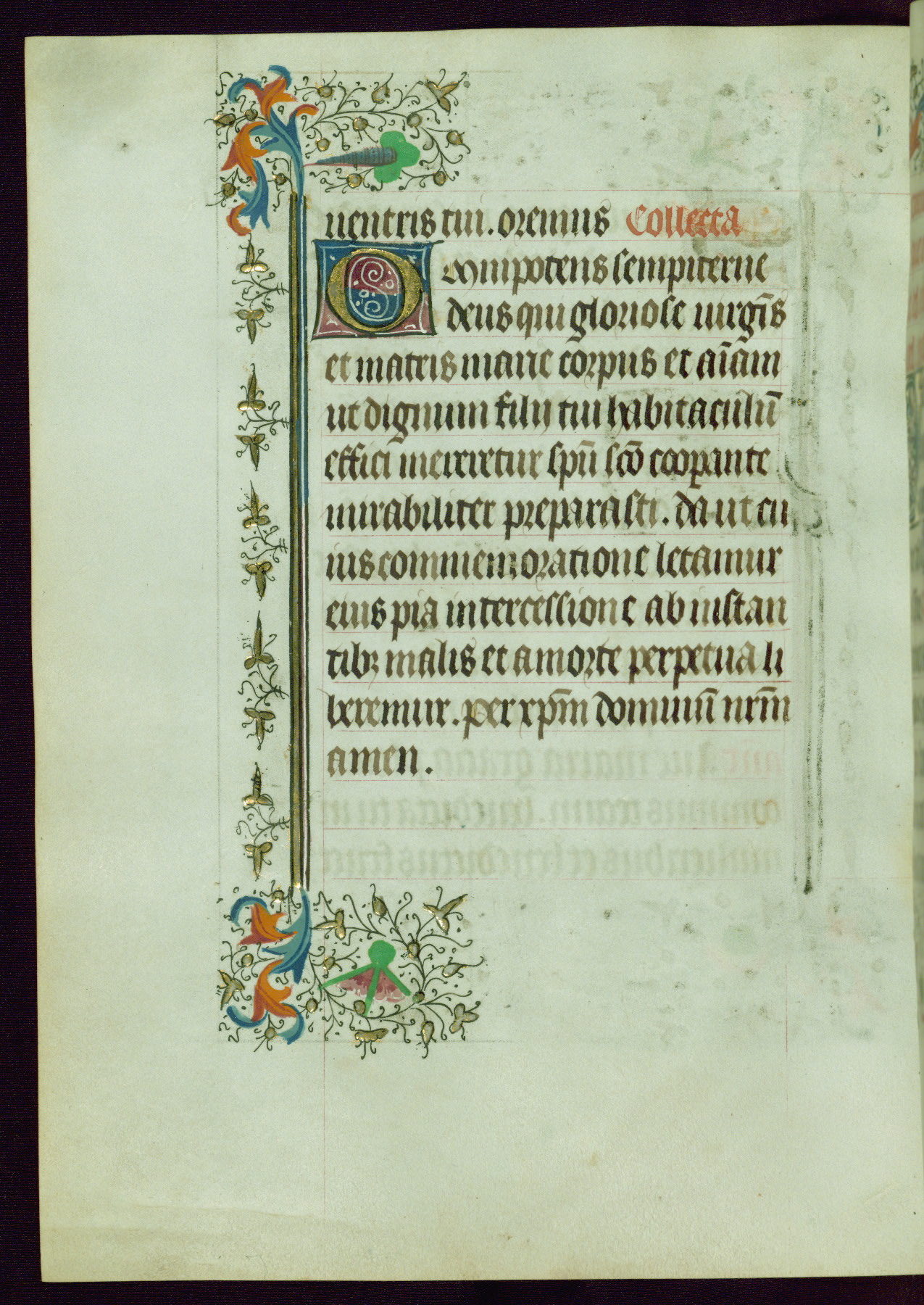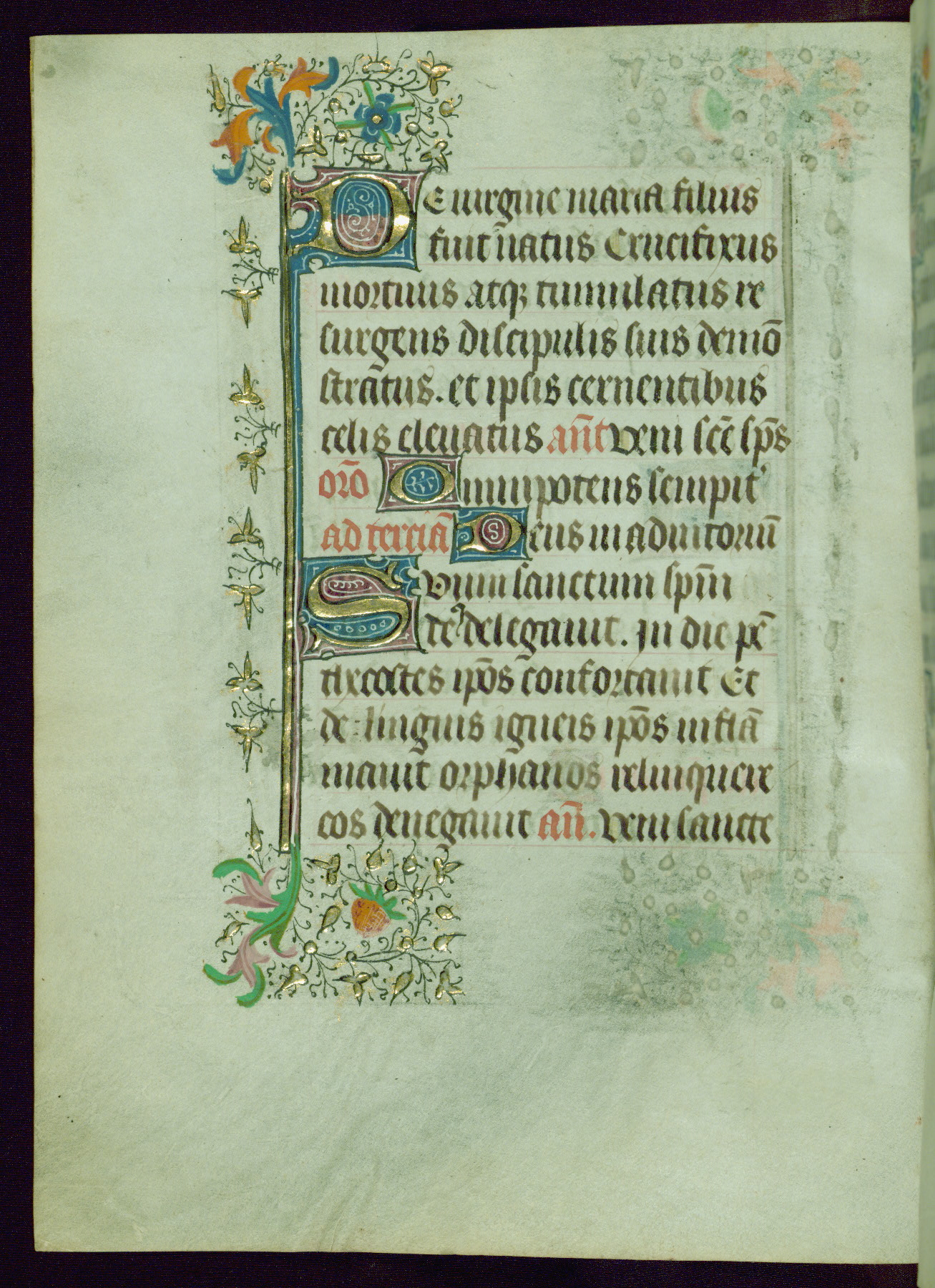This Book of Hours was completed ca. 1440-50, and likely destined for Tournai. The decoration of this manuscript includes two full-page miniatures, eleven extant smaller miniatures, one historiated initial, and one drollery. The illumination is in the style of the Master of Guillebert de Mets, although the work would have been completed during the closing stage of Mets' career. The Master of Guillebert de Mets' principal disciple was the Master of the Ghent Privileges, with whom he may have been in collaboration, as indicated by numerous comparisons (see Dogaer 1987, 33-37). This book begins with a full-page miniature depicting the Mass of St. Gregory, a folio that appears to have been relocated from its original placement just before fol. 180 to its current location as fol. 2. It should be noted that fol. 2 has experienced extensive paint loss and has since been retouched, although it is unknown by whom or at what time. The unpretentious illumination program could have been the reason for this switch, perhaps to make the manuscript more appealing for a potential buyer.