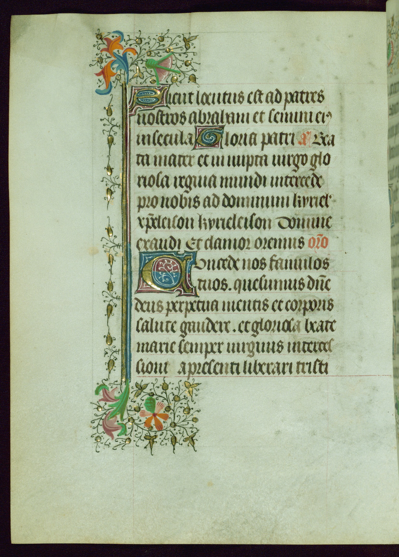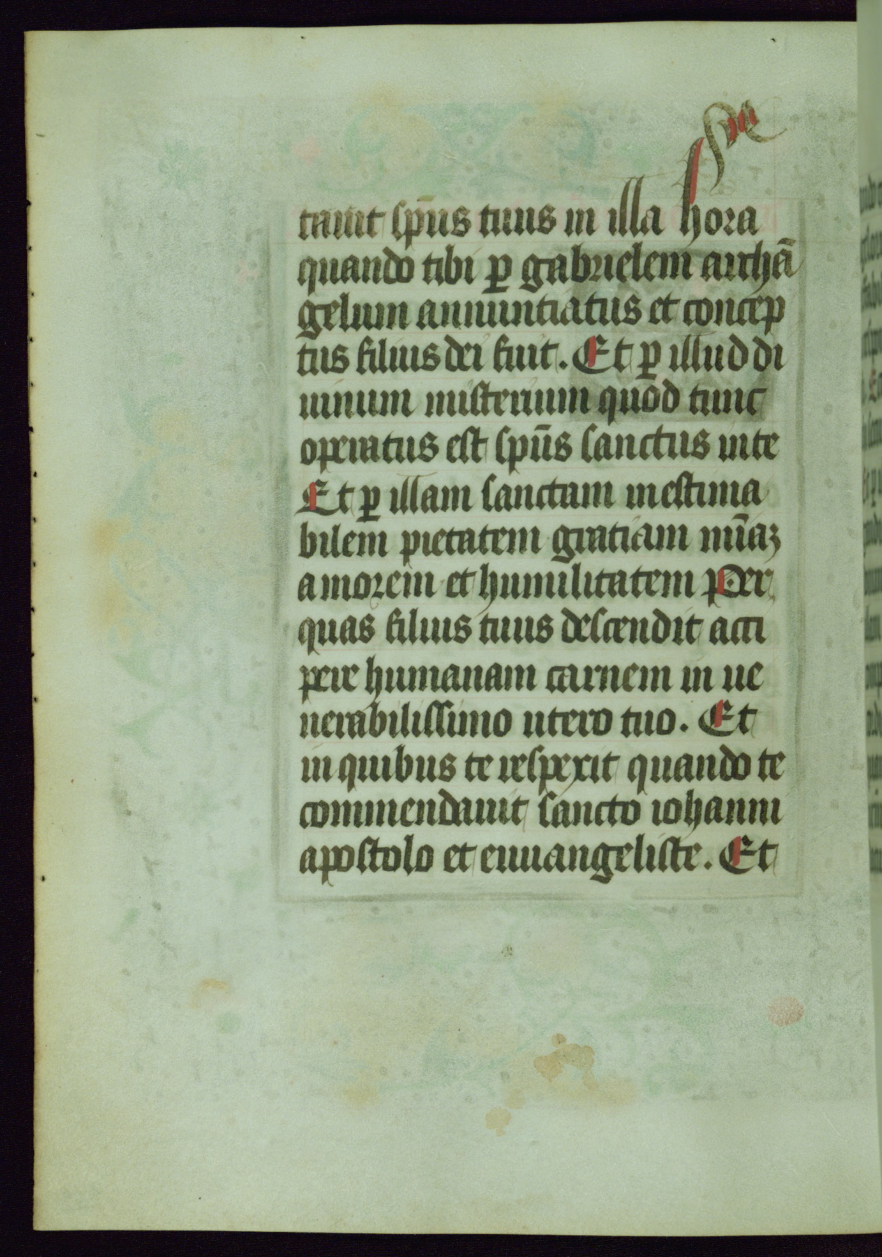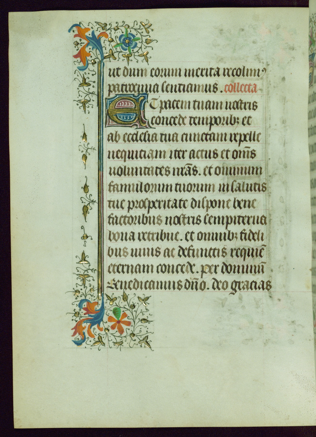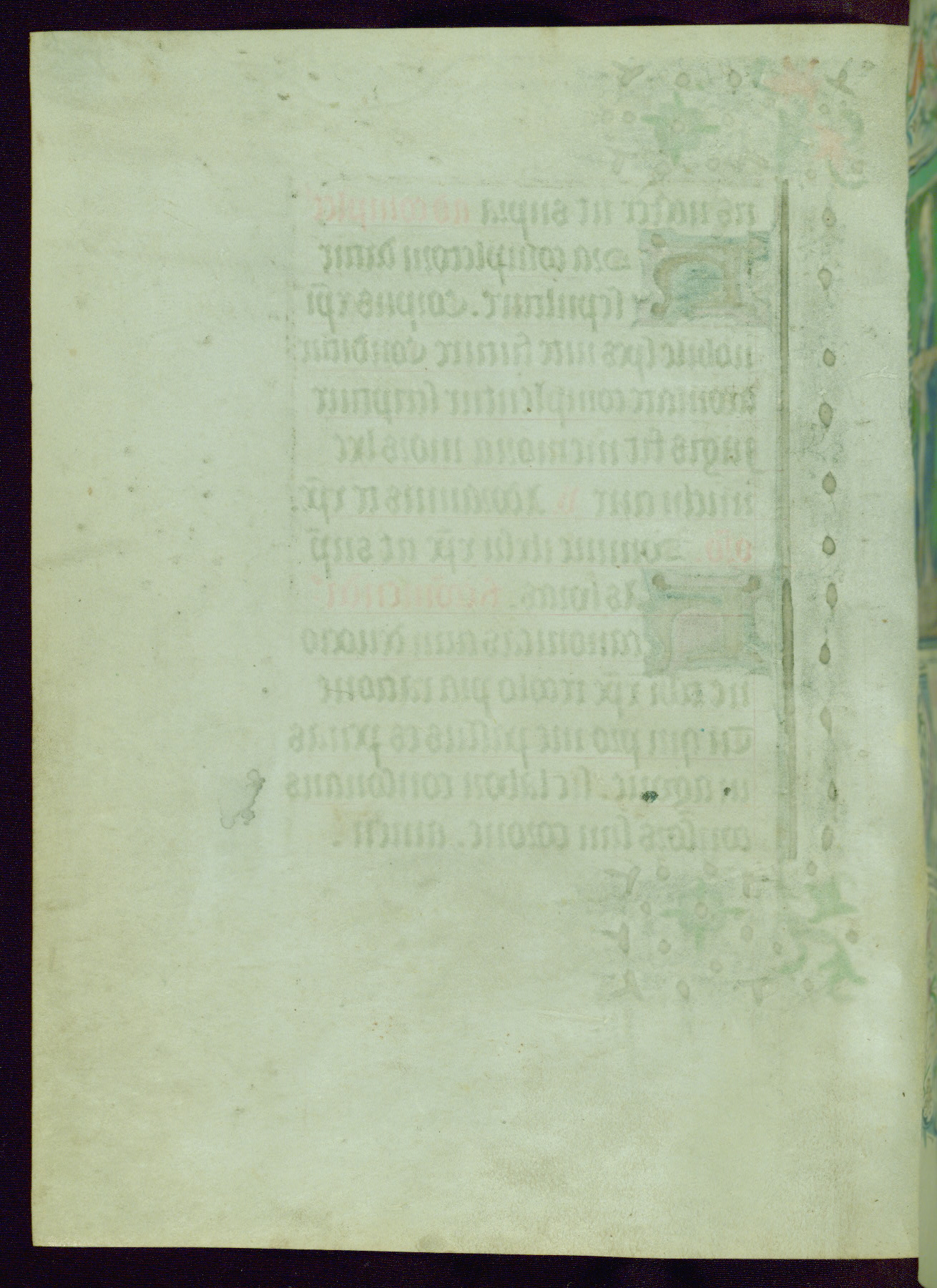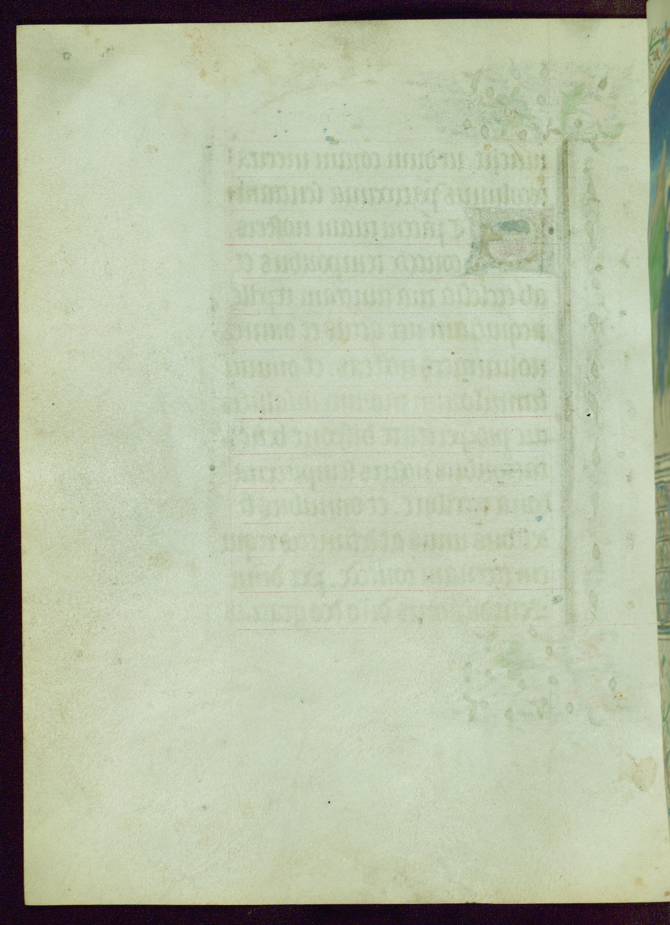 This Book of Hours was completed ca. 1440-50, and likely destined for Tournai. The decoration of this manuscript includes two full-page miniatures, eleven extant smaller miniatures, one historiated initial, and one drollery. The illumination is in the style of the Master of Guillebert de Mets, although the work would have been completed during the closing stage of Mets' career. The Master of Guillebert de Mets' principal disciple was the Master of the Ghent Privileges, with whom he may have been in collaboration, as indicated by numerous comparisons (see Dogaer 1987, 33-37). This book begins with a full-page miniature depicting the Mass of St. Gregory, a folio that appears to have been relocated from its original placement just before fol. 180 to its current location as fol. 2. It should be noted that fol. 2 has experienced extensive paint loss and has since been retouched, although it is unknown by whom or at what time. The unpretentious illumination program could have been the reason for this switch, perhaps to make the manuscript more appealing for a potential buyer.