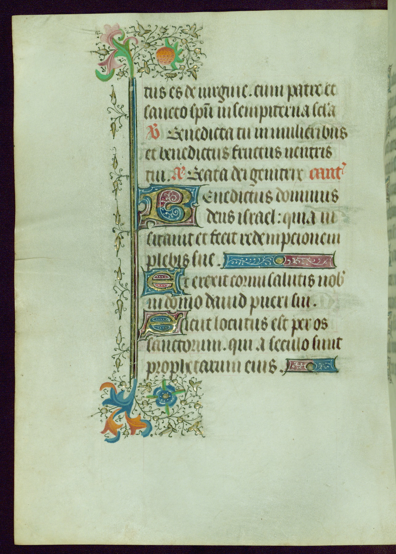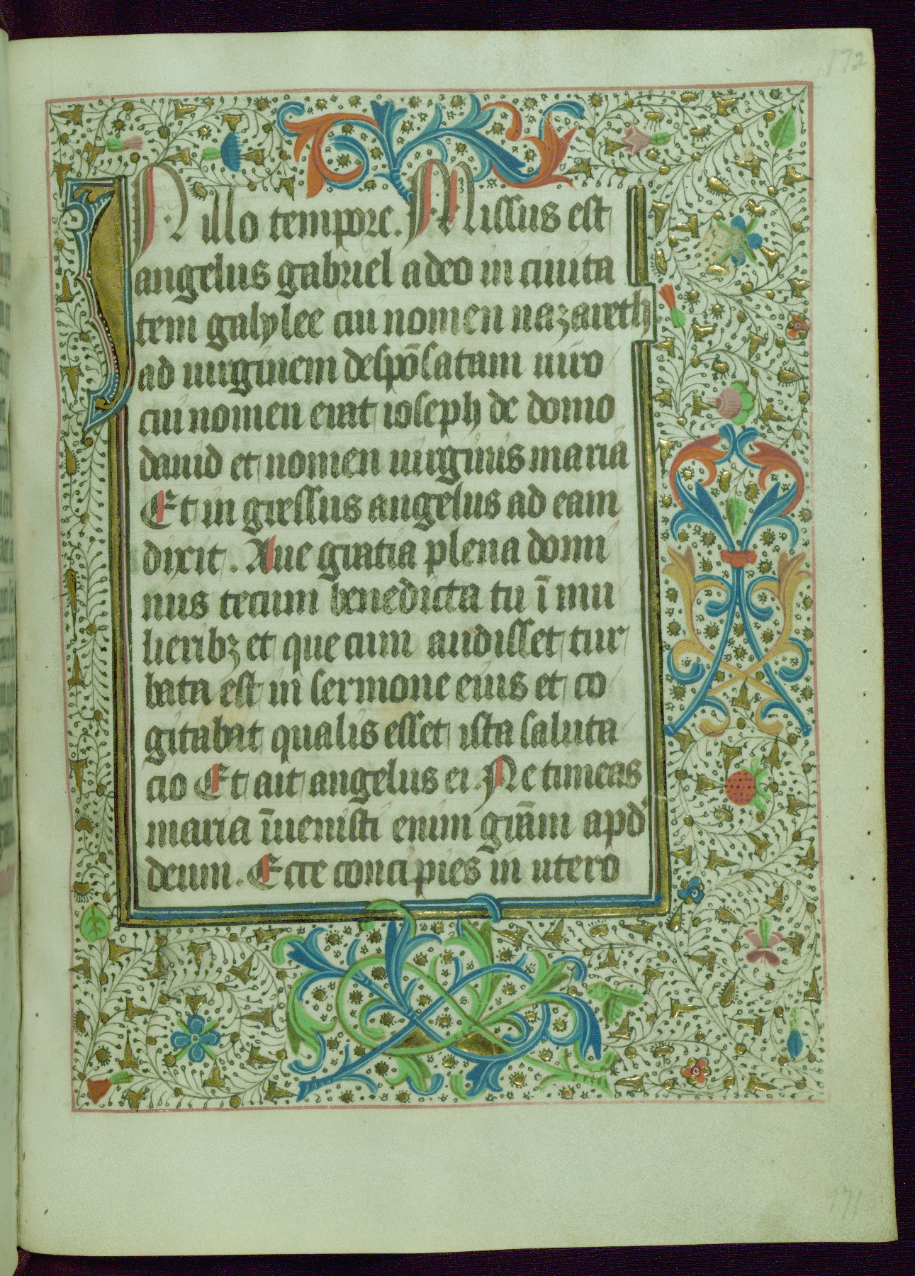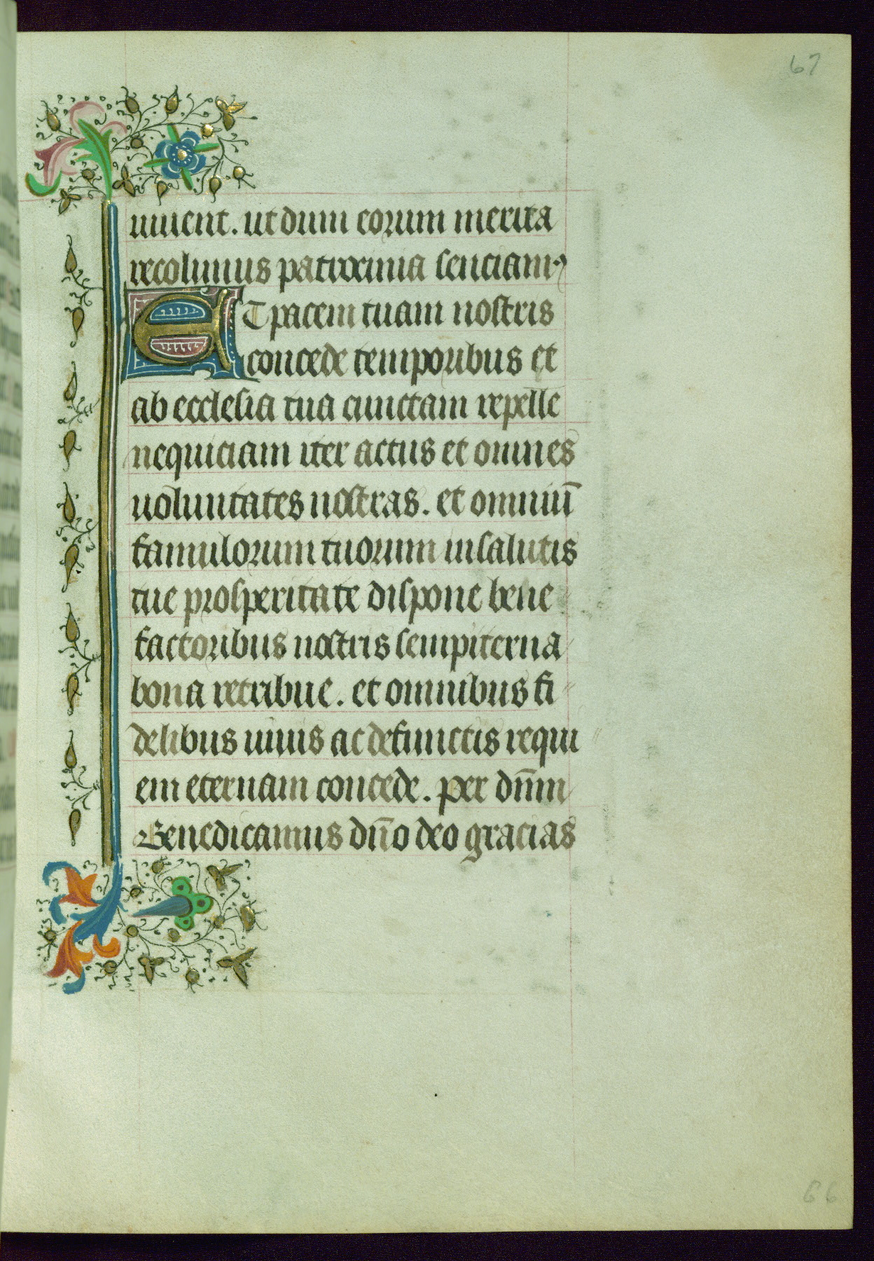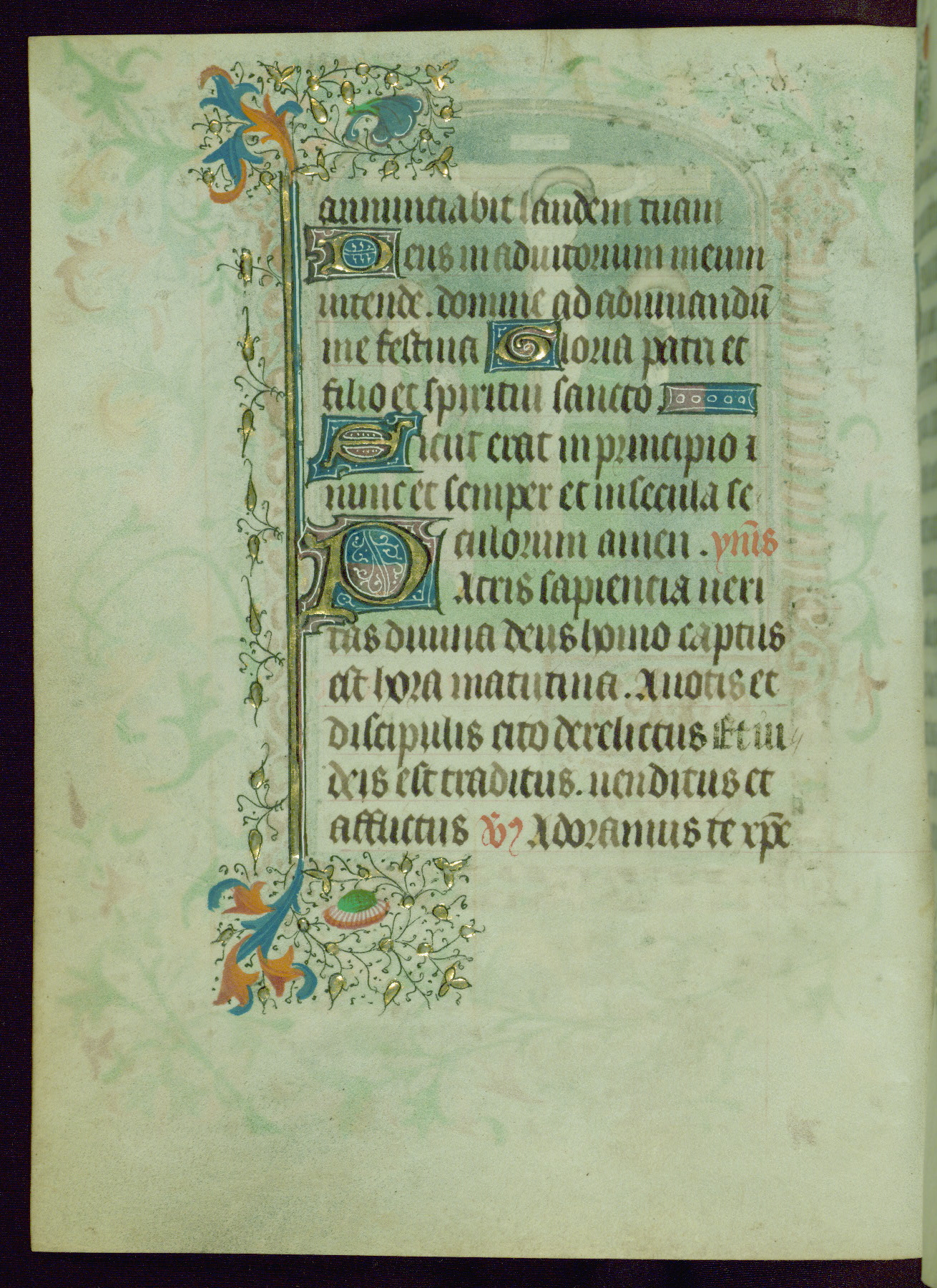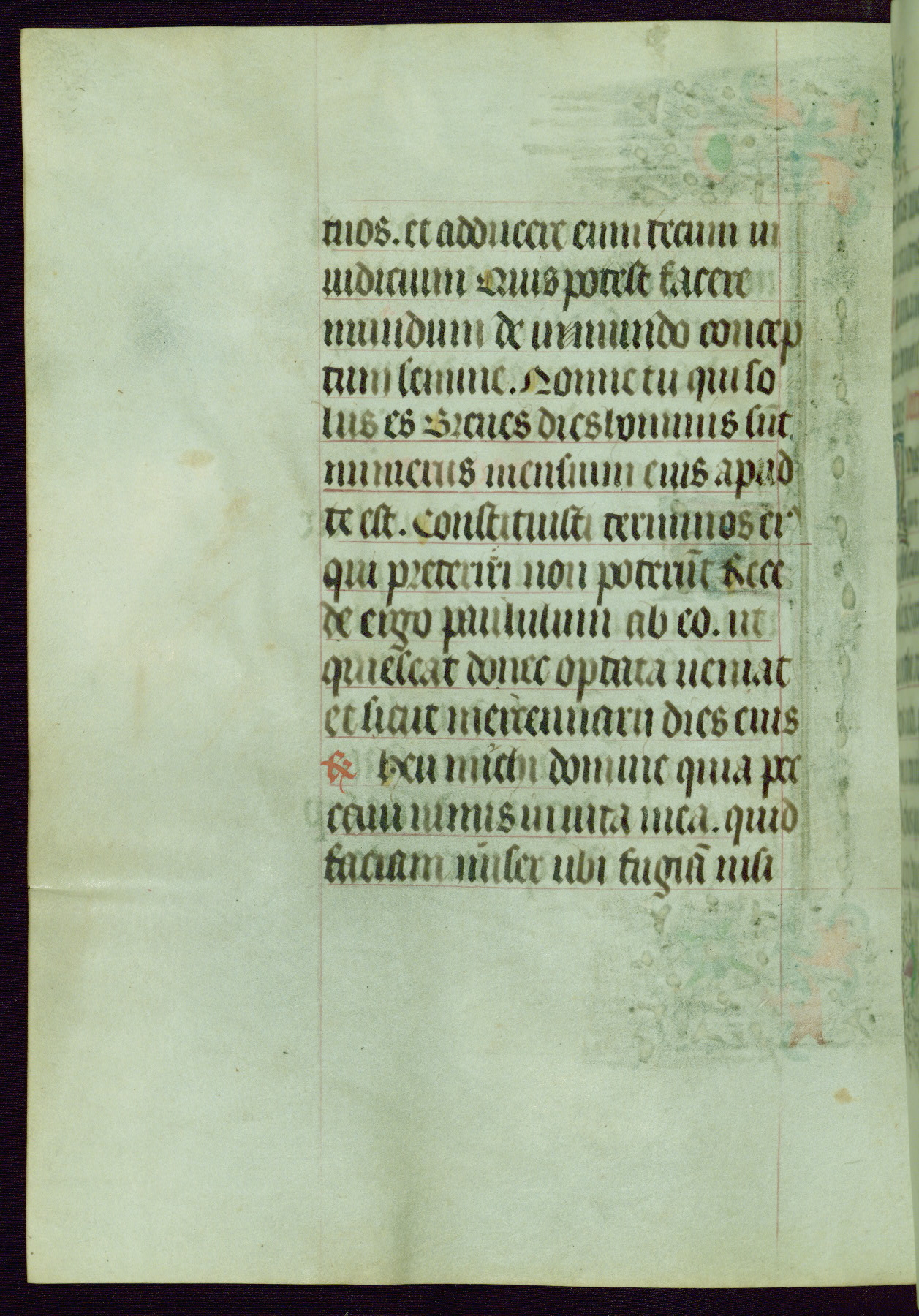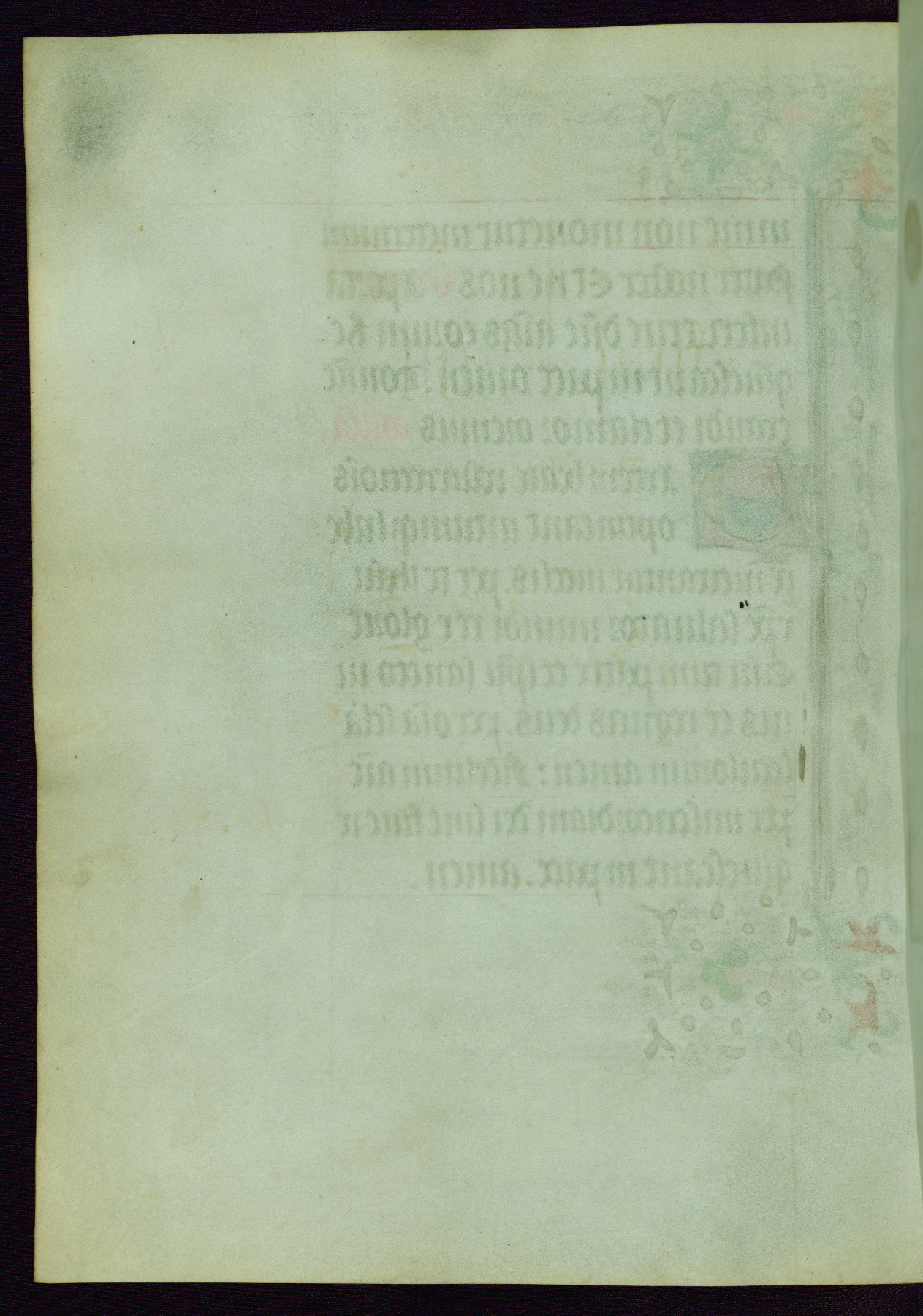 This Book of Hours was completed ca. 1440-50, and likely destined for Tournai. The decoration of this manuscript includes two full-page miniatures, eleven extant smaller miniatures, one historiated initial, and one drollery. The illumination is in the style of the Master of Guillebert de Mets, although the work would have been completed during the closing stage of Mets' career. The Master of Guillebert de Mets' principal disciple was the Master of the Ghent Privileges, with whom he may have been in collaboration, as indicated by numerous comparisons (see Dogaer 1987, 33-37). This book begins with a full-page miniature depicting the Mass of St. Gregory, a folio that appears to have been relocated from its original placement just before fol. 180 to its current location as fol. 2. It should be noted that fol. 2 has experienced extensive paint loss and has since been retouched, although it is unknown by whom or at what time. The unpretentious illumination program could have been the reason for this switch, perhaps to make the manuscript more appealing for a potential buyer.
