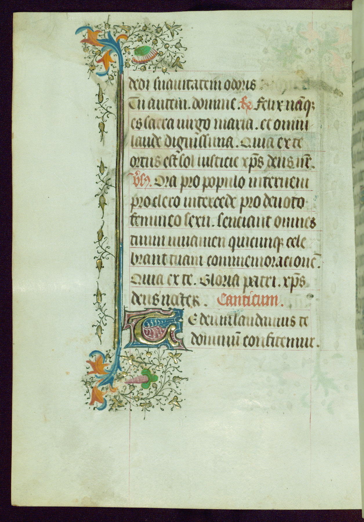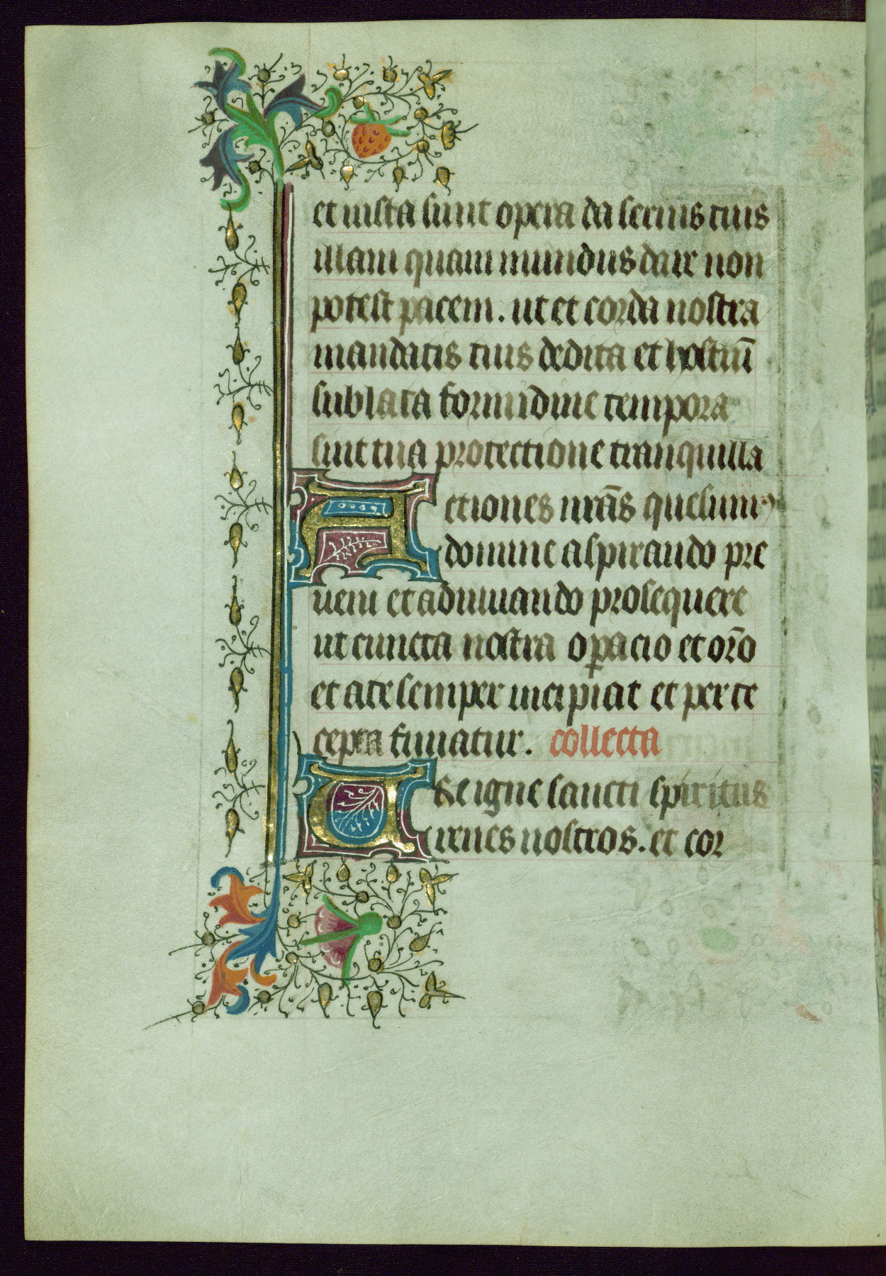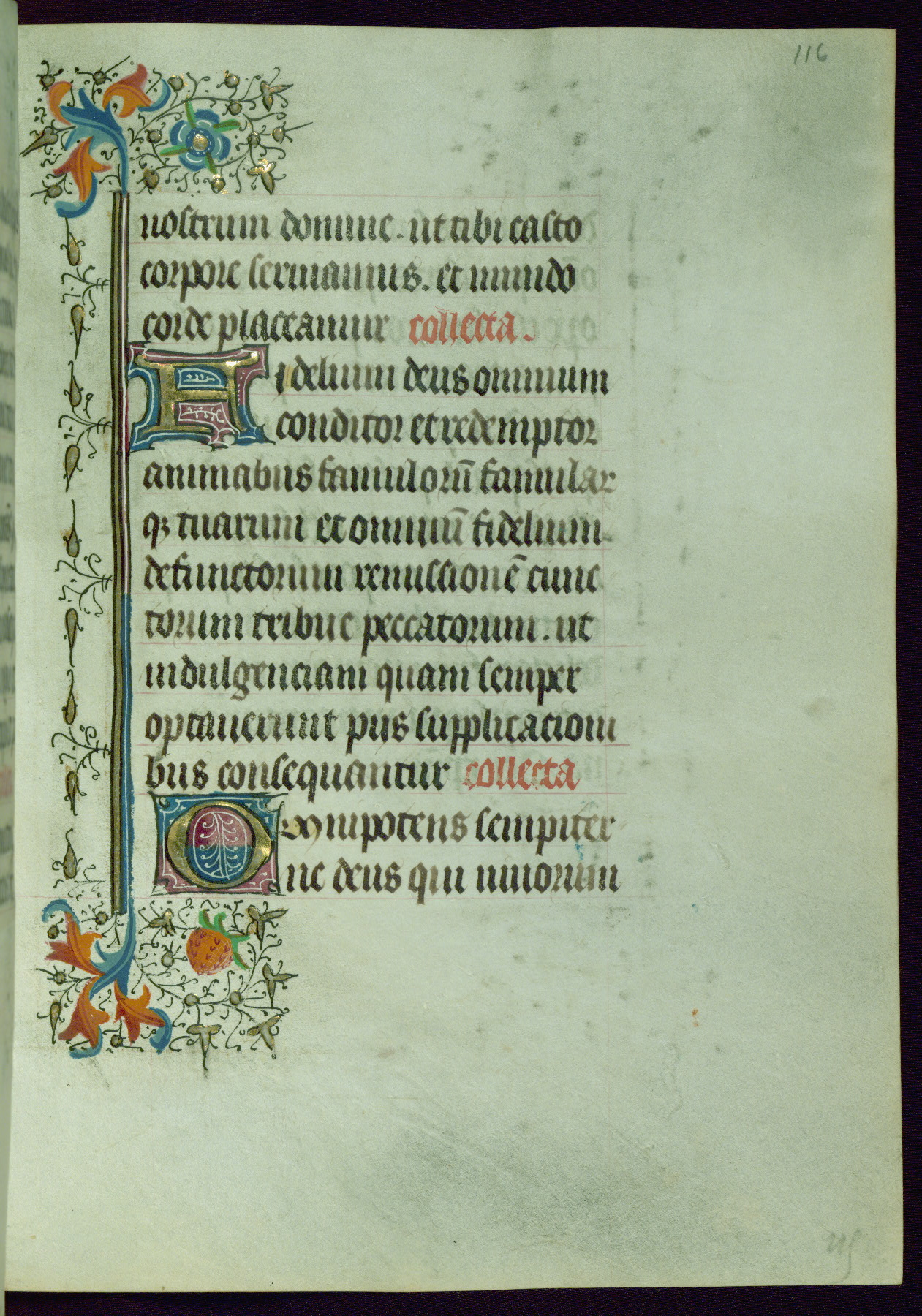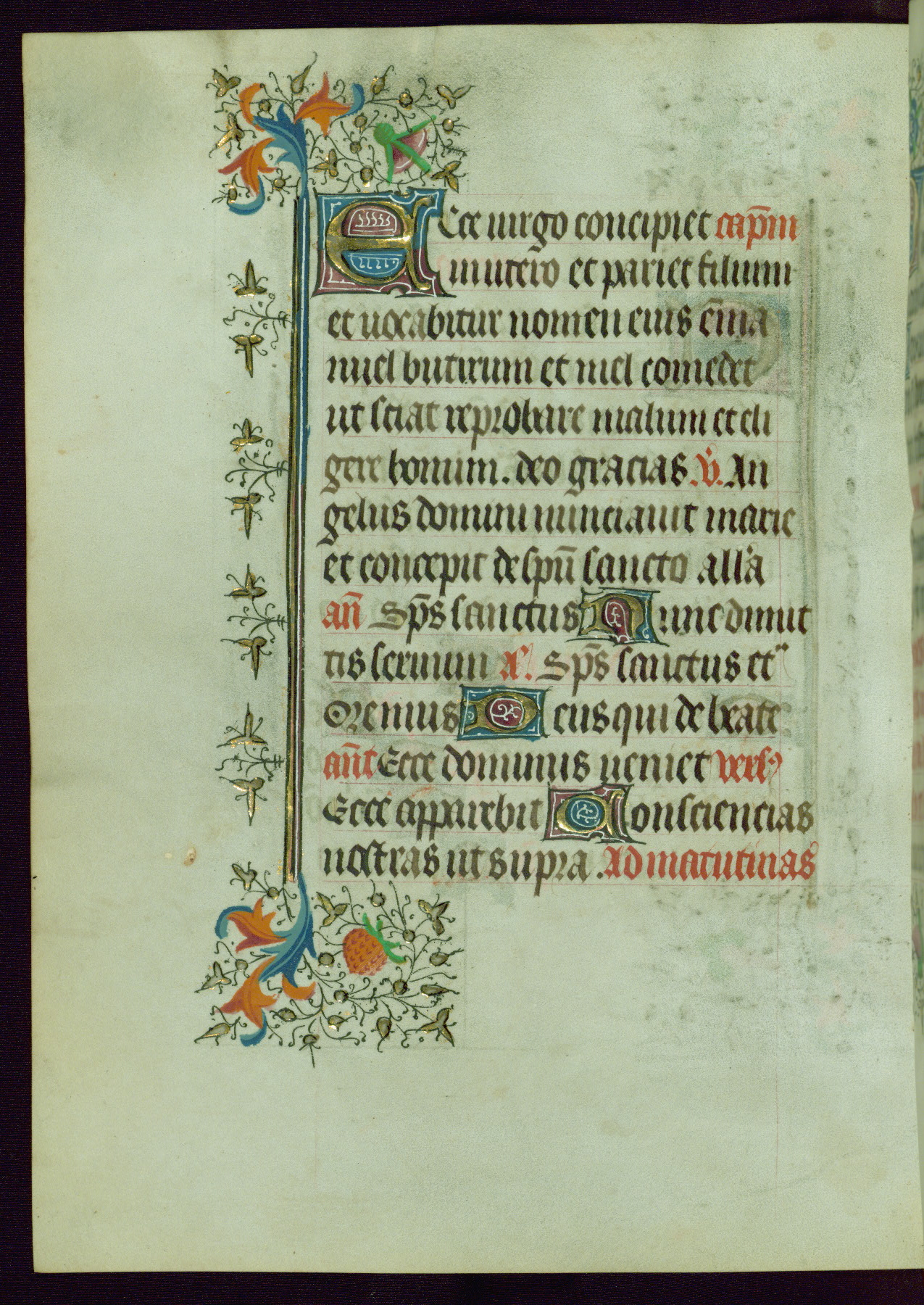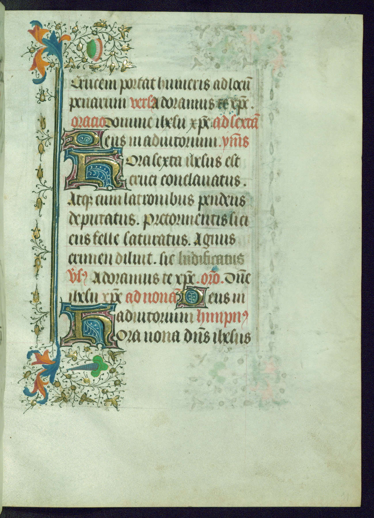 This Book of Hours was completed ca. 1440-50, and likely destined for Tournai. The decoration of this manuscript includes two full-page miniatures, eleven extant smaller miniatures, one historiated initial, and one drollery. The illumination is in the style of the Master of Guillebert de Mets, although the work would have been completed during the closing stage of Mets' career. The Master of Guillebert de Mets' principal disciple was the Master of the Ghent Privileges, with whom he may have been in collaboration, as indicated by numerous comparisons (see Dogaer 1987, 33-37). This book begins with a full-page miniature depicting the Mass of St. Gregory, a folio that appears to have been relocated from its original placement just before fol. 180 to its current location as fol. 2. It should be noted that fol. 2 has experienced extensive paint loss and has since been retouched, although it is unknown by whom or at what time. The unpretentious illumination program could have been the reason for this switch, perhaps to make the manuscript more appealing for a potential buyer.