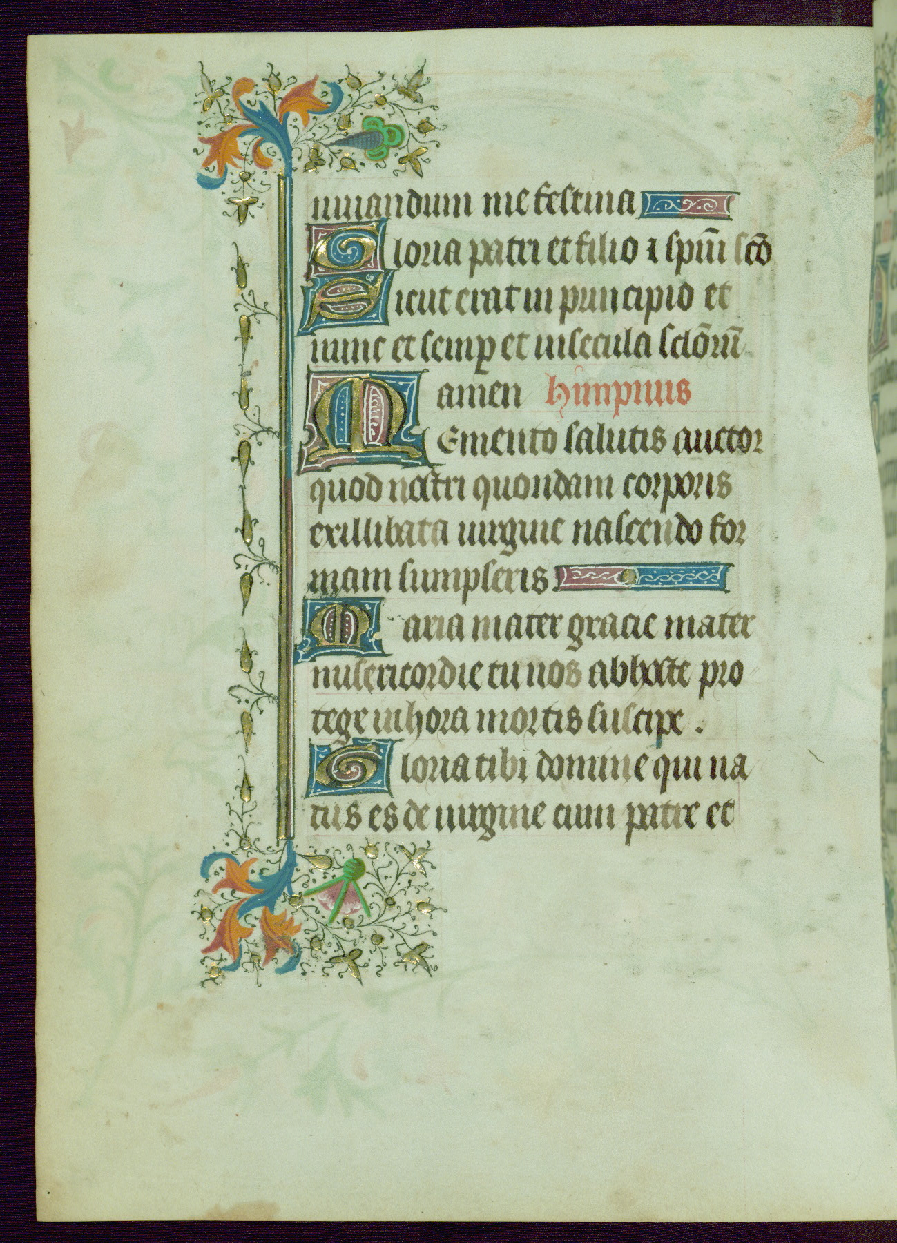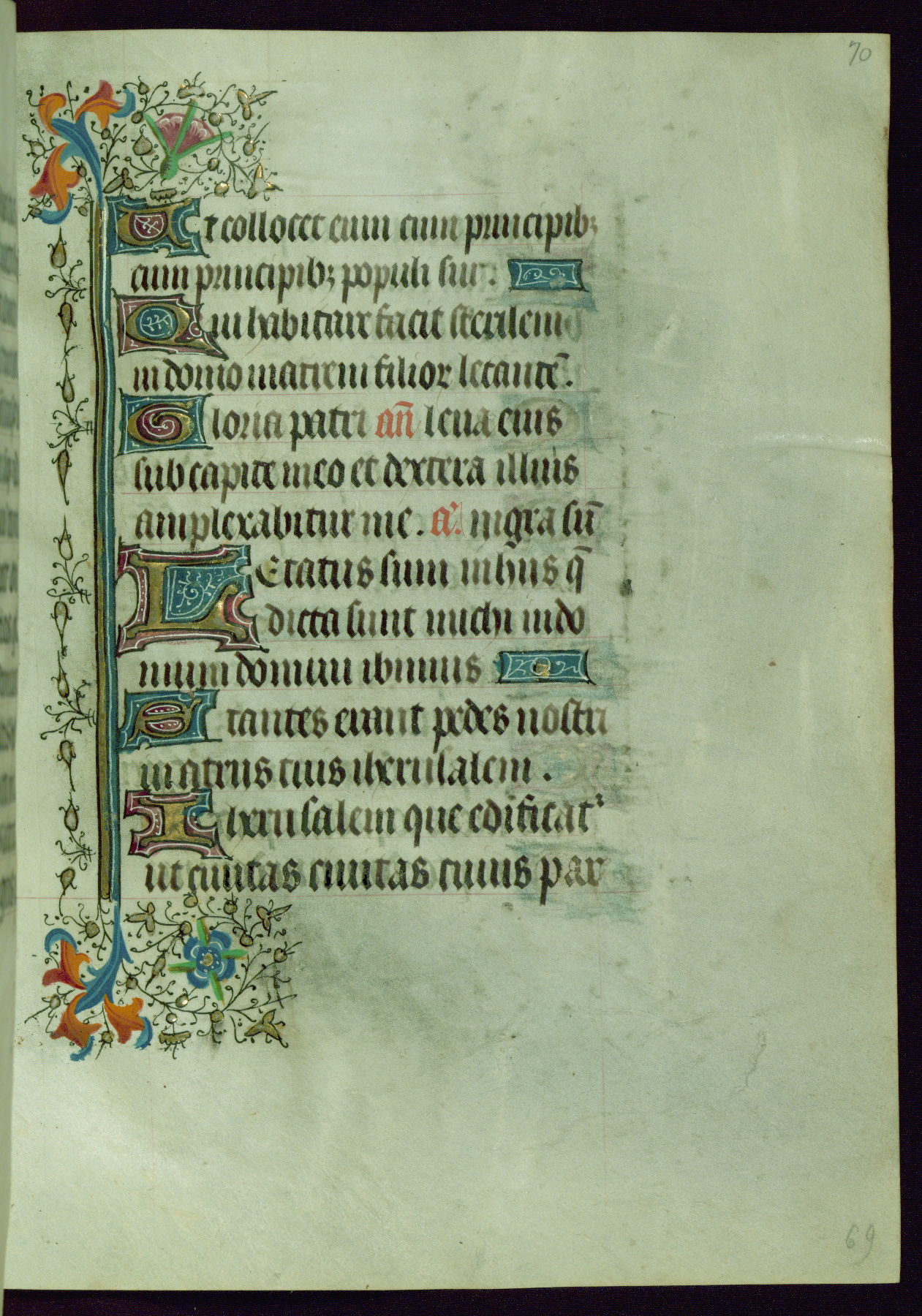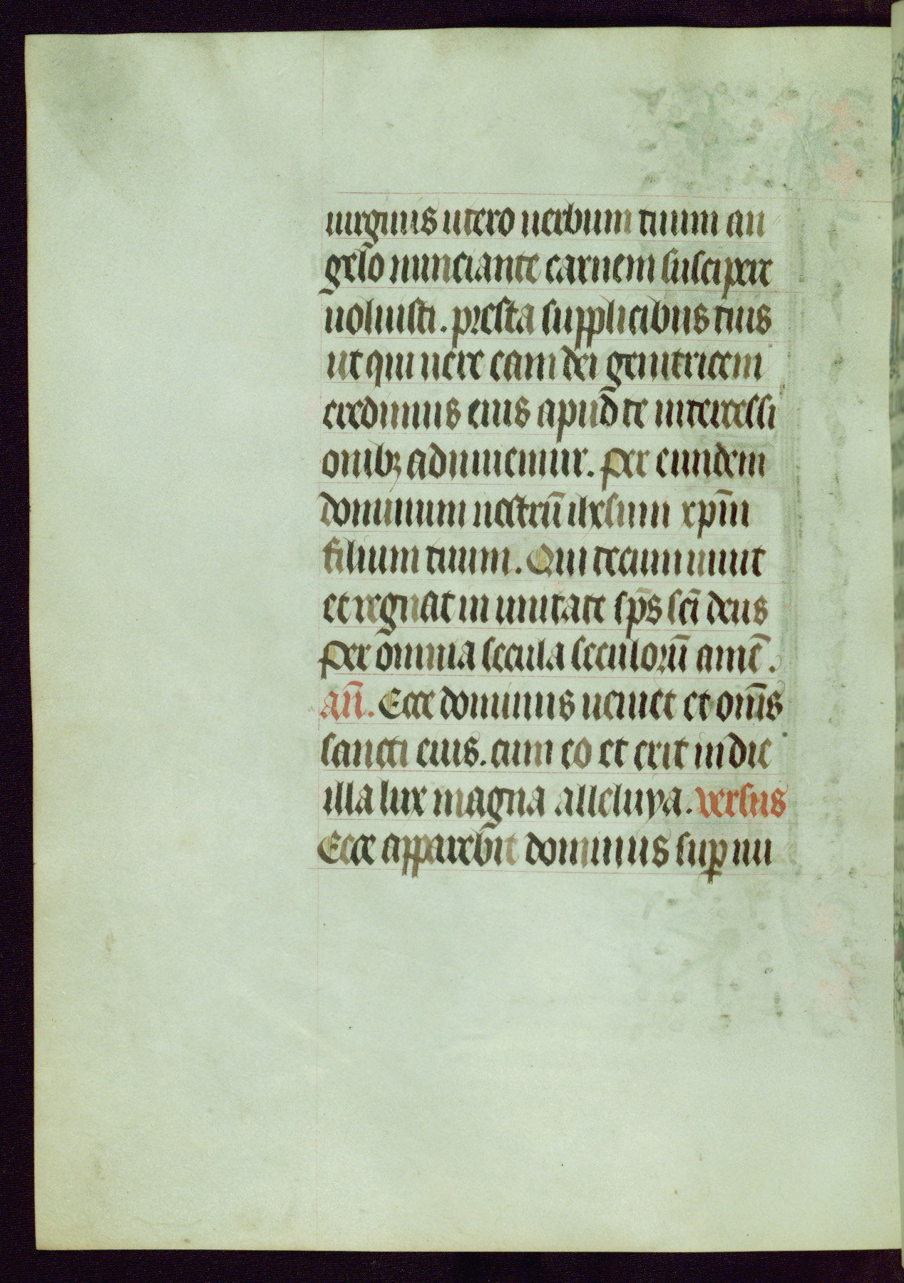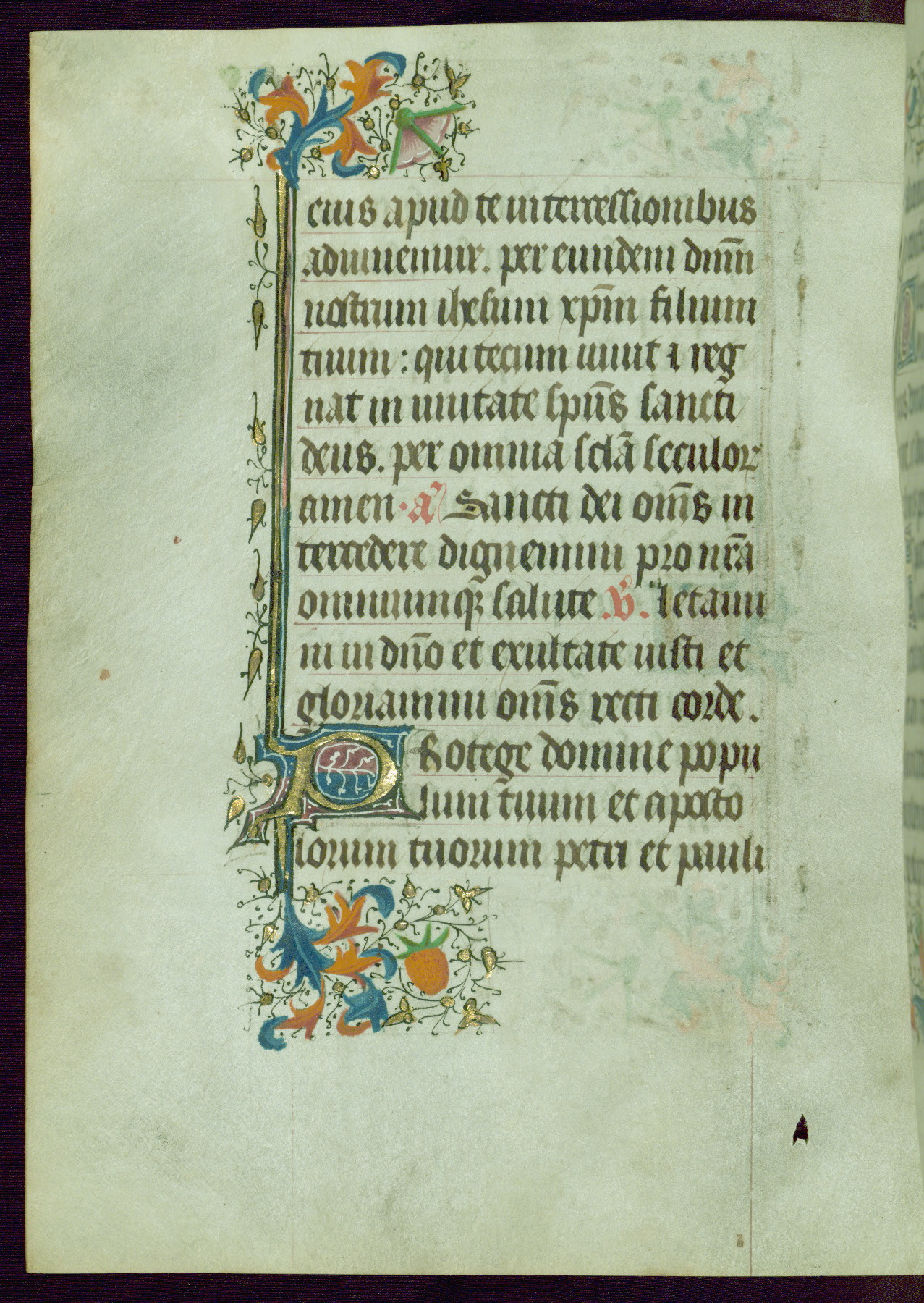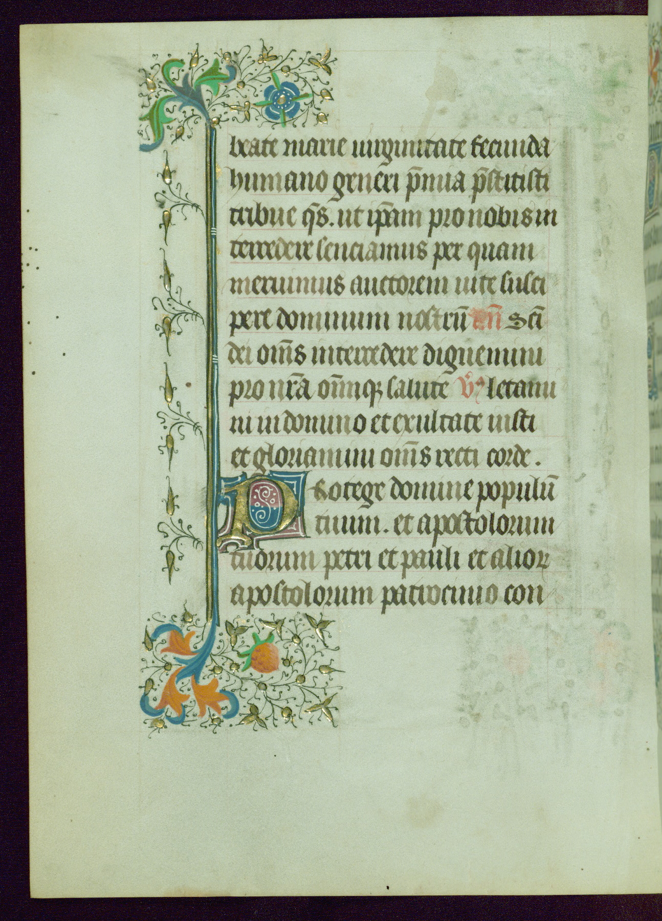 This Book of Hours was completed ca. 1440-50, and likely destined for Tournai. The decoration of this manuscript includes two full-page miniatures, eleven extant smaller miniatures, one historiated initial, and one drollery. The illumination is in the style of the Master of Guillebert de Mets, although the work would have been completed during the closing stage of Mets' career. The Master of Guillebert de Mets' principal disciple was the Master of the Ghent Privileges, with whom he may have been in collaboration, as indicated by numerous comparisons (see Dogaer 1987, 33-37). This book begins with a full-page miniature depicting the Mass of St. Gregory, a folio that appears to have been relocated from its original placement just before fol. 180 to its current location as fol. 2. It should be noted that fol. 2 has experienced extensive paint loss and has since been retouched, although it is unknown by whom or at what time. The unpretentious illumination program could have been the reason for this switch, perhaps to make the manuscript more appealing for a potential buyer.