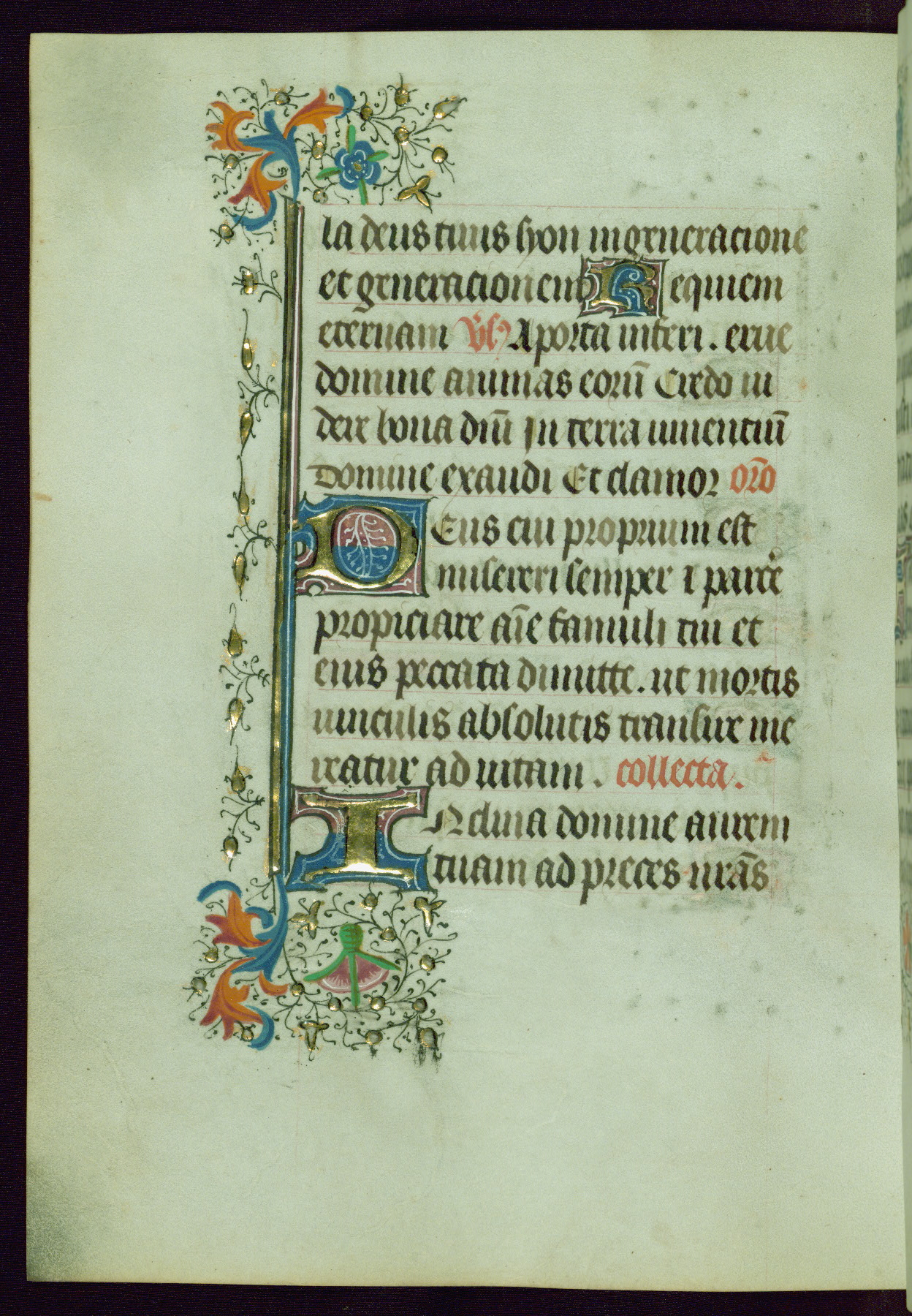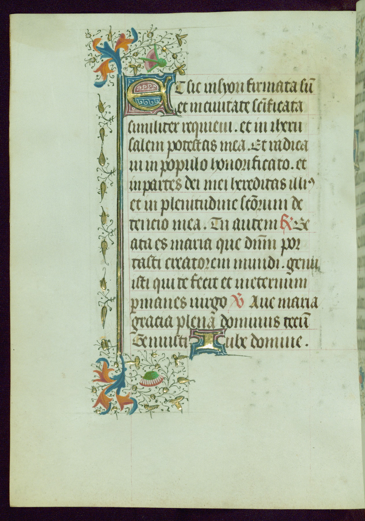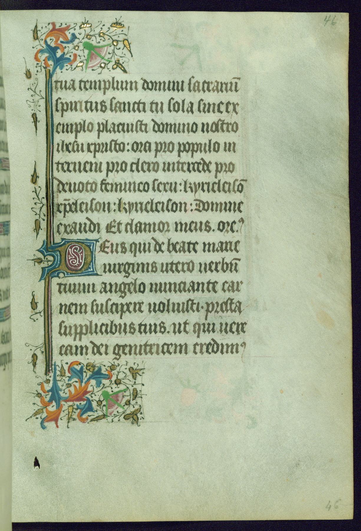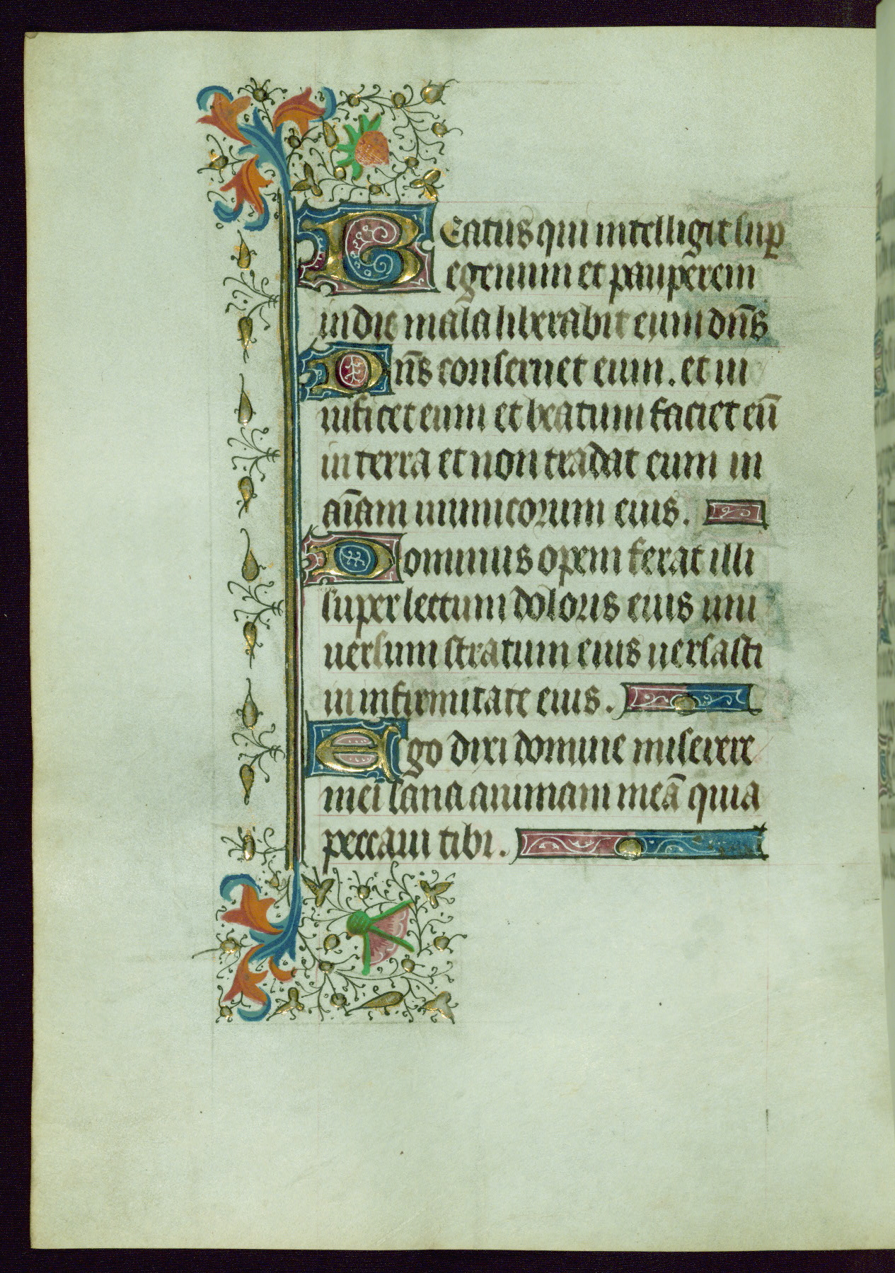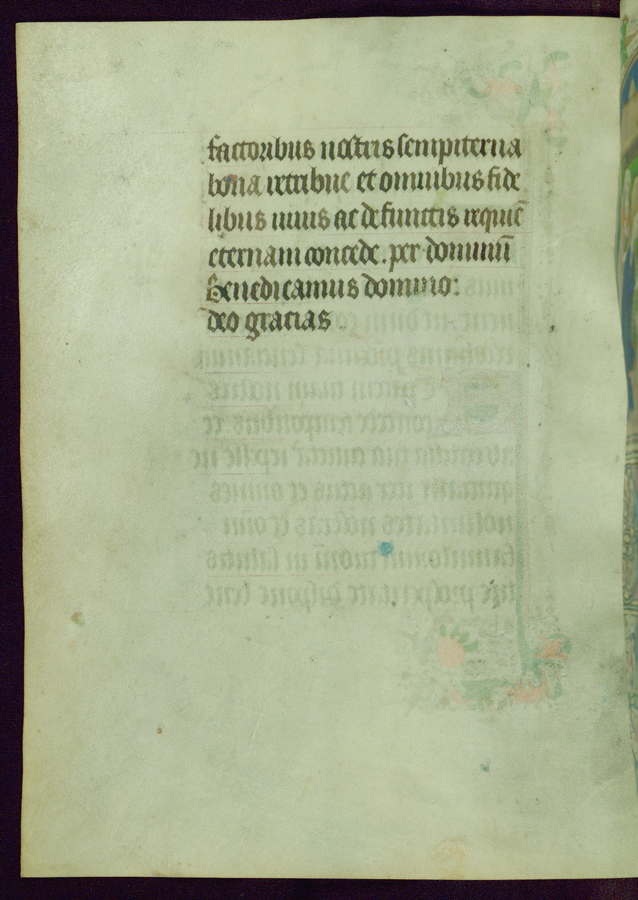 This Book of Hours was completed ca. 1440-50, and likely destined for Tournai. The decoration of this manuscript includes two full-page miniatures, eleven extant smaller miniatures, one historiated initial, and one drollery. The illumination is in the style of the Master of Guillebert de Mets, although the work would have been completed during the closing stage of Mets' career. The Master of Guillebert de Mets' principal disciple was the Master of the Ghent Privileges, with whom he may have been in collaboration, as indicated by numerous comparisons (see Dogaer 1987, 33-37). This book begins with a full-page miniature depicting the Mass of St. Gregory, a folio that appears to have been relocated from its original placement just before fol. 180 to its current location as fol. 2. It should be noted that fol. 2 has experienced extensive paint loss and has since been retouched, although it is unknown by whom or at what time. The unpretentious illumination program could have been the reason for this switch, perhaps to make the manuscript more appealing for a potential buyer.