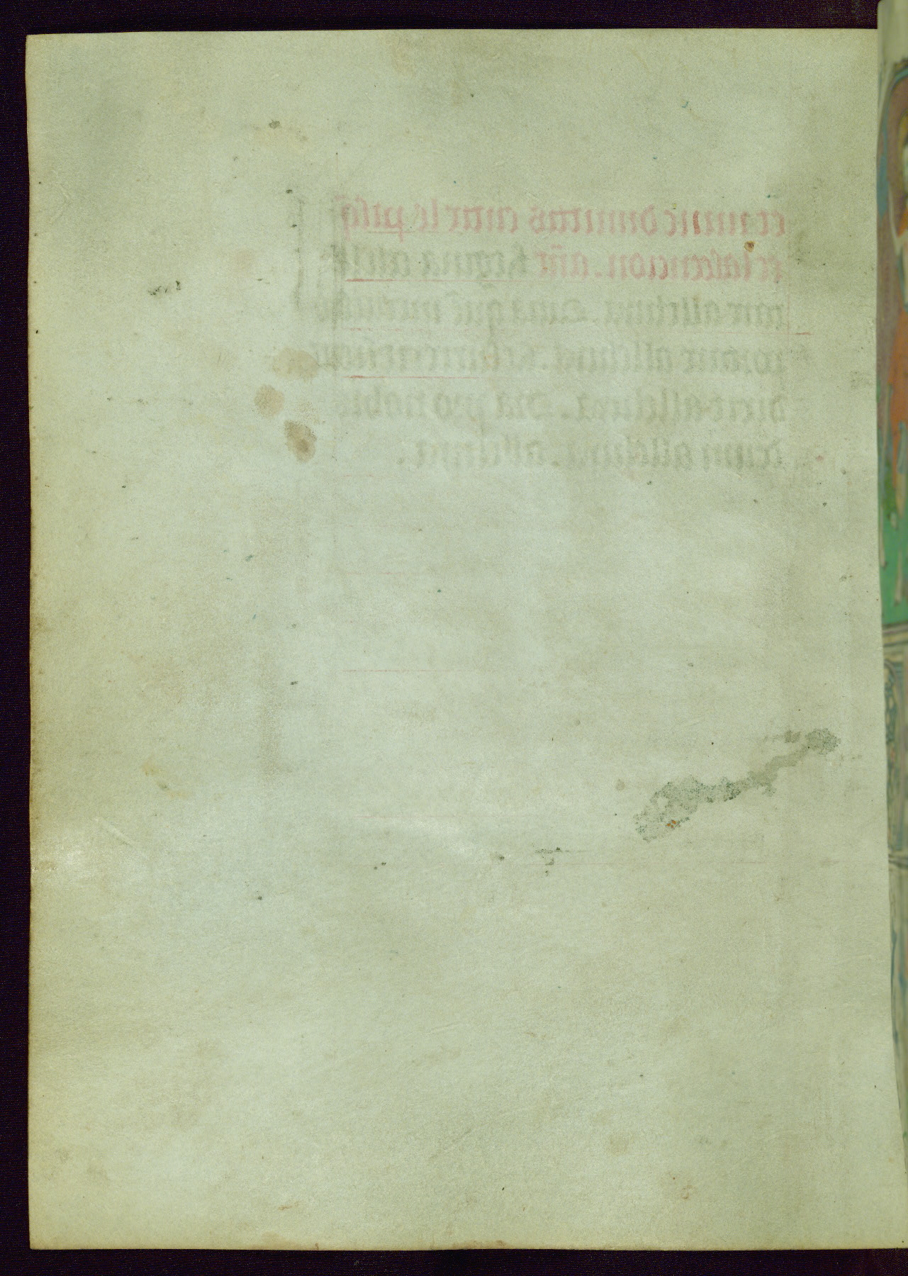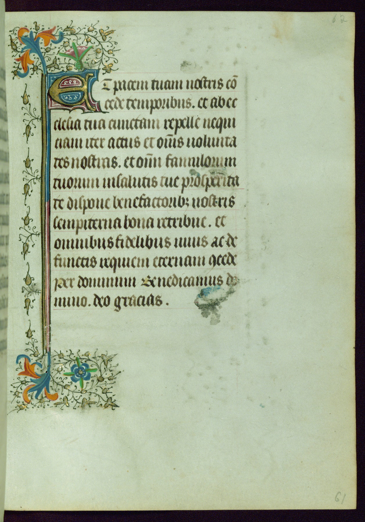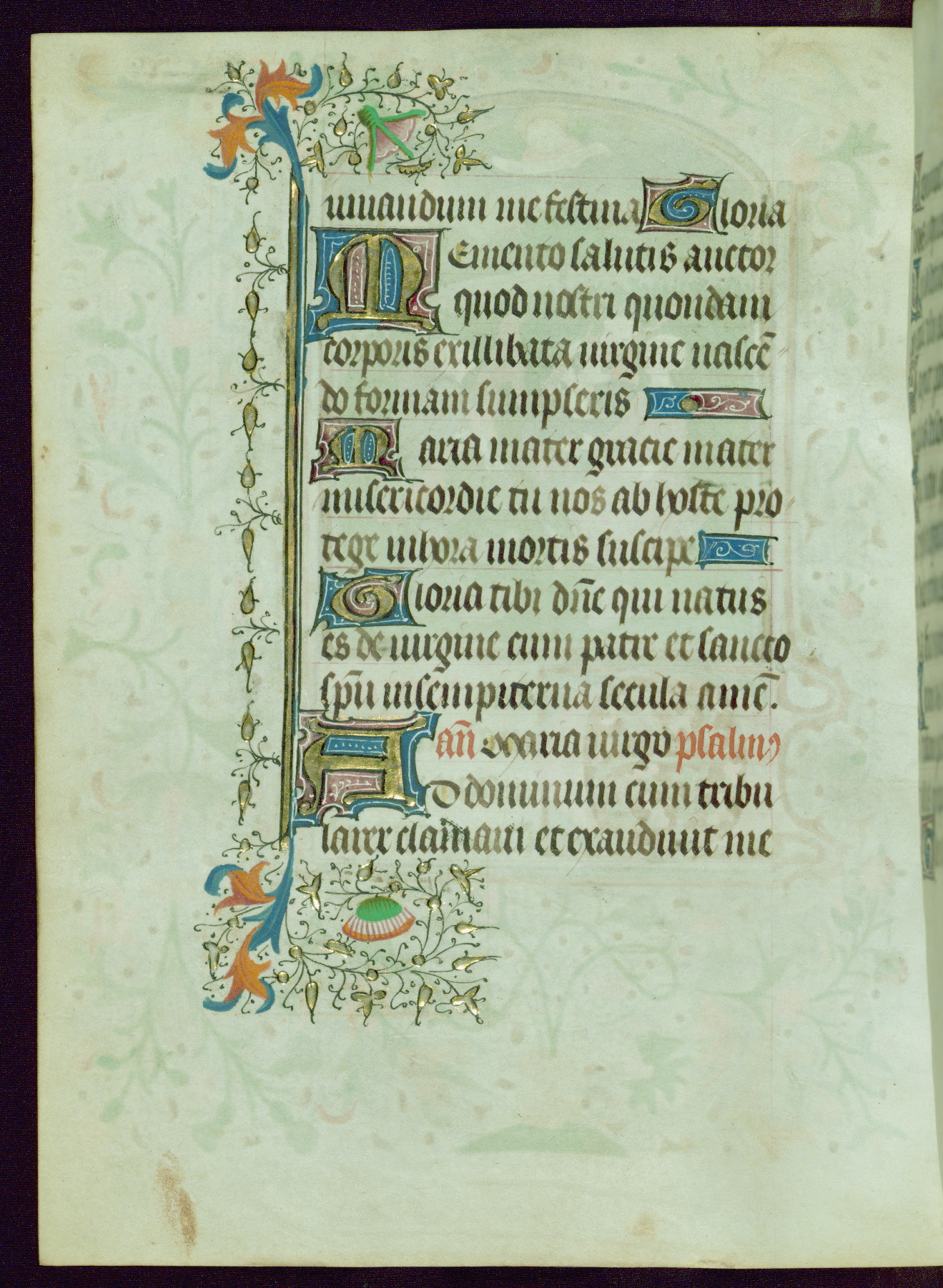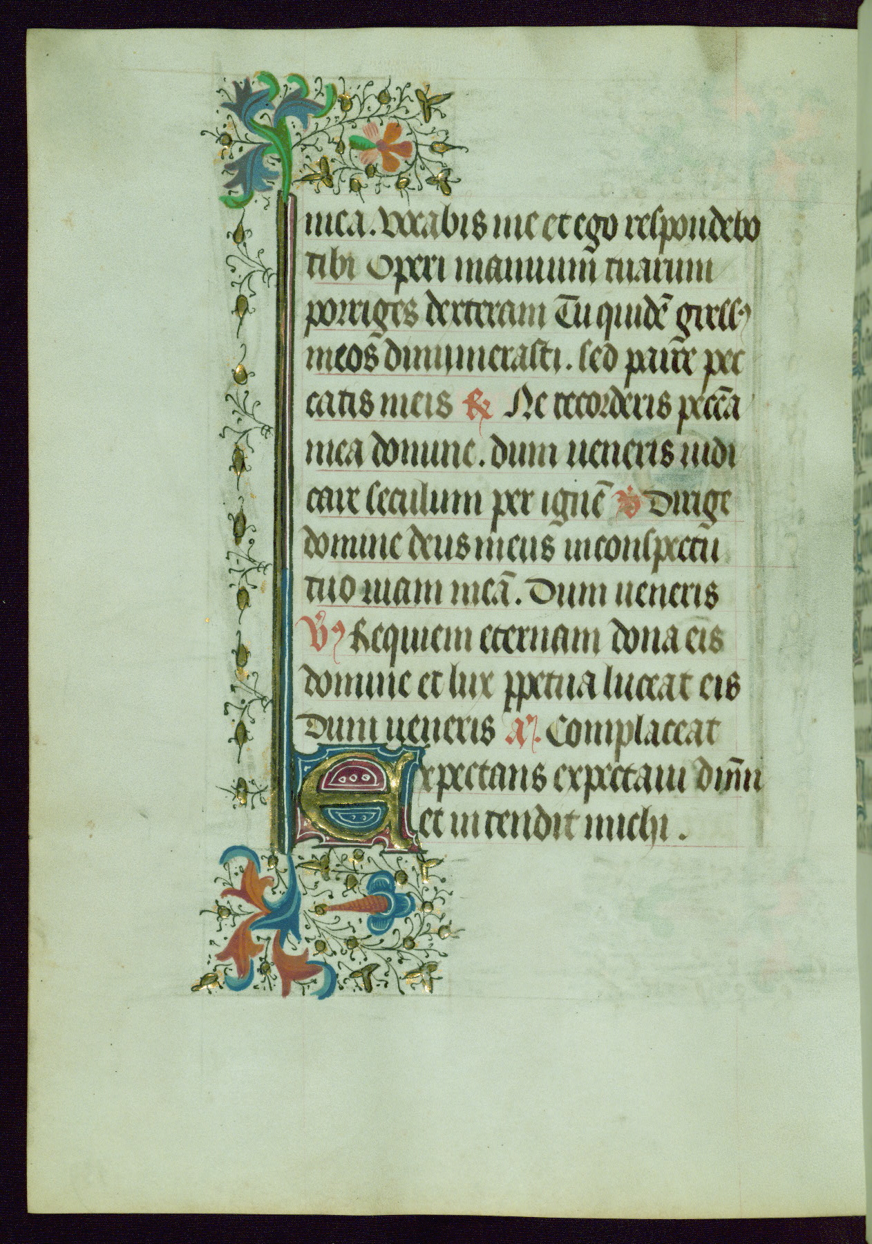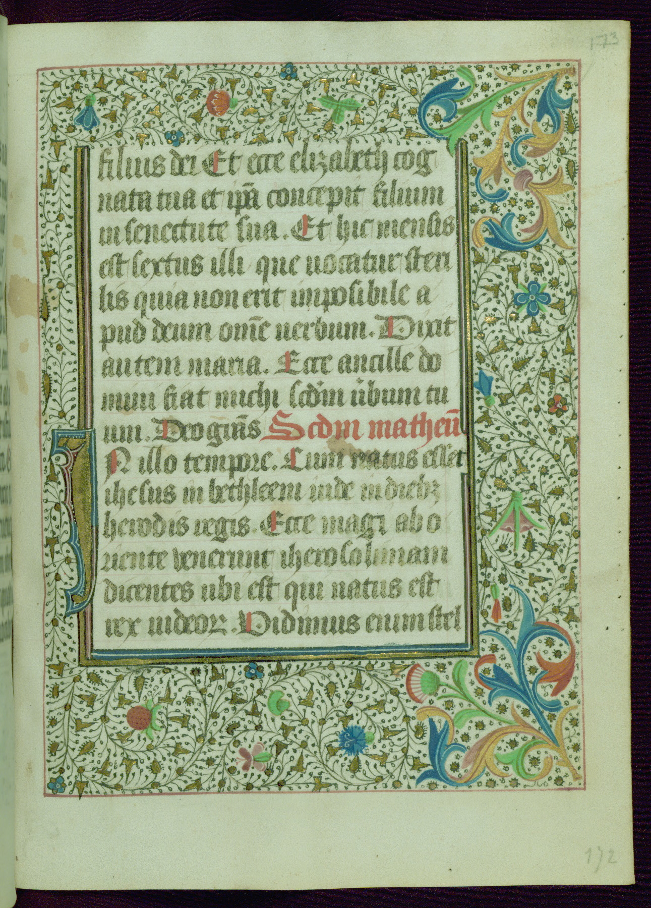 This Book of Hours was completed ca. 1440-50, and likely destined for Tournai. The decoration of this manuscript includes two full-page miniatures, eleven extant smaller miniatures, one historiated initial, and one drollery. The illumination is in the style of the Master of Guillebert de Mets, although the work would have been completed during the closing stage of Mets' career. The Master of Guillebert de Mets' principal disciple was the Master of the Ghent Privileges, with whom he may have been in collaboration, as indicated by numerous comparisons (see Dogaer 1987, 33-37). This book begins with a full-page miniature depicting the Mass of St. Gregory, a folio that appears to have been relocated from its original placement just before fol. 180 to its current location as fol. 2. It should be noted that fol. 2 has experienced extensive paint loss and has since been retouched, although it is unknown by whom or at what time. The unpretentious illumination program could have been the reason for this switch, perhaps to make the manuscript more appealing for a potential buyer.
