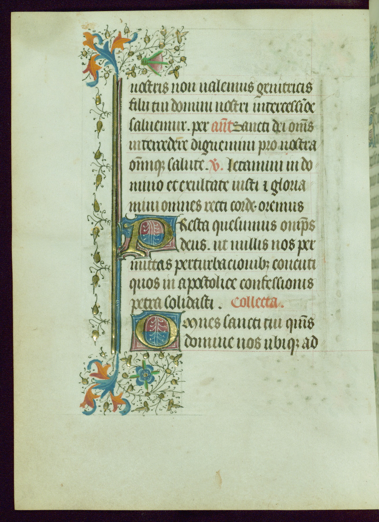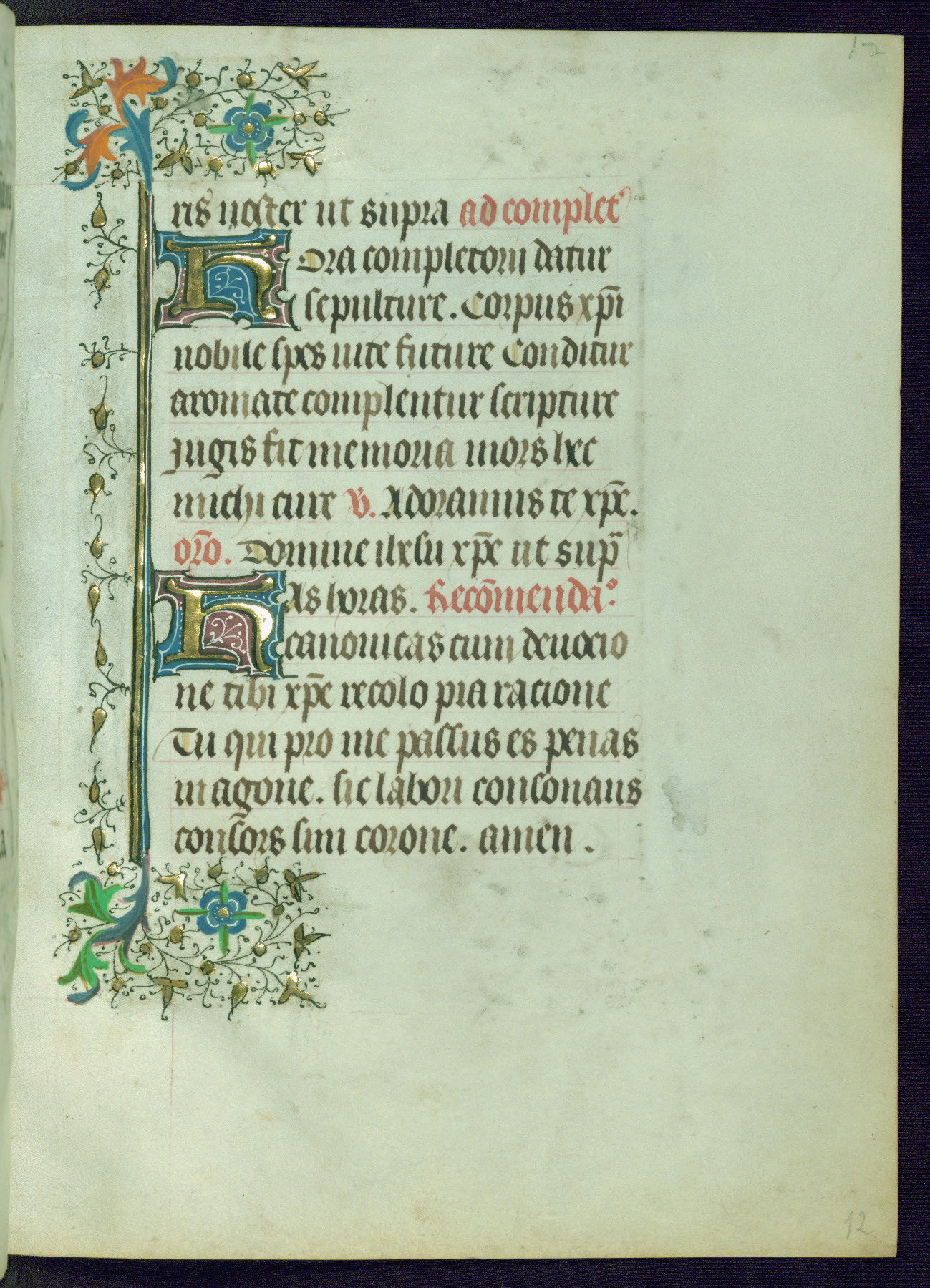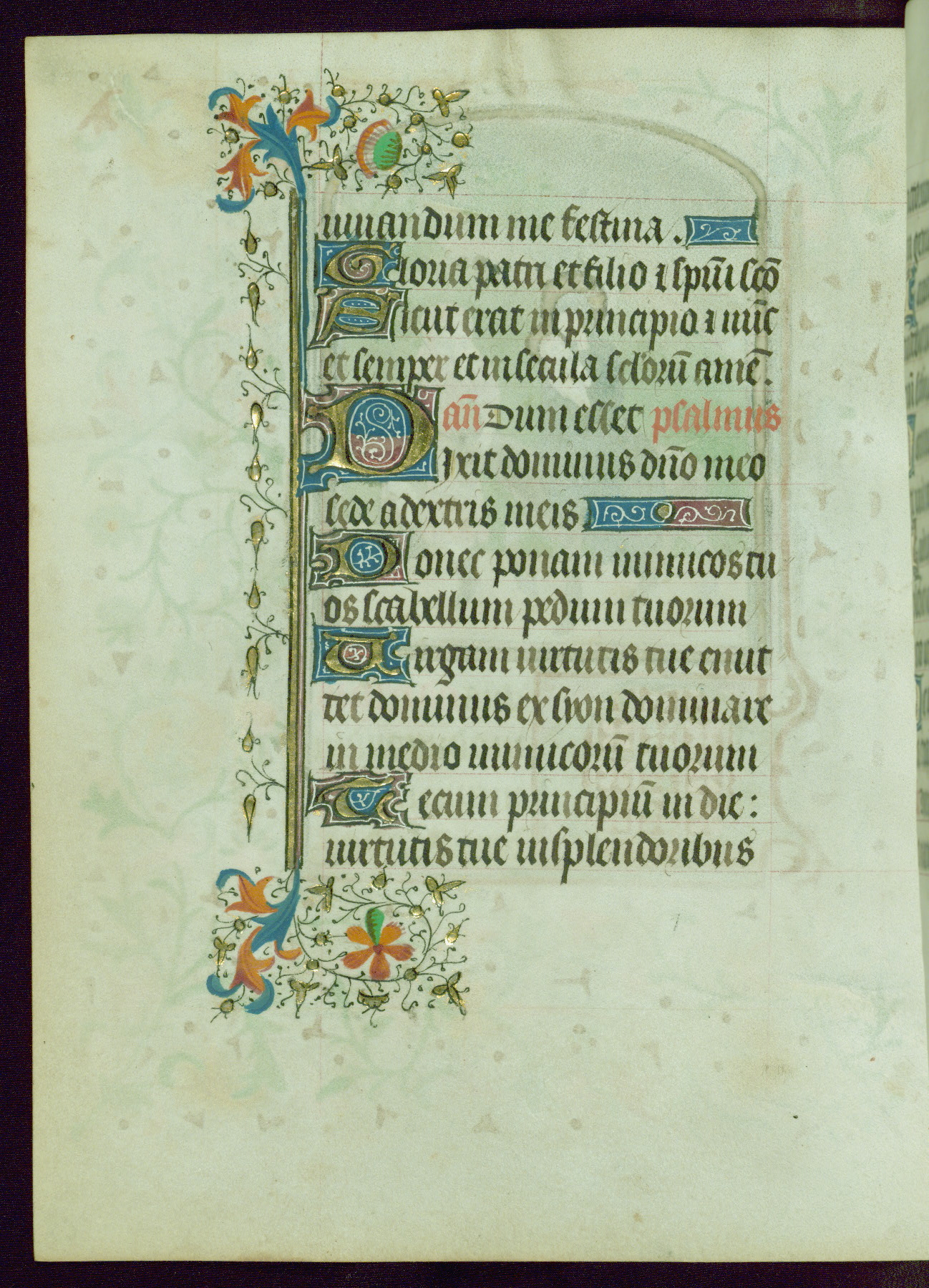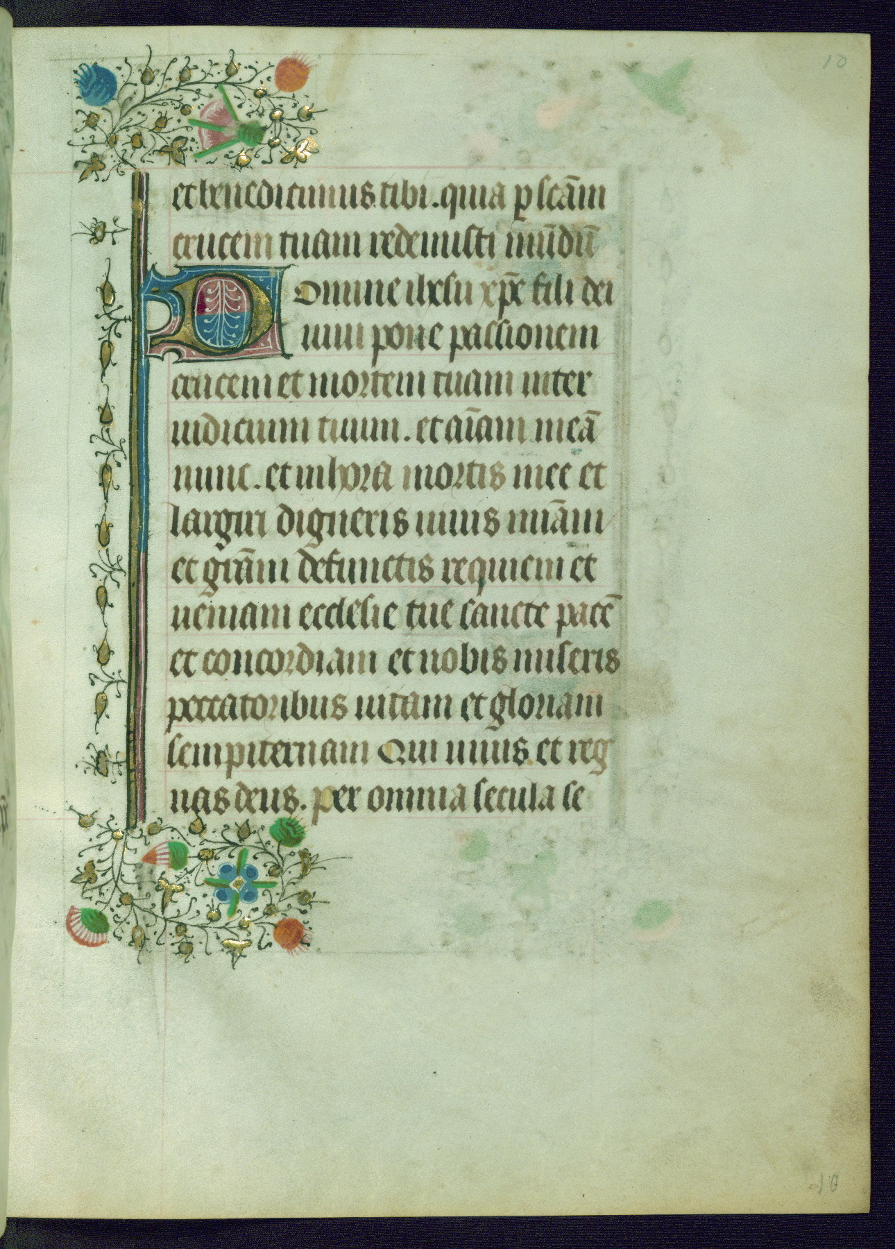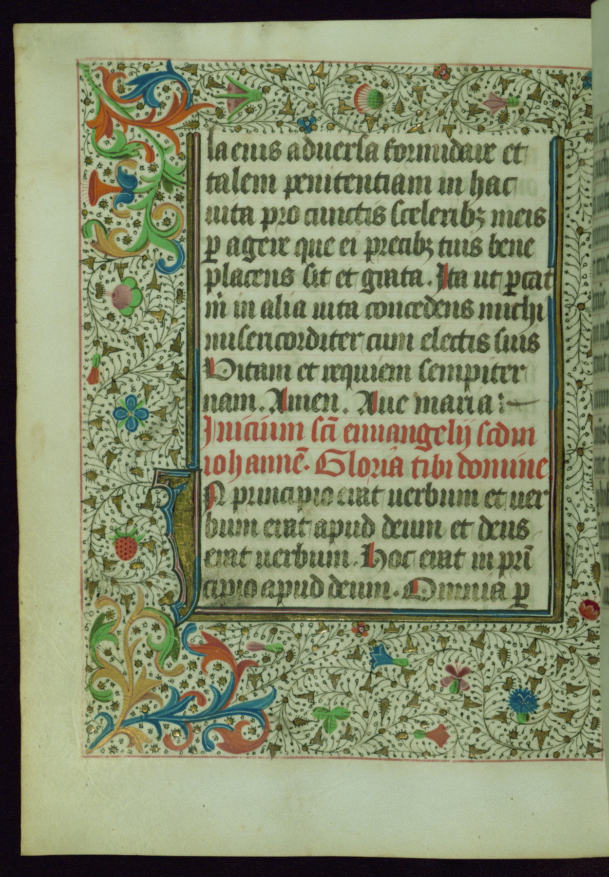 This Book of Hours was completed ca. 1440-50, and likely destined for Tournai. The decoration of this manuscript includes two full-page miniatures, eleven extant smaller miniatures, one historiated initial, and one drollery. The illumination is in the style of the Master of Guillebert de Mets, although the work would have been completed during the closing stage of Mets' career. The Master of Guillebert de Mets' principal disciple was the Master of the Ghent Privileges, with whom he may have been in collaboration, as indicated by numerous comparisons (see Dogaer 1987, 33-37). This book begins with a full-page miniature depicting the Mass of St. Gregory, a folio that appears to have been relocated from its original placement just before fol. 180 to its current location as fol. 2. It should be noted that fol. 2 has experienced extensive paint loss and has since been retouched, although it is unknown by whom or at what time. The unpretentious illumination program could have been the reason for this switch, perhaps to make the manuscript more appealing for a potential buyer.