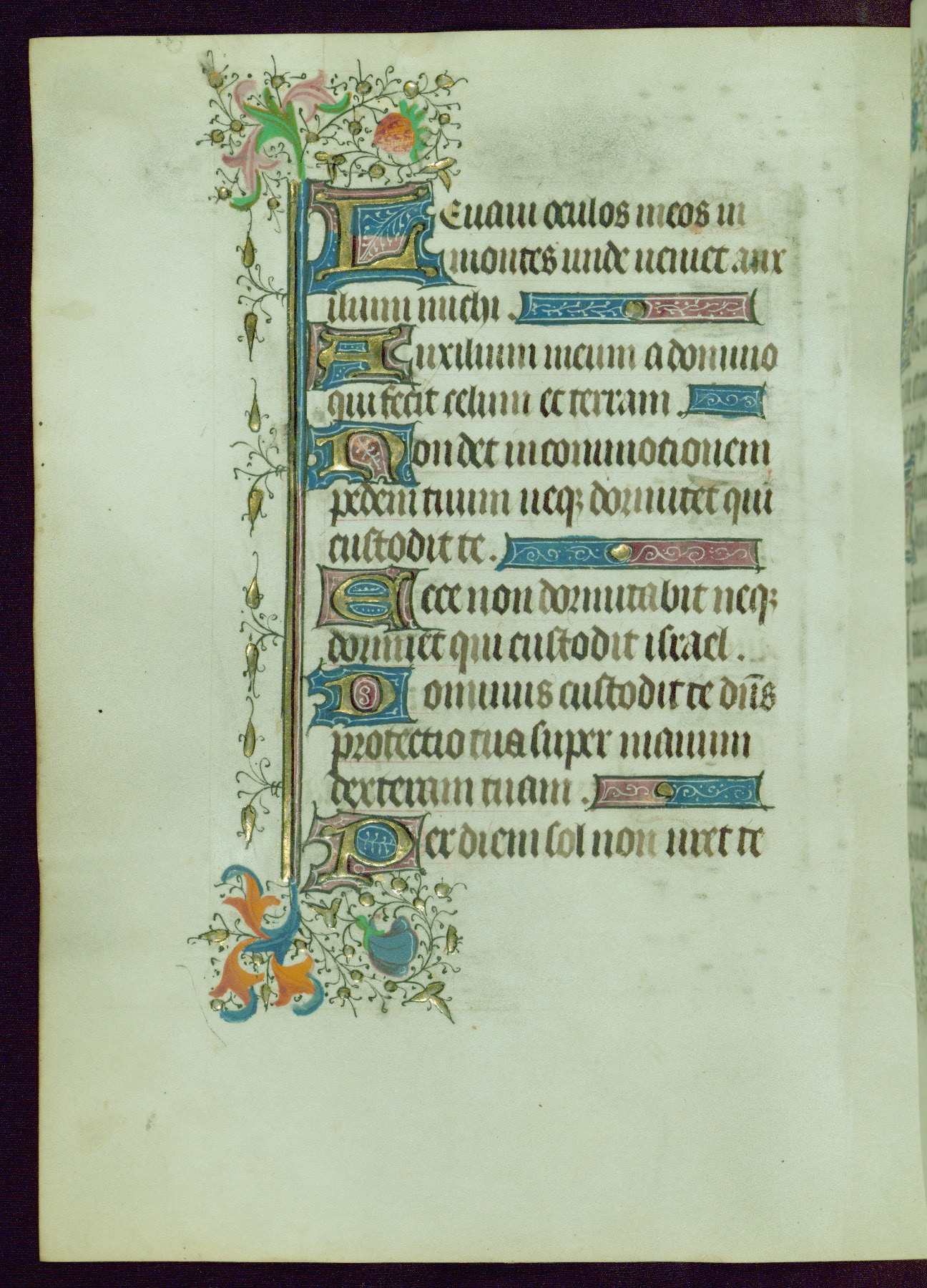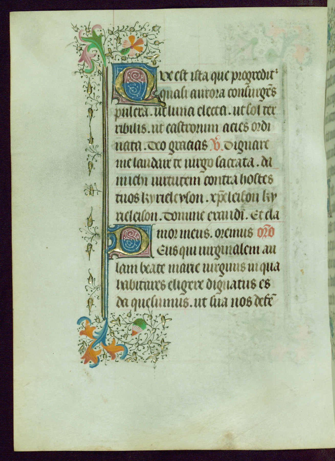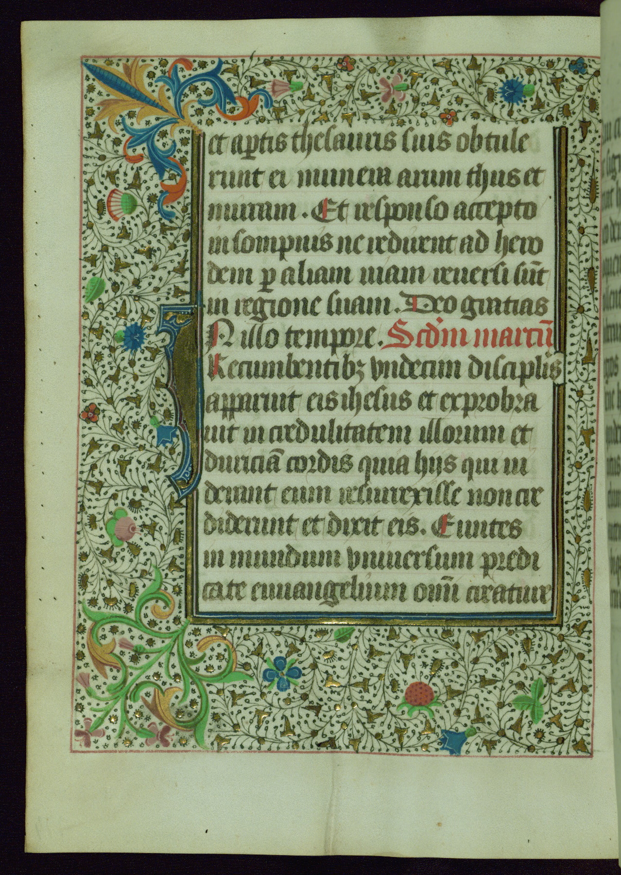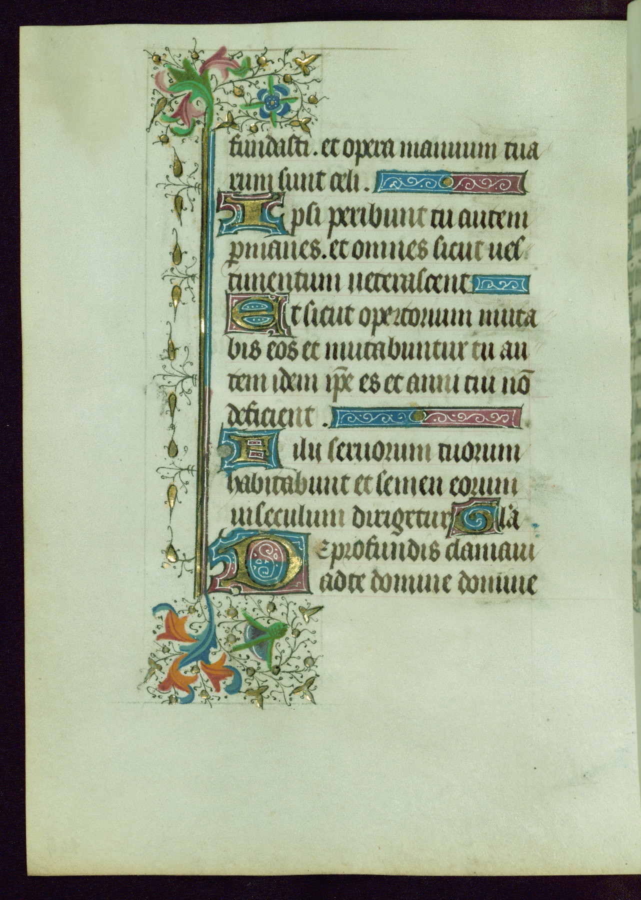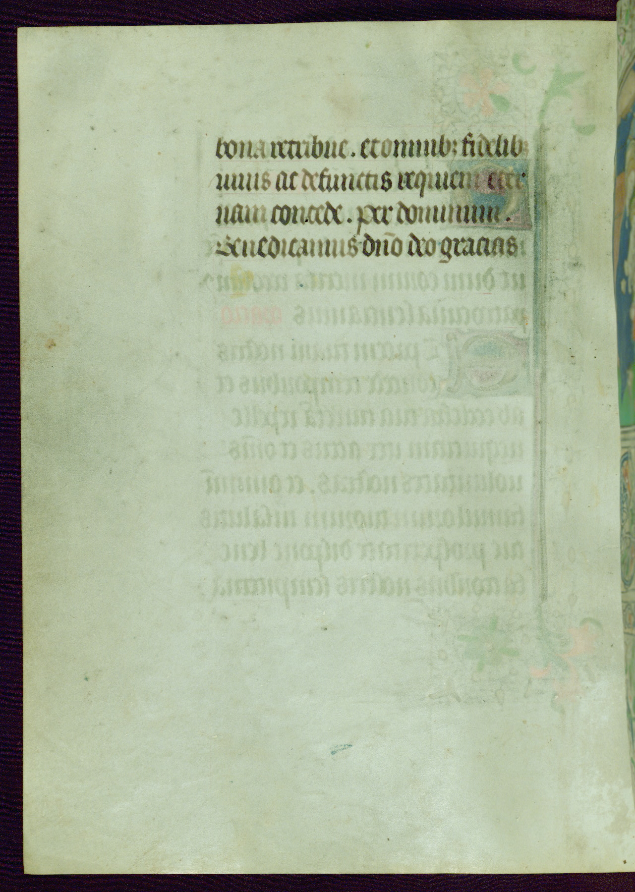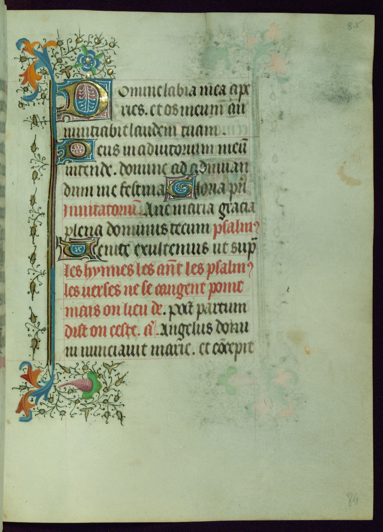 This Book of Hours was completed ca. 1440-50, and likely destined for Tournai. The decoration of this manuscript includes two full-page miniatures, eleven extant smaller miniatures, one historiated initial, and one drollery. The illumination is in the style of the Master of Guillebert de Mets, although the work would have been completed during the closing stage of Mets' career. The Master of Guillebert de Mets' principal disciple was the Master of the Ghent Privileges, with whom he may have been in collaboration, as indicated by numerous comparisons (see Dogaer 1987, 33-37). This book begins with a full-page miniature depicting the Mass of St. Gregory, a folio that appears to have been relocated from its original placement just before fol. 180 to its current location as fol. 2. It should be noted that fol. 2 has experienced extensive paint loss and has since been retouched, although it is unknown by whom or at what time. The unpretentious illumination program could have been the reason for this switch, perhaps to make the manuscript more appealing for a potential buyer.