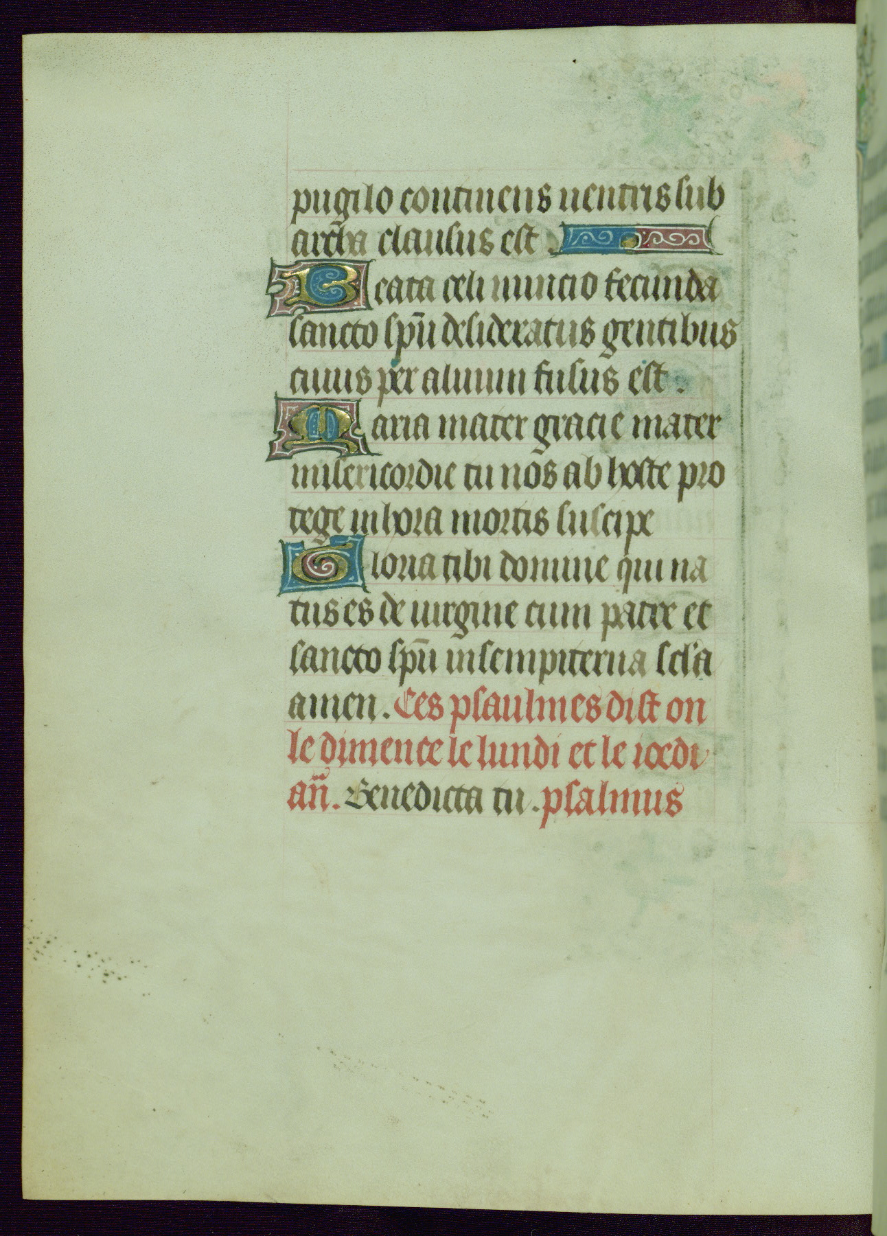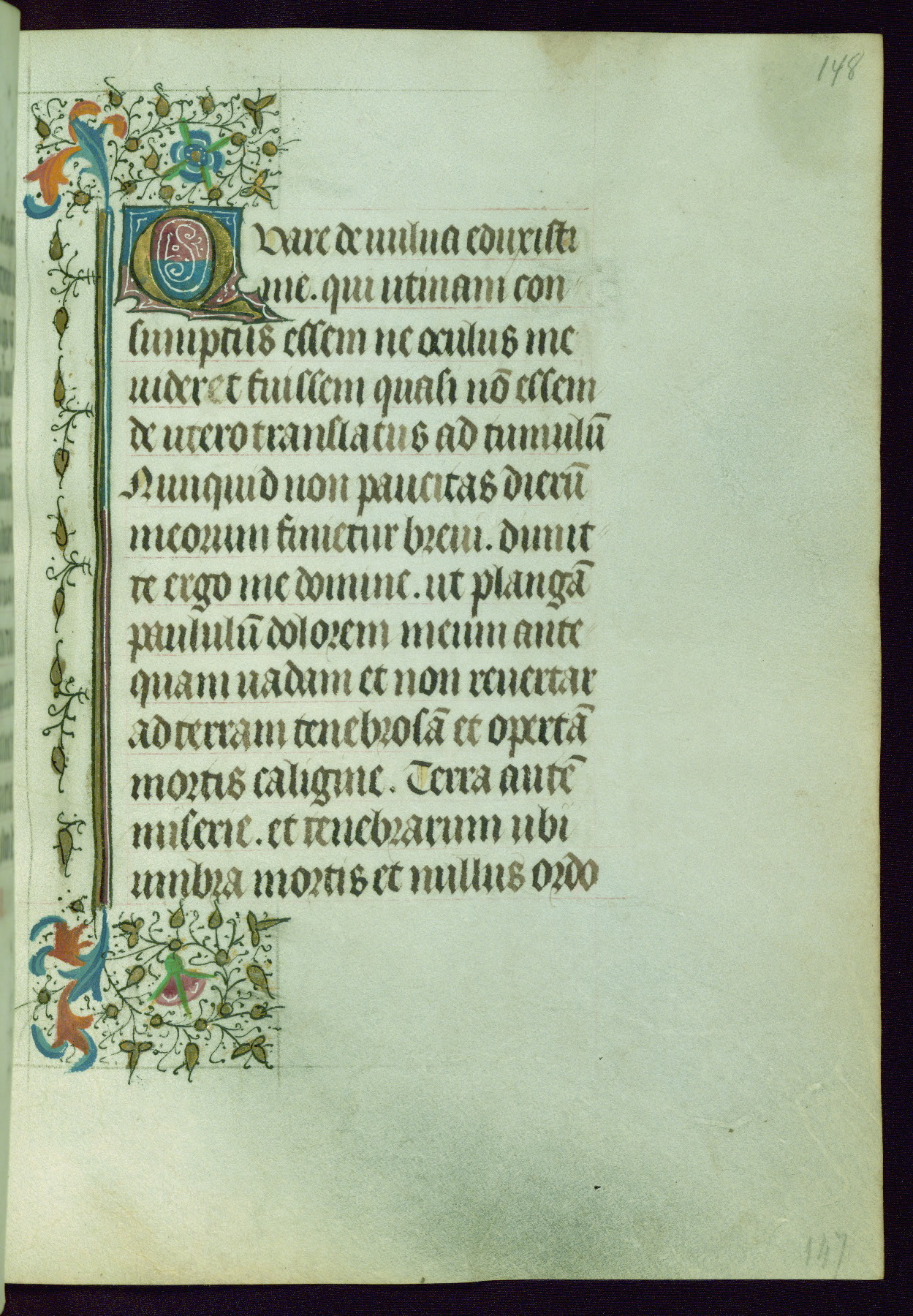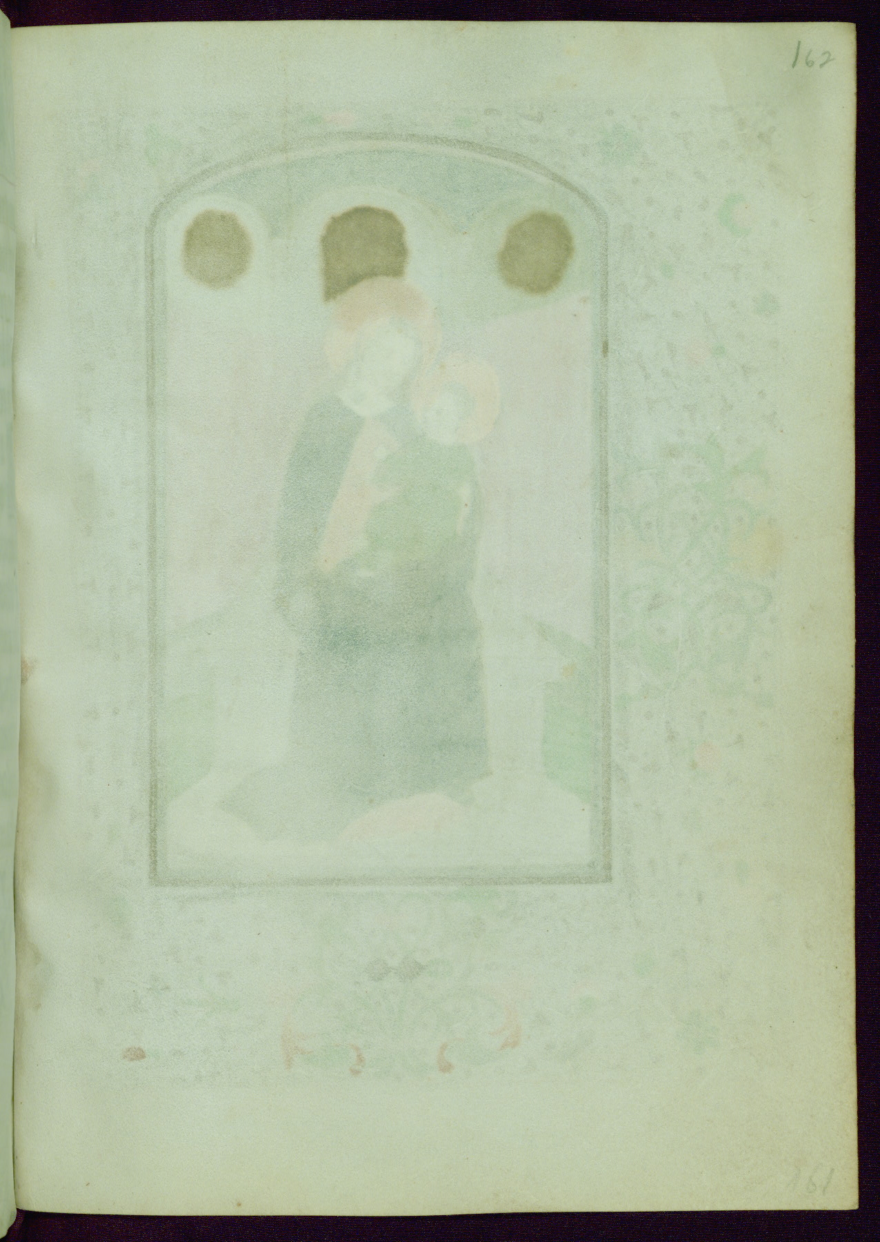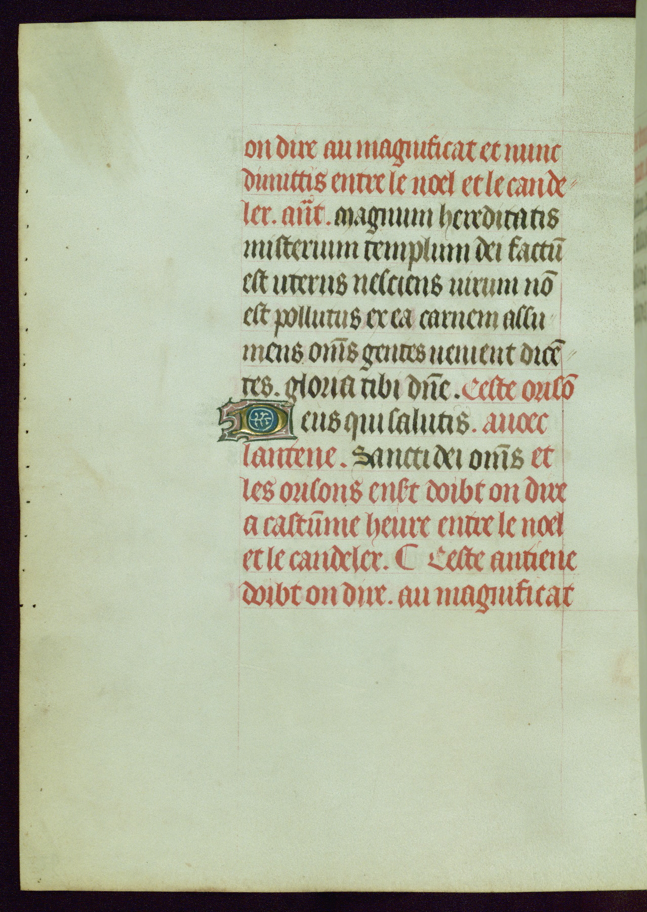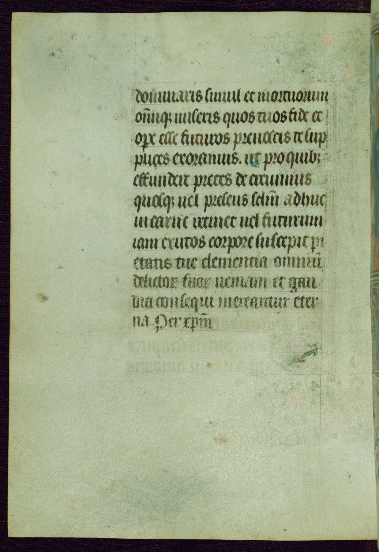 This Book of Hours was completed ca. 1440-50, and likely destined for Tournai. The decoration of this manuscript includes two full-page miniatures, eleven extant smaller miniatures, one historiated initial, and one drollery. The illumination is in the style of the Master of Guillebert de Mets, although the work would have been completed during the closing stage of Mets' career. The Master of Guillebert de Mets' principal disciple was the Master of the Ghent Privileges, with whom he may have been in collaboration, as indicated by numerous comparisons (see Dogaer 1987, 33-37). This book begins with a full-page miniature depicting the Mass of St. Gregory, a folio that appears to have been relocated from its original placement just before fol. 180 to its current location as fol. 2. It should be noted that fol. 2 has experienced extensive paint loss and has since been retouched, although it is unknown by whom or at what time. The unpretentious illumination program could have been the reason for this switch, perhaps to make the manuscript more appealing for a potential buyer.