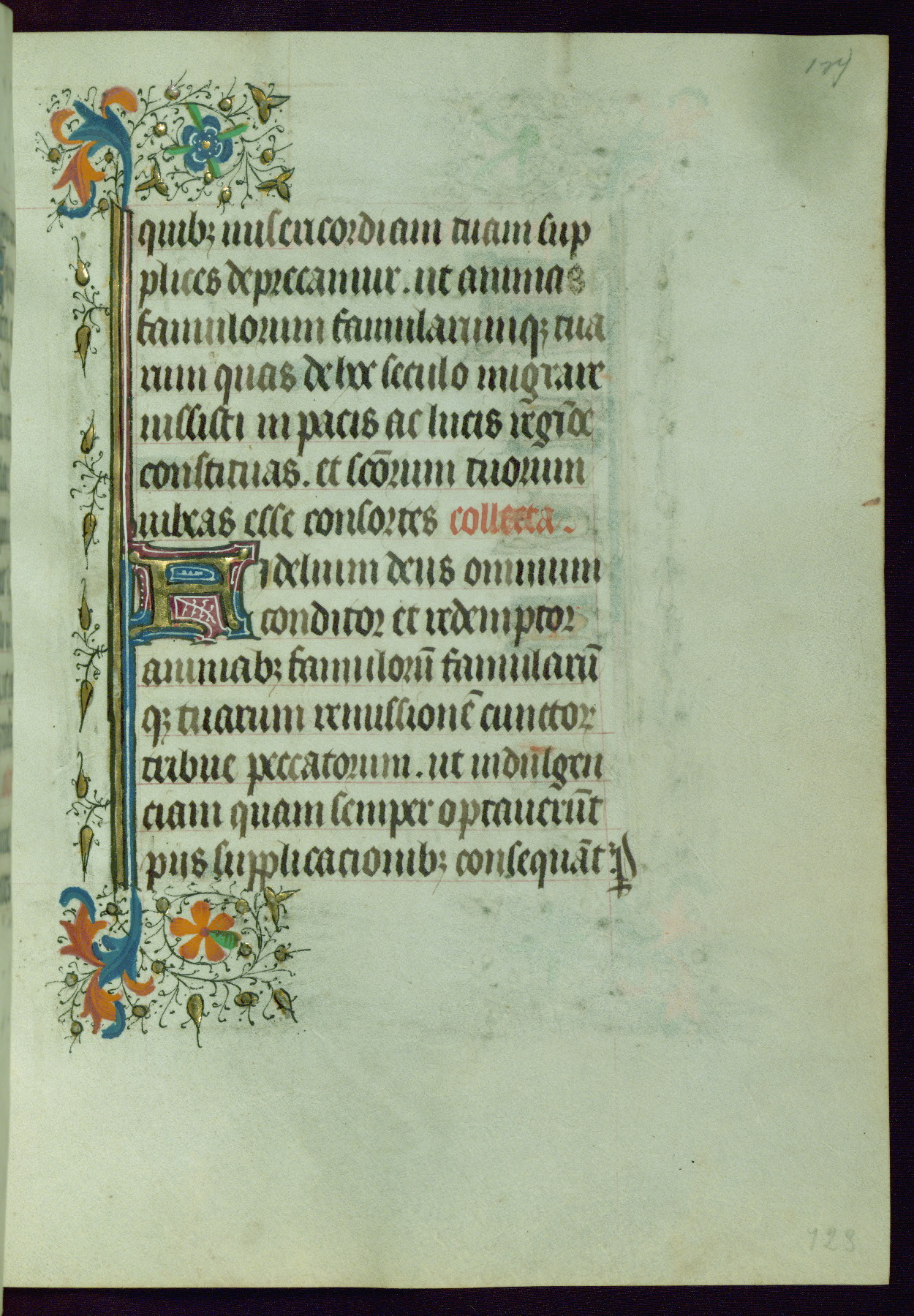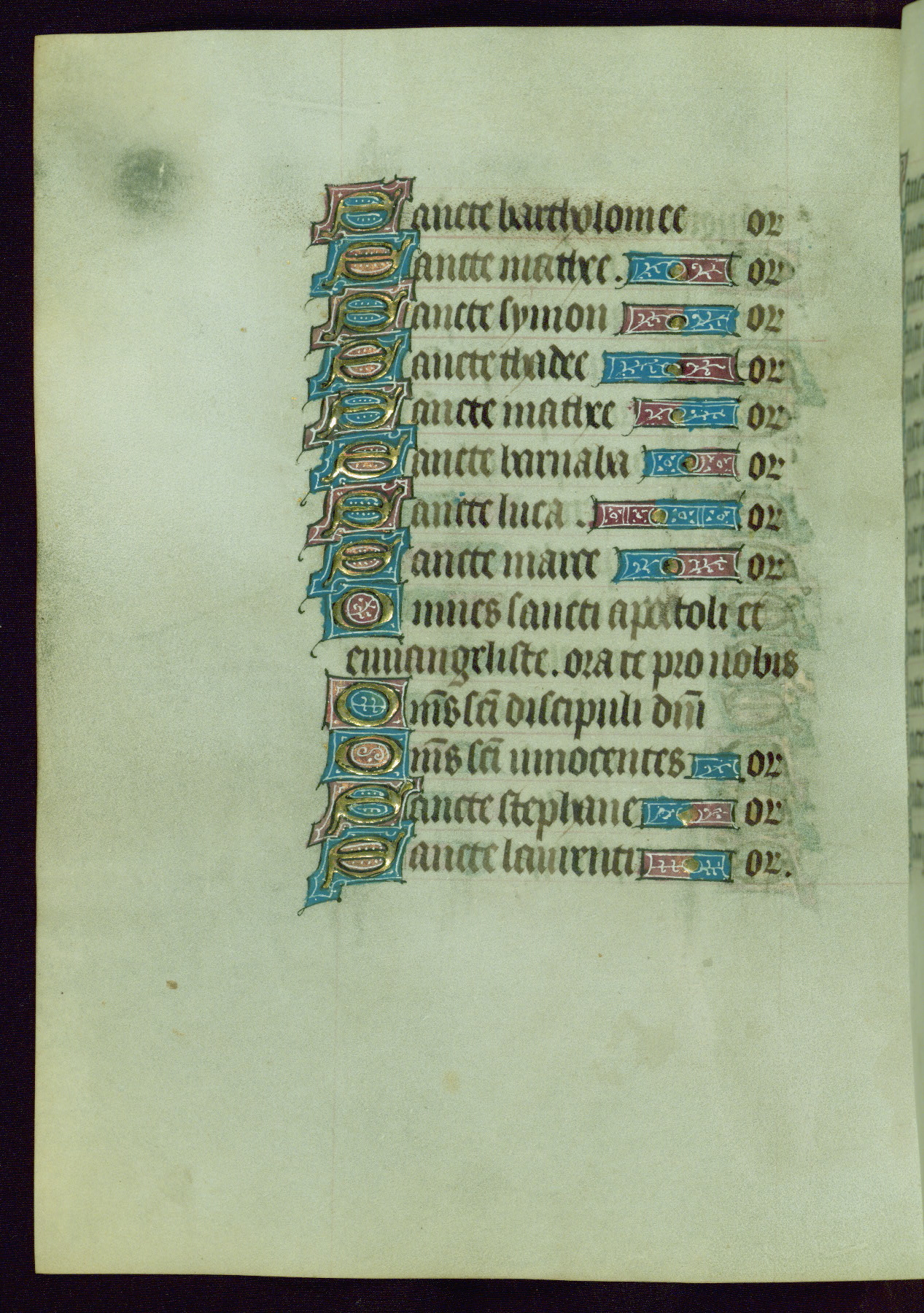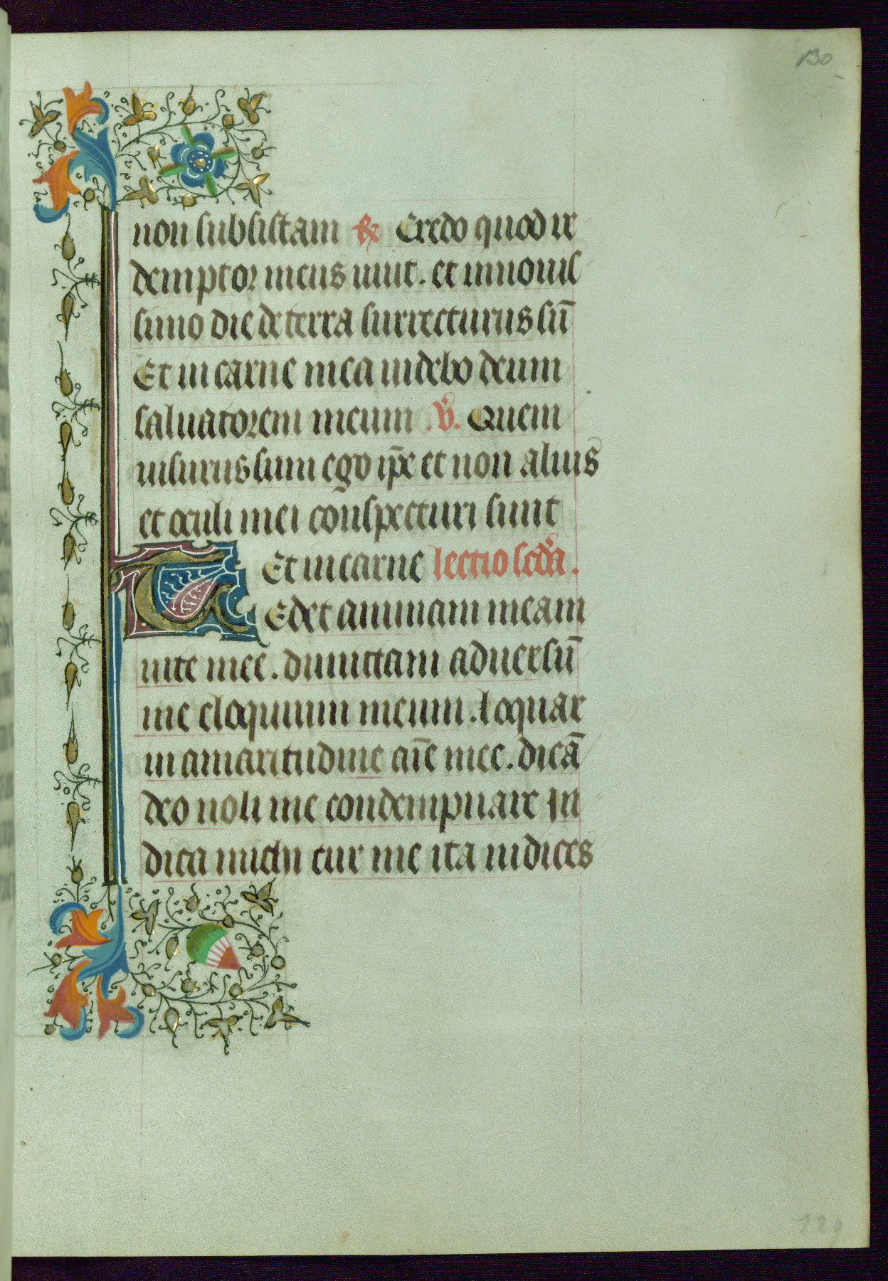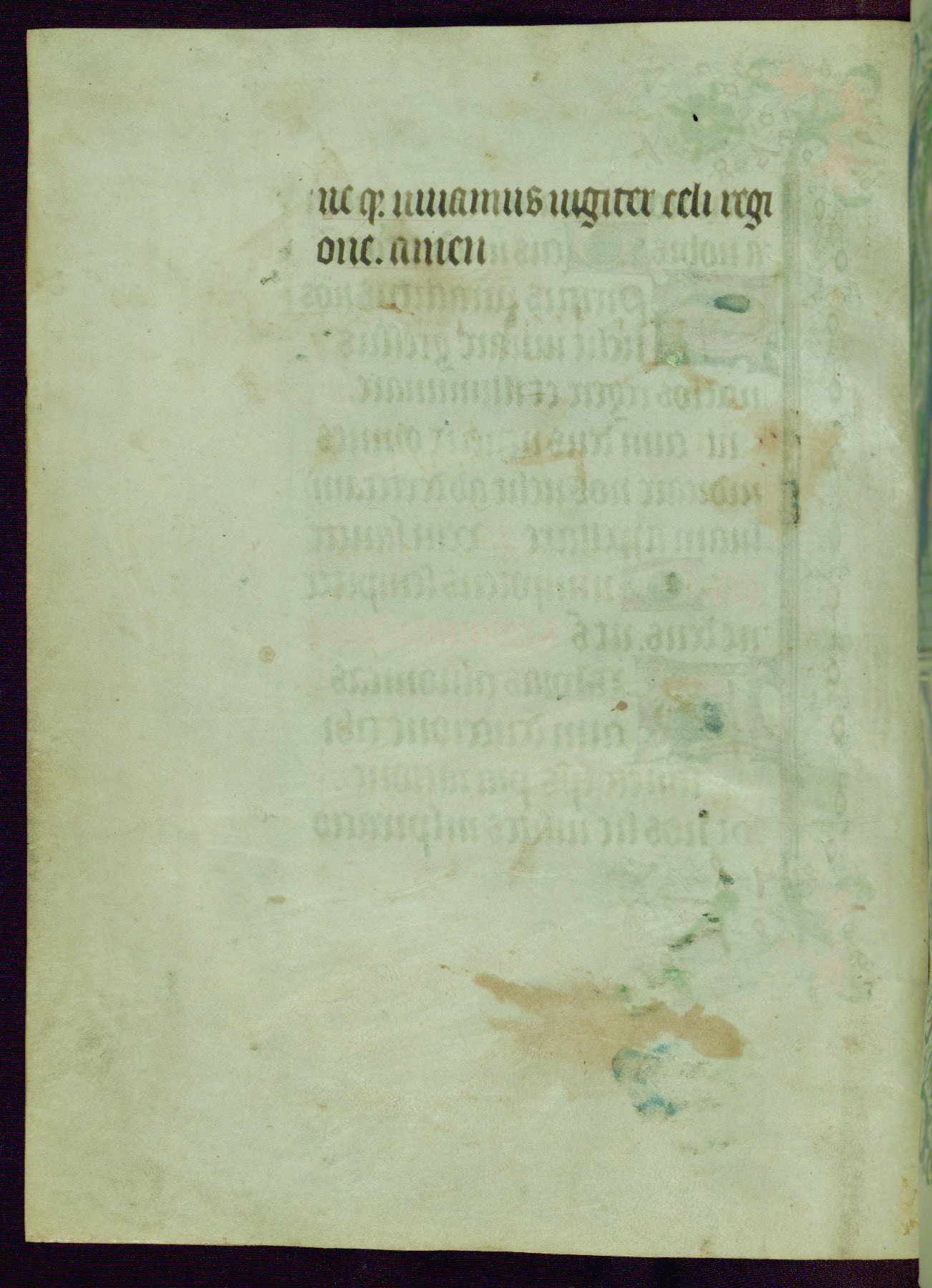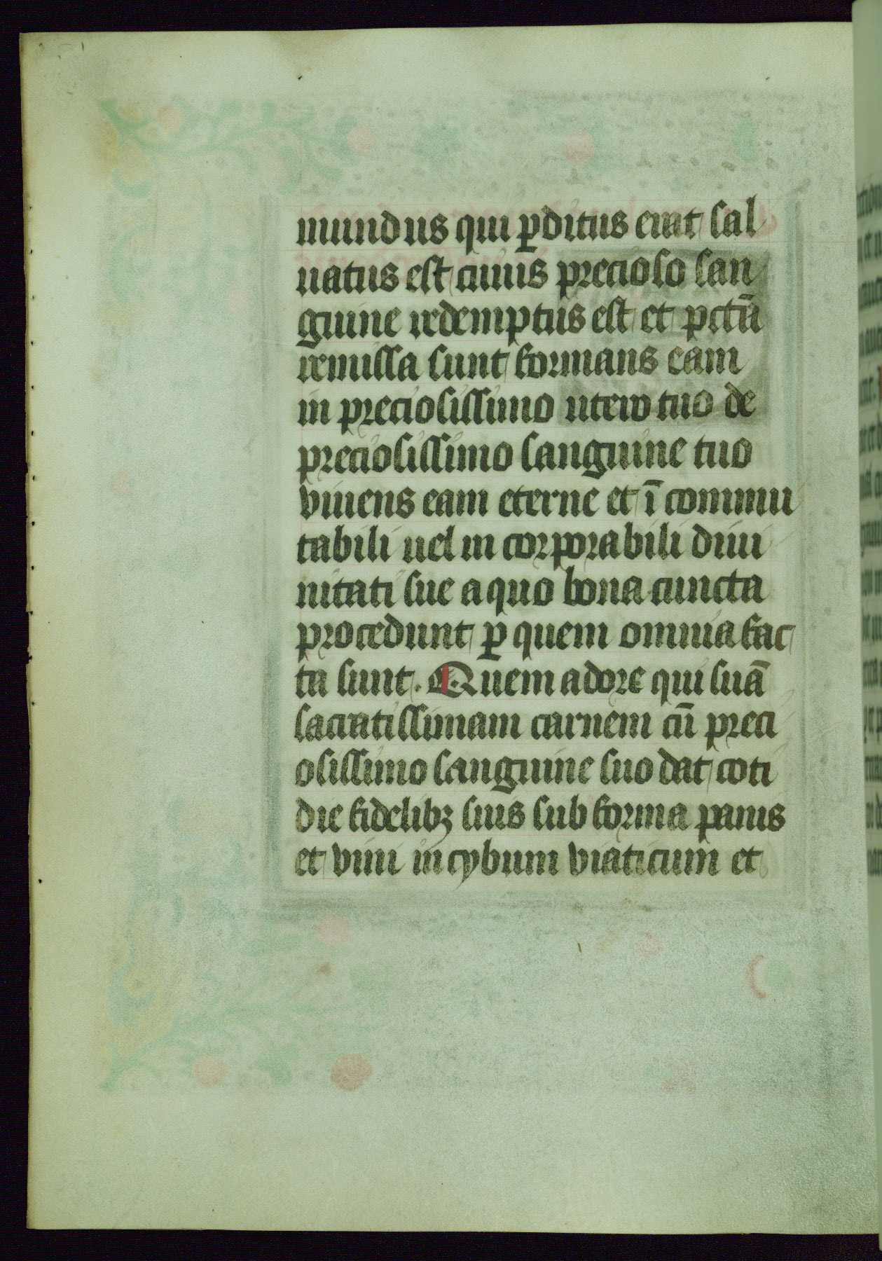 This Book of Hours was completed ca. 1440-50, and likely destined for Tournai. The decoration of this manuscript includes two full-page miniatures, eleven extant smaller miniatures, one historiated initial, and one drollery. The illumination is in the style of the Master of Guillebert de Mets, although the work would have been completed during the closing stage of Mets' career. The Master of Guillebert de Mets' principal disciple was the Master of the Ghent Privileges, with whom he may have been in collaboration, as indicated by numerous comparisons (see Dogaer 1987, 33-37). This book begins with a full-page miniature depicting the Mass of St. Gregory, a folio that appears to have been relocated from its original placement just before fol. 180 to its current location as fol. 2. It should be noted that fol. 2 has experienced extensive paint loss and has since been retouched, although it is unknown by whom or at what time. The unpretentious illumination program could have been the reason for this switch, perhaps to make the manuscript more appealing for a potential buyer.