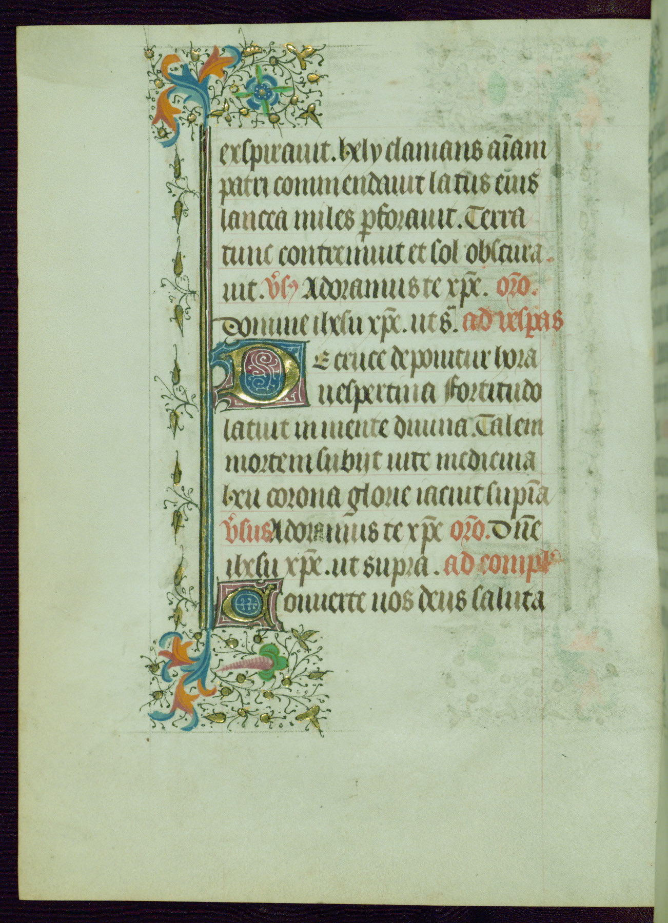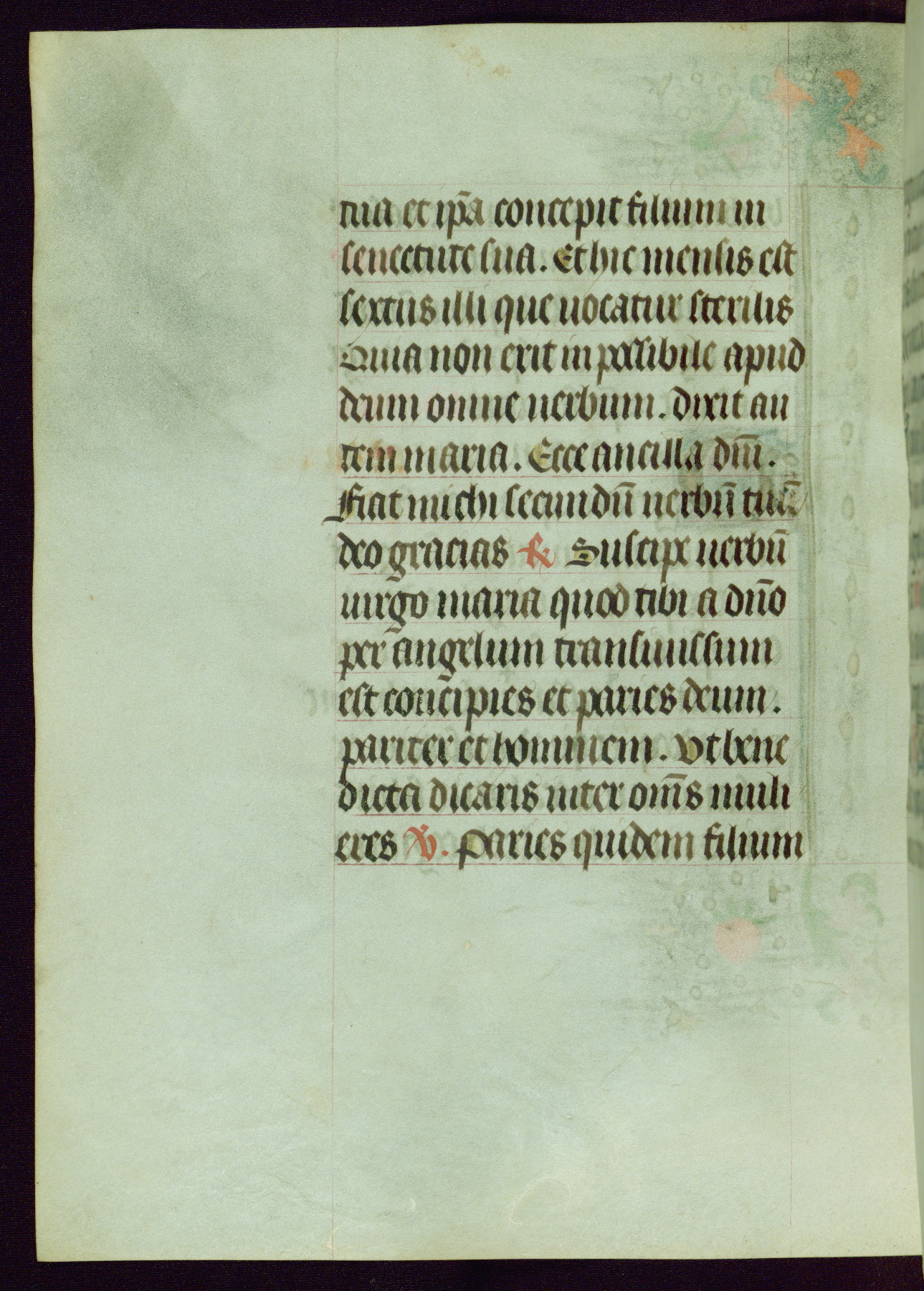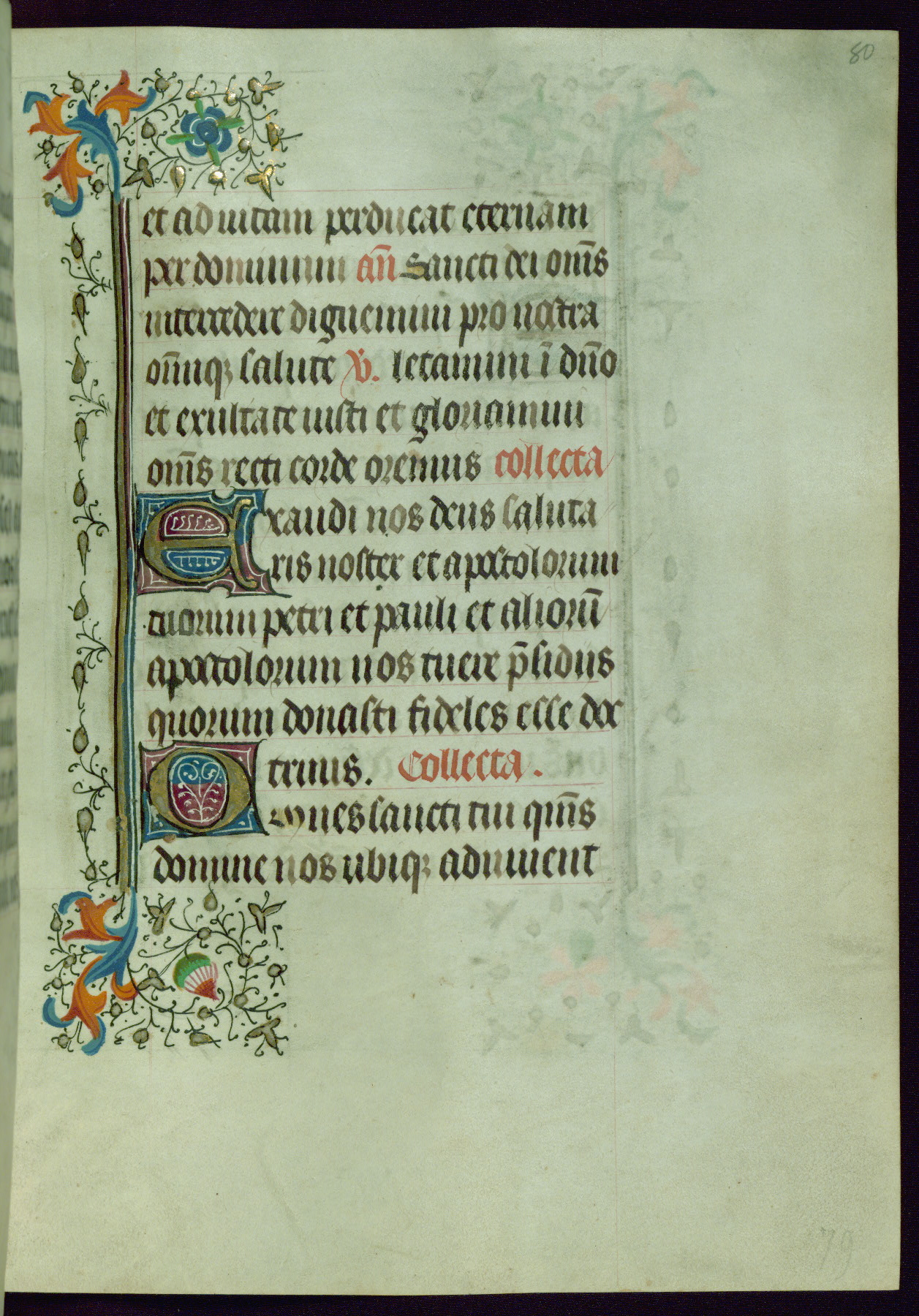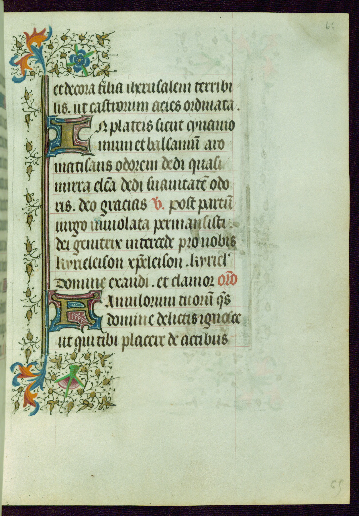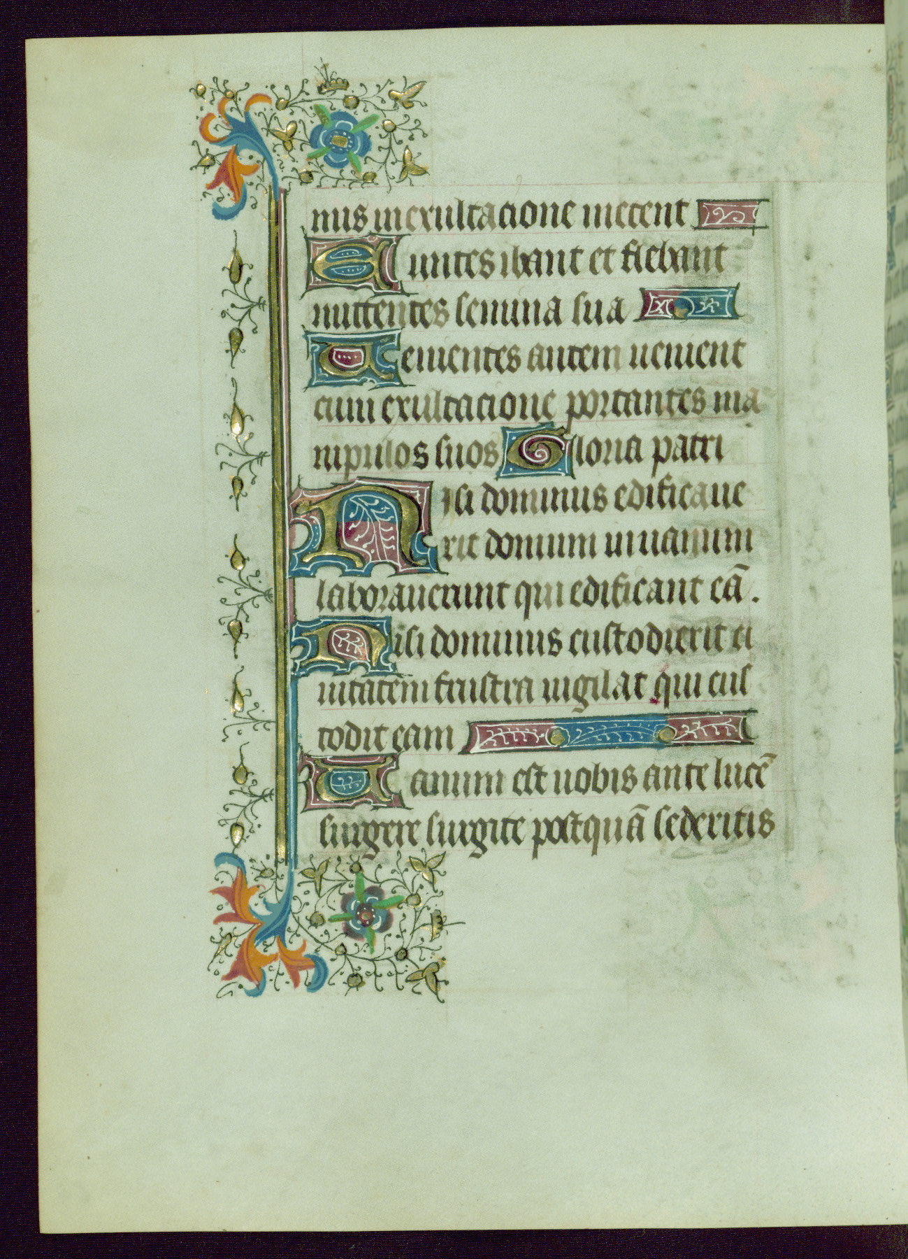 This Book of Hours was completed ca. 1440-50, and likely destined for Tournai. The decoration of this manuscript includes two full-page miniatures, eleven extant smaller miniatures, one historiated initial, and one drollery. The illumination is in the style of the Master of Guillebert de Mets, although the work would have been completed during the closing stage of Mets' career. The Master of Guillebert de Mets' principal disciple was the Master of the Ghent Privileges, with whom he may have been in collaboration, as indicated by numerous comparisons (see Dogaer 1987, 33-37). This book begins with a full-page miniature depicting the Mass of St. Gregory, a folio that appears to have been relocated from its original placement just before fol. 180 to its current location as fol. 2. It should be noted that fol. 2 has experienced extensive paint loss and has since been retouched, although it is unknown by whom or at what time. The unpretentious illumination program could have been the reason for this switch, perhaps to make the manuscript more appealing for a potential buyer.