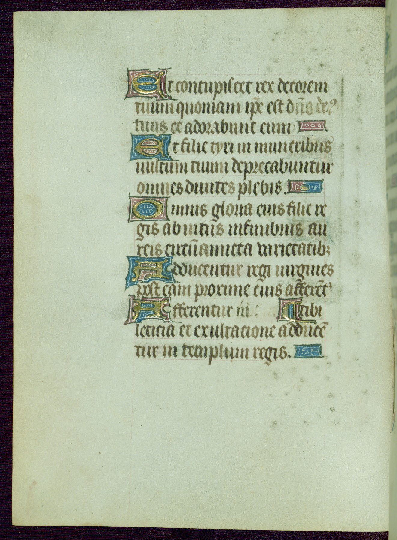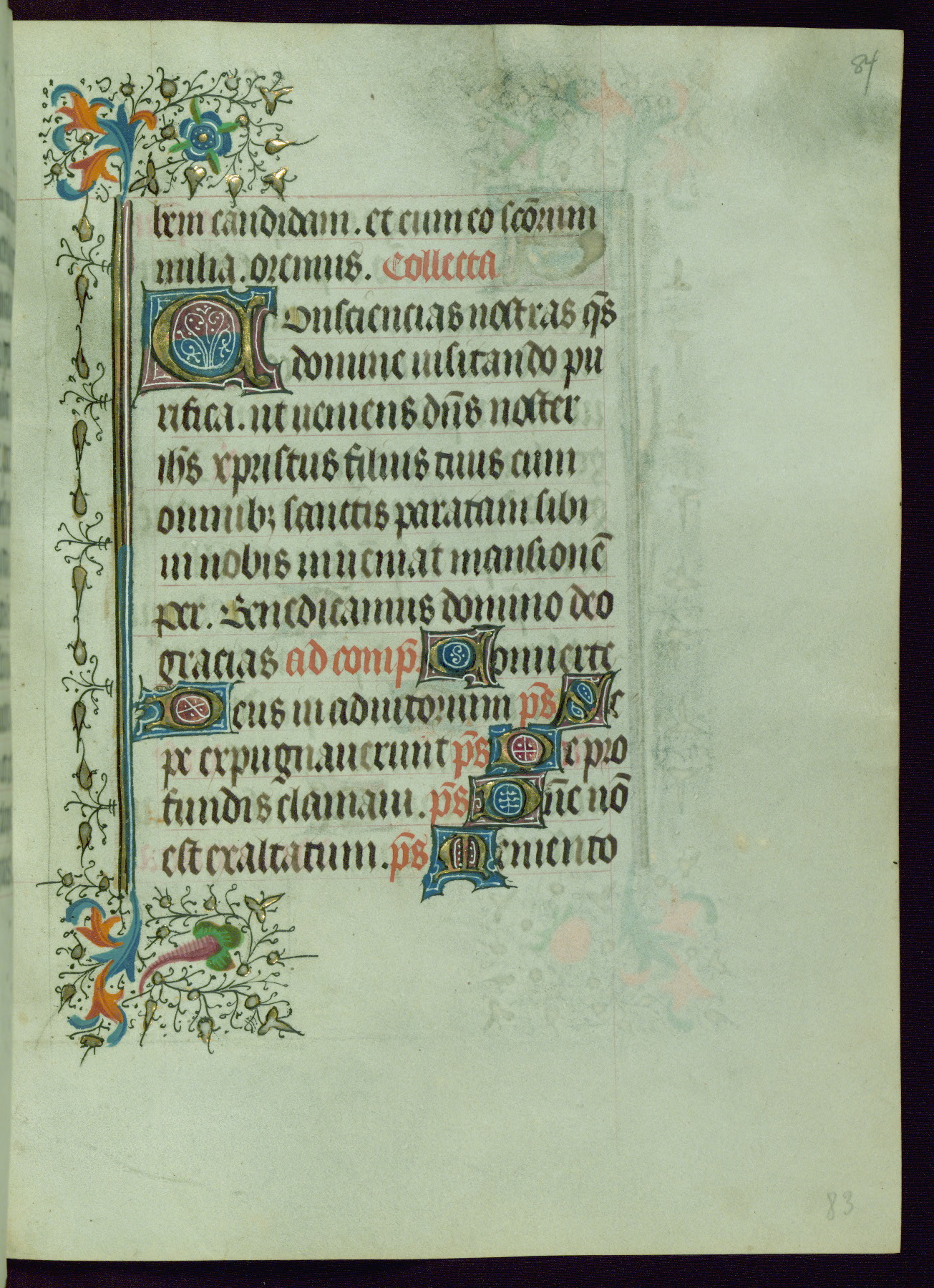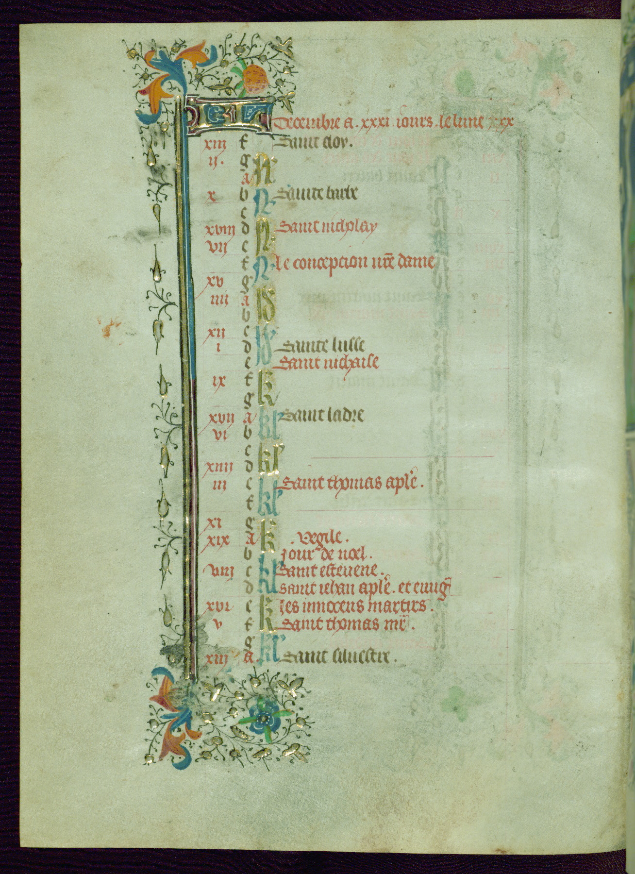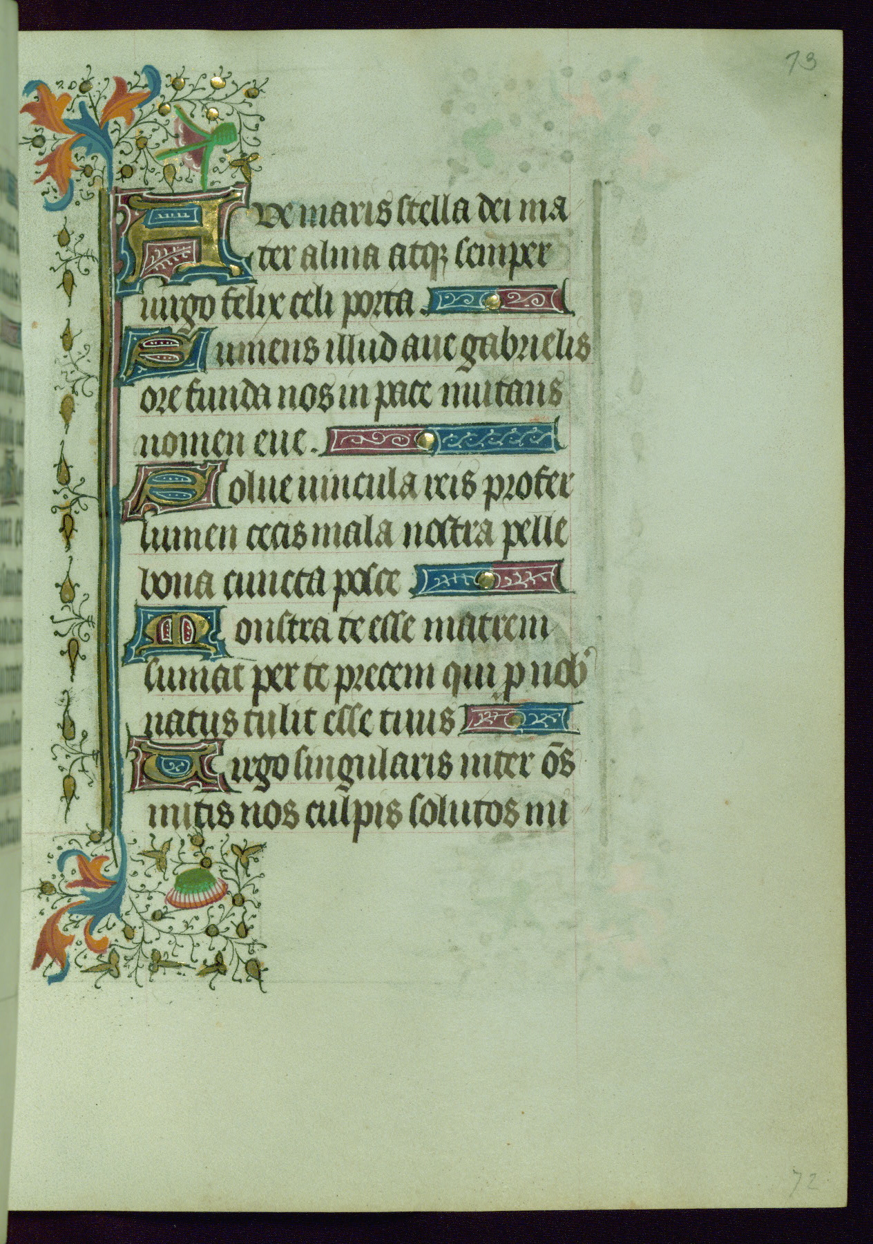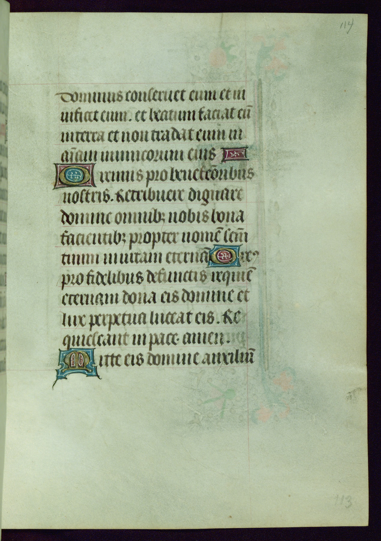 This Book of Hours was completed ca. 1440-50, and likely destined for Tournai. The decoration of this manuscript includes two full-page miniatures, eleven extant smaller miniatures, one historiated initial, and one drollery. The illumination is in the style of the Master of Guillebert de Mets, although the work would have been completed during the closing stage of Mets' career. The Master of Guillebert de Mets' principal disciple was the Master of the Ghent Privileges, with whom he may have been in collaboration, as indicated by numerous comparisons (see Dogaer 1987, 33-37). This book begins with a full-page miniature depicting the Mass of St. Gregory, a folio that appears to have been relocated from its original placement just before fol. 180 to its current location as fol. 2. It should be noted that fol. 2 has experienced extensive paint loss and has since been retouched, although it is unknown by whom or at what time. The unpretentious illumination program could have been the reason for this switch, perhaps to make the manuscript more appealing for a potential buyer.